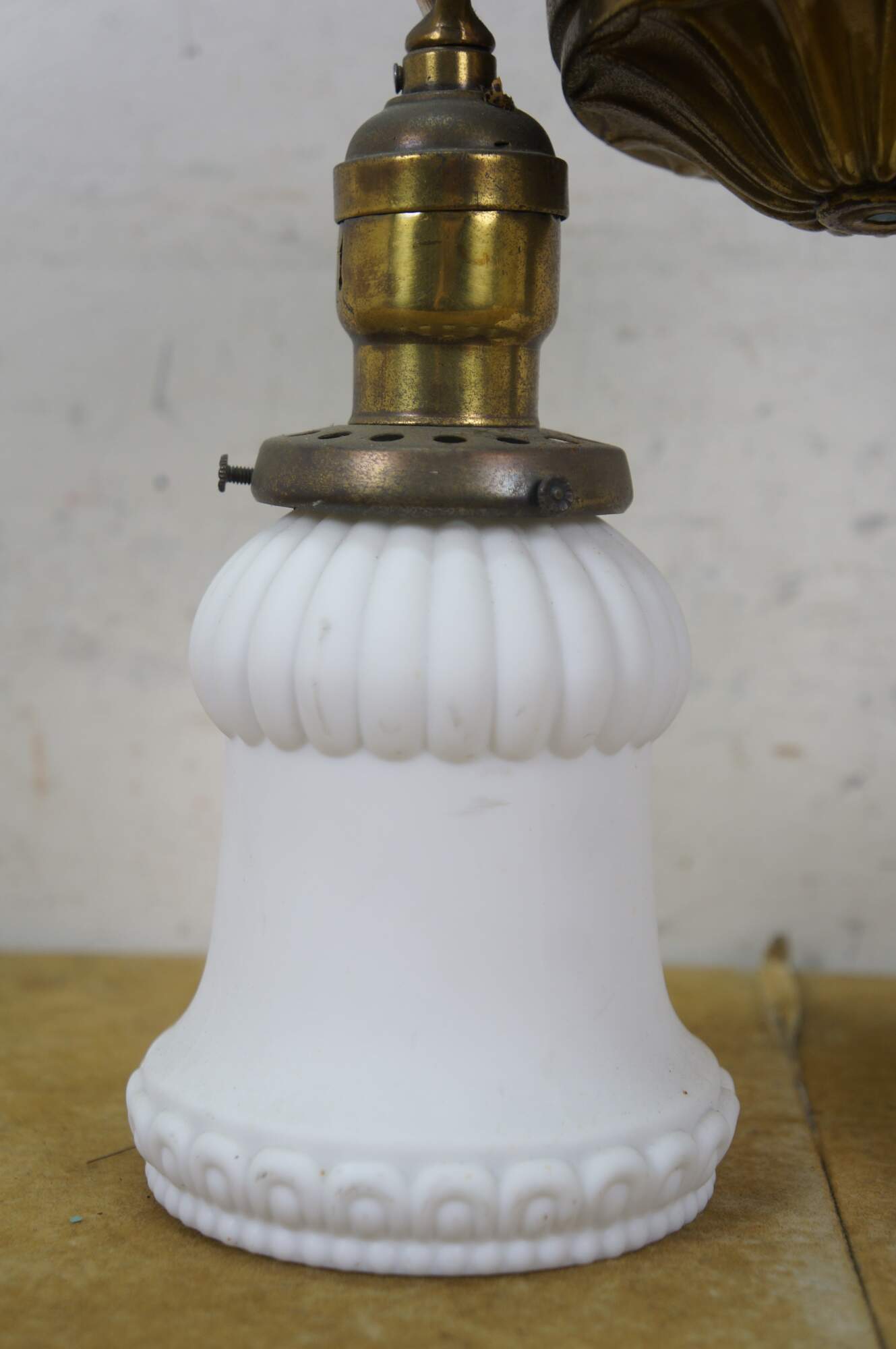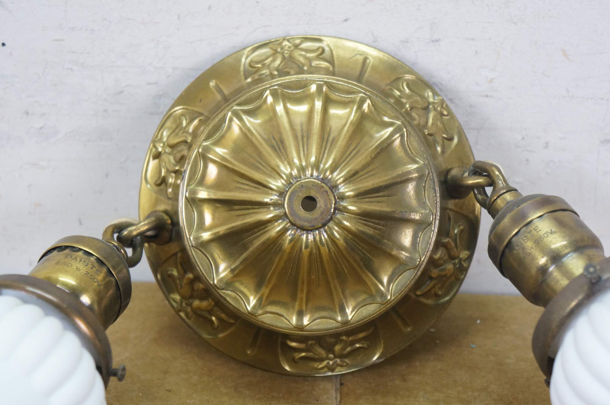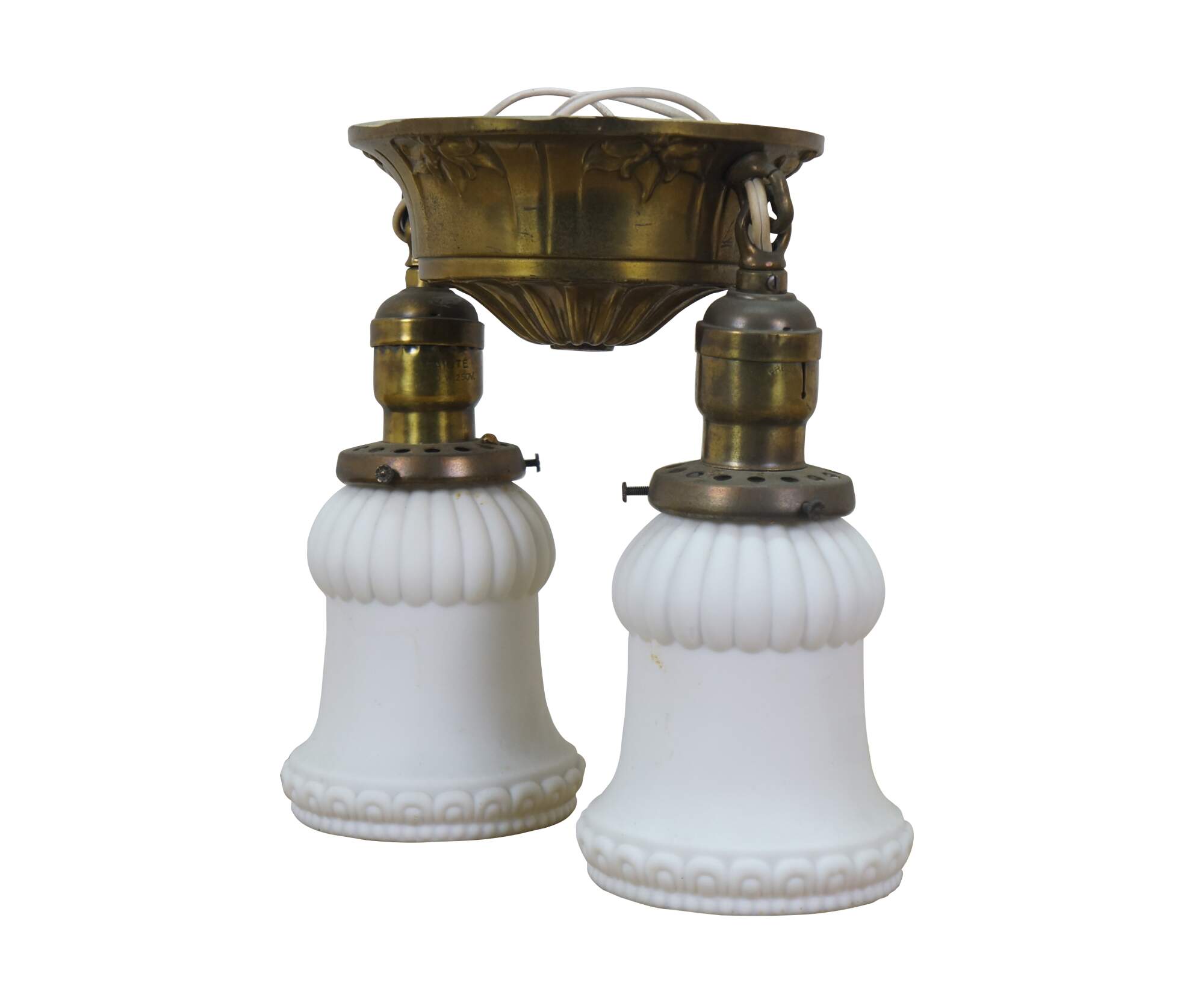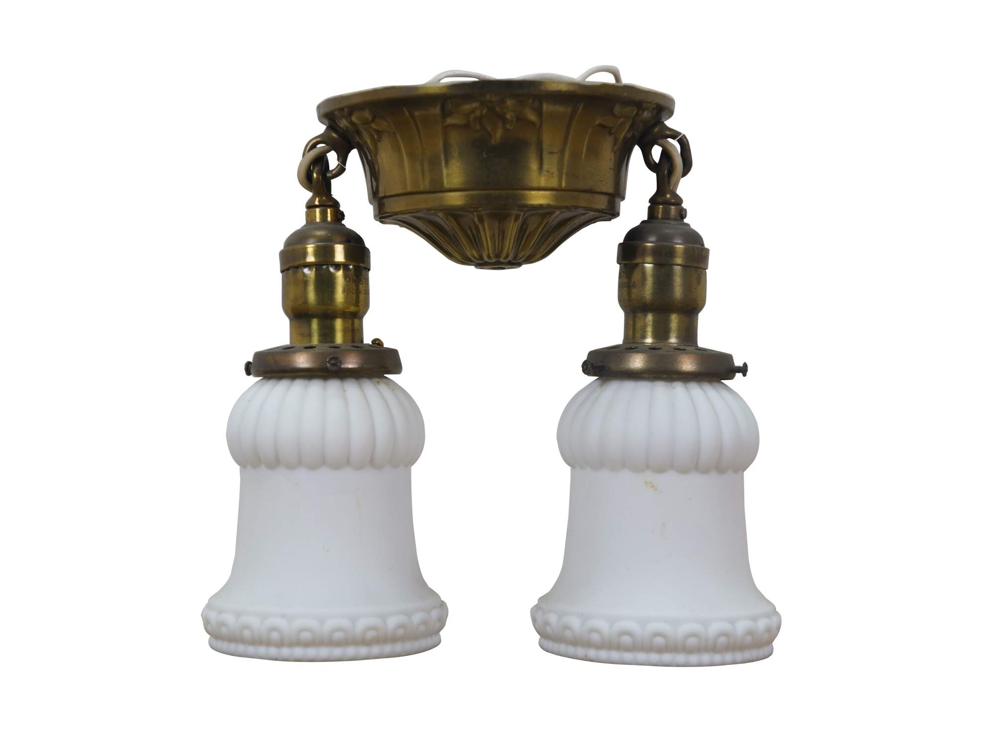 Early 20th century shower light - brass flush / ceiling mount medallion with umbrella shape sunburst and lily details supporting a pair of dangling Paiste light bulb sockets with matte milk glass shades / globes. Hardwired.