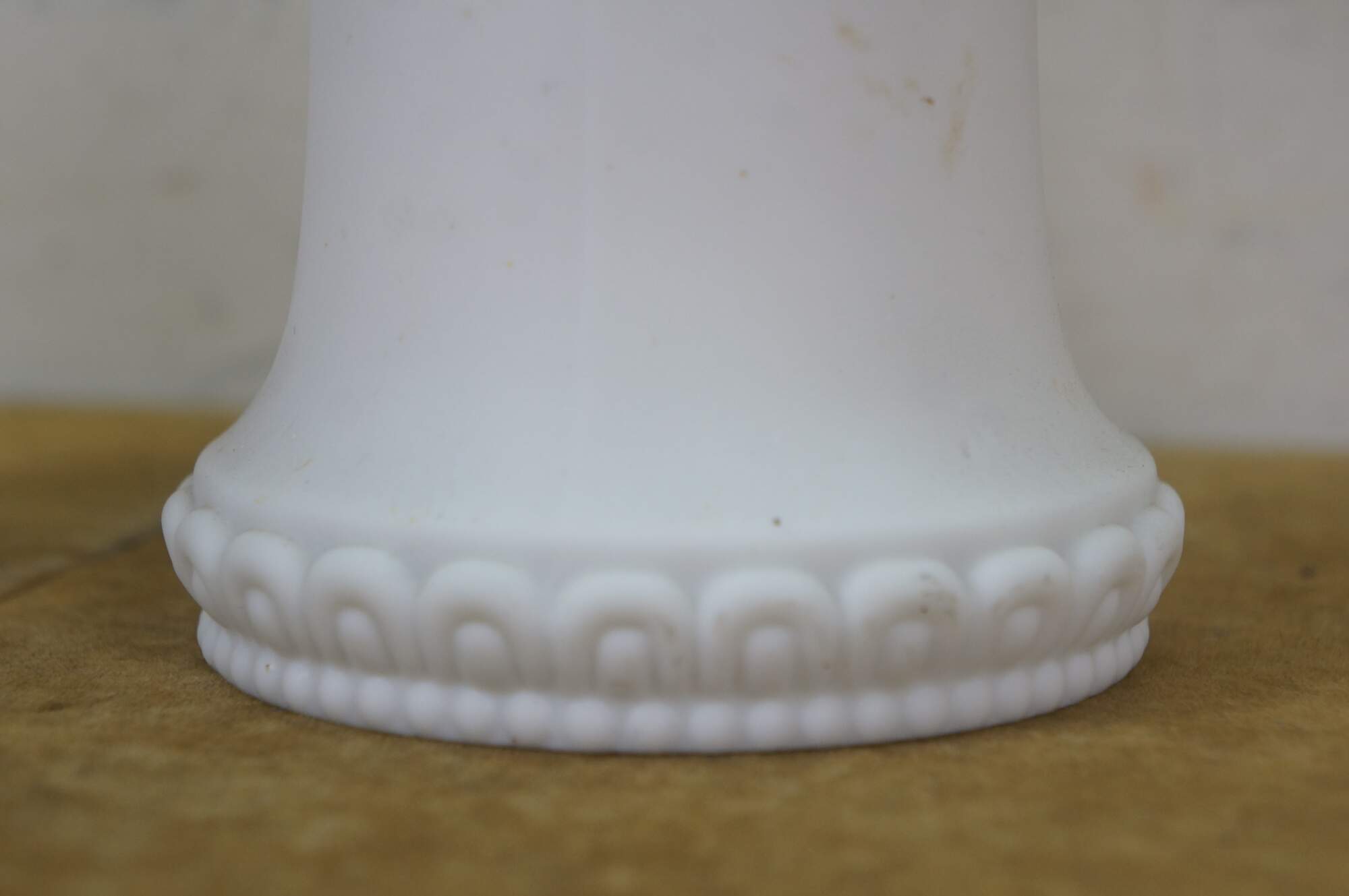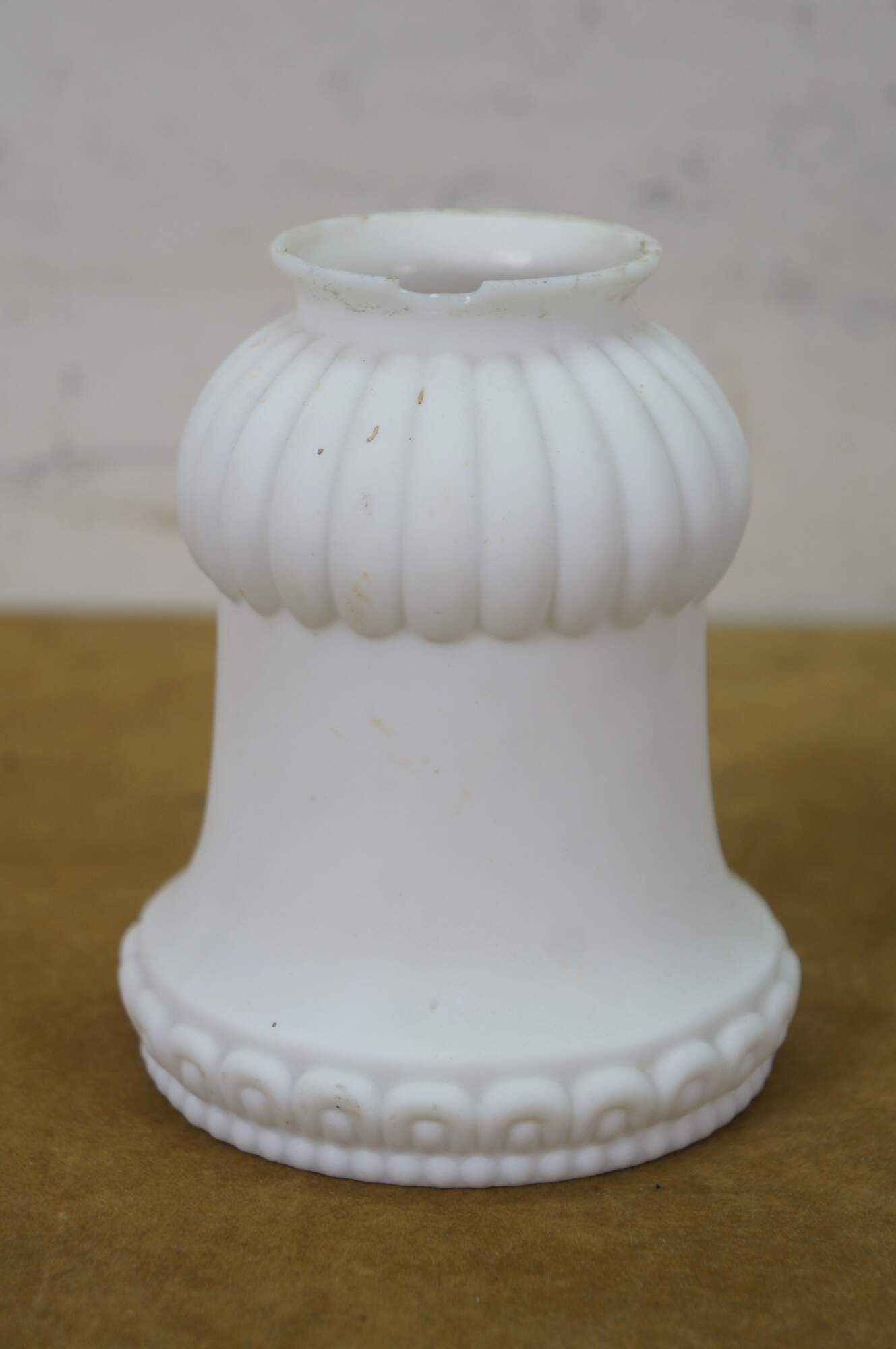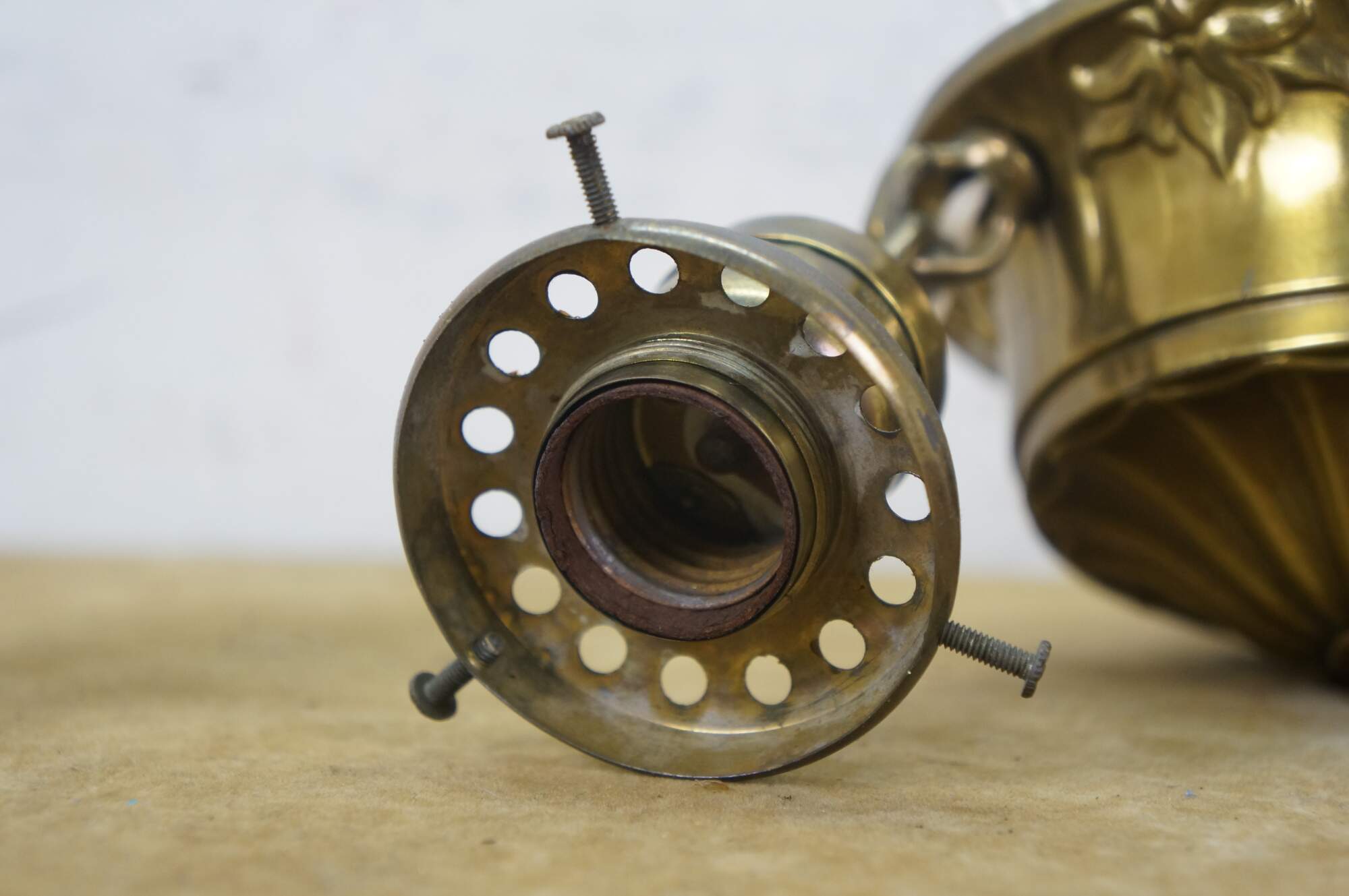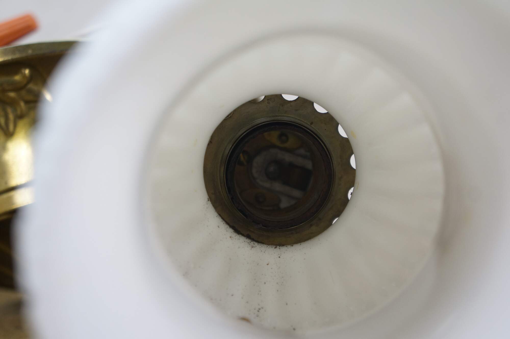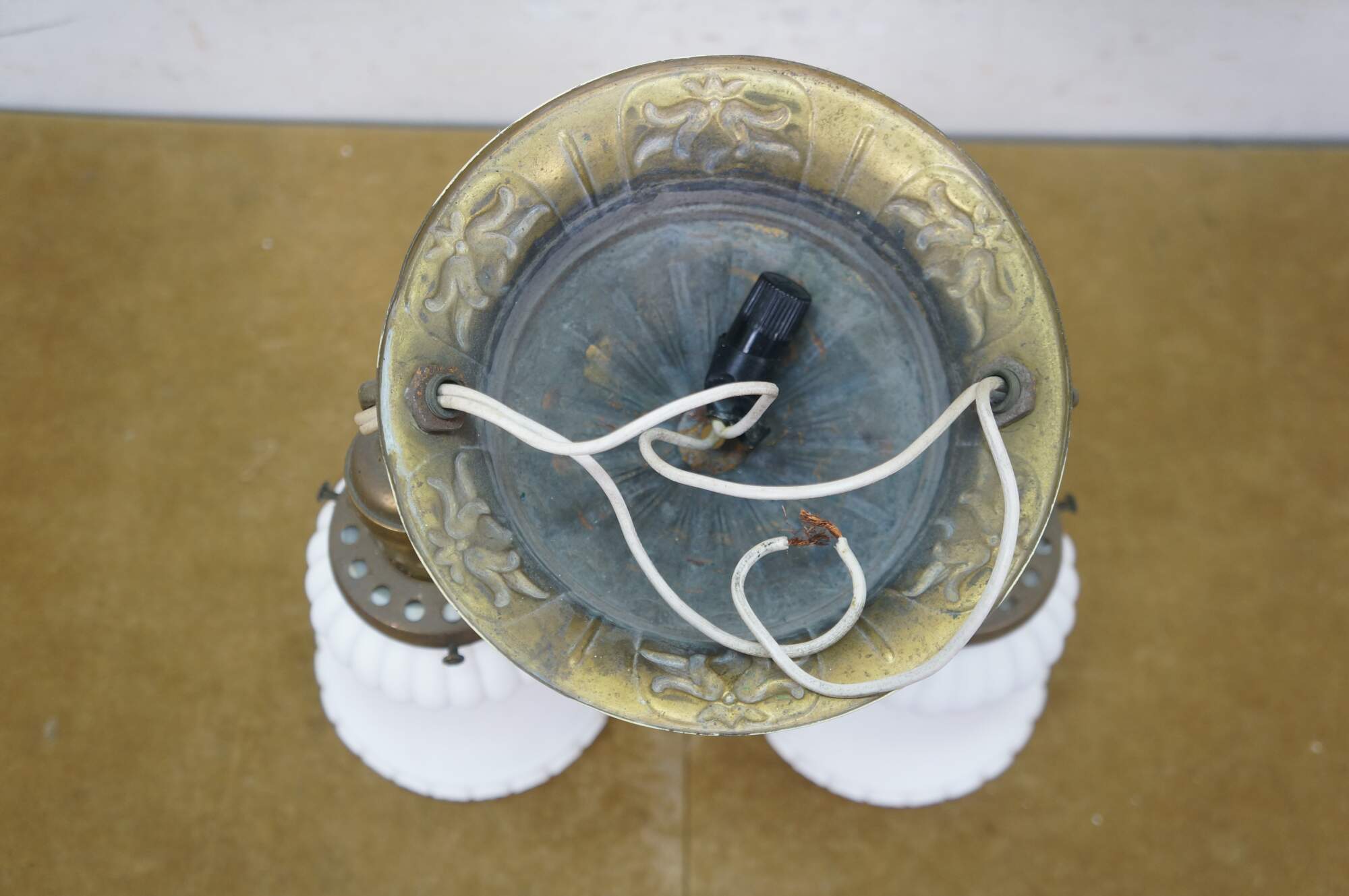 Early 20th century shower light - brass flush / ceiling mount medallion with umbrella shape sunburst and lily details supporting a pair of dangling Paiste light bulb sockets with matte milk glass shades / globes. Hardwired.