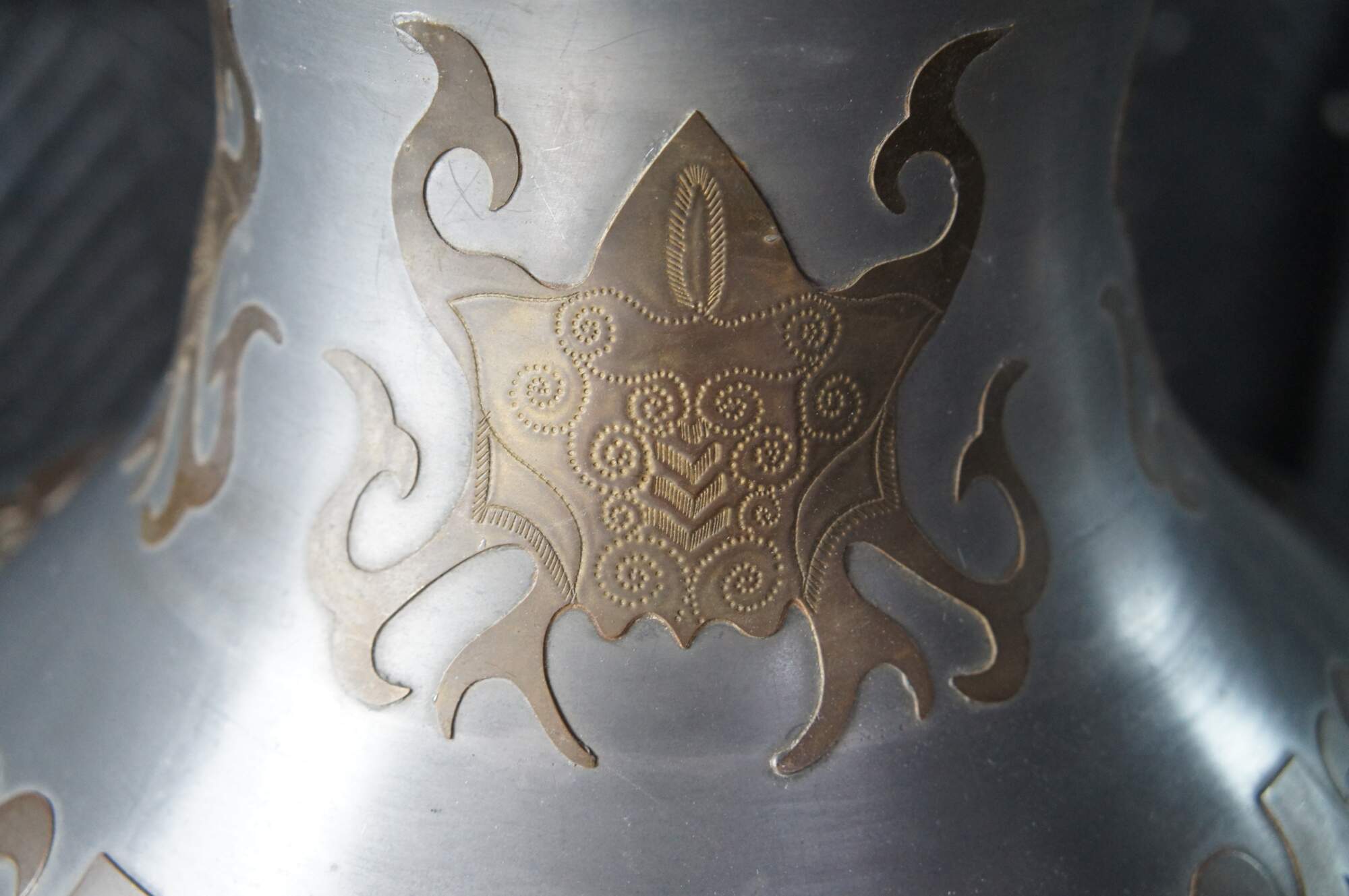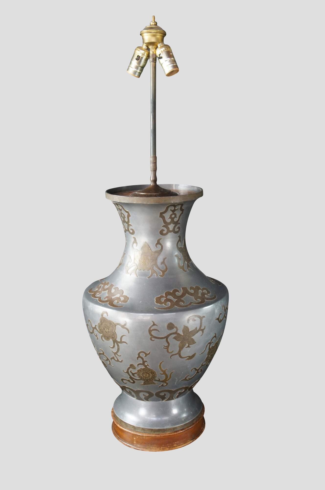 An exquisite and monumental set of handmade Chinoiserie mantel urn buffet lamps. Each large vase is made from pewter with beautiful brass overlay and tapered shades. The lamps showcase greek key engraving, floral foliate and scrolled detail. Each is mounted to wooden base. A staley addition to any space.