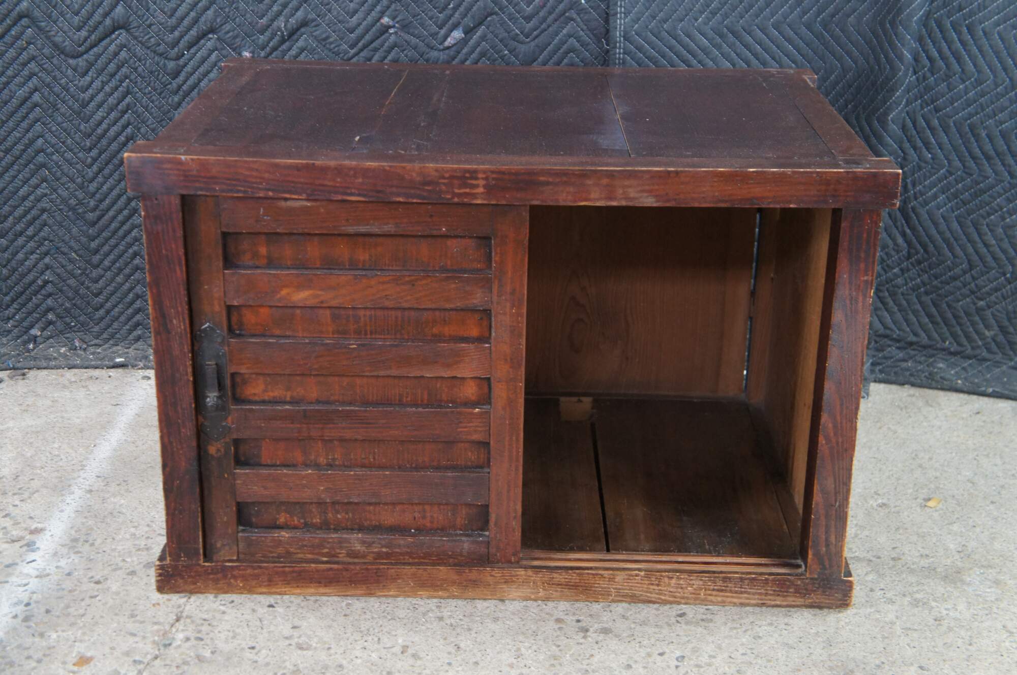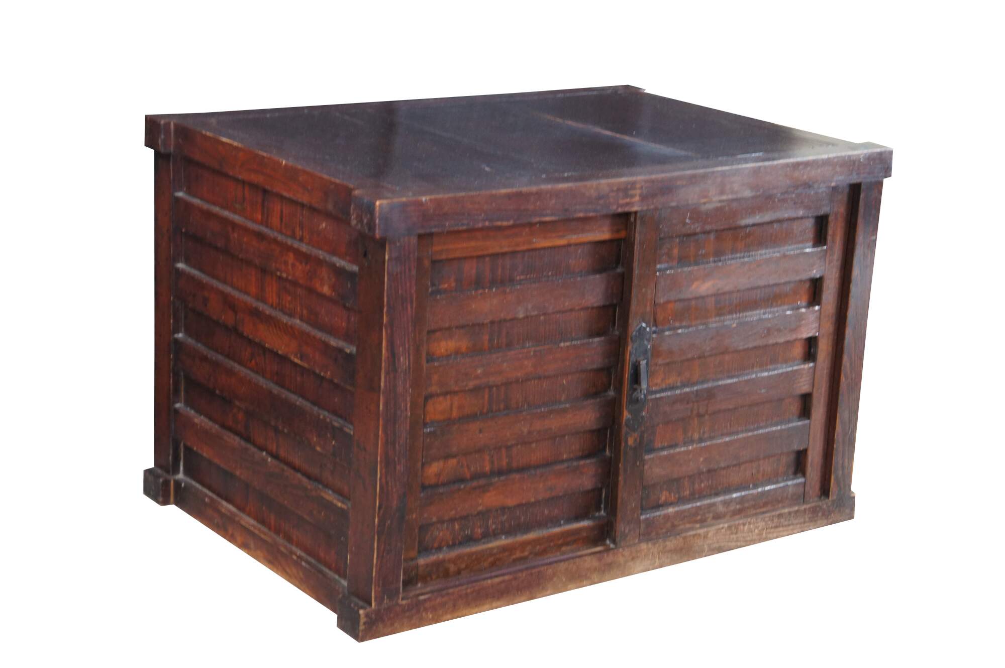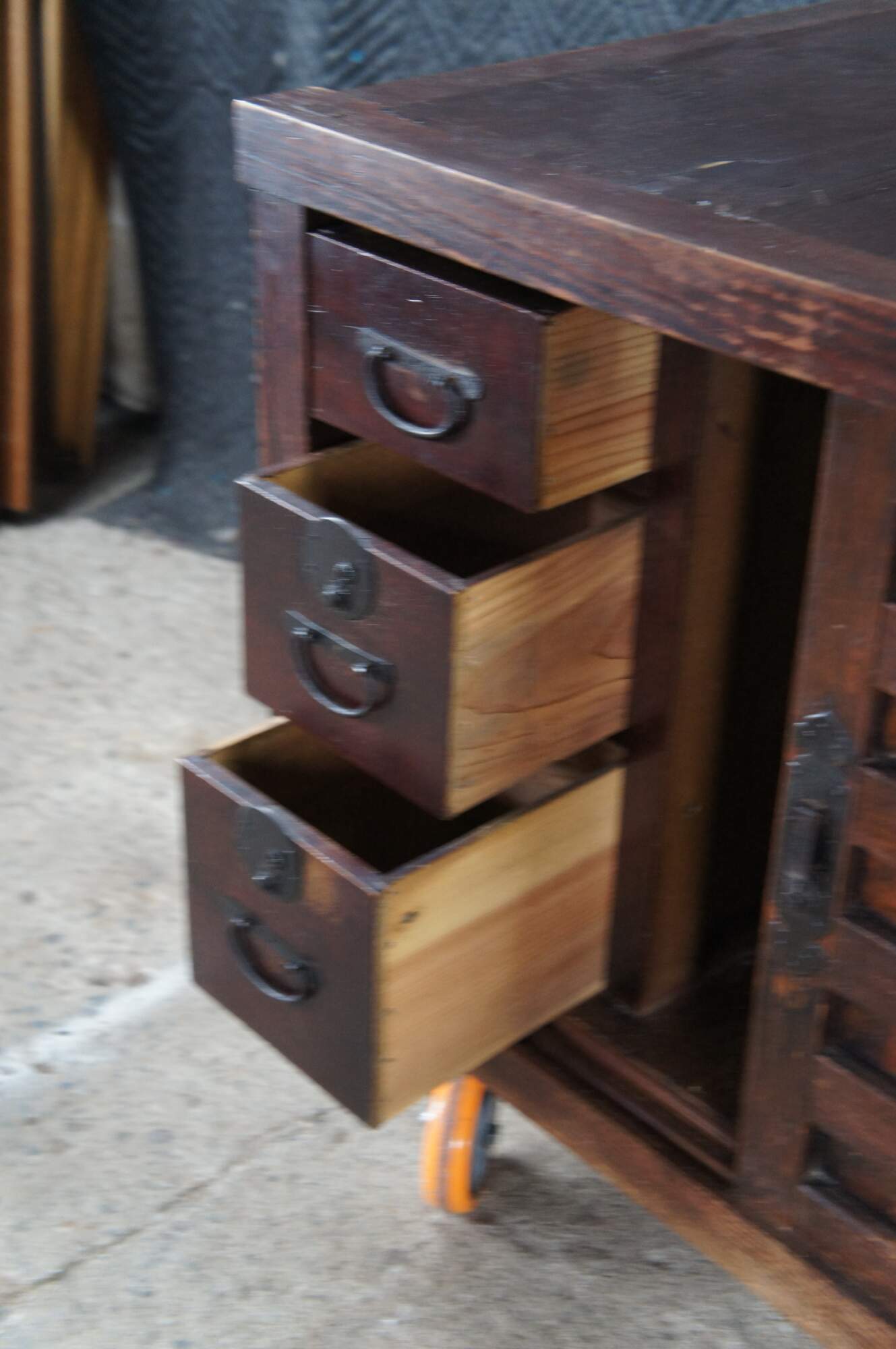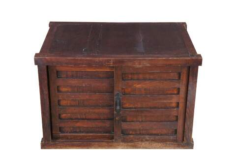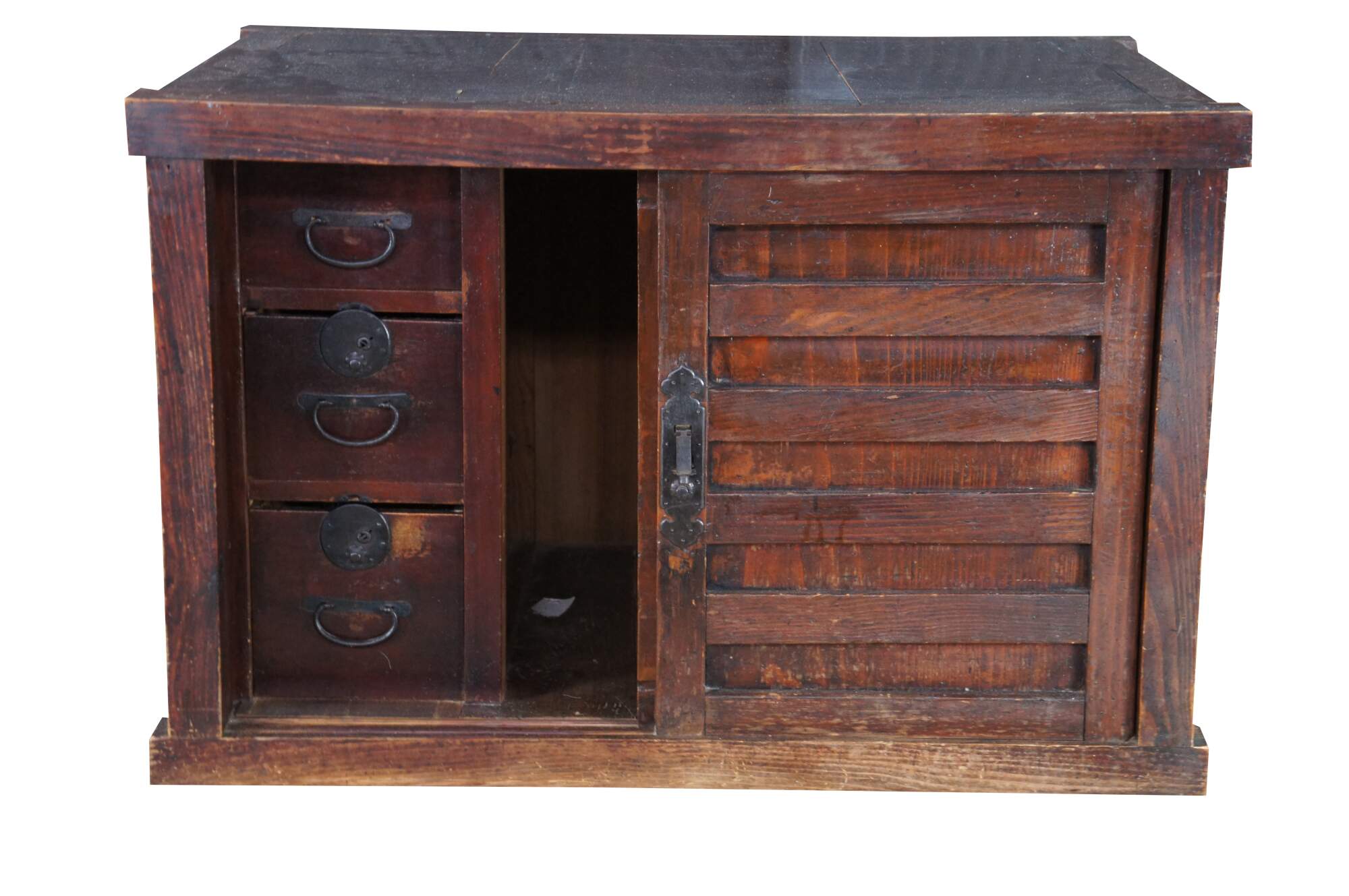 Mid Century Japanese Todana Tansu. Features a rectangular mortise and tenon frame made from elm with two sliding doors that open to three drawers with ming style hardware and accessory storage. These were traditional mobile storage cabinets were often kept in fireproof storehouses. They often were set over wheels which made them easy to move during fires.