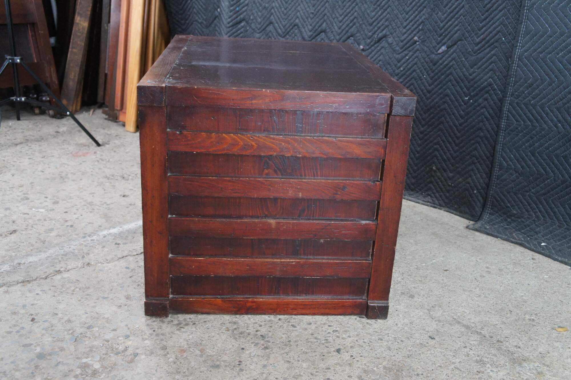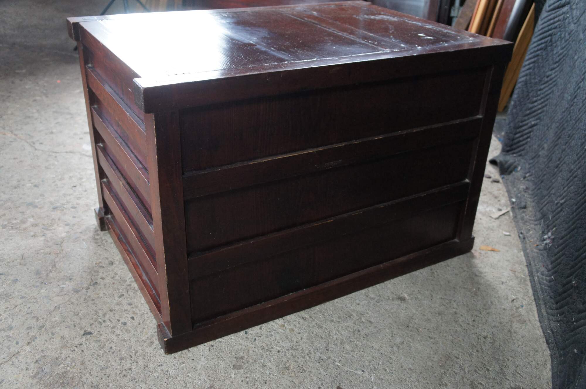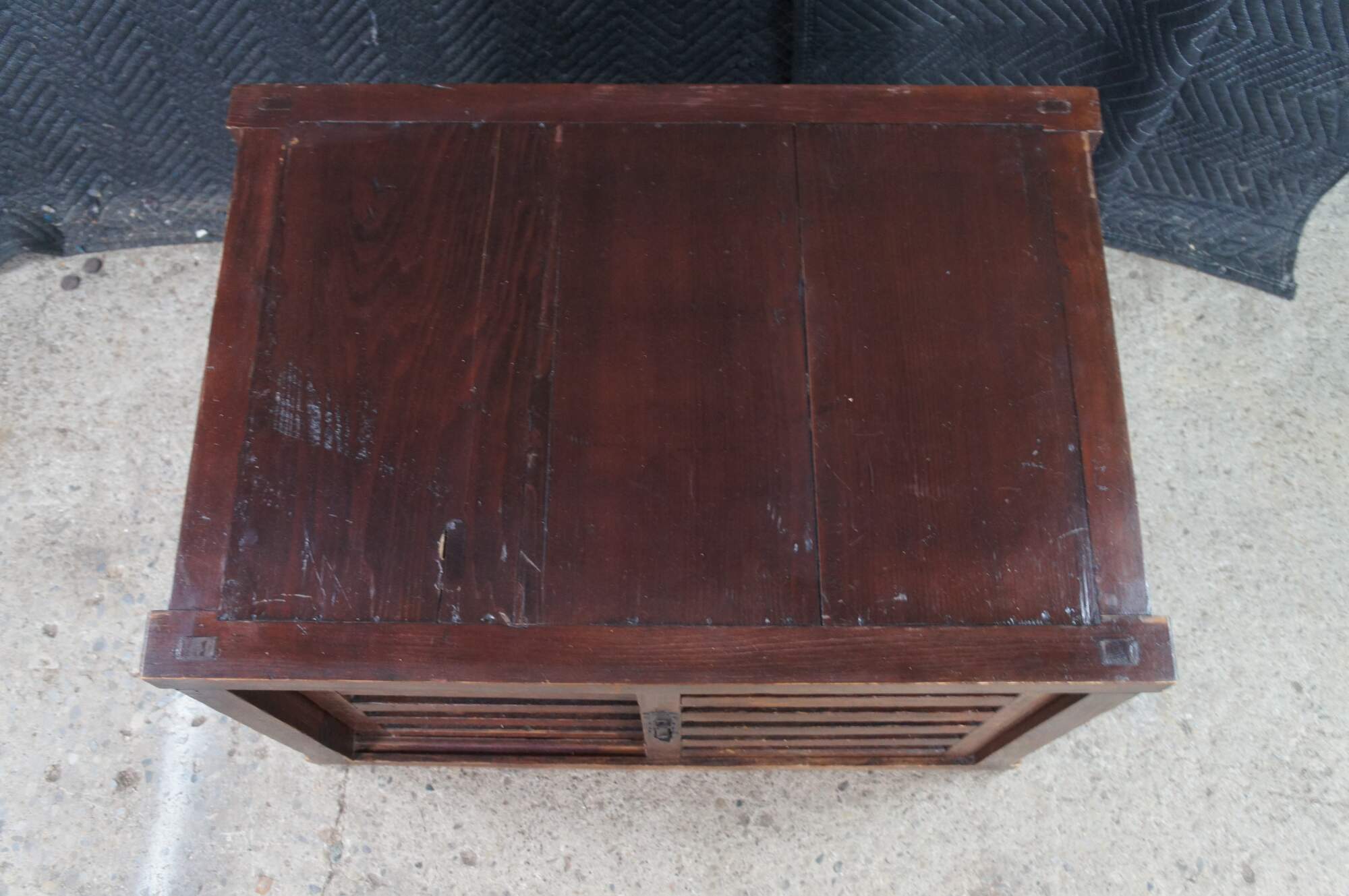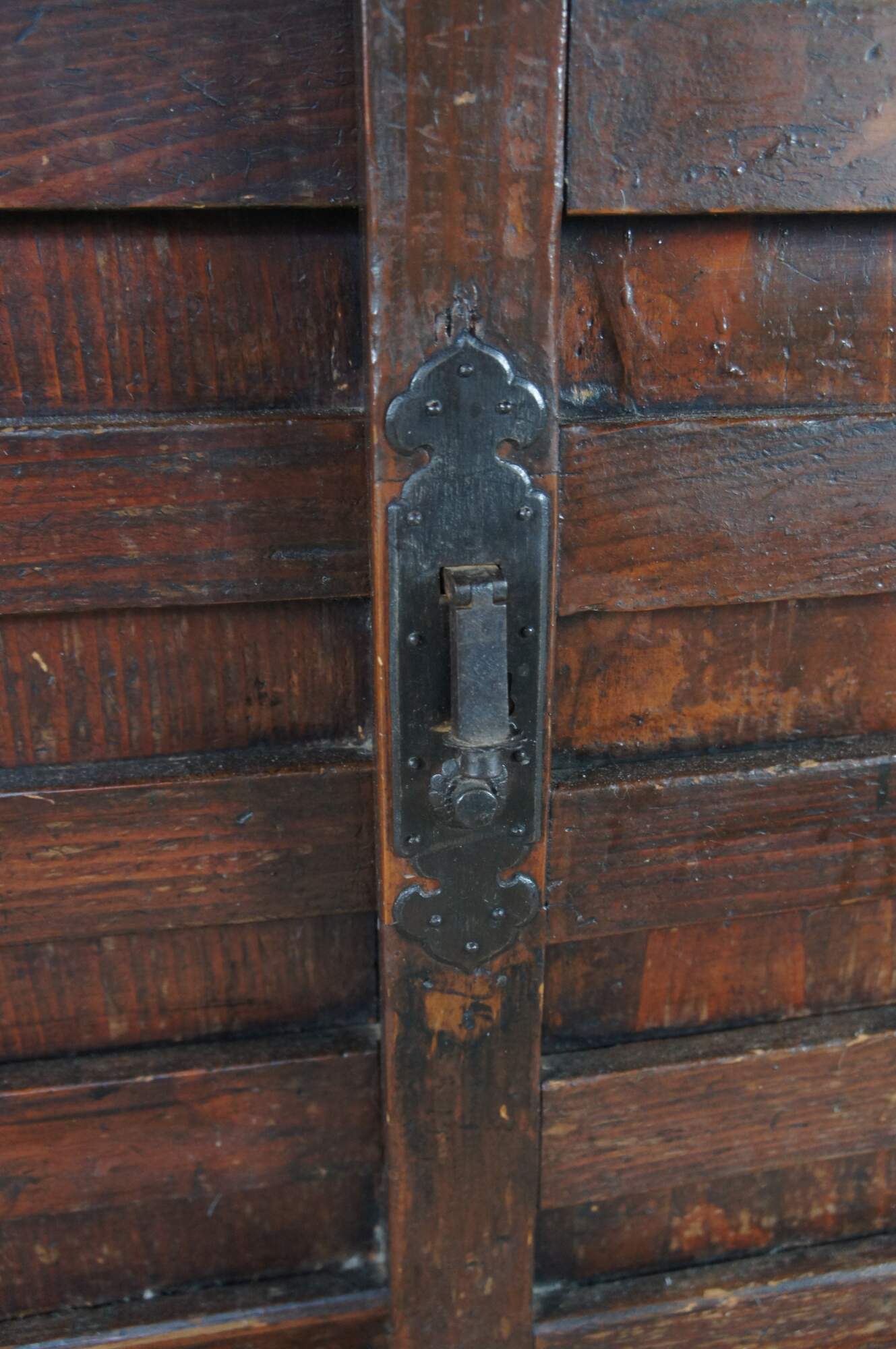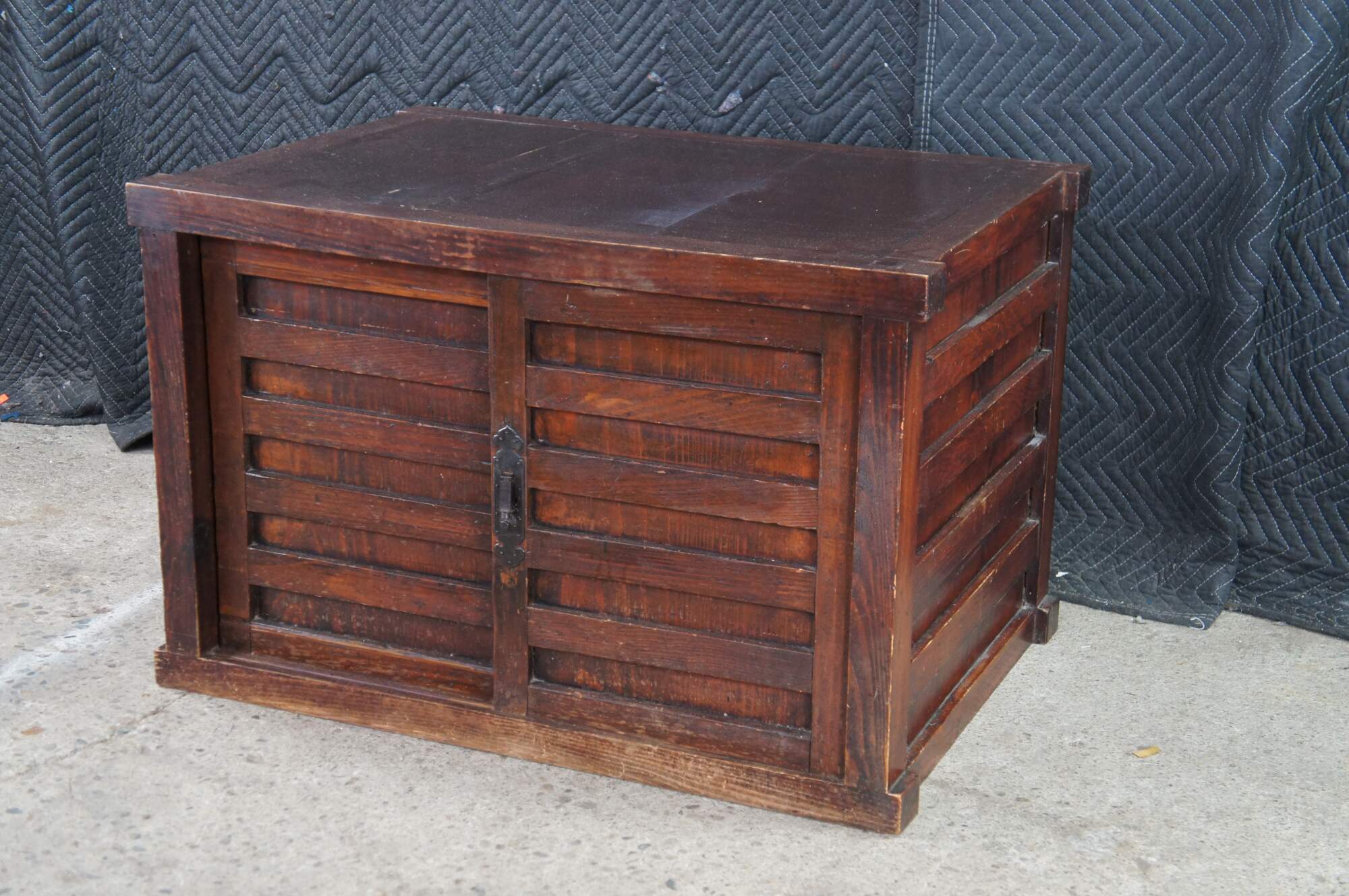 Mid Century Japanese Todana Tansu. Features a rectangular mortise and tenon frame made from elm with two sliding doors that open to three drawers with ming style hardware and accessory storage. These were traditional mobile storage cabinets were often kept in fireproof storehouses. They often were set over wheels which made them easy to move during fires.