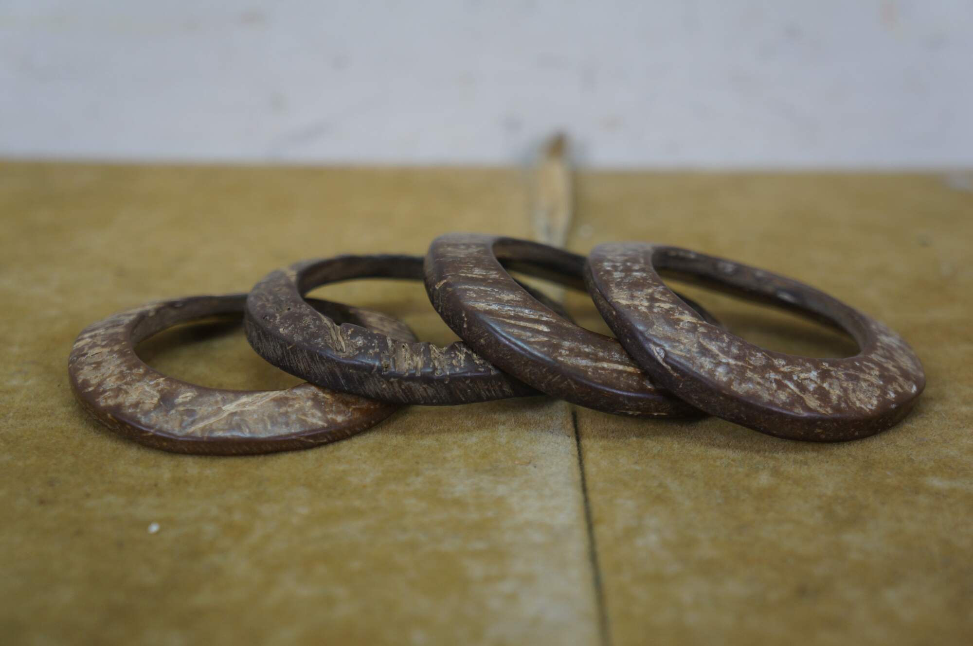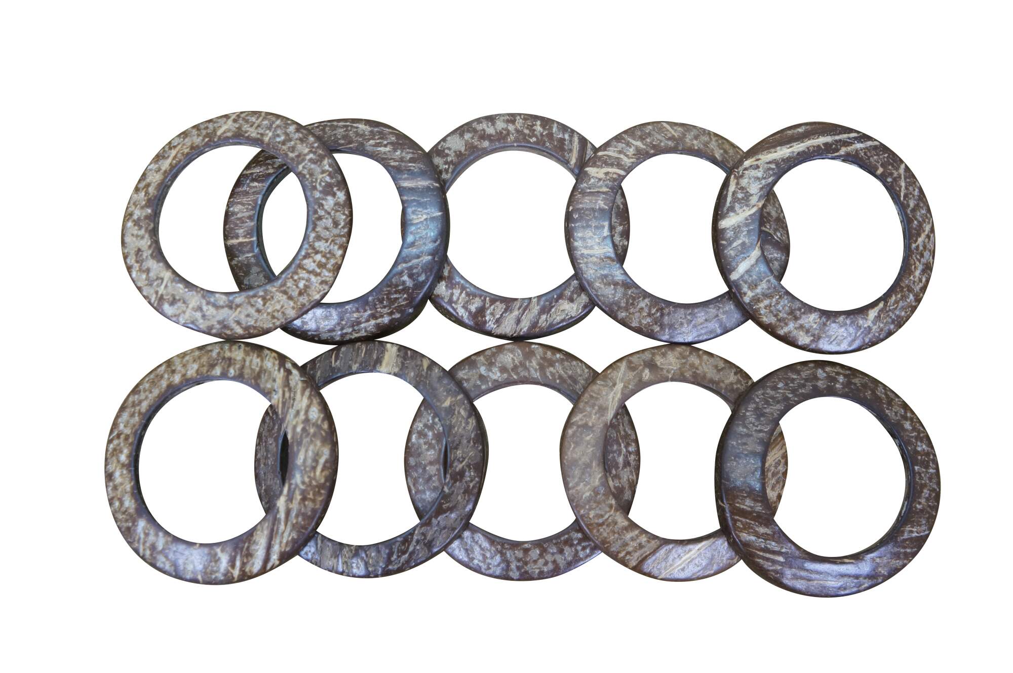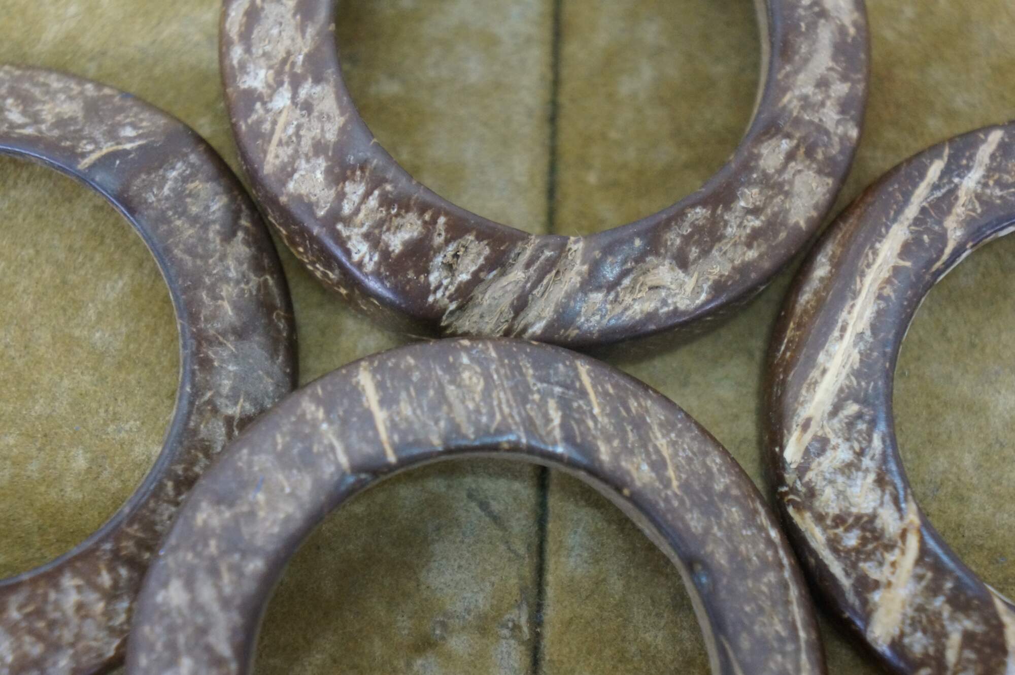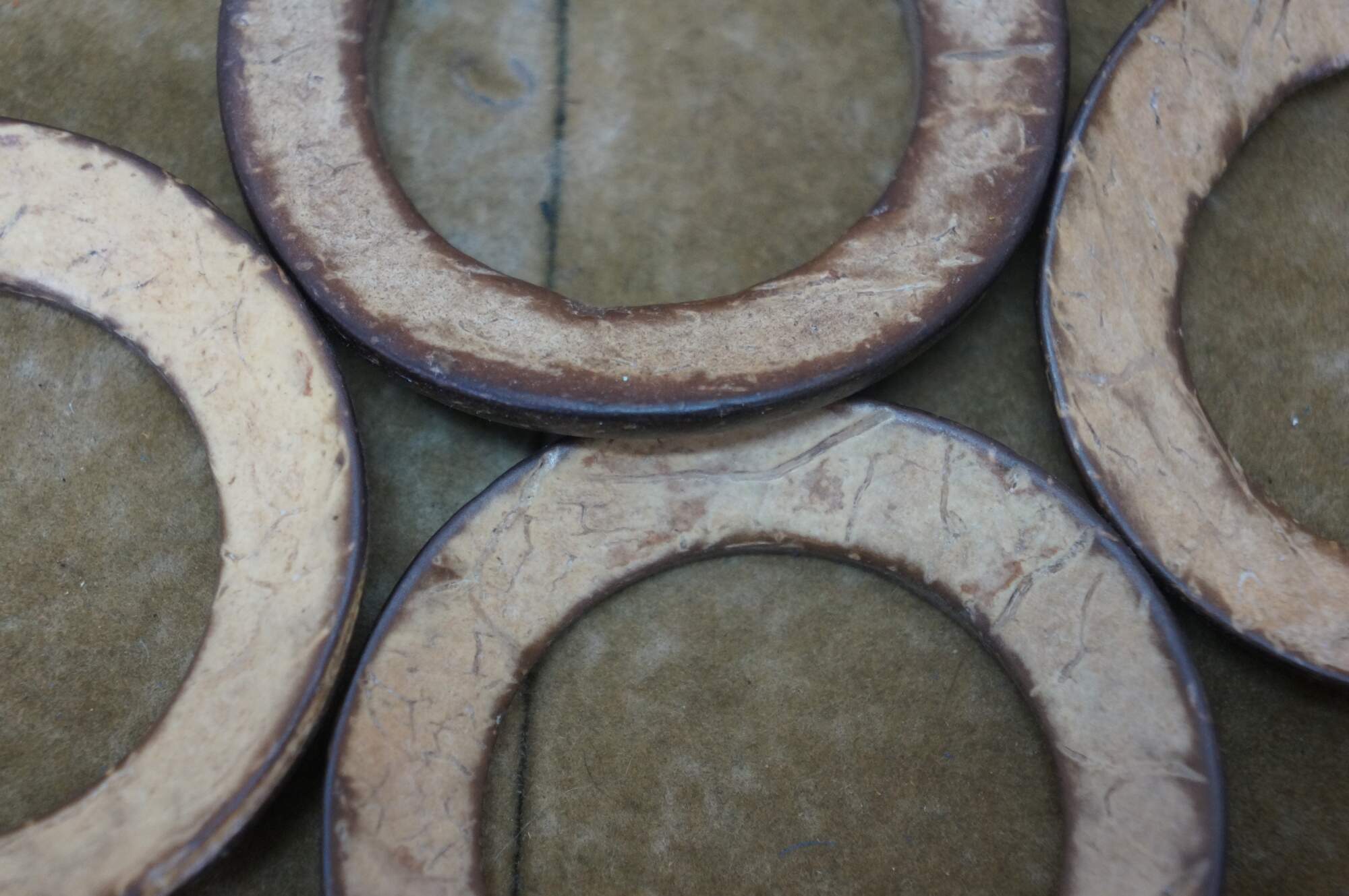 Set of 10 late 20th century coconut shell napkin rings / ring pendants for use as decoration on macrame / crochet bags and other craft projects.