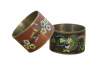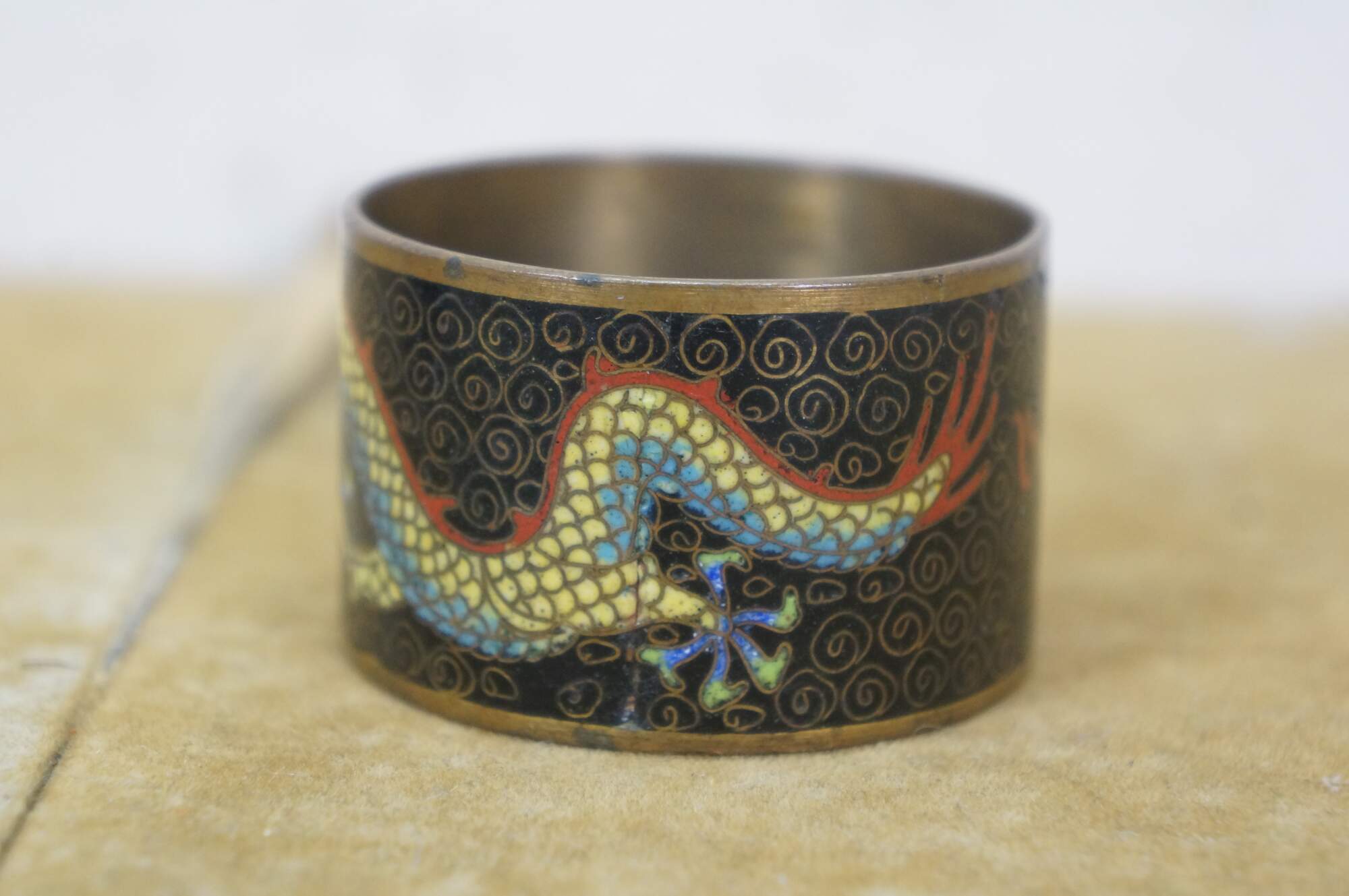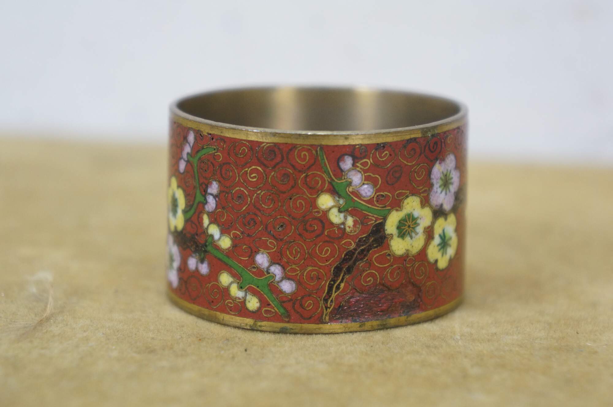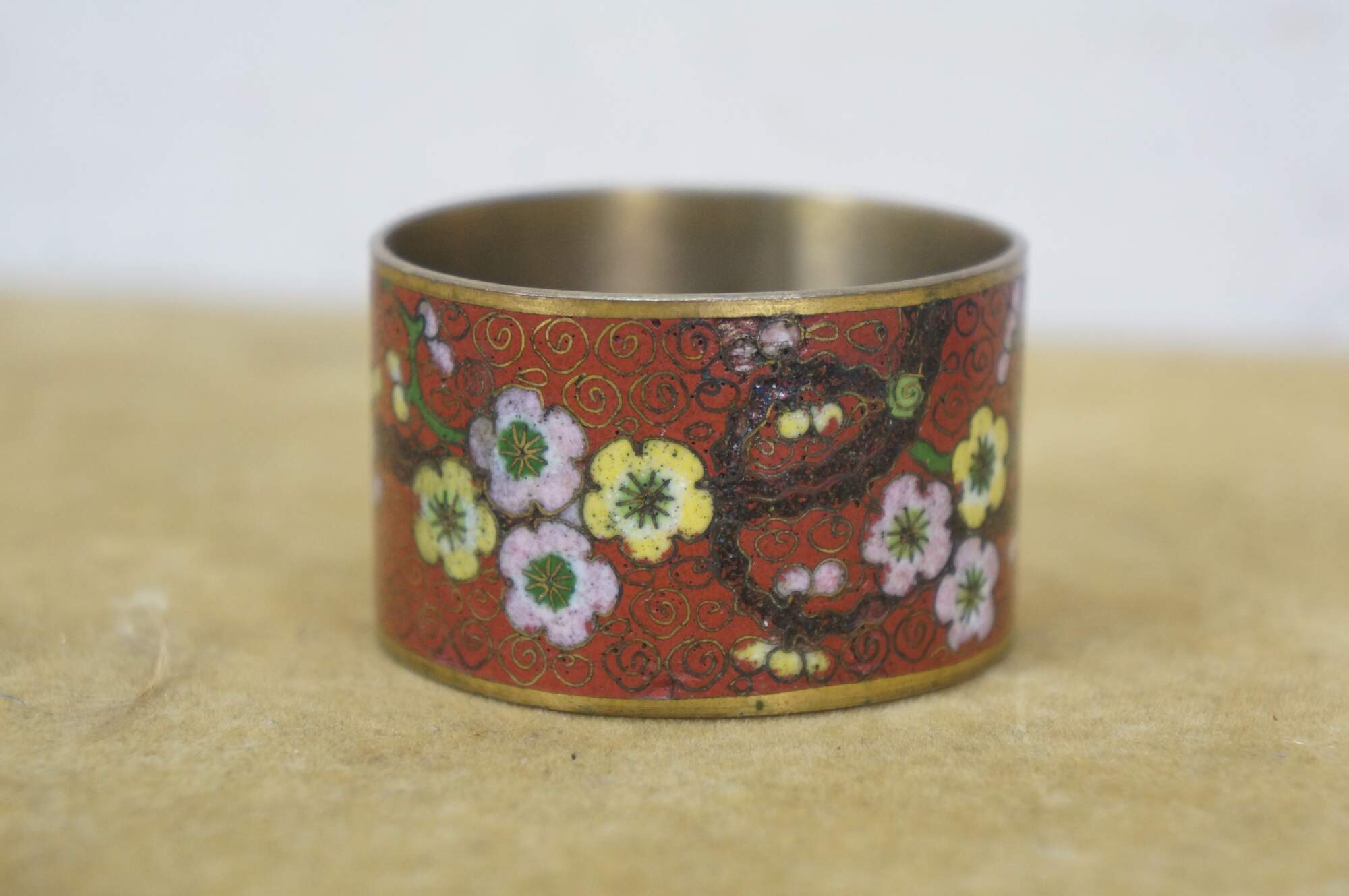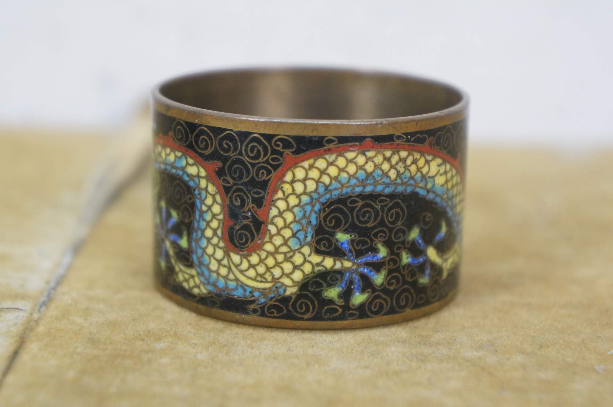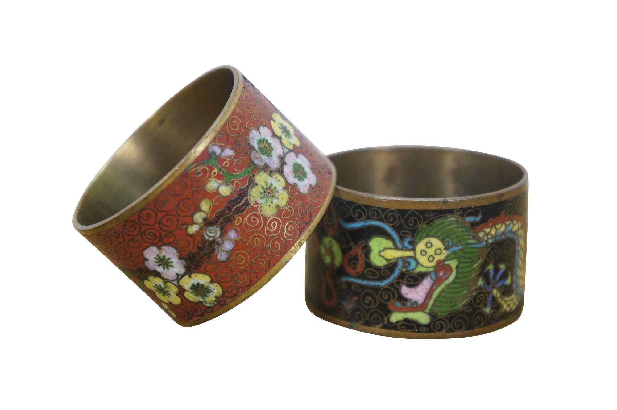 Pair of mid 20th century Chinese cloisonne enamel on brass napkin rings. One red with branches of cherry blossoms. The other black with a multicolored dragon.