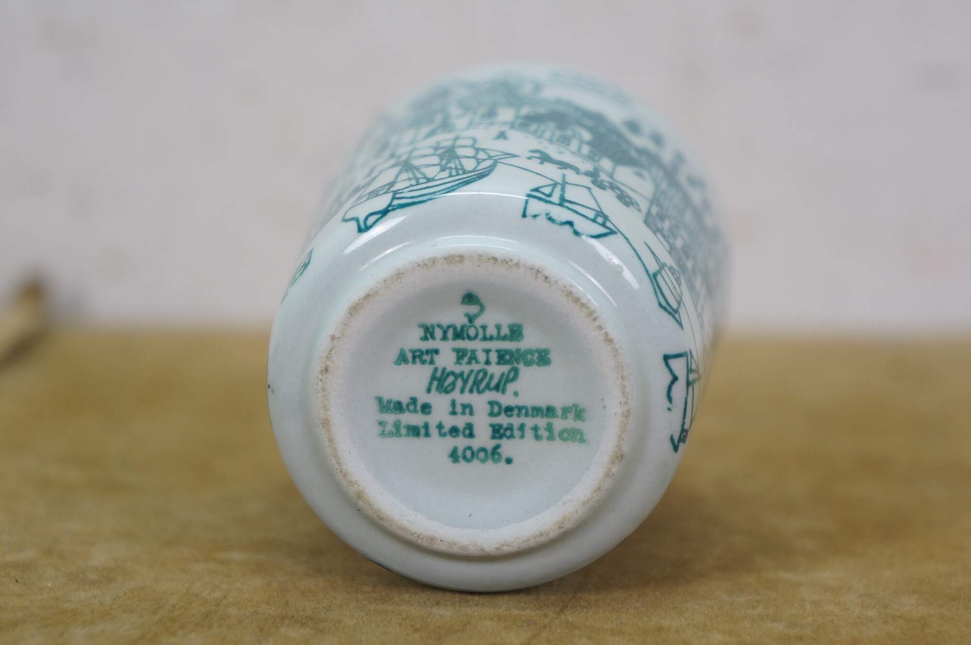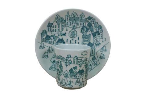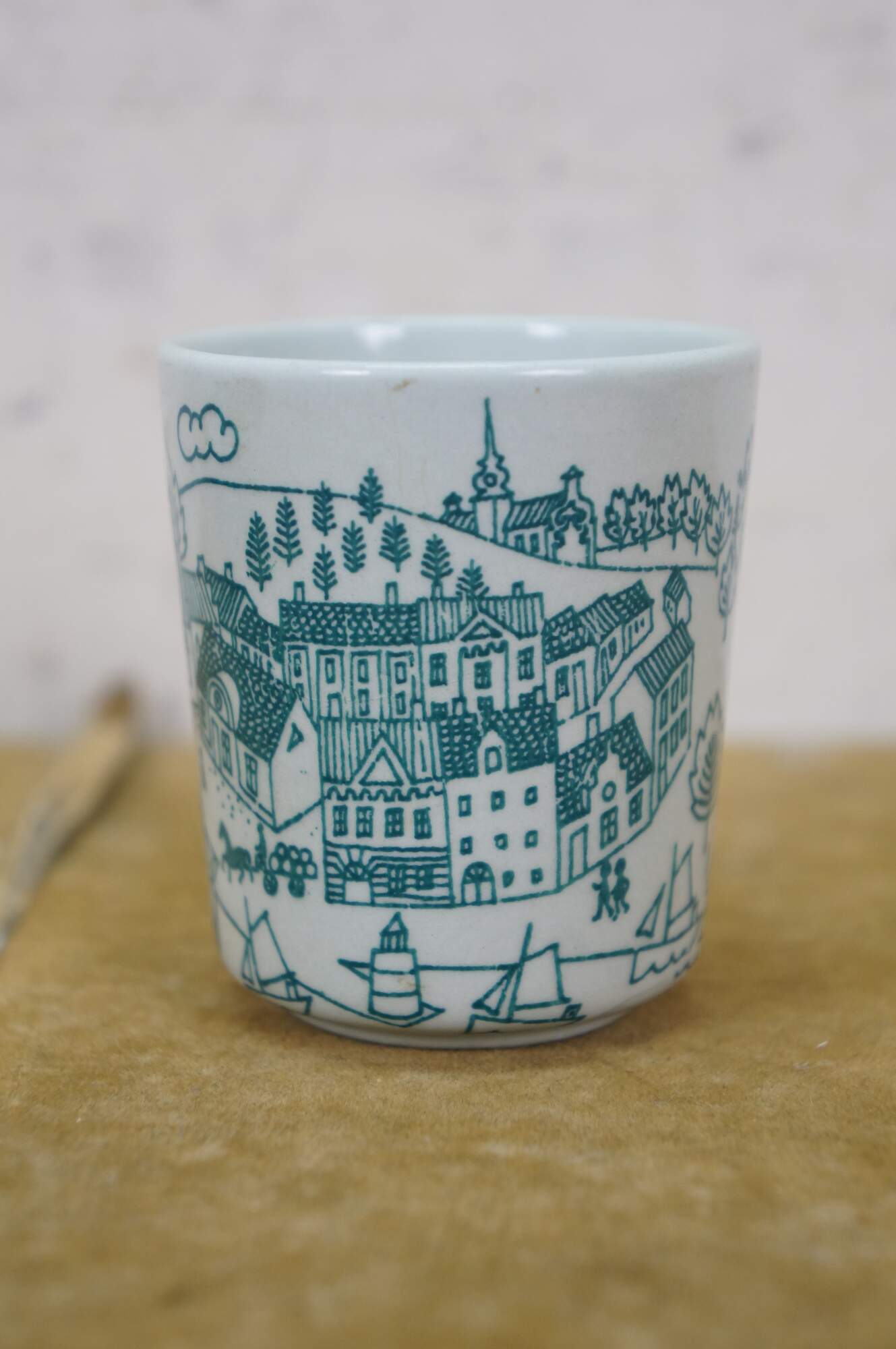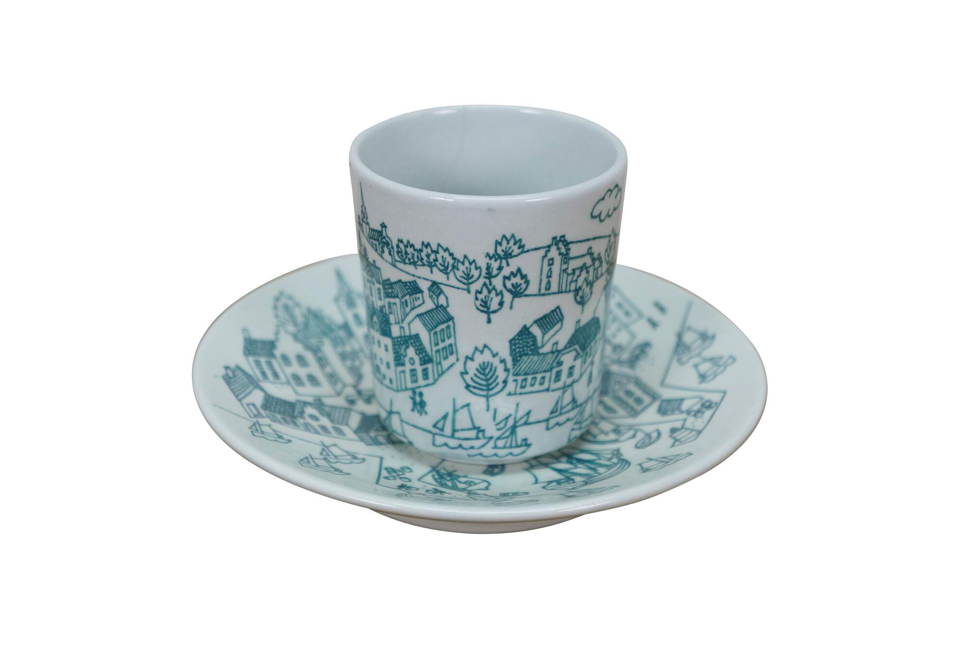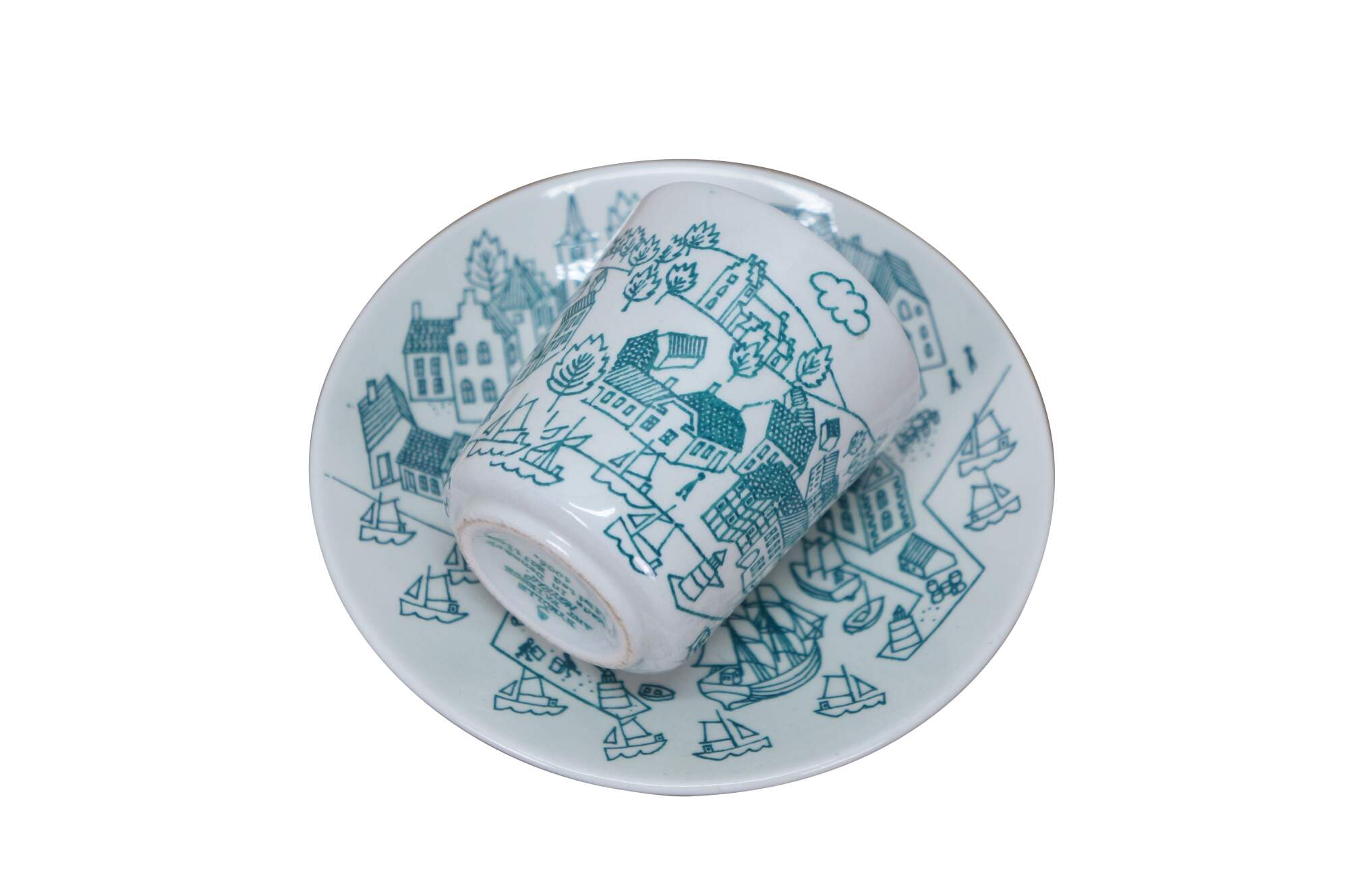 Mid 20th century Nymolle Denmark porcelain demitasse cup and saucer with dark teal green scene by Paul Hoyrup depicting a village with harbor filled with boats. Made in Denmark. Limited Edition 4006.