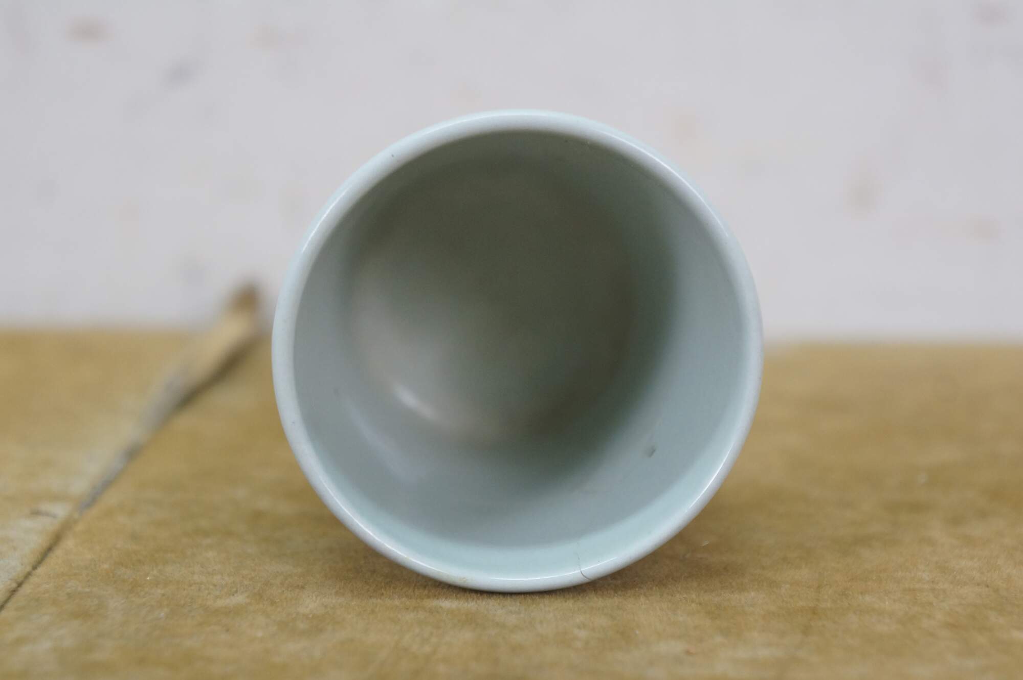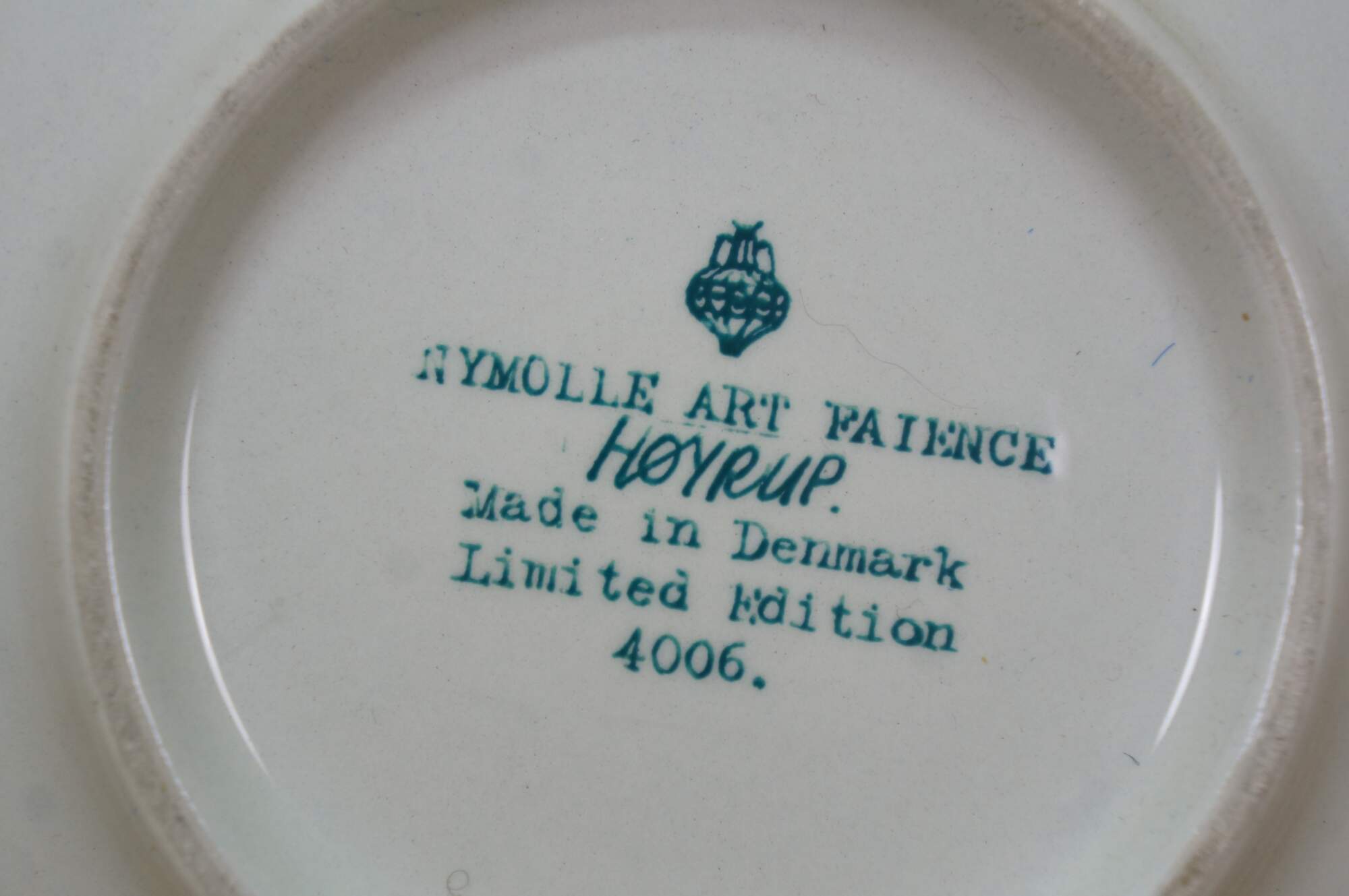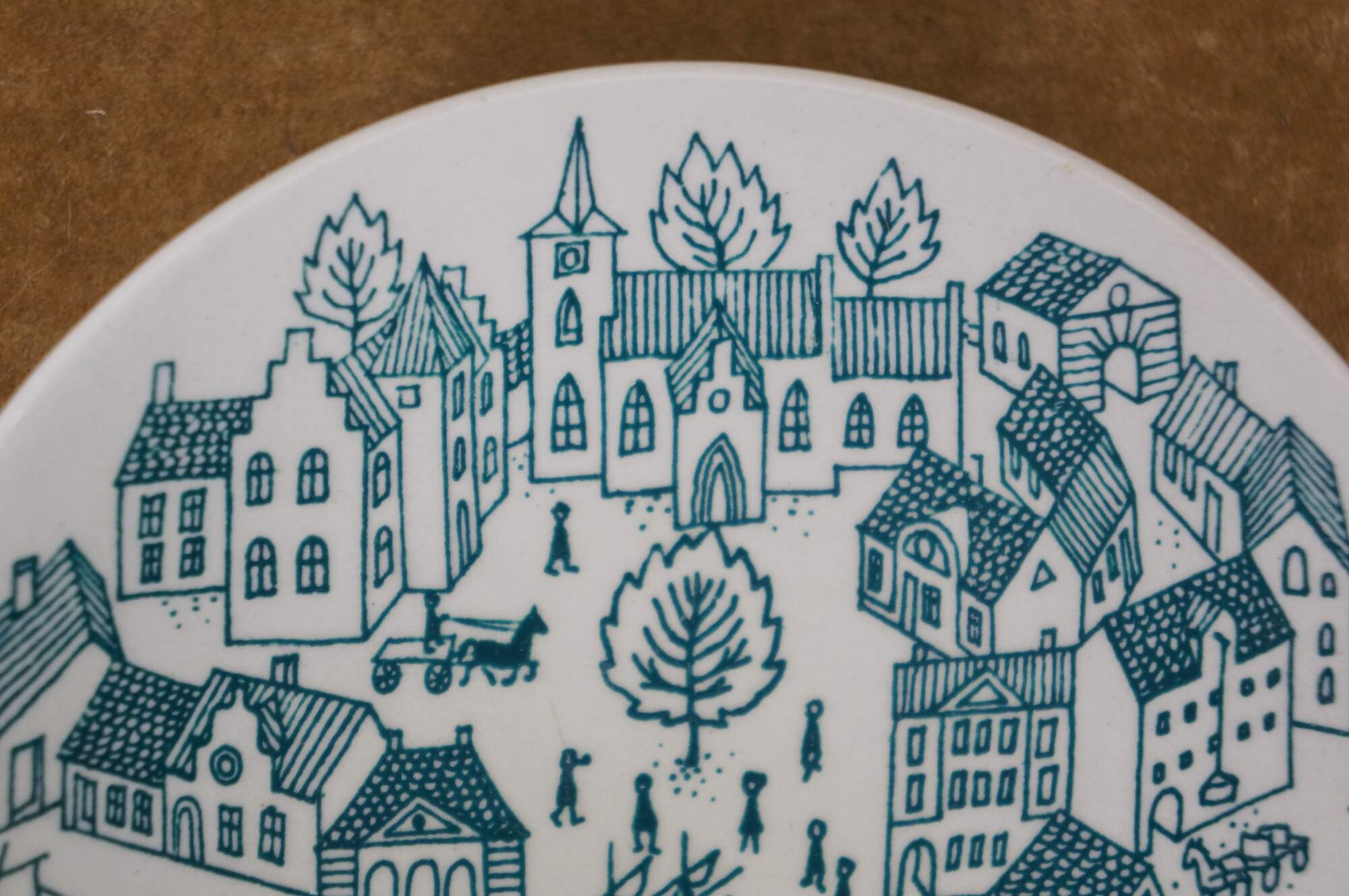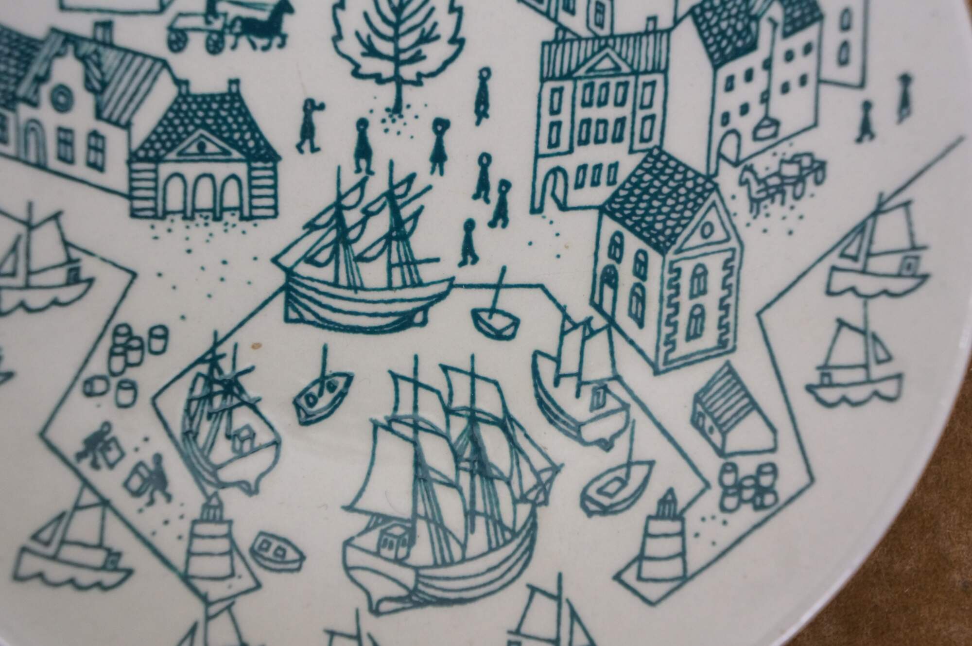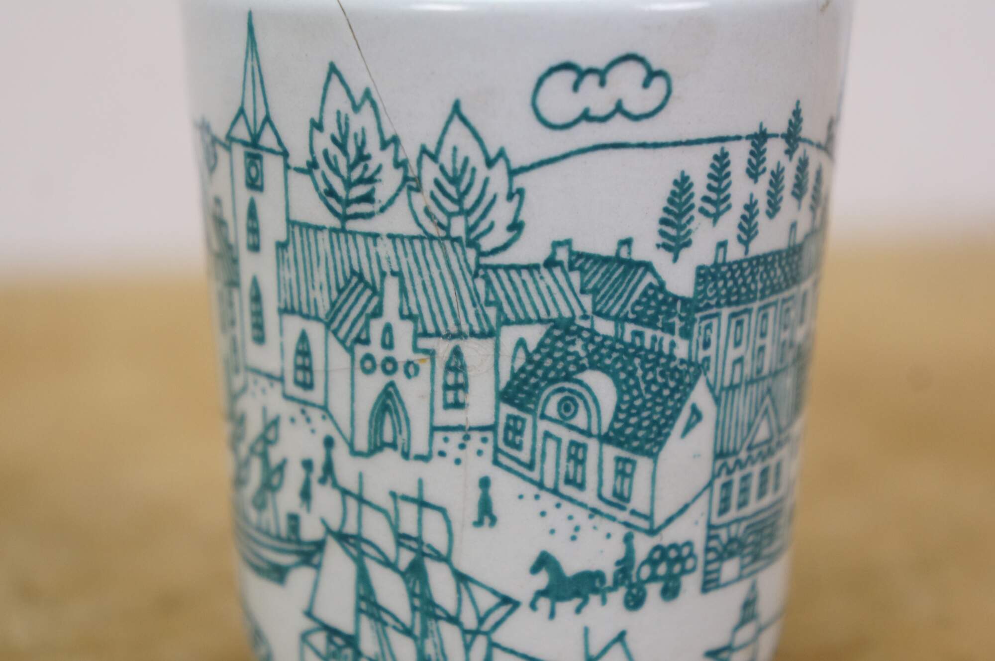 Mid 20th century Nymolle Denmark porcelain demitasse cup and saucer with dark teal green scene by Paul Hoyrup depicting a village with harbor filled with boats. Made in Denmark. Limited Edition 4006.