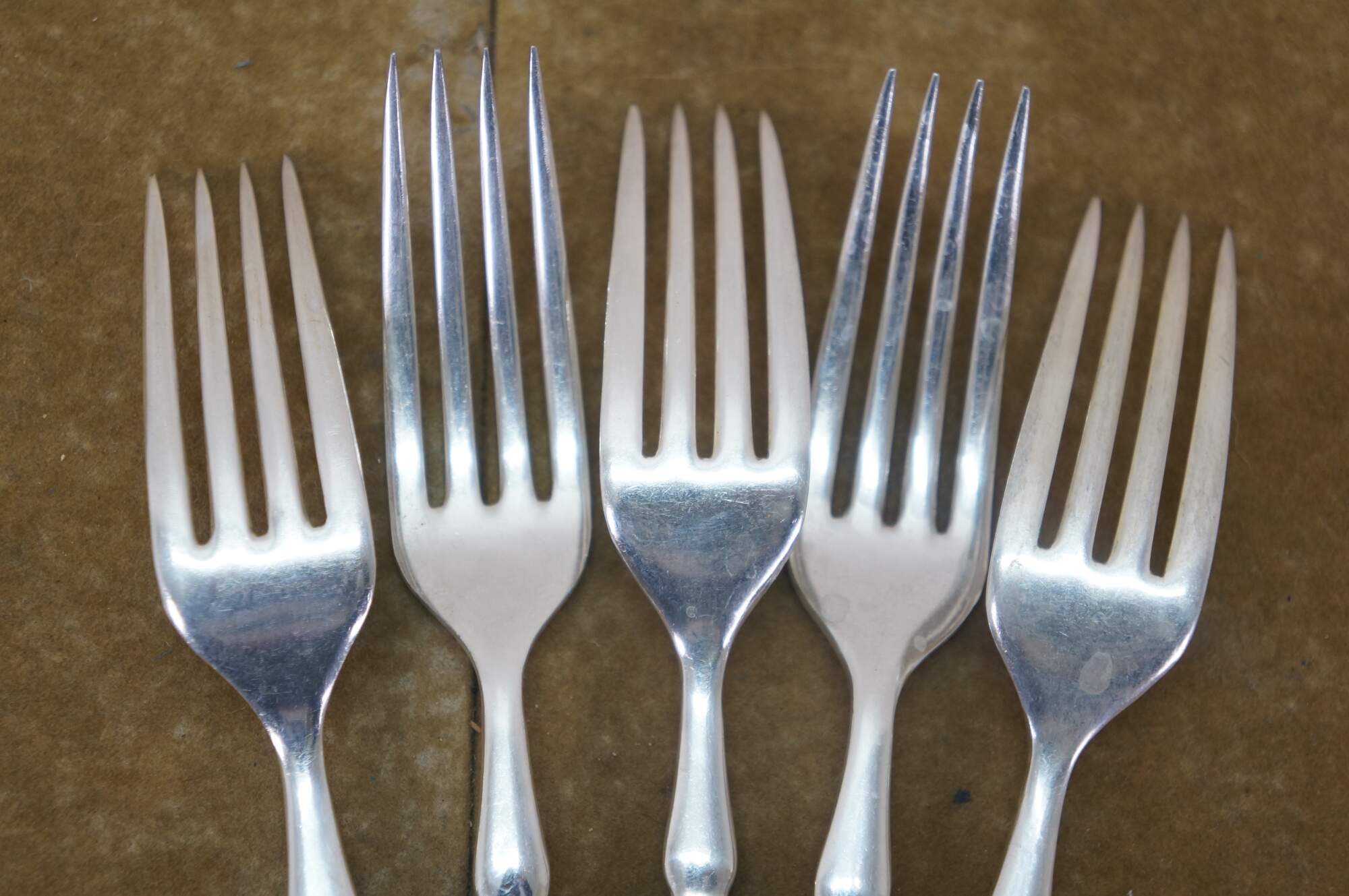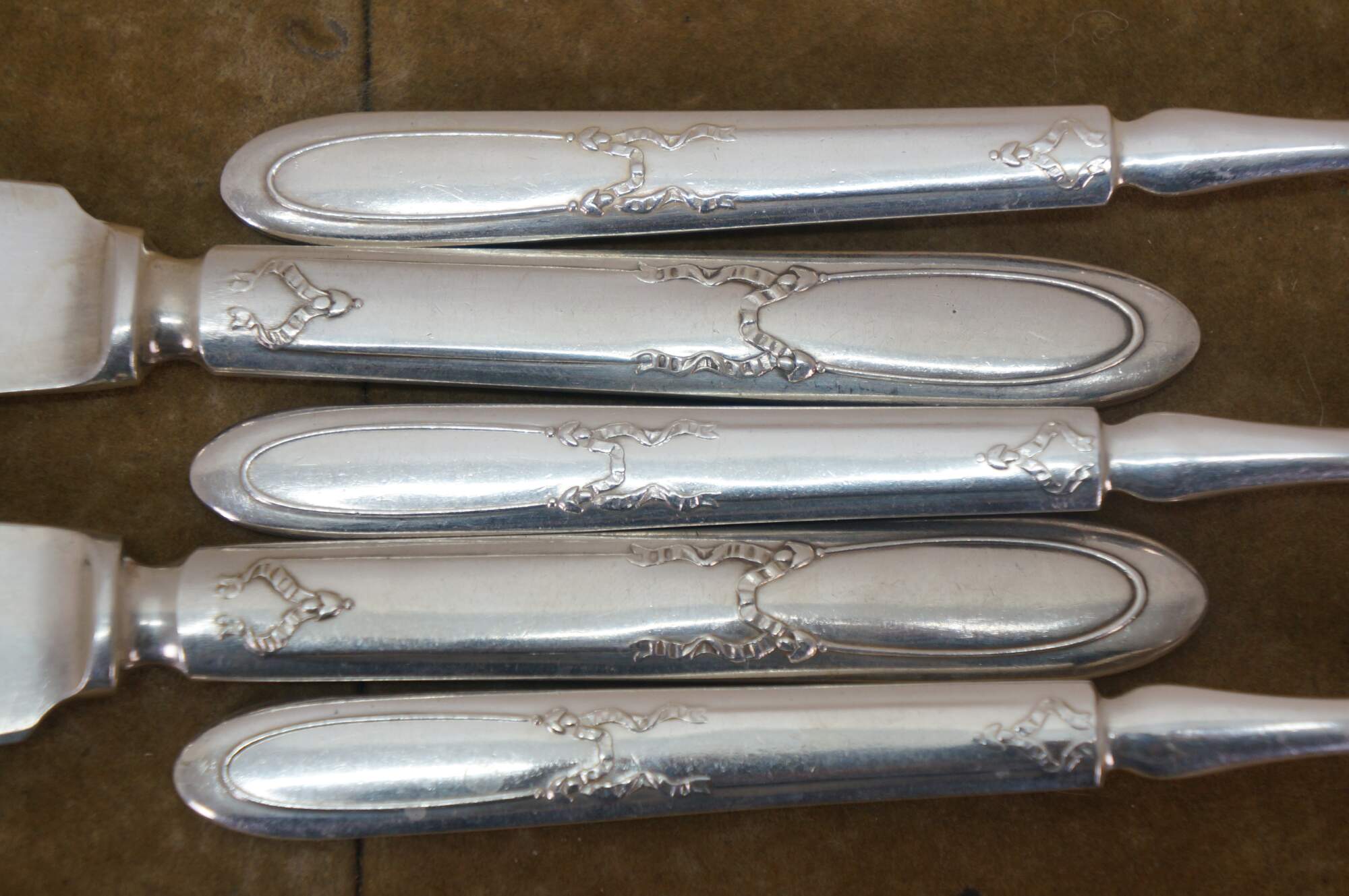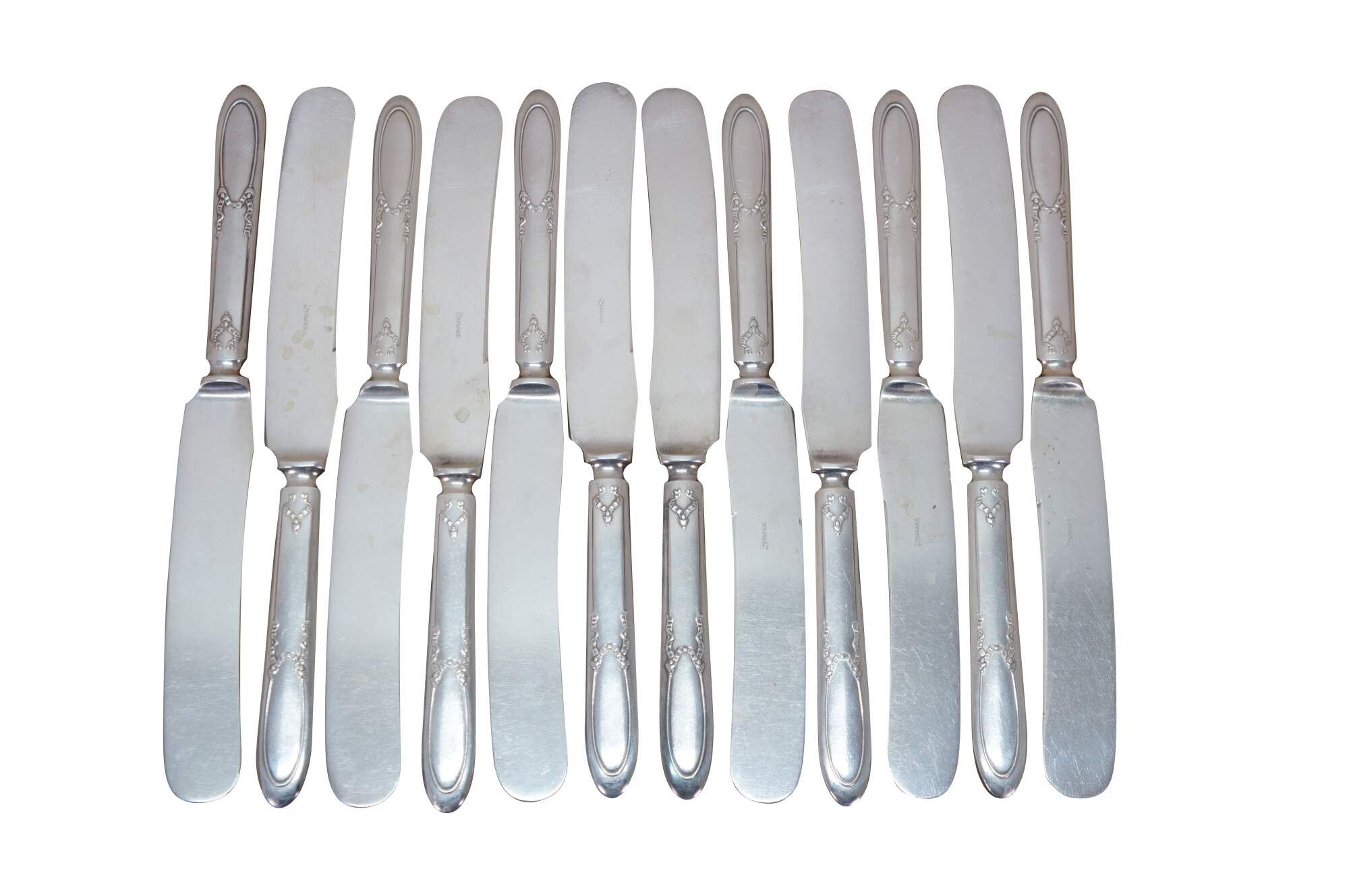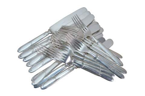 Early 20th century set of 24 Yourex table knives and dinner forks in the Panama pattern by the Associated Silver Company. Design features rounded ends, bell shaped drooping flowers and ribbon swags. Service for 12.