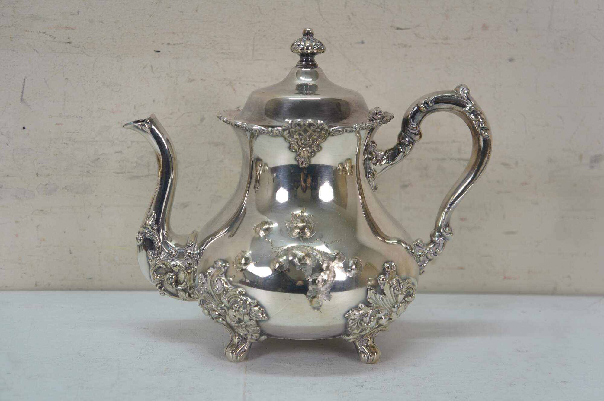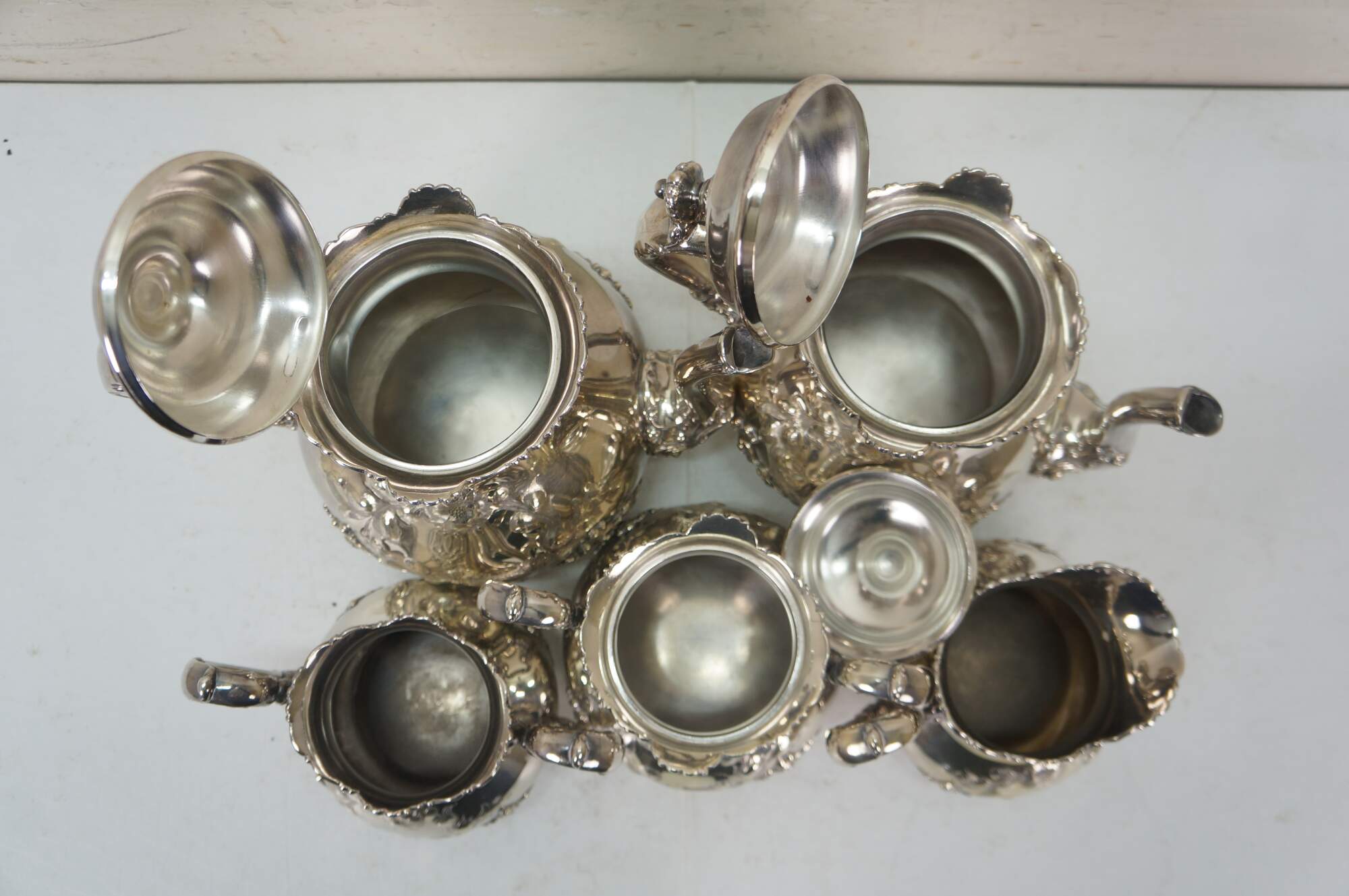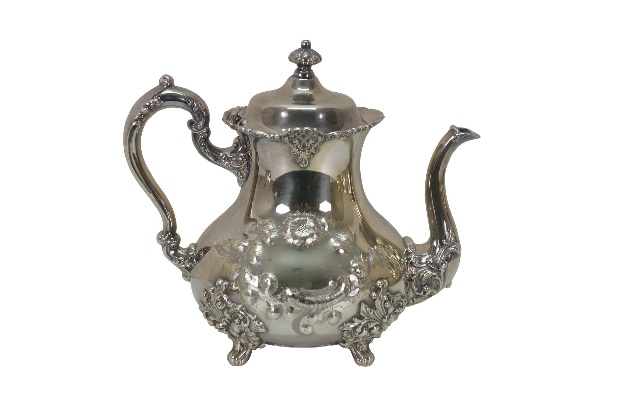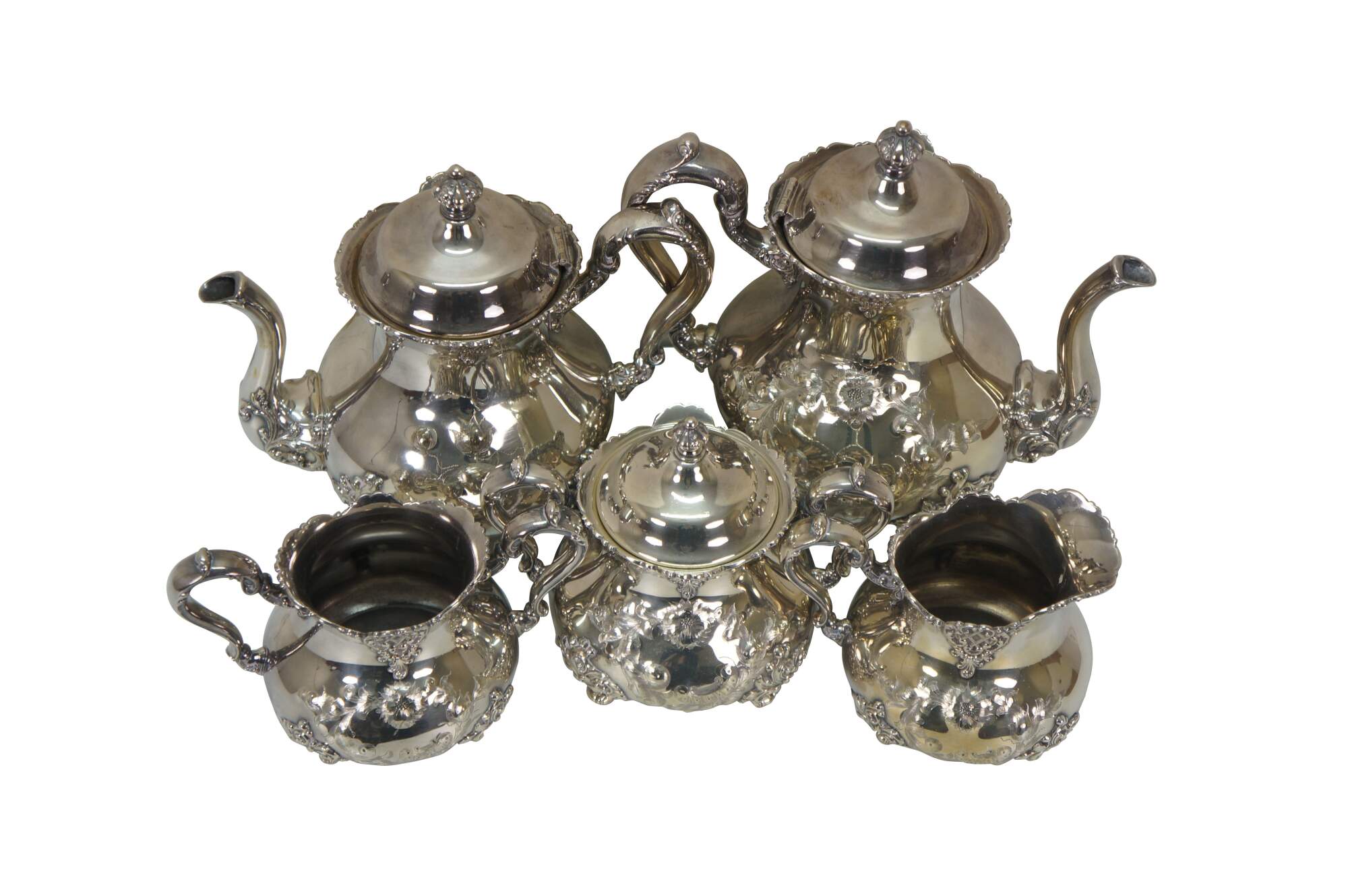 Vintage 20th century number 931 Poole silverplate tea set including: Teapot, Coffee Pot, Creamer, Sugar Bowl, and Waste Pot with Lid. Features a scrolling floral, foliate, and lattice design etched on the sides with additional flowers.