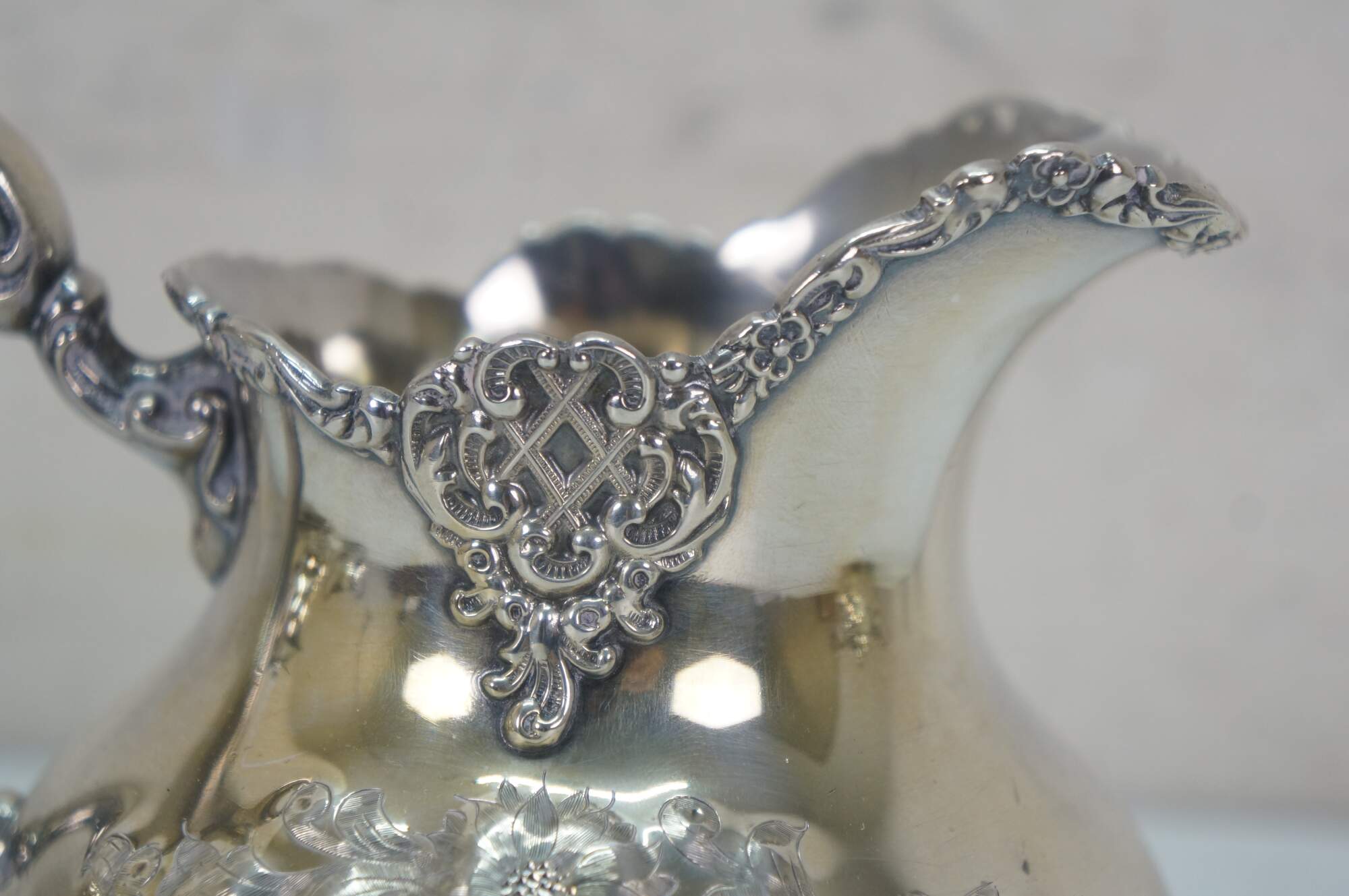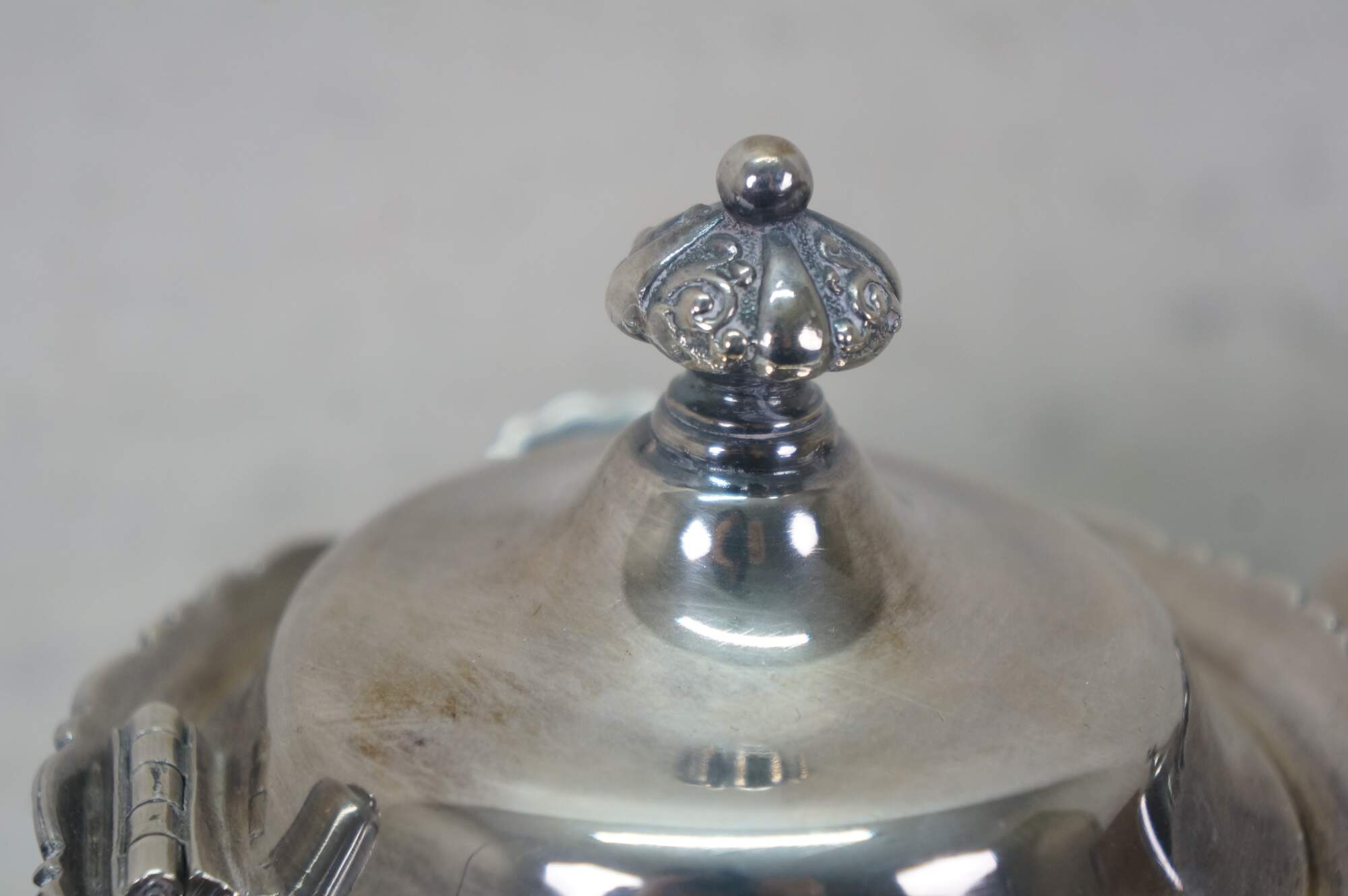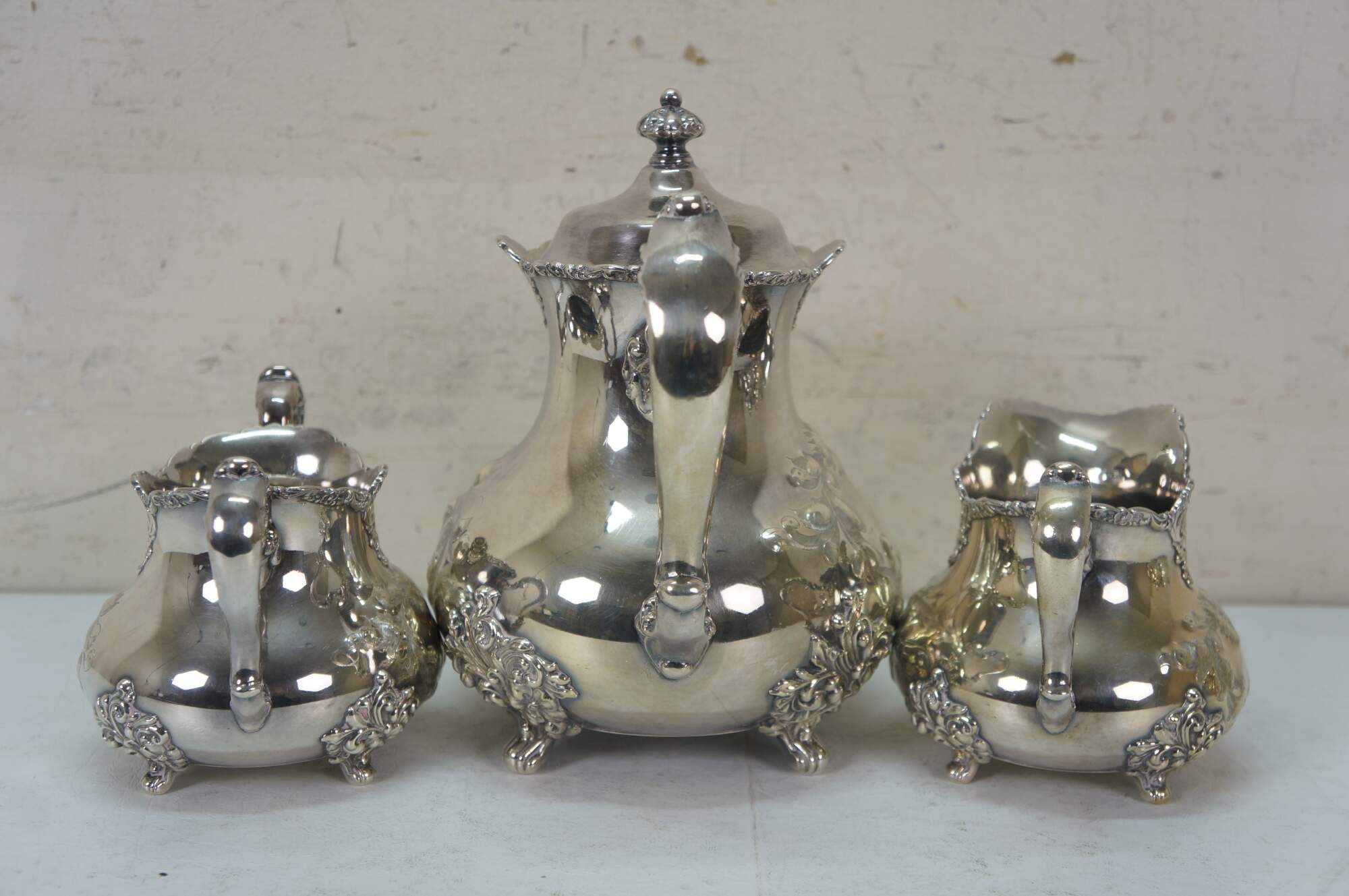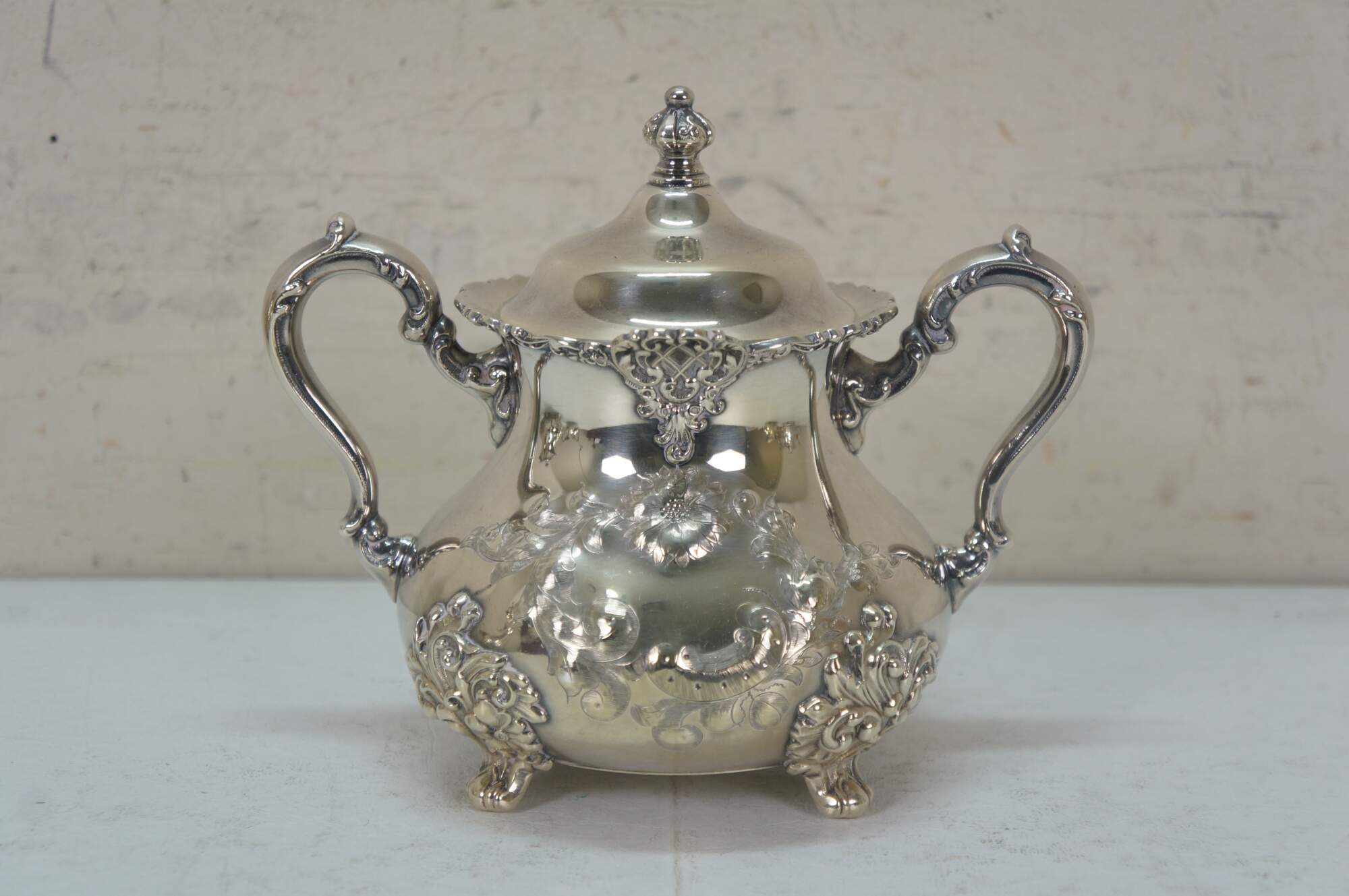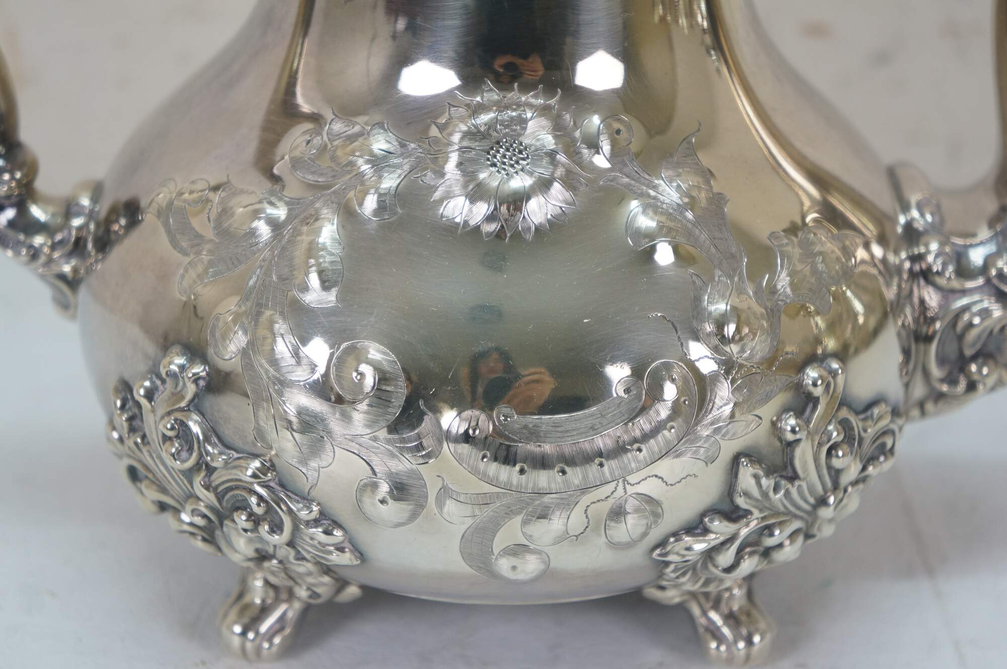 Vintage 20th century number 931 Poole silverplate tea set including: Teapot, Coffee Pot, Creamer, Sugar Bowl, and Waste Pot with Lid. Features a scrolling floral, foliate, and lattice design etched on the sides with additional flowers.