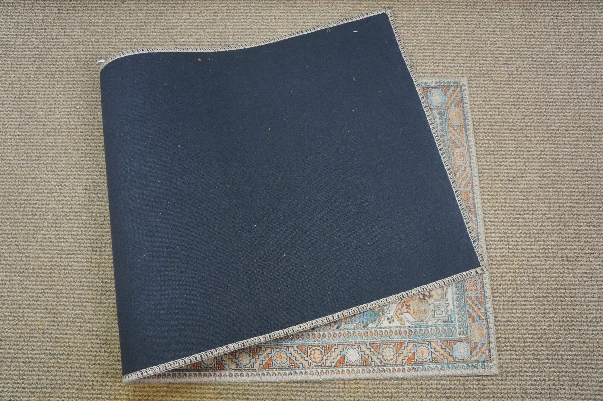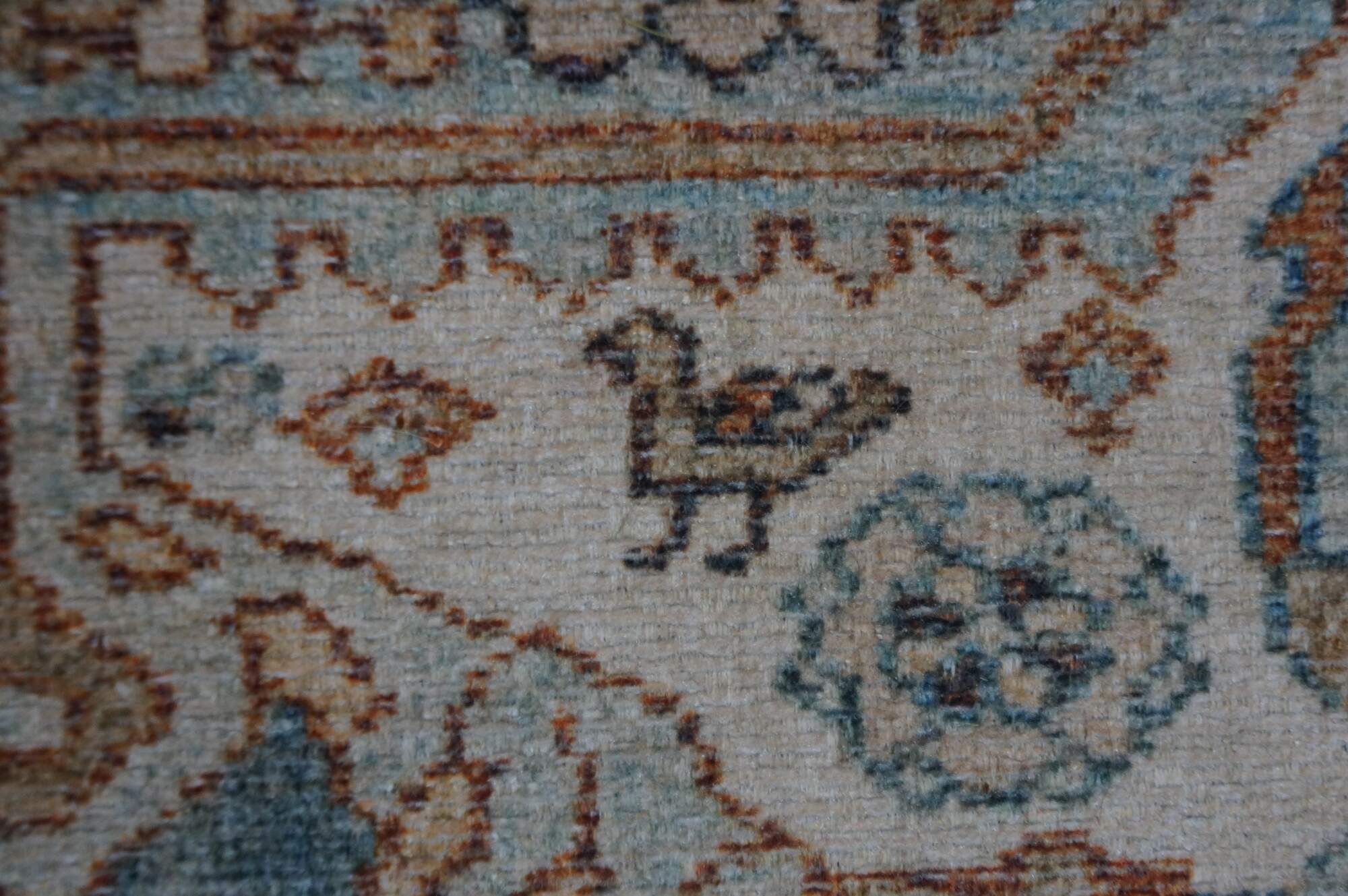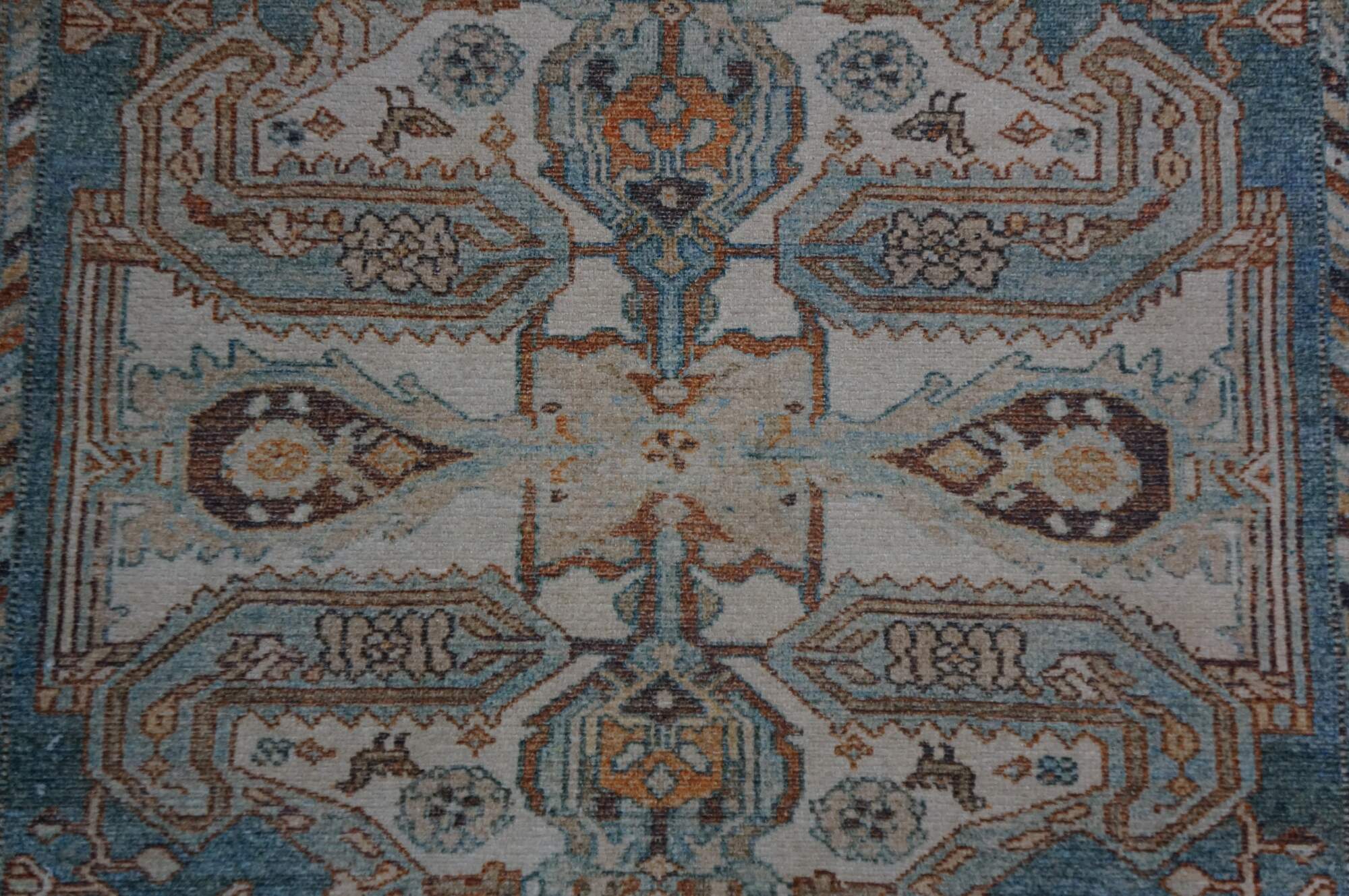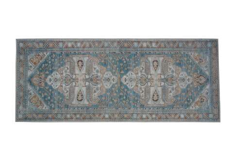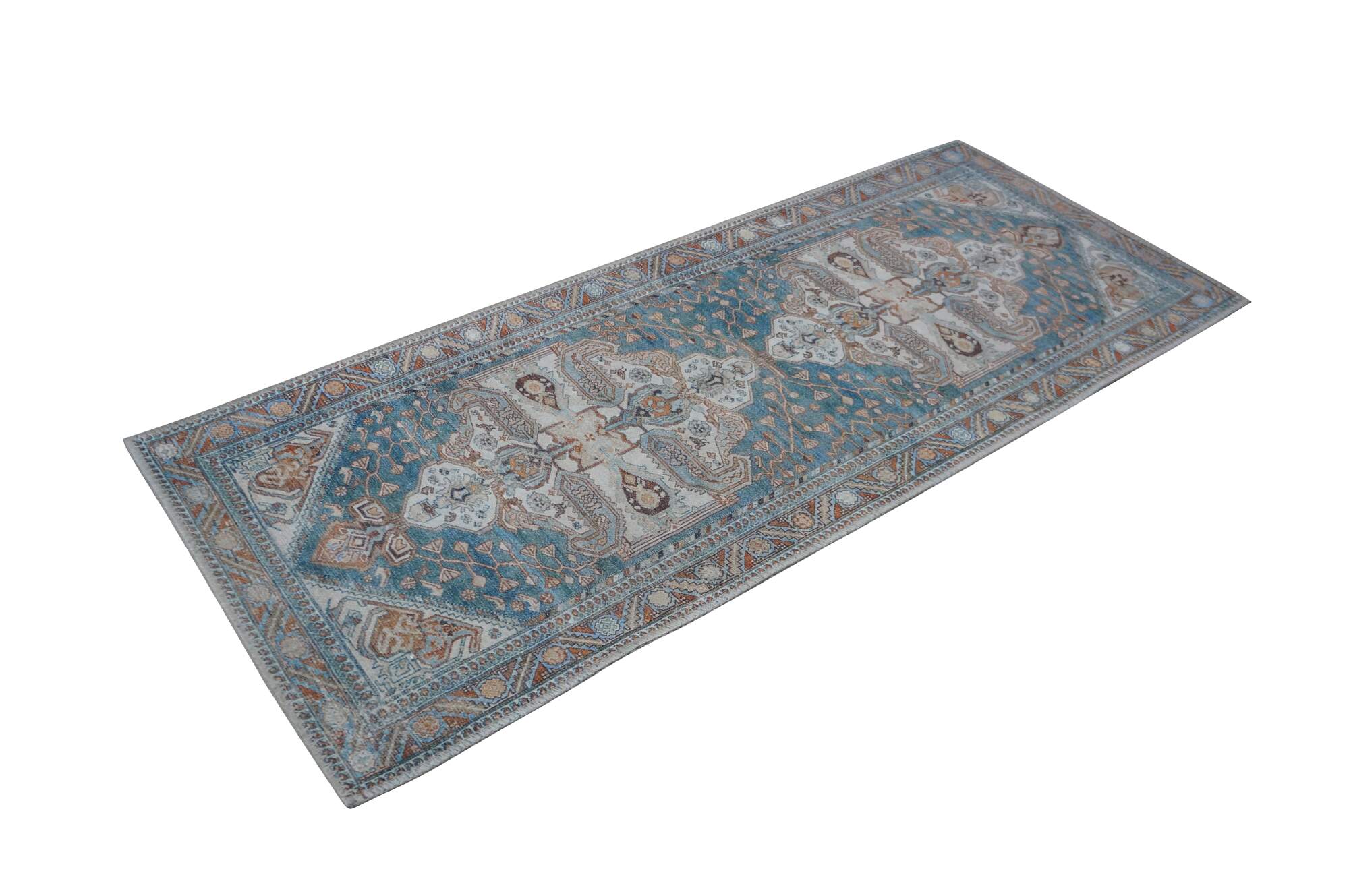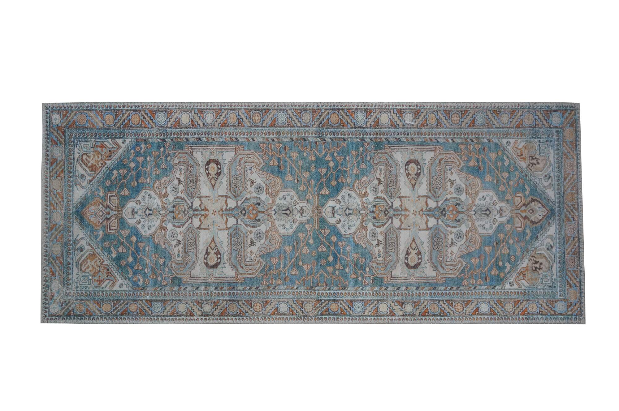 Late 20th century carpet runner / mat. Traditional geometric and floral design in turquoise, rust and beige.