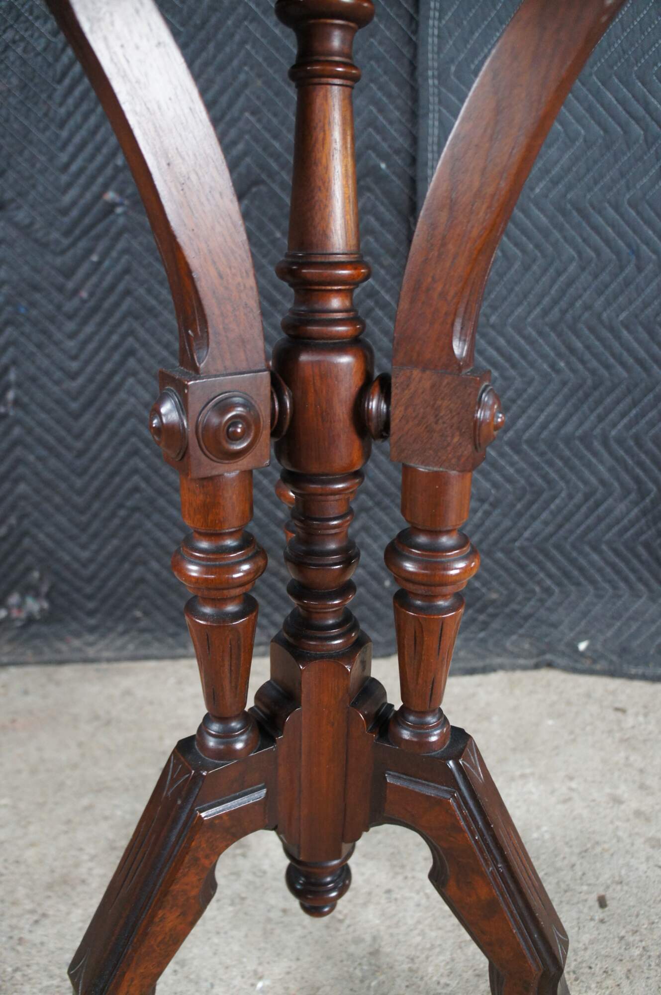 An antique Victorian era Eastlake parlor pedestal table or plant stand, circa 1880s. Made from walnut with a round top with carved edge over a burled frieze with leaf carving over a tripod base leading to downswept legs.