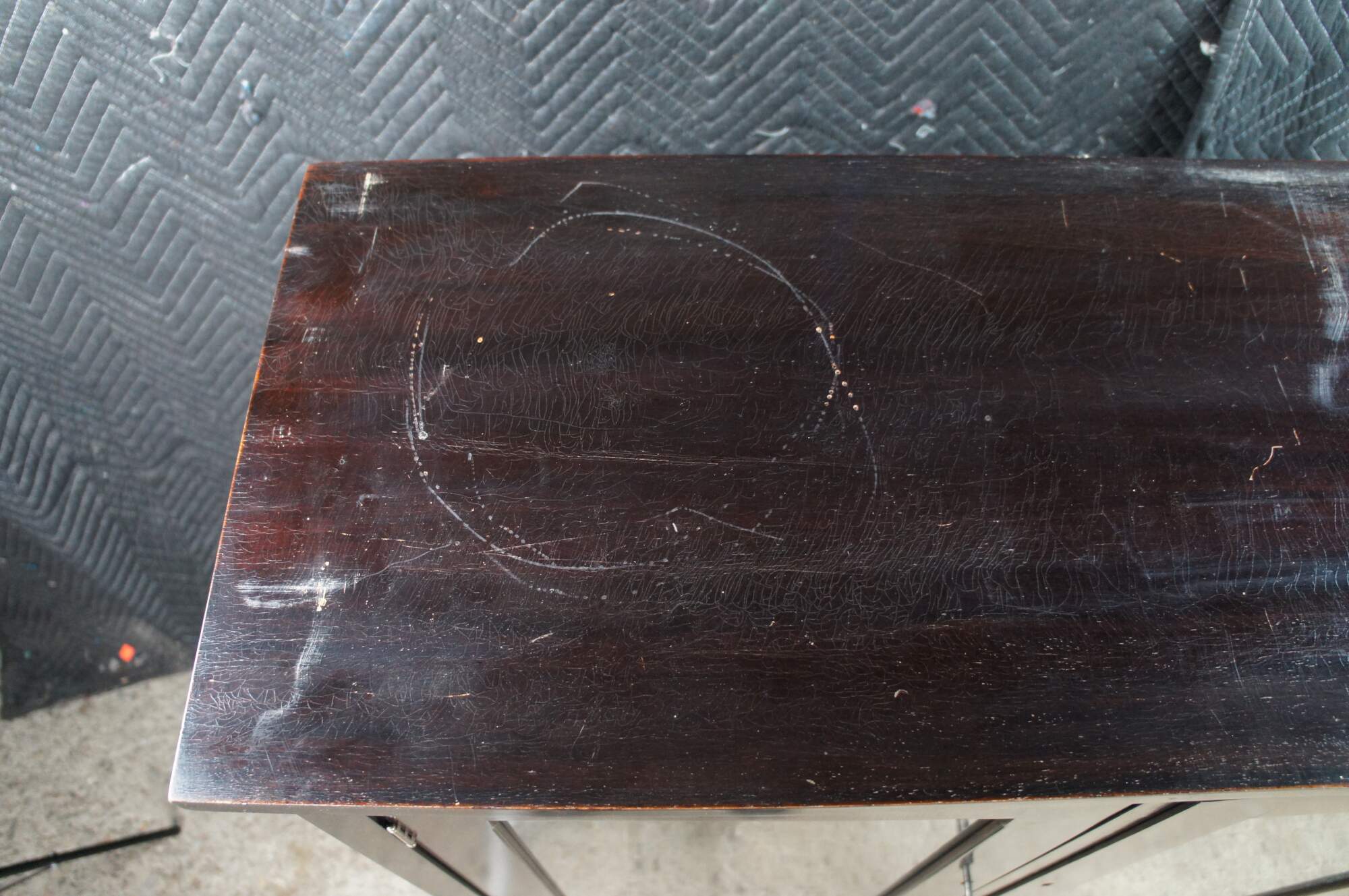 Fair; Structurally Solid, Distressing, marking, scuffing and edgewear. Alligatoring to veneer.