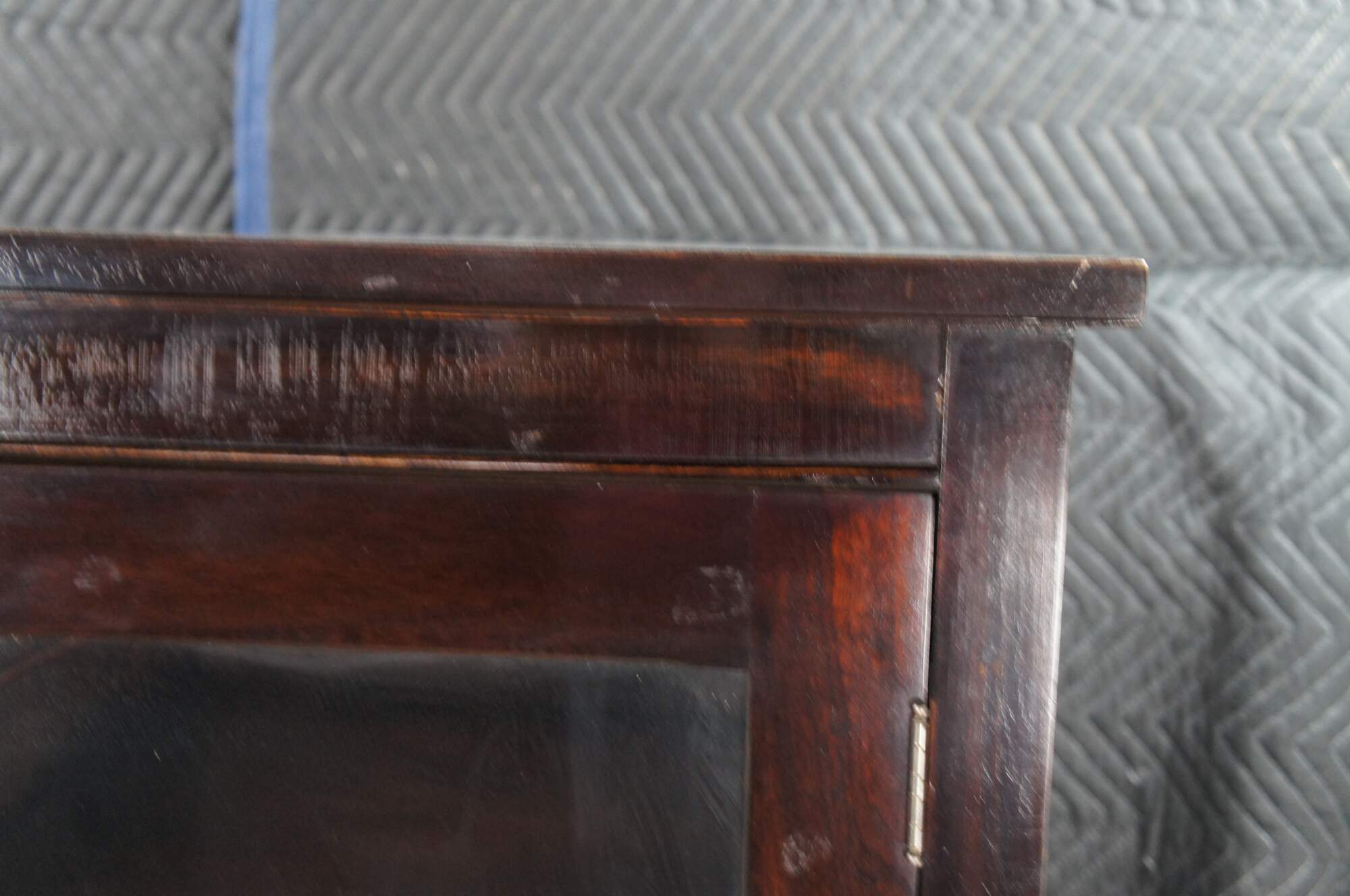 Early 20th Century Novelty Wood Works Company Craftsman Style Bookcase. Made from mahogany with two glass locking front doors that open to a divided interior with 10 shelves. The cabinet is supported by square tapered legs.