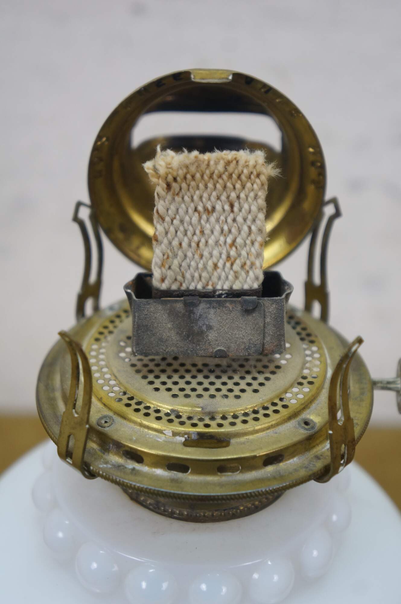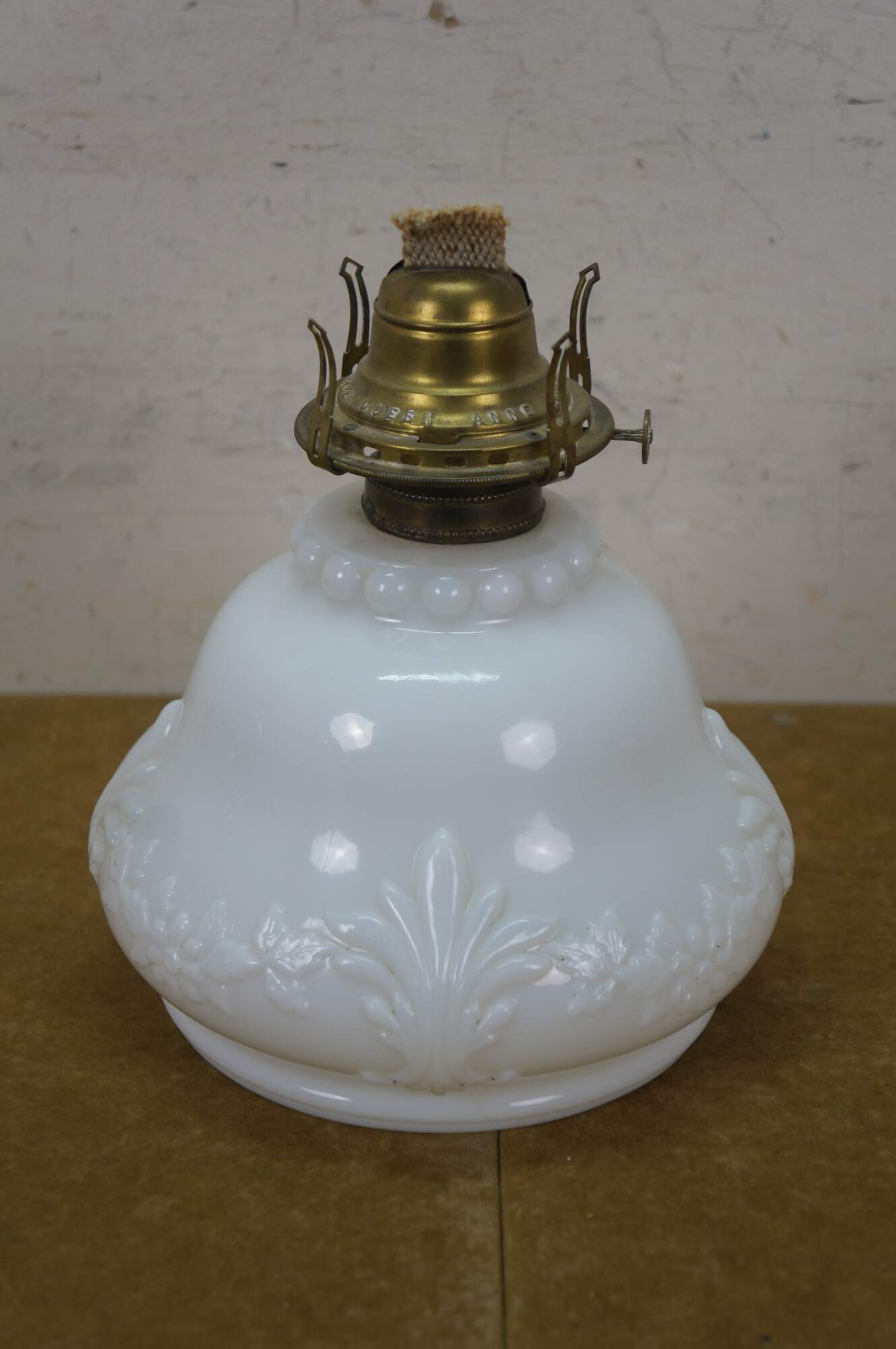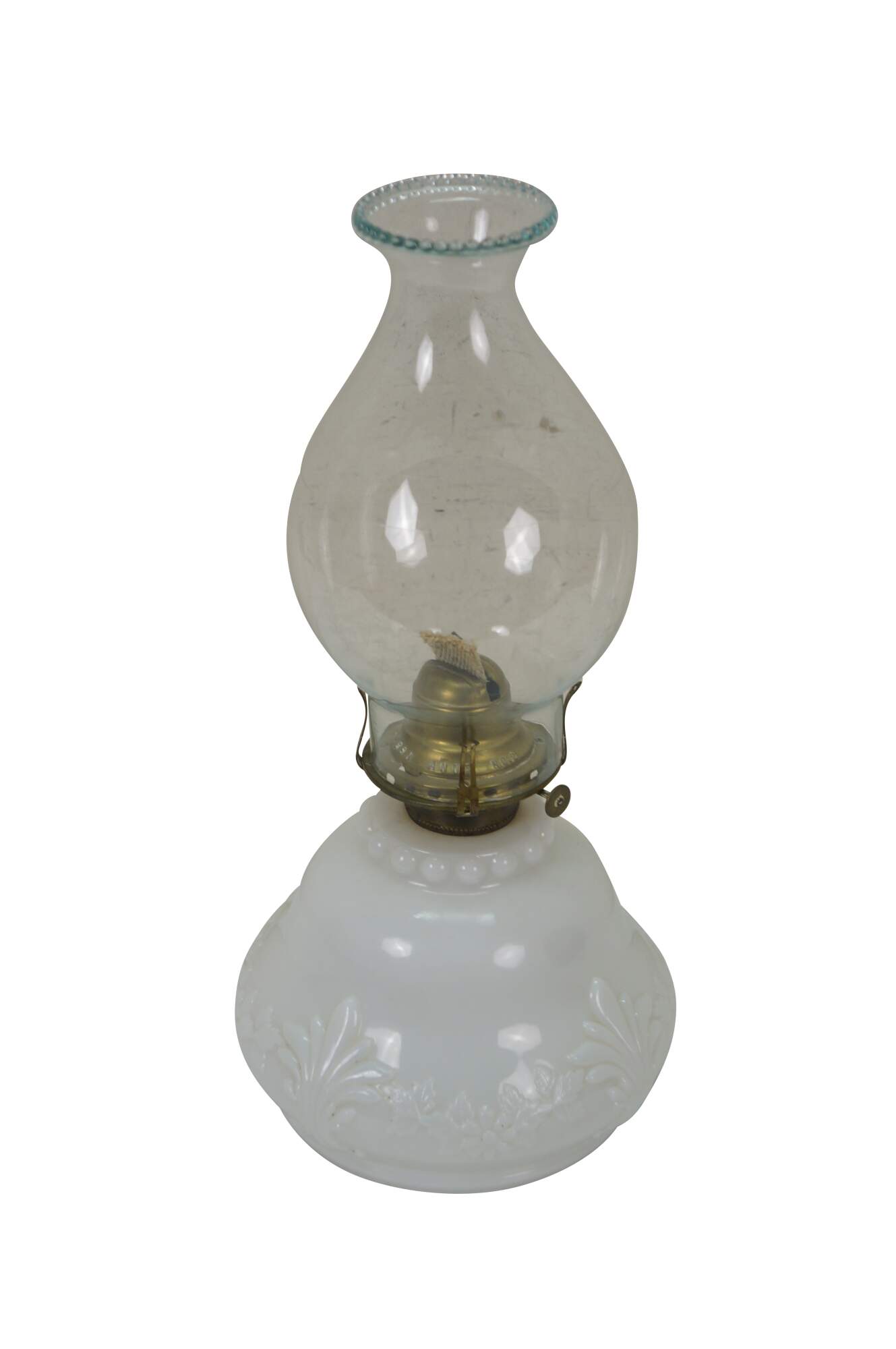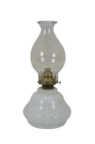 Late 19th to early 20th century Victorian oil lamp - milk glass reservoir pressed with floral swags and foliate plumes. Scovill Manufacturing Company Queen Anne No 2 burner with wick. Clear glass hurricane with beaded rim and stamped with the image of the man in the moon with a wreath surrounding several five pointed stars.