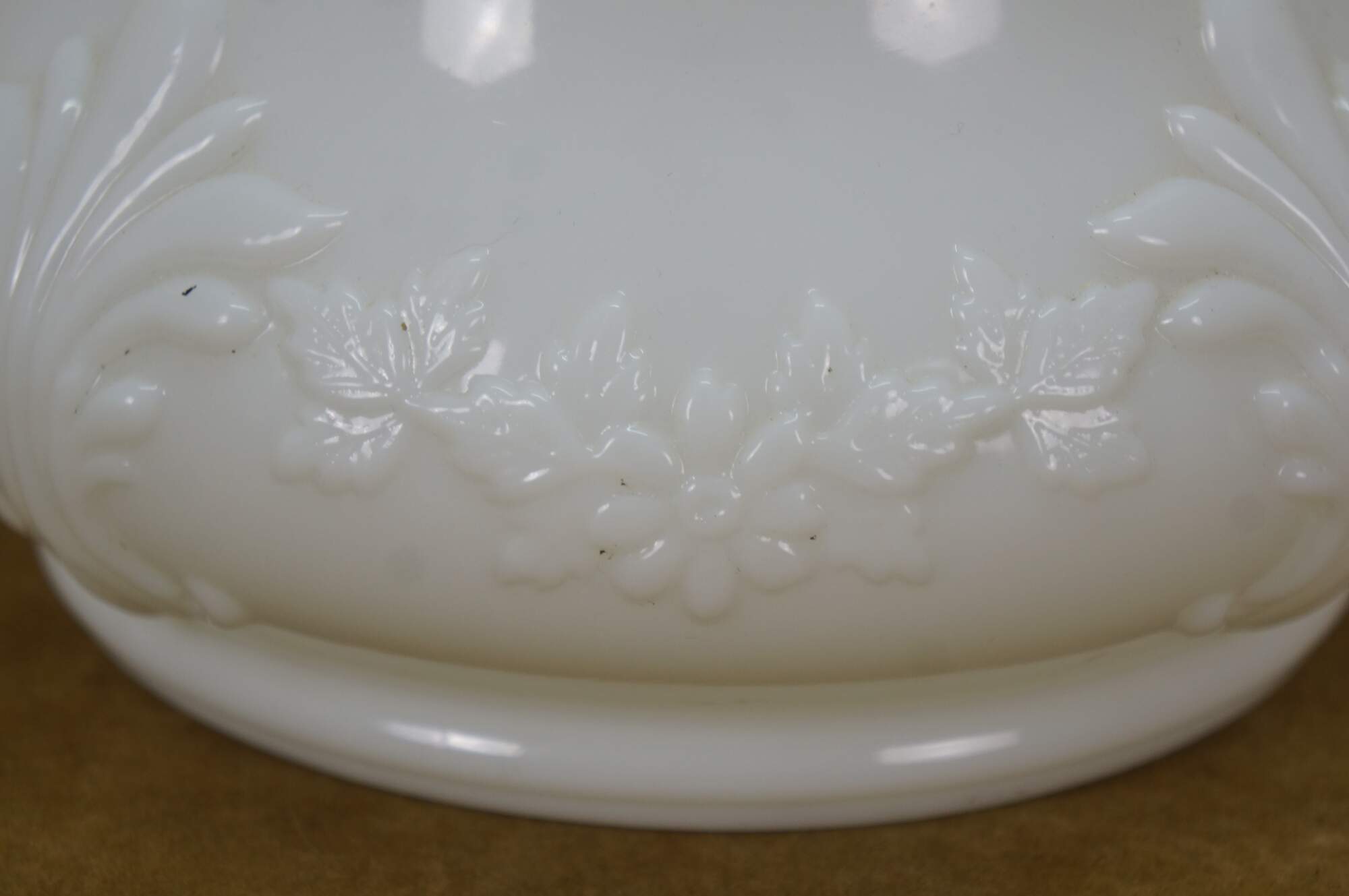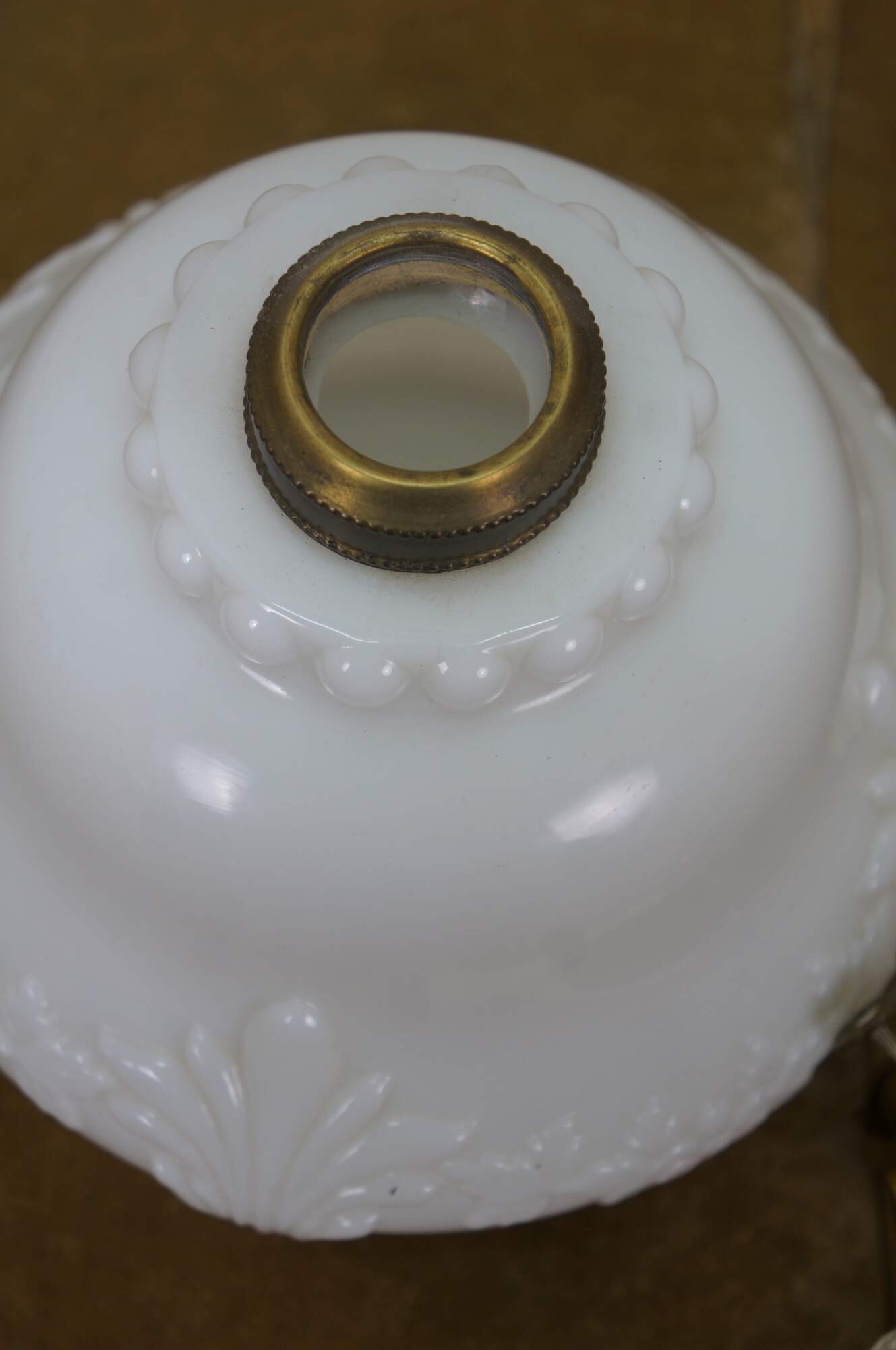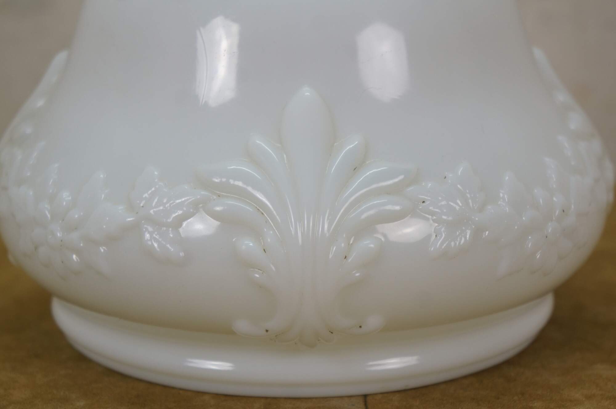 Late 19th to early 20th century Victorian oil lamp - milk glass reservoir pressed with floral swags and foliate plumes. Scovill Manufacturing Company Queen Anne No 2 burner with wick. Clear glass hurricane with beaded rim and stamped with the image of the man in the moon with a wreath surrounding several five pointed stars.