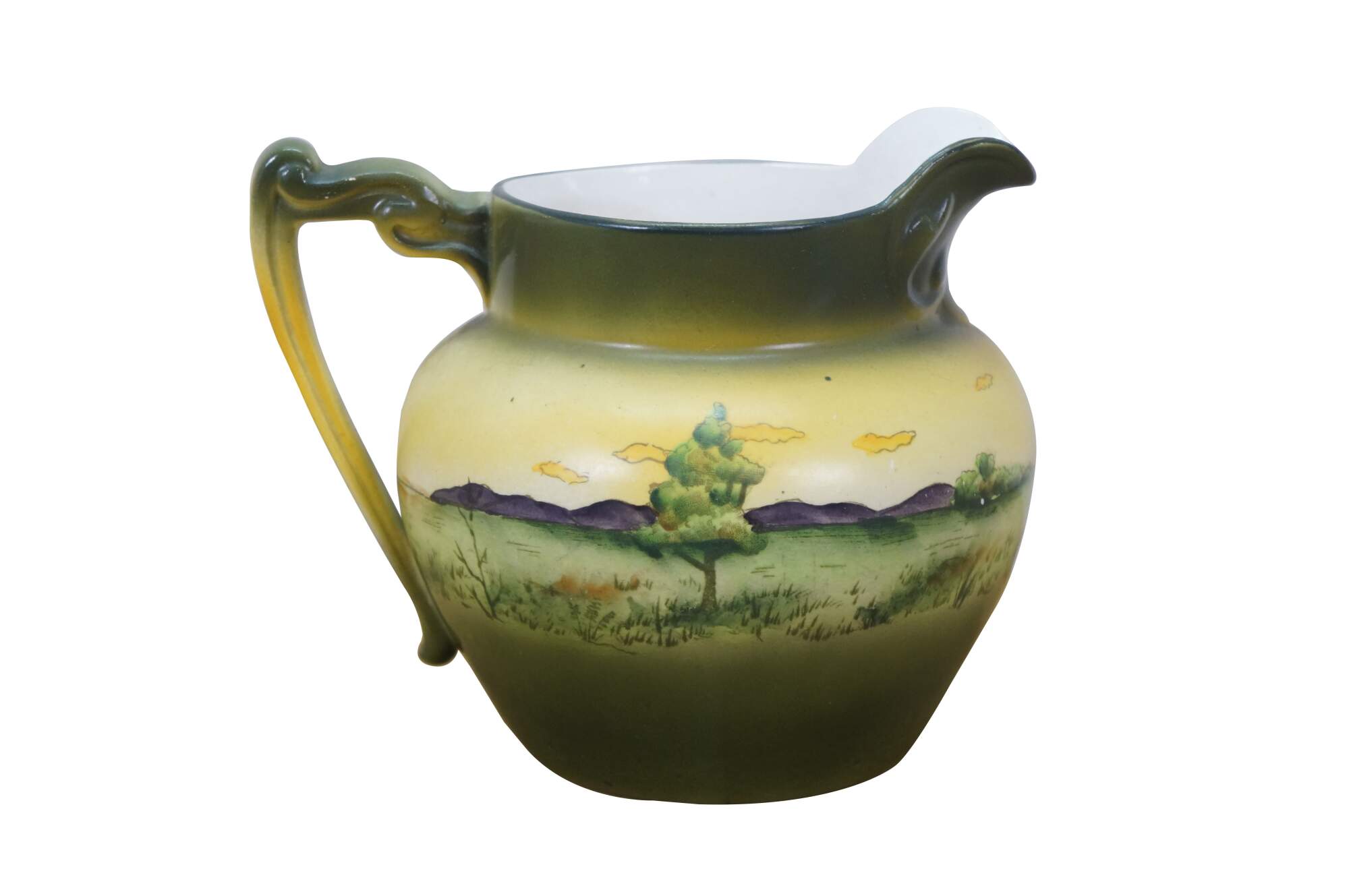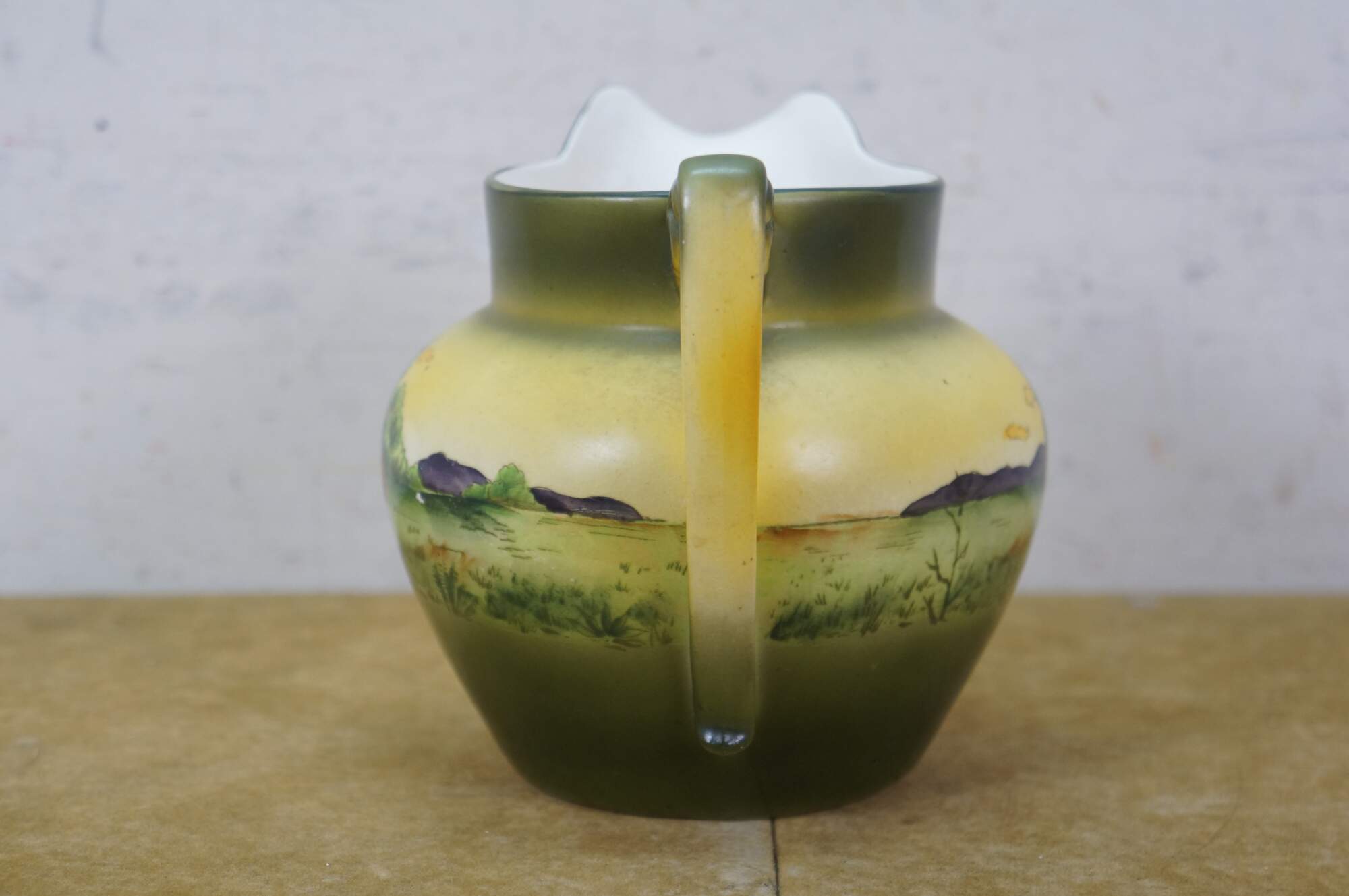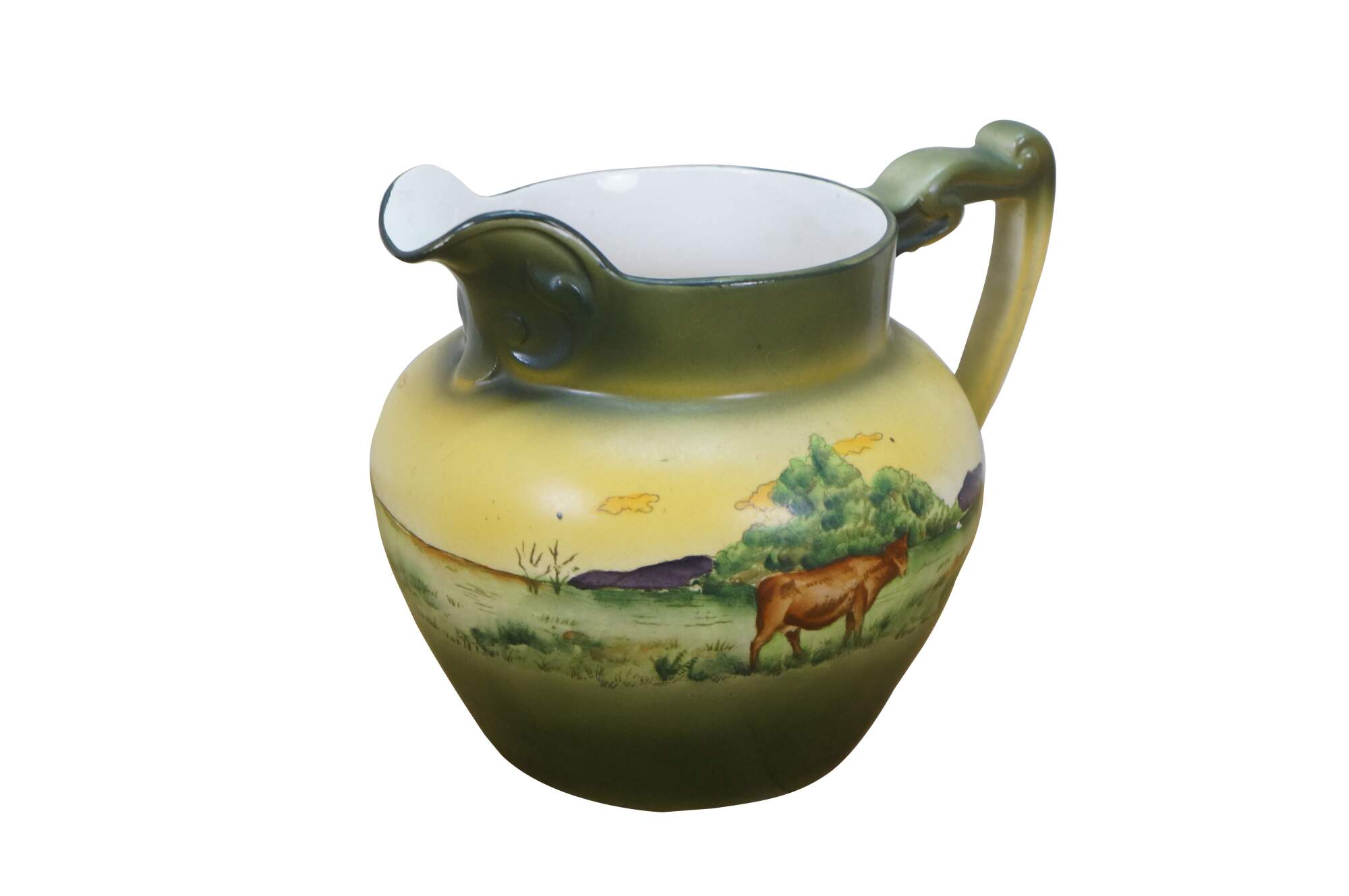 Late 19th to early 20th century porcelain Haynes Ware farmhouse cream pitcher by D.F. Haynes & company in the Cloverdale pattern. Fully decorated in green and yellow with a hand painted country landscape focused on a brown cow.