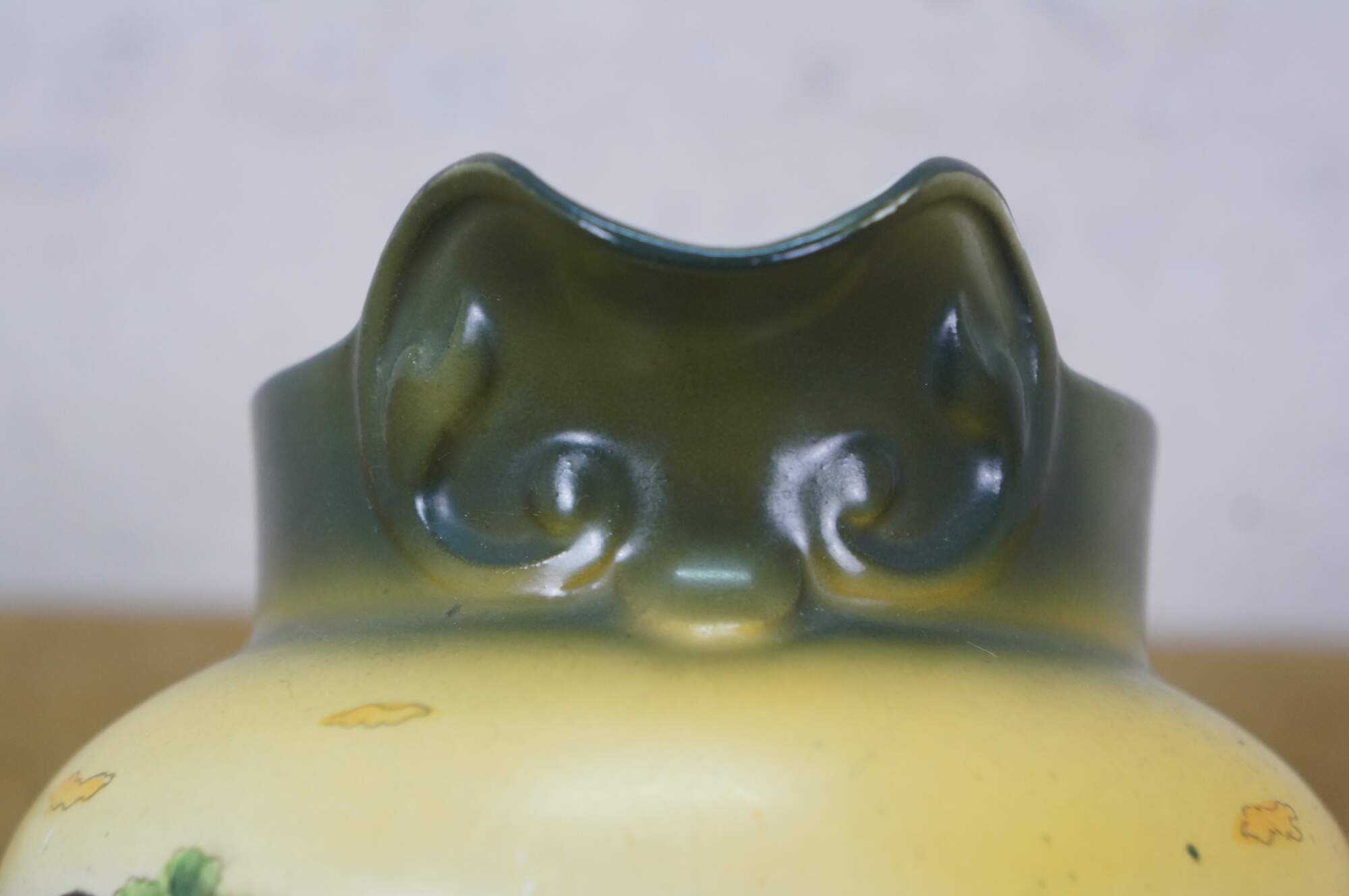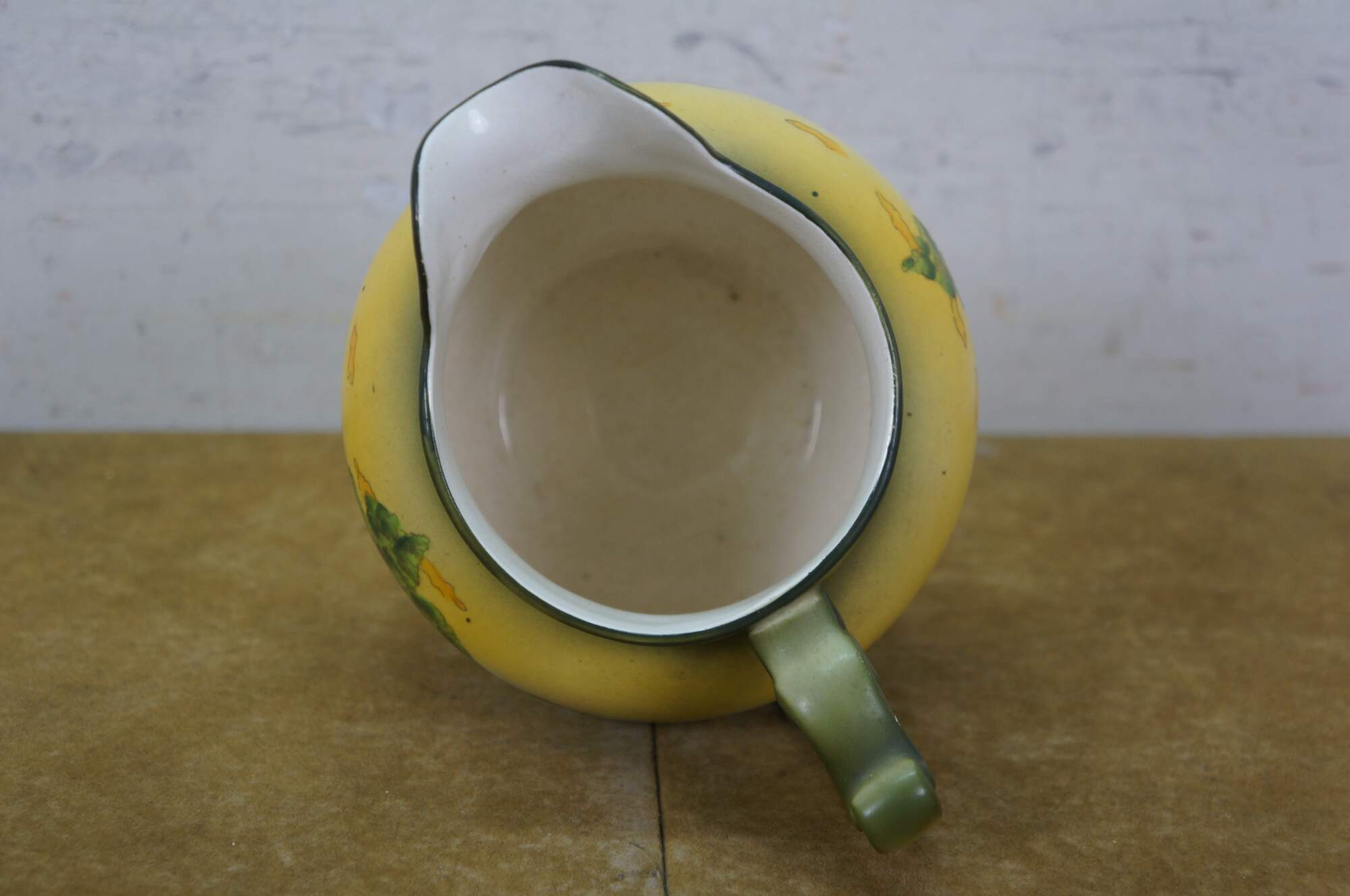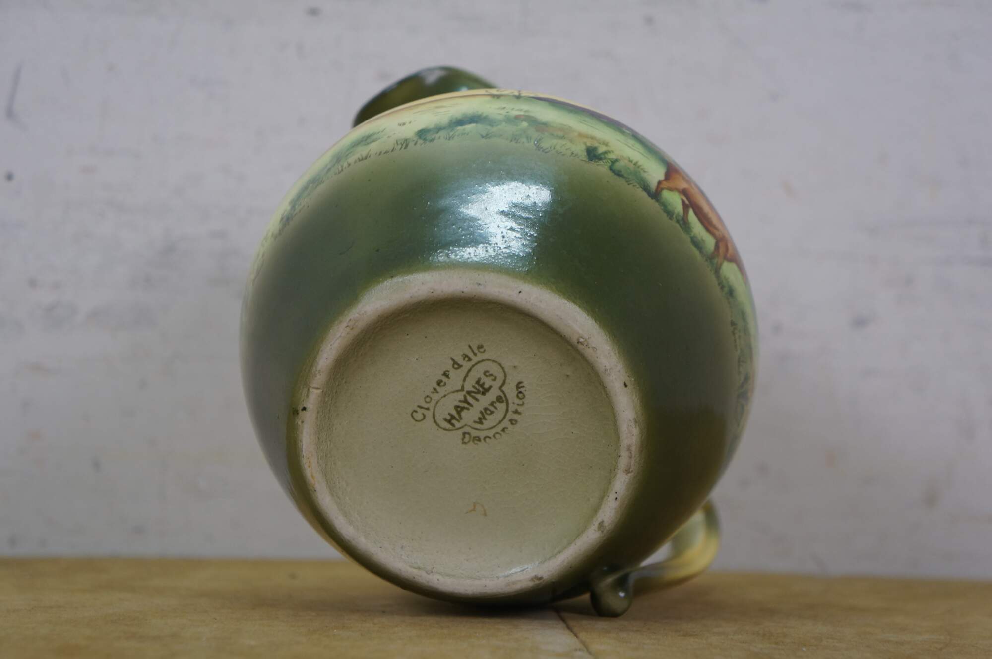 Late 19th to early 20th century porcelain Haynes Ware farmhouse cream pitcher by D.F. Haynes & company in the Cloverdale pattern. Fully decorated in green and yellow with a hand painted country landscape focused on a brown cow.