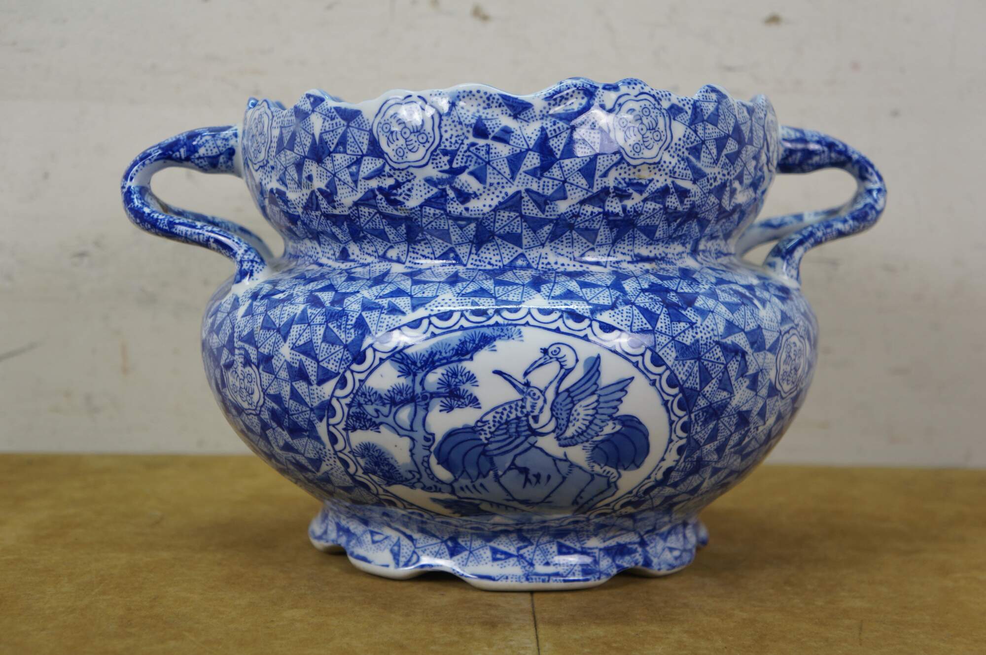 Late 20th century blue and white transferware porcelain cachepot / planter in the Delft style. Double handled with scalloped rim and footed base - decorated with Chinoiserie motifs including cranes by a gnarled pine and a still life of flowers, paint palette and book.