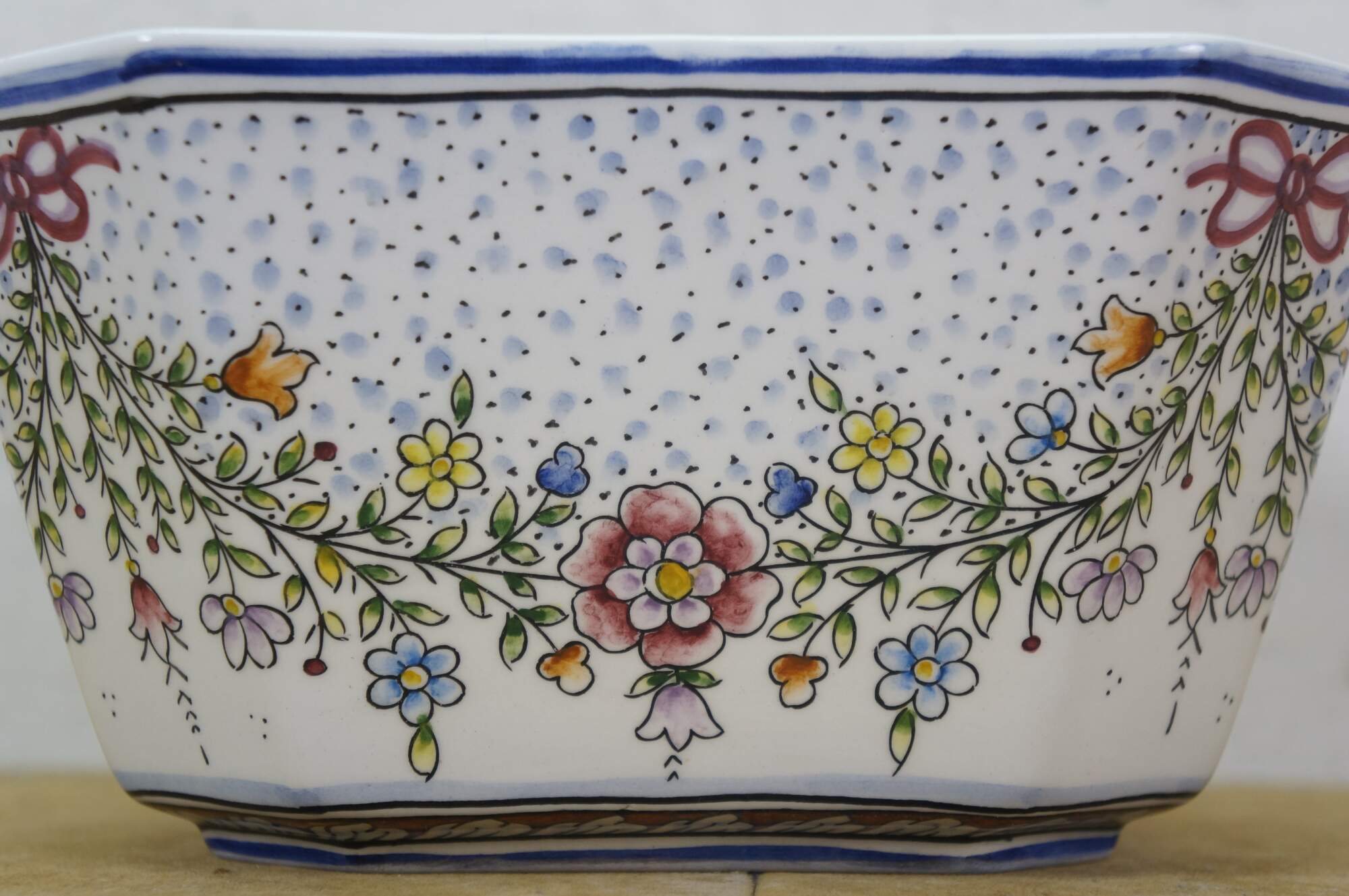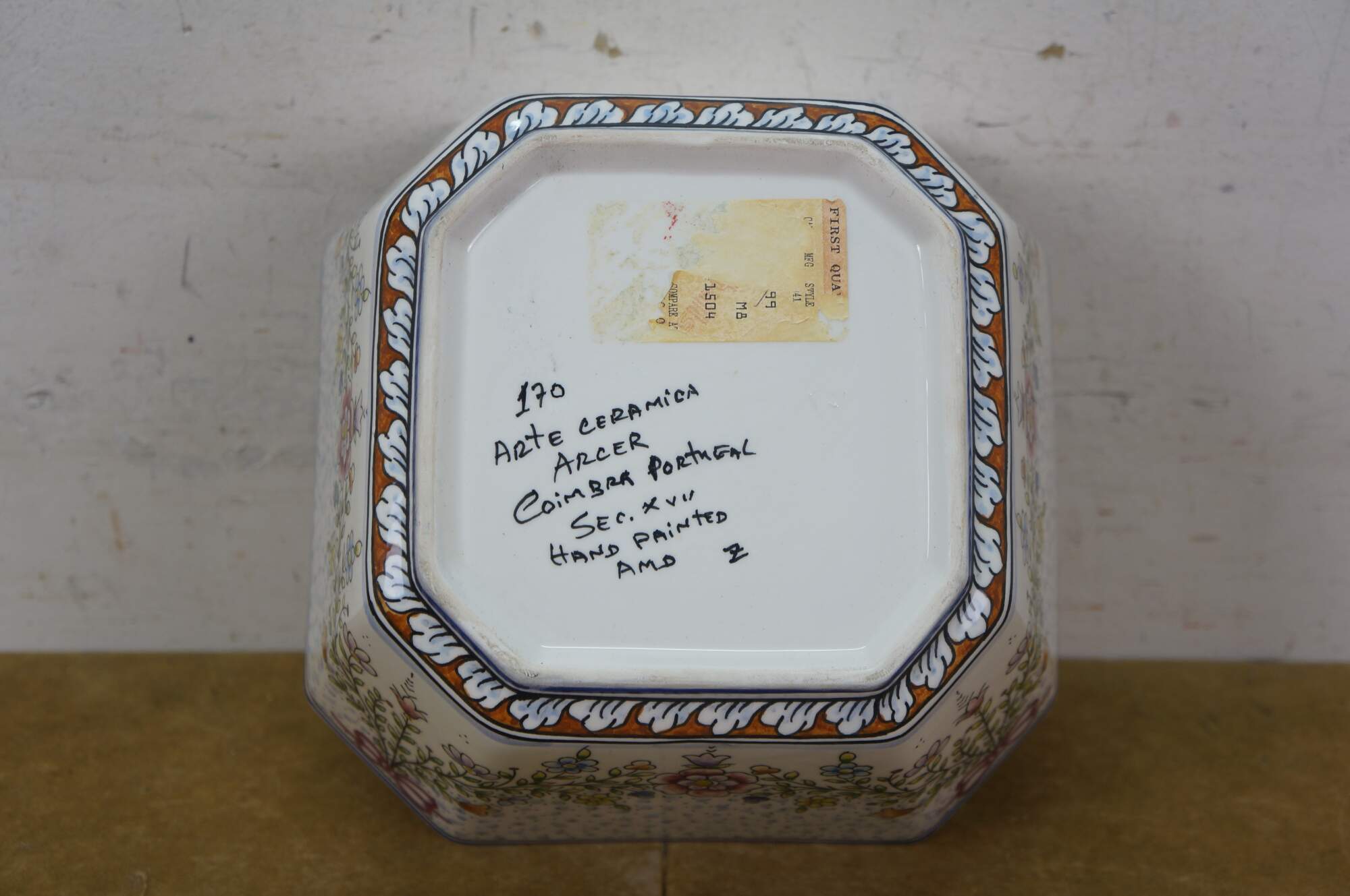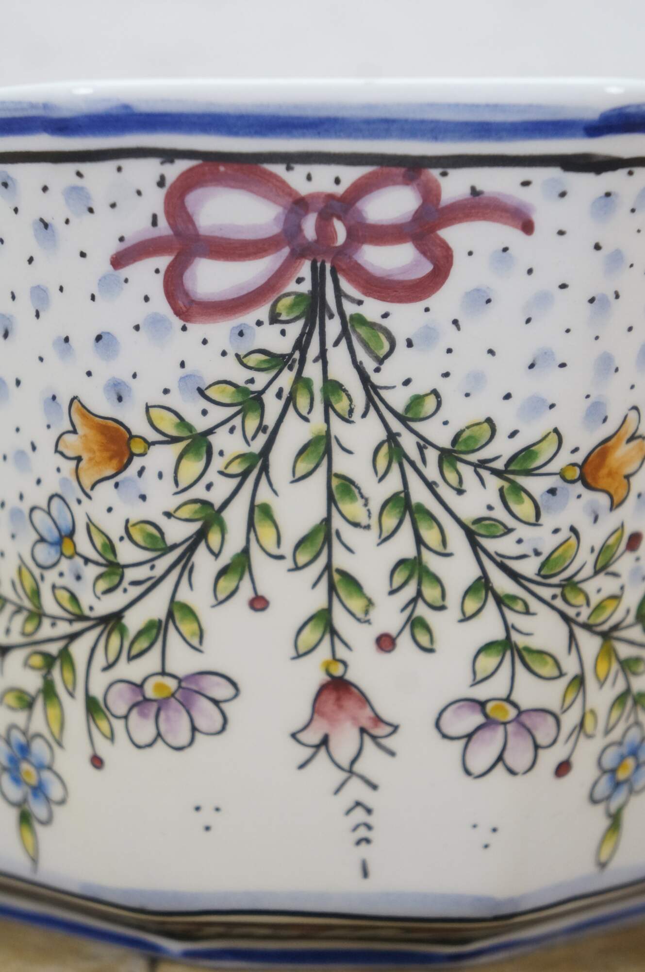 Late 20th century Portuguese ceramic faience bowl. White porcelain hand decorated with blue and pink geometric bands on the inside edge, and garland swags of flowers tied with ribbons outside. Octagonal form. 170 - Arte Ceramica - Arcer - Coimbra Portugal - Sec. XVII - Hand Painted - AMD Z.