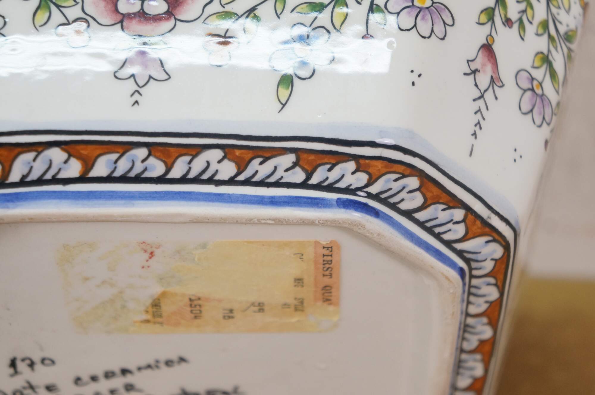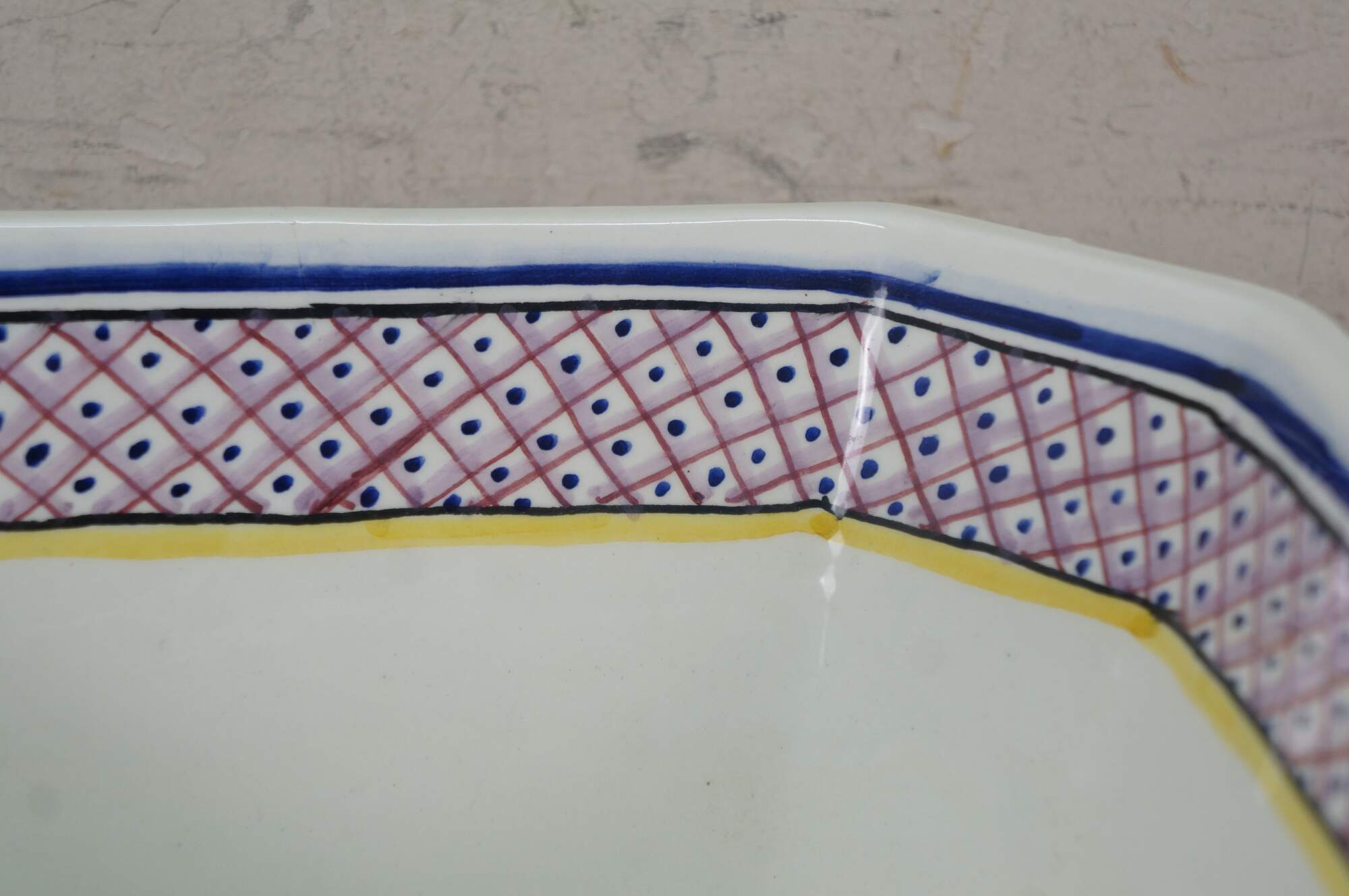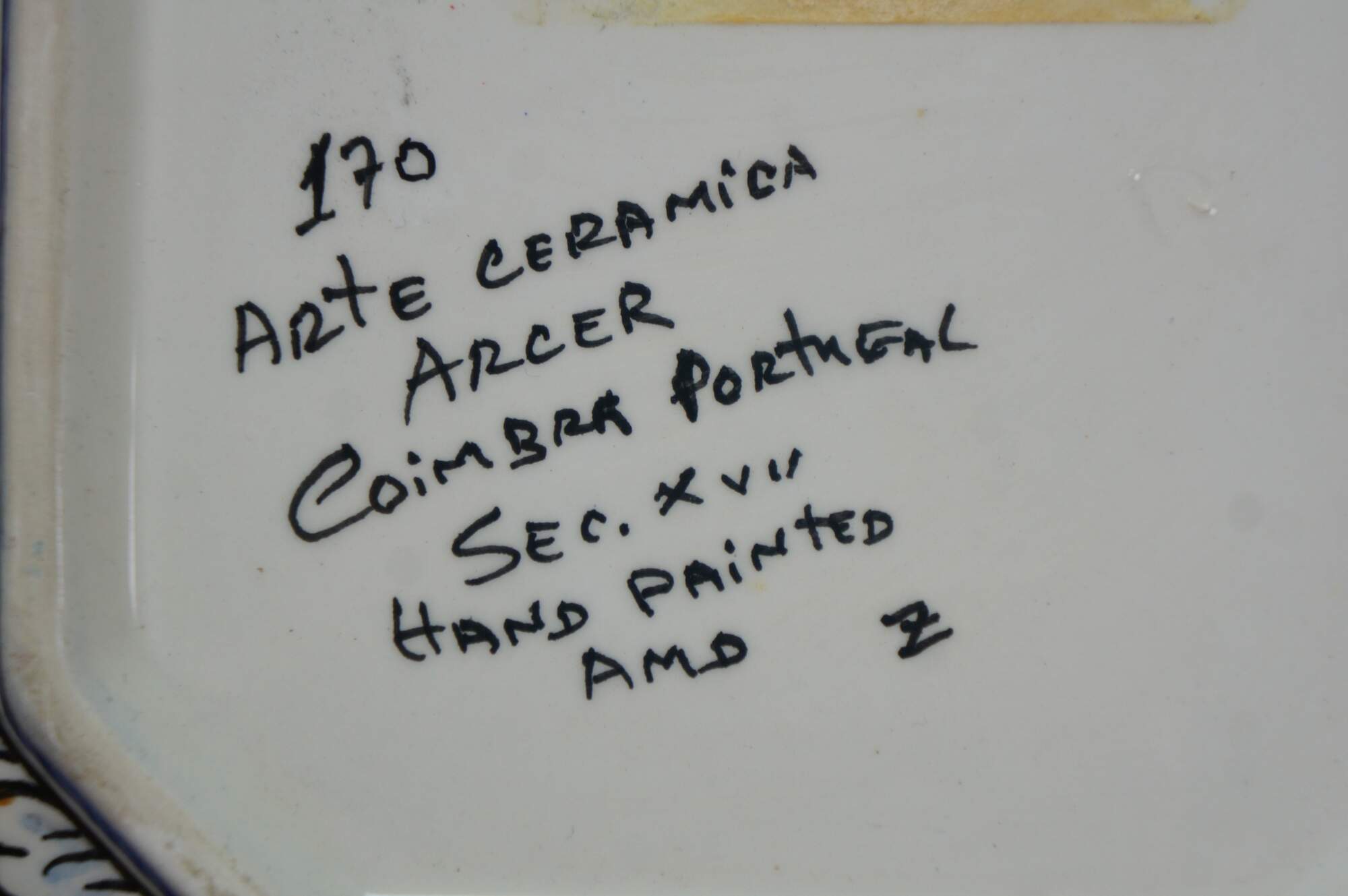 Late 20th century Portuguese ceramic faience bowl. White porcelain hand decorated with blue and pink geometric bands on the inside edge, and garland swags of flowers tied with ribbons outside. Octagonal form. 170 - Arte Ceramica - Arcer - Coimbra Portugal - Sec. XVII - Hand Painted - AMD Z.