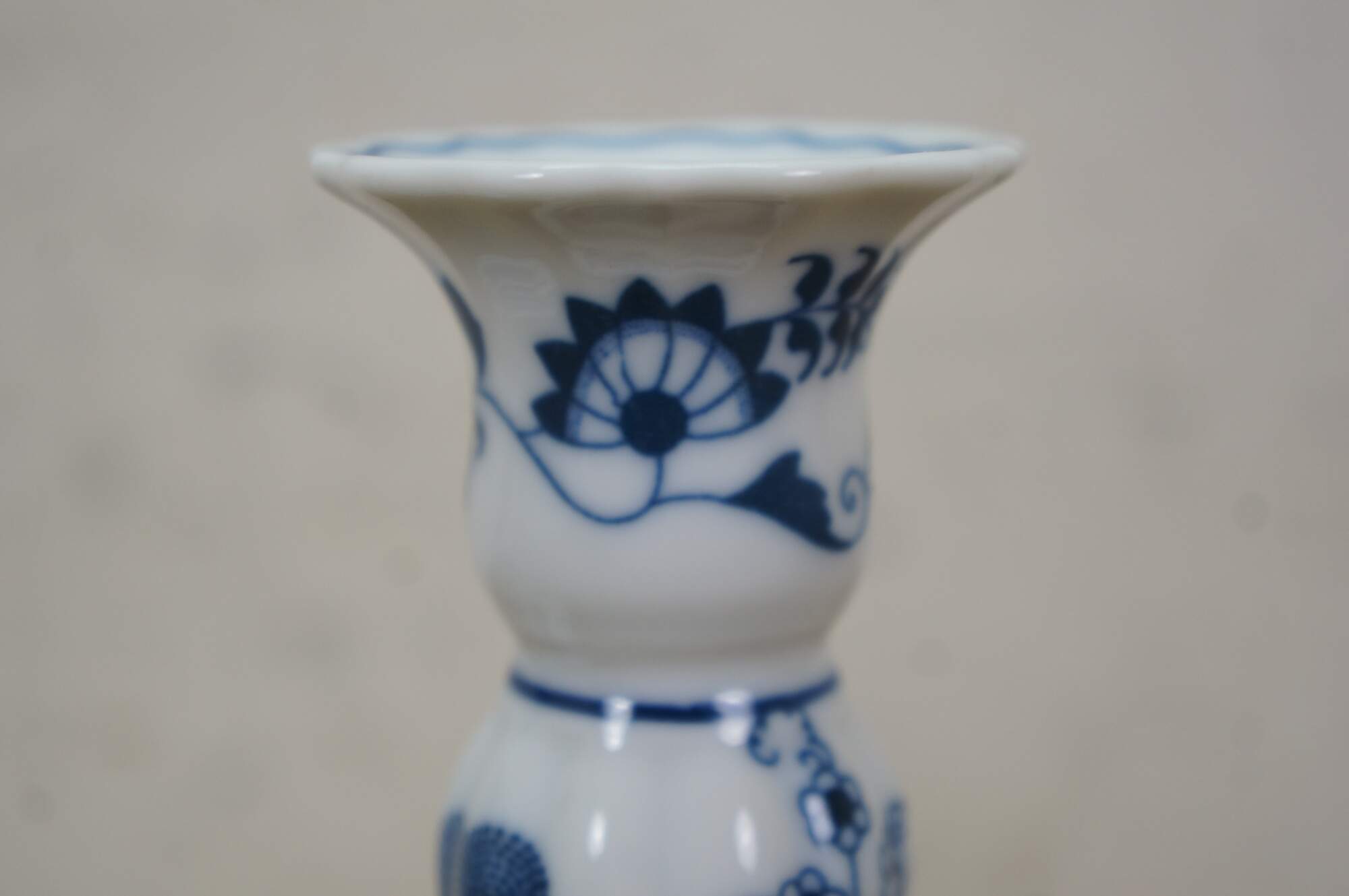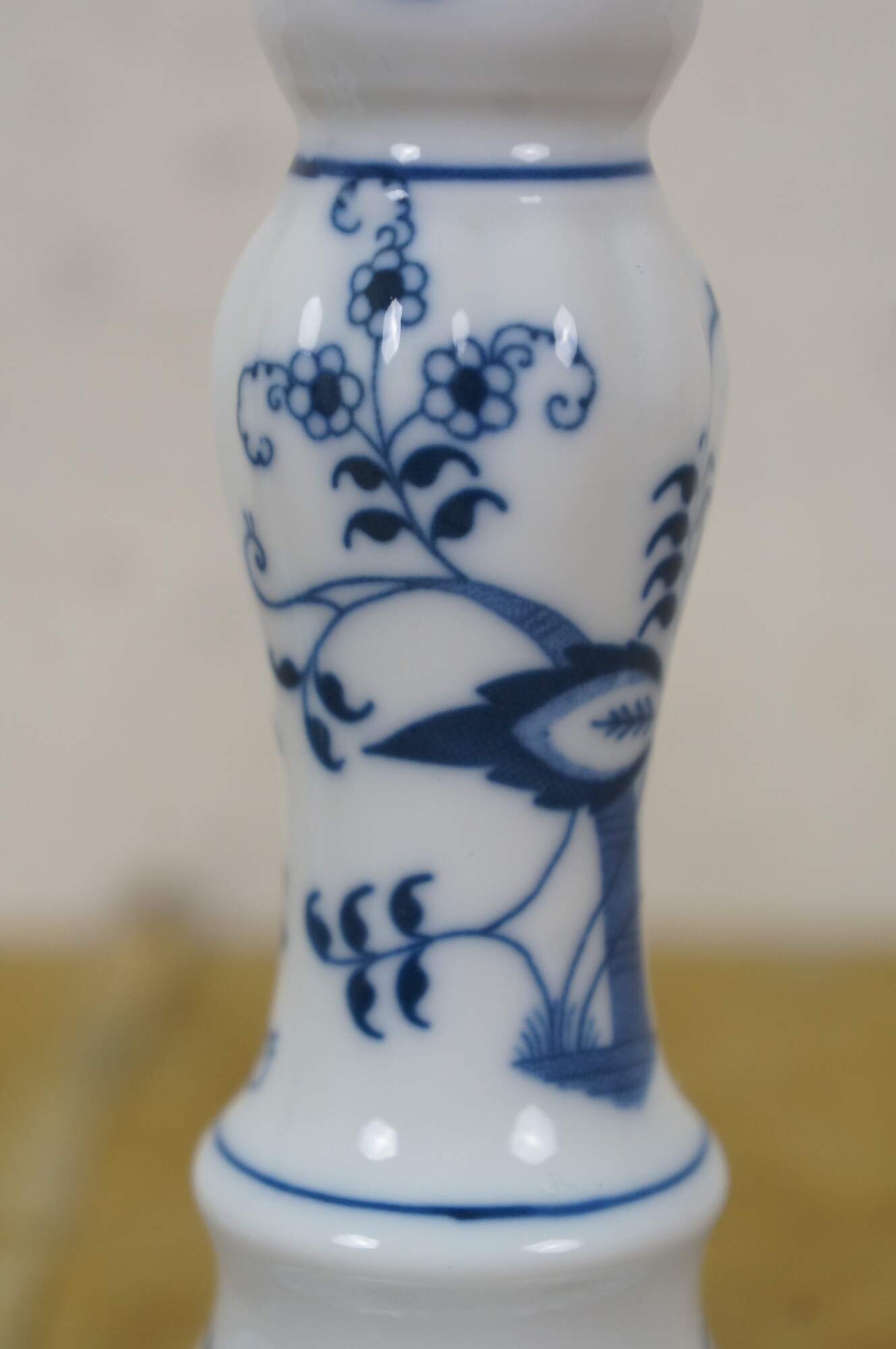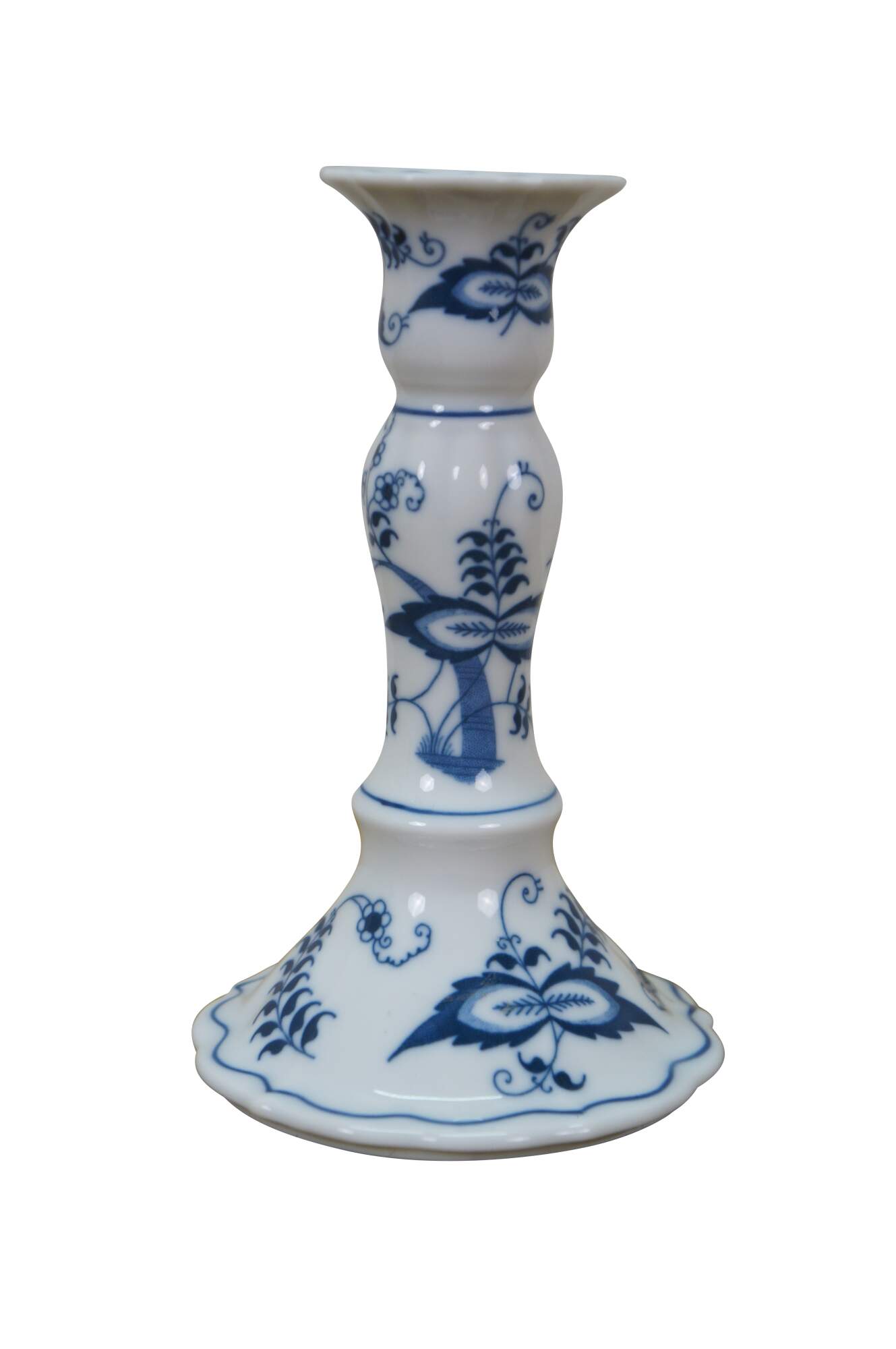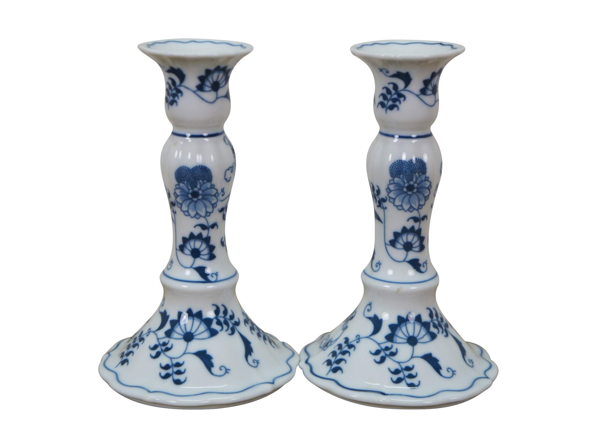 Pair of late 20th century Blue Danube porcelain taper candlestick holders. White porcelain with blue onion inspired floral and foliate design. Made in Japan.