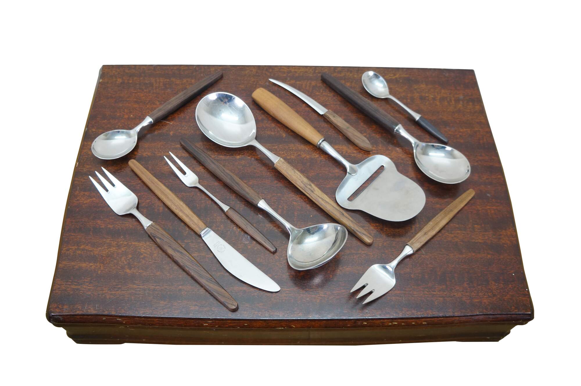 Mid to late 20th century Dansk Designs wood handled flatware / serving utensils designed by Tias Eckhoff and including some mismatched pieces. Majority are made in Lundtofte, Denmark. Includes: Cheese Server, Serving Spoon, Sauce Ladle, Cheese Knife, Cocktail Fork, 8 Knives, 8 Table Spoons, 8 Dinner Forks, 8 Tea Spoons, 4 Demitasse Spoons, and Rogers Bros tarnish resistant wood storage chest. Cheese server and cheese knife by other manufacturers.