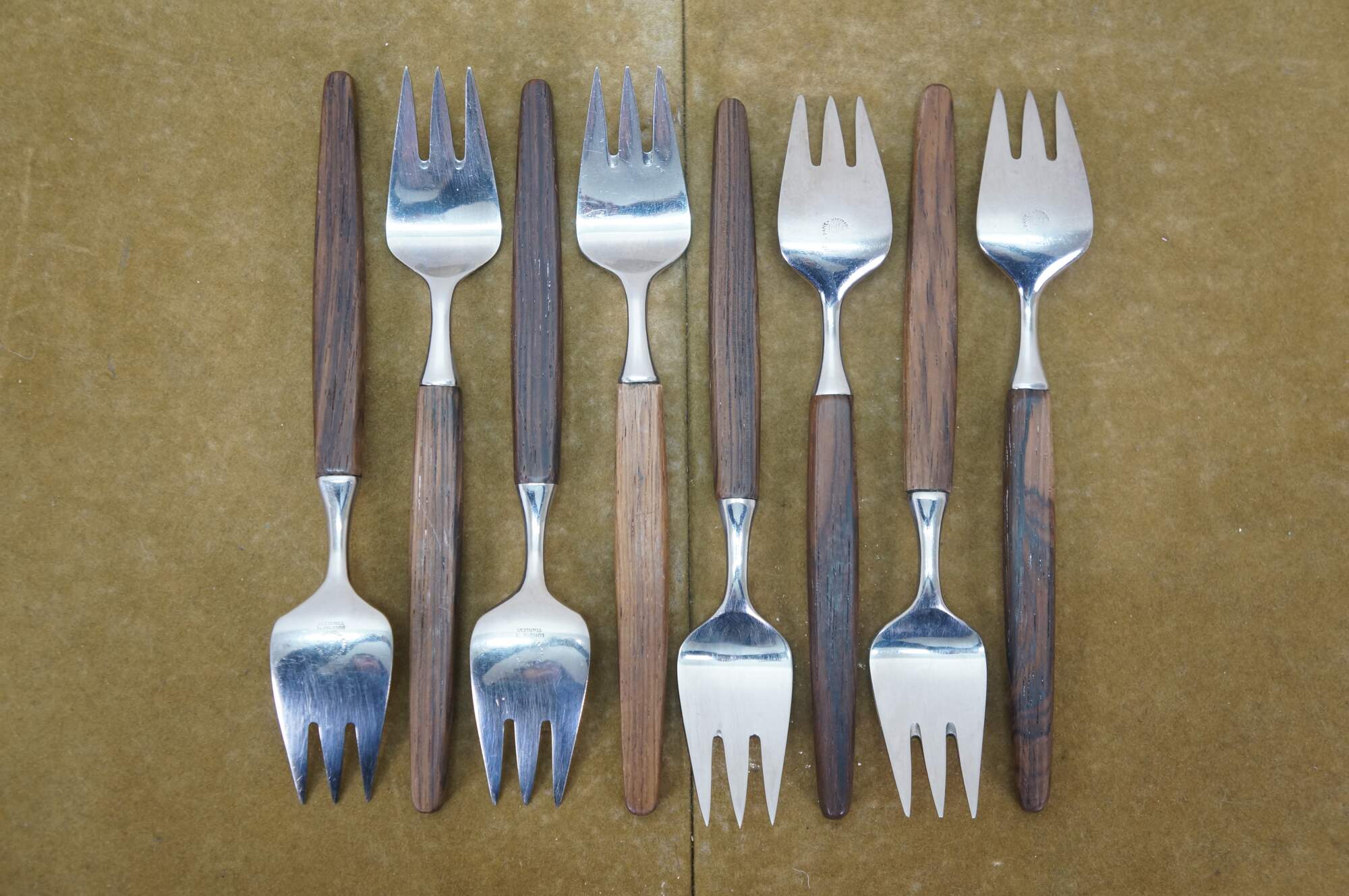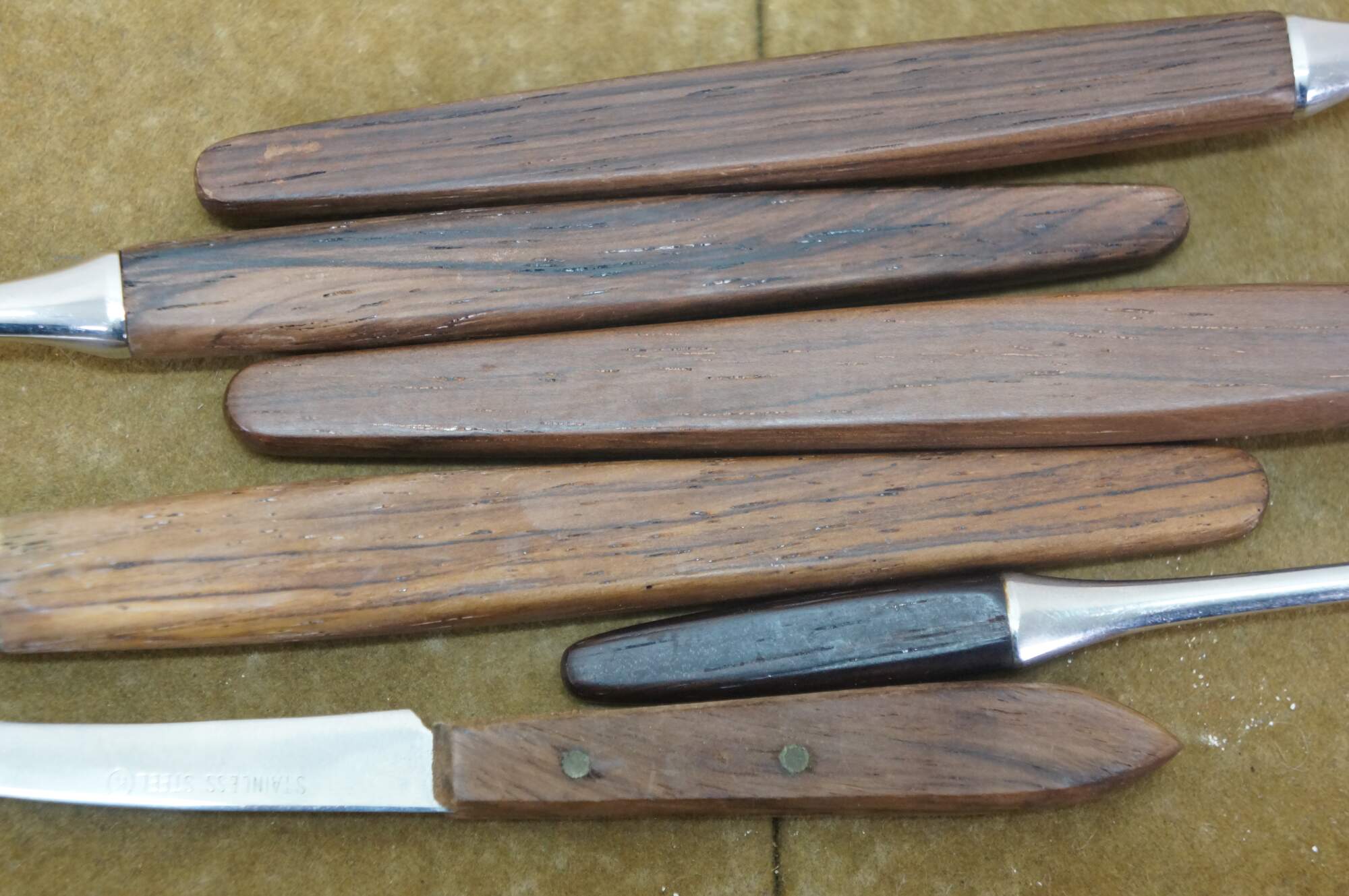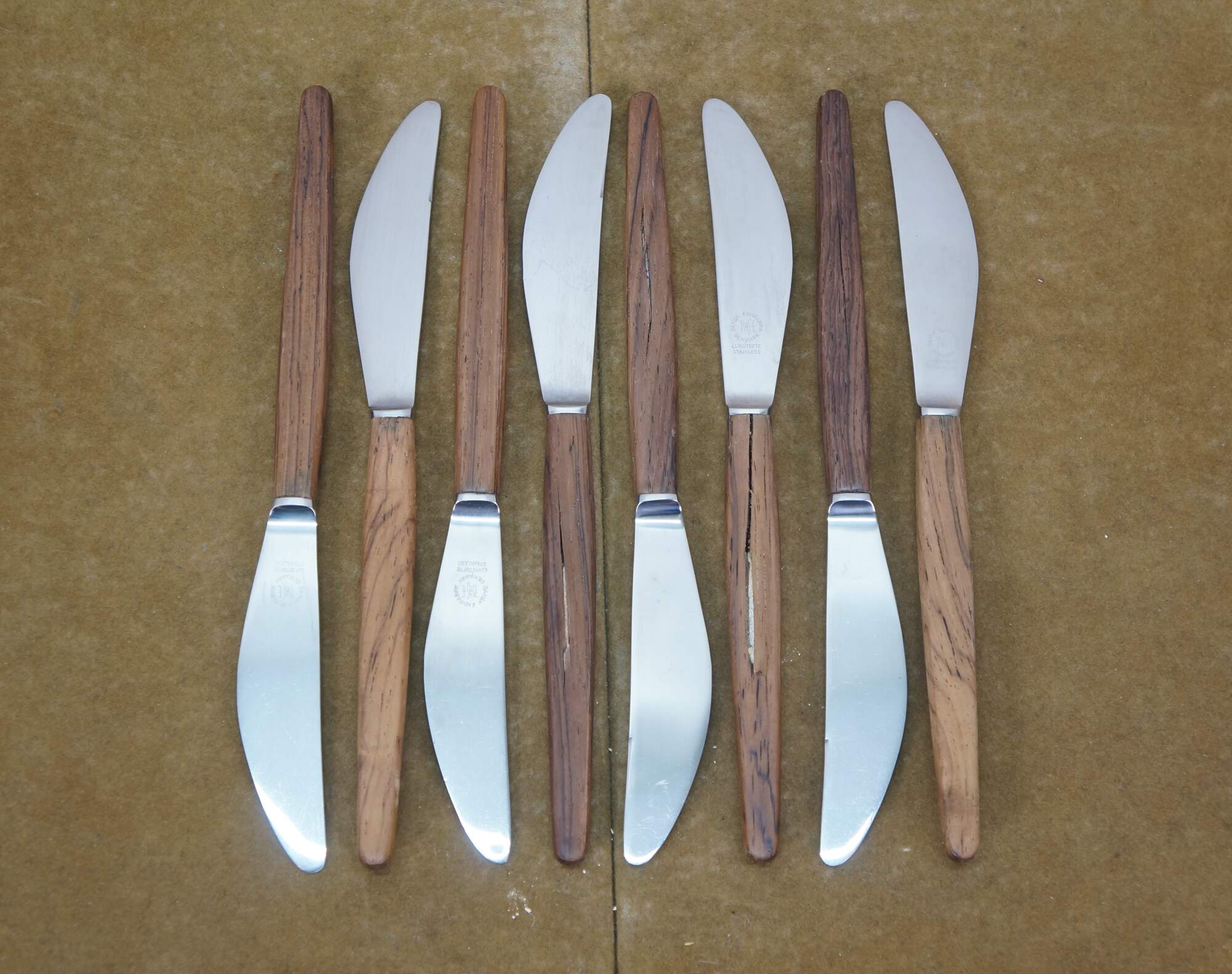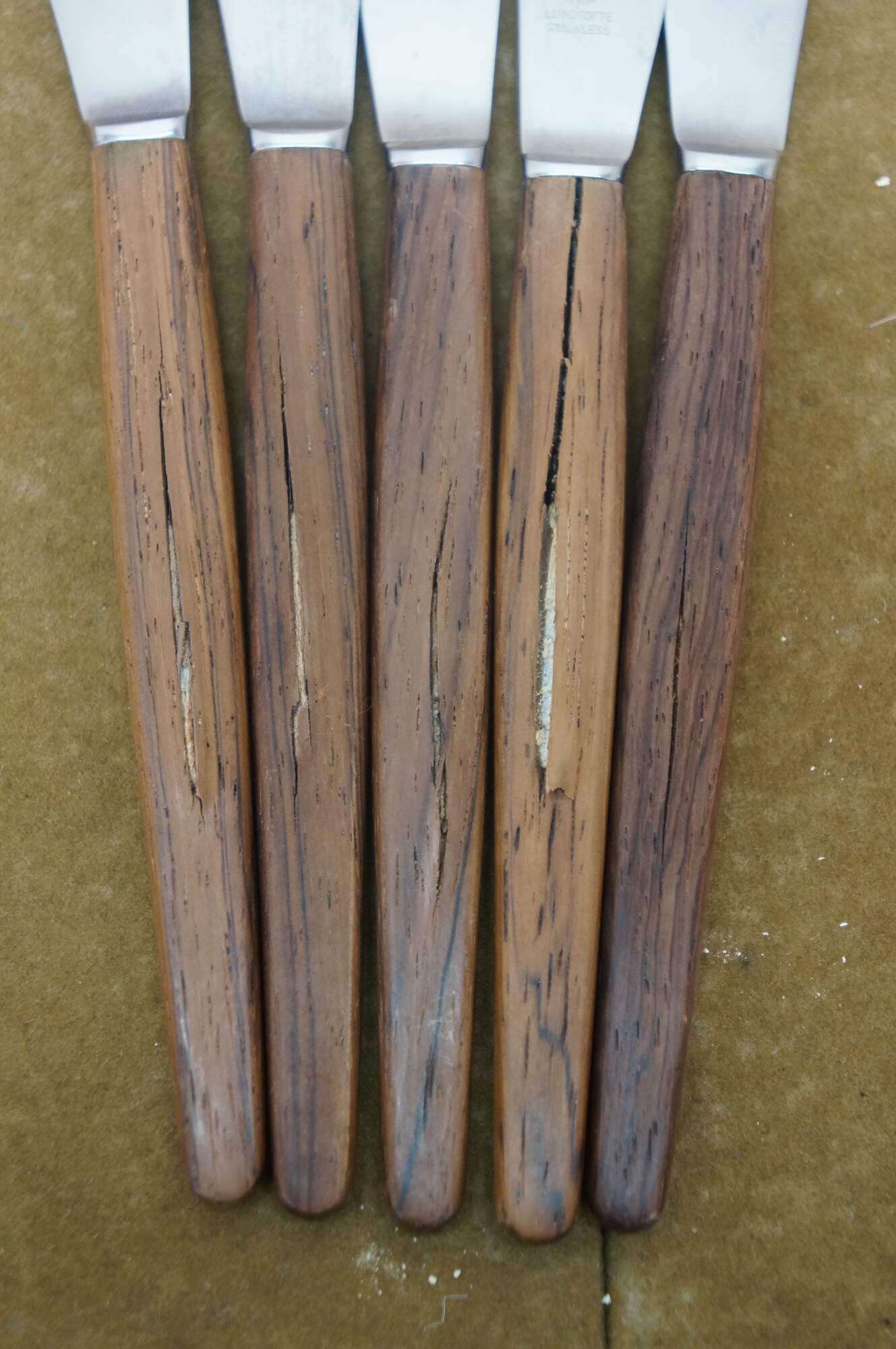 Good Overall - Some mismatched brands/wood tones; splitting to knife handles, fading.