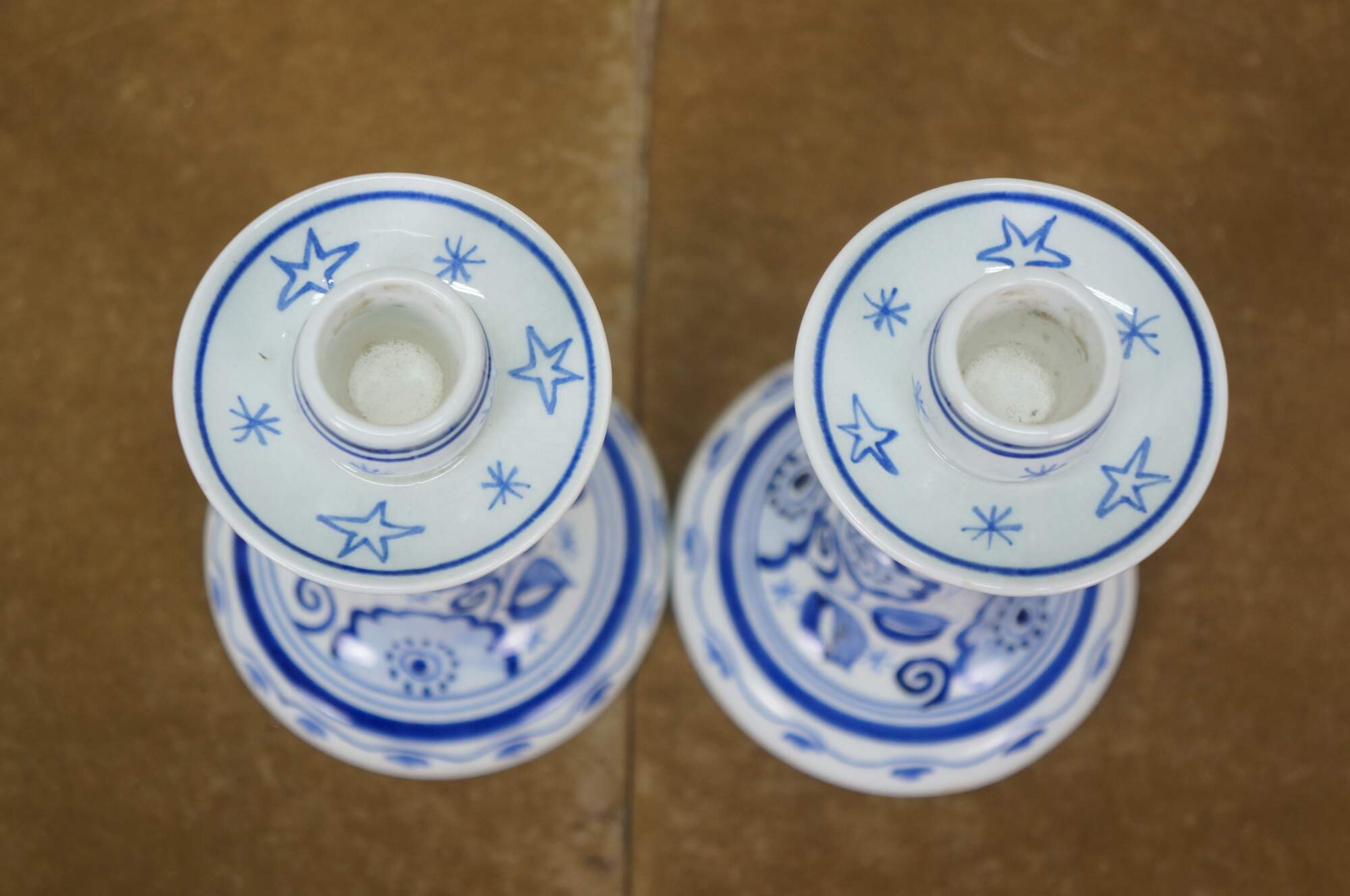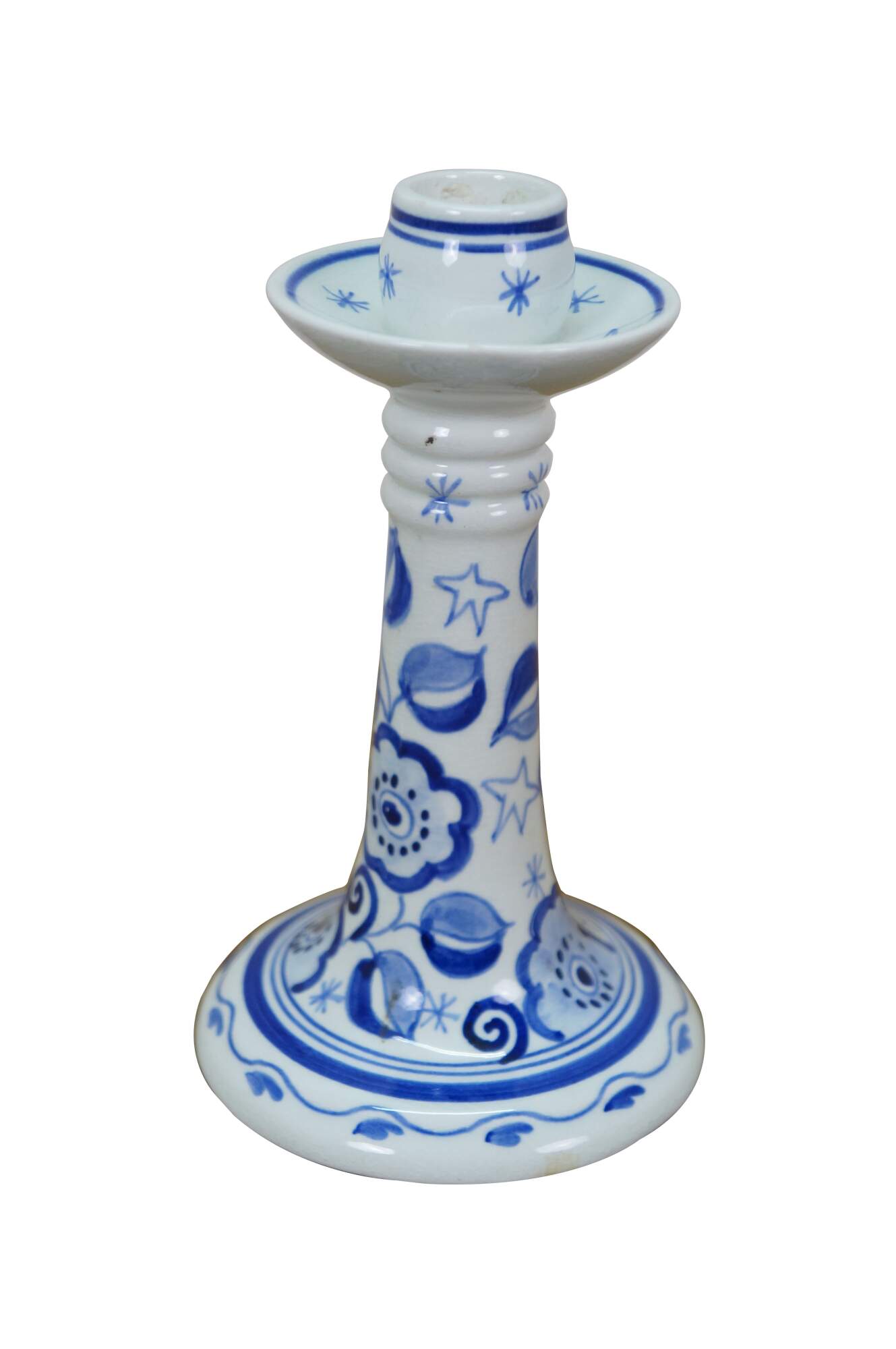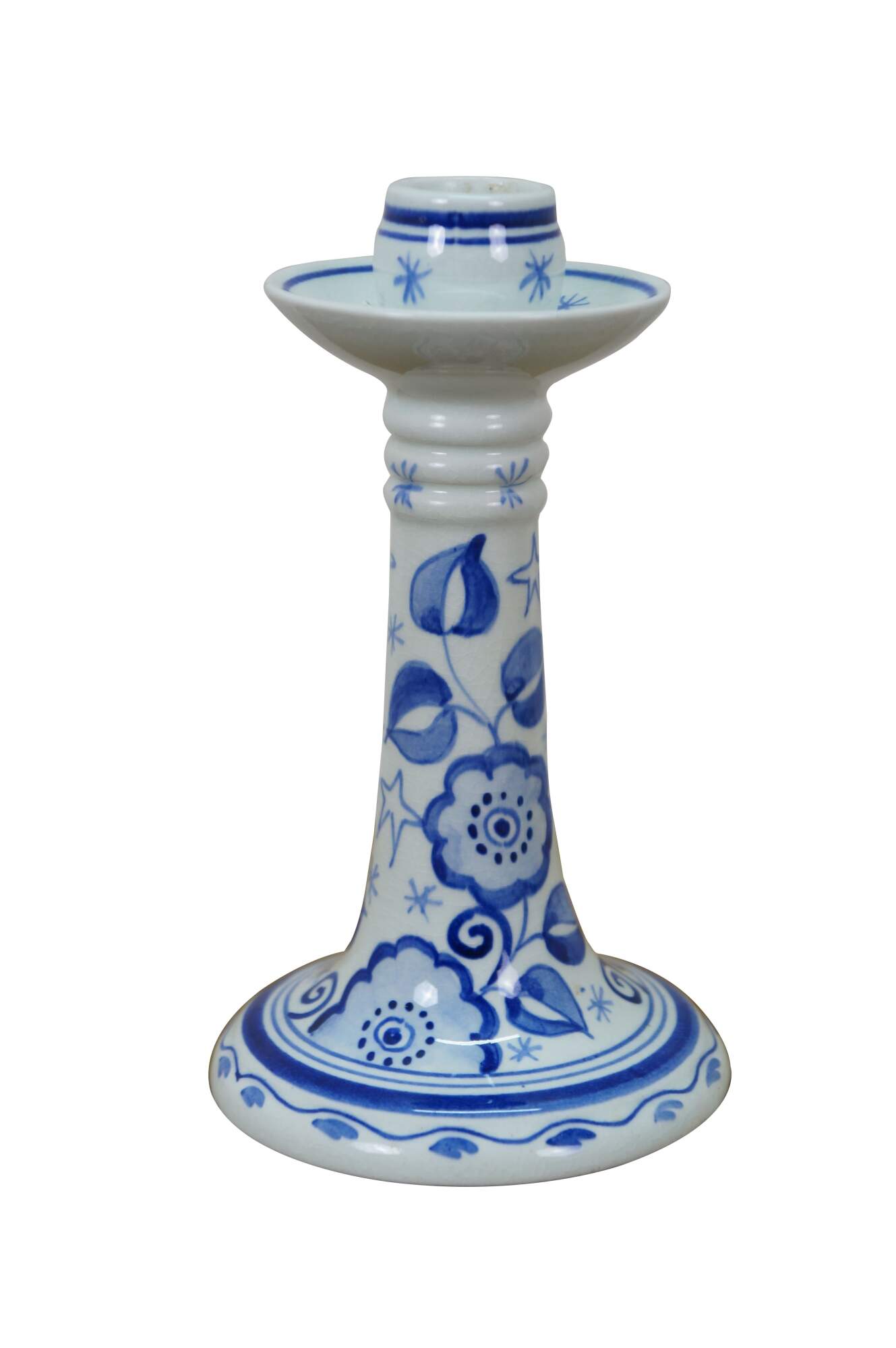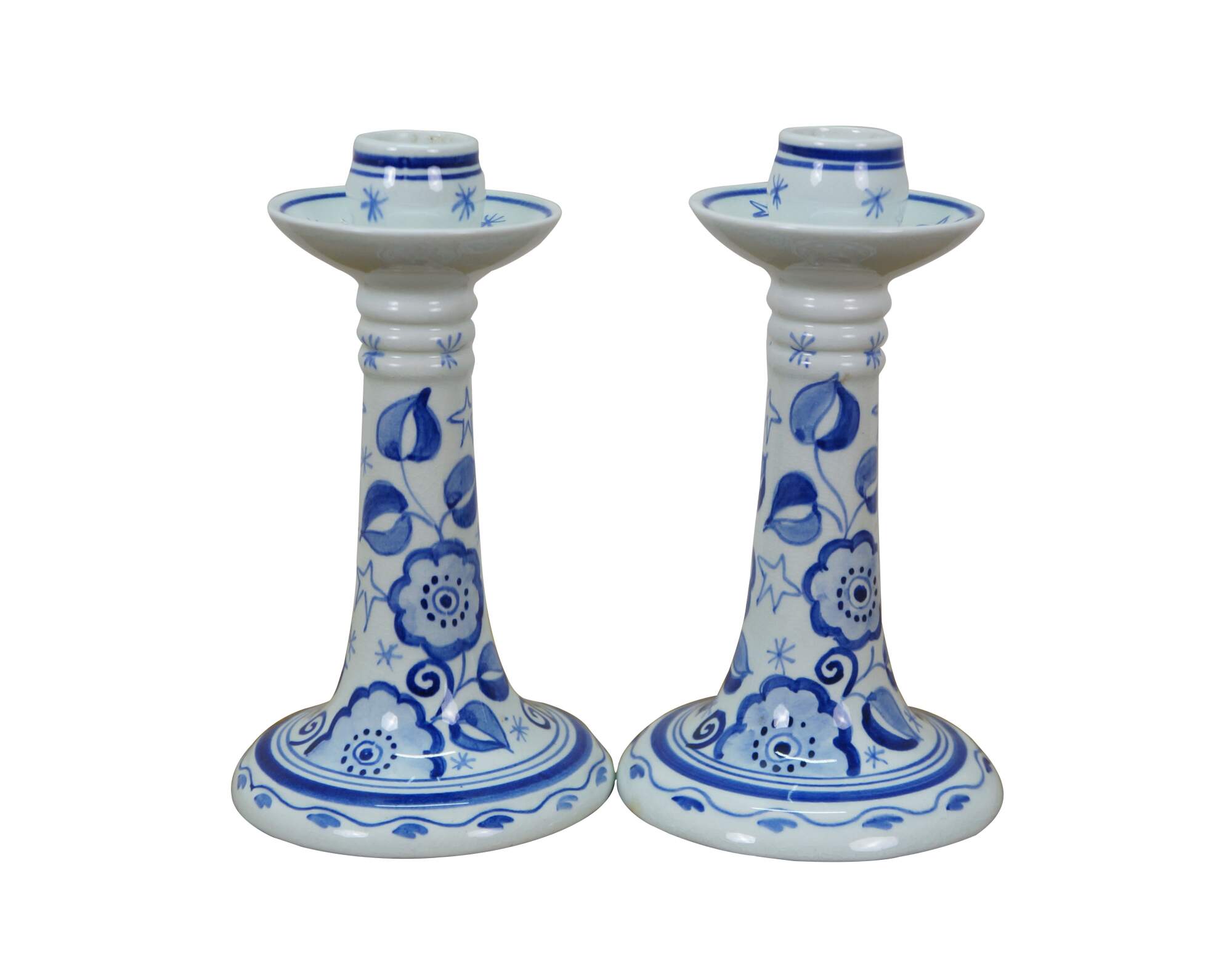Pair of vintage 20th century Danish Delft blue and white porcelain taper candlestick holders hand painted with a design of flowers and stars. Made in Holland. 642 Irene.