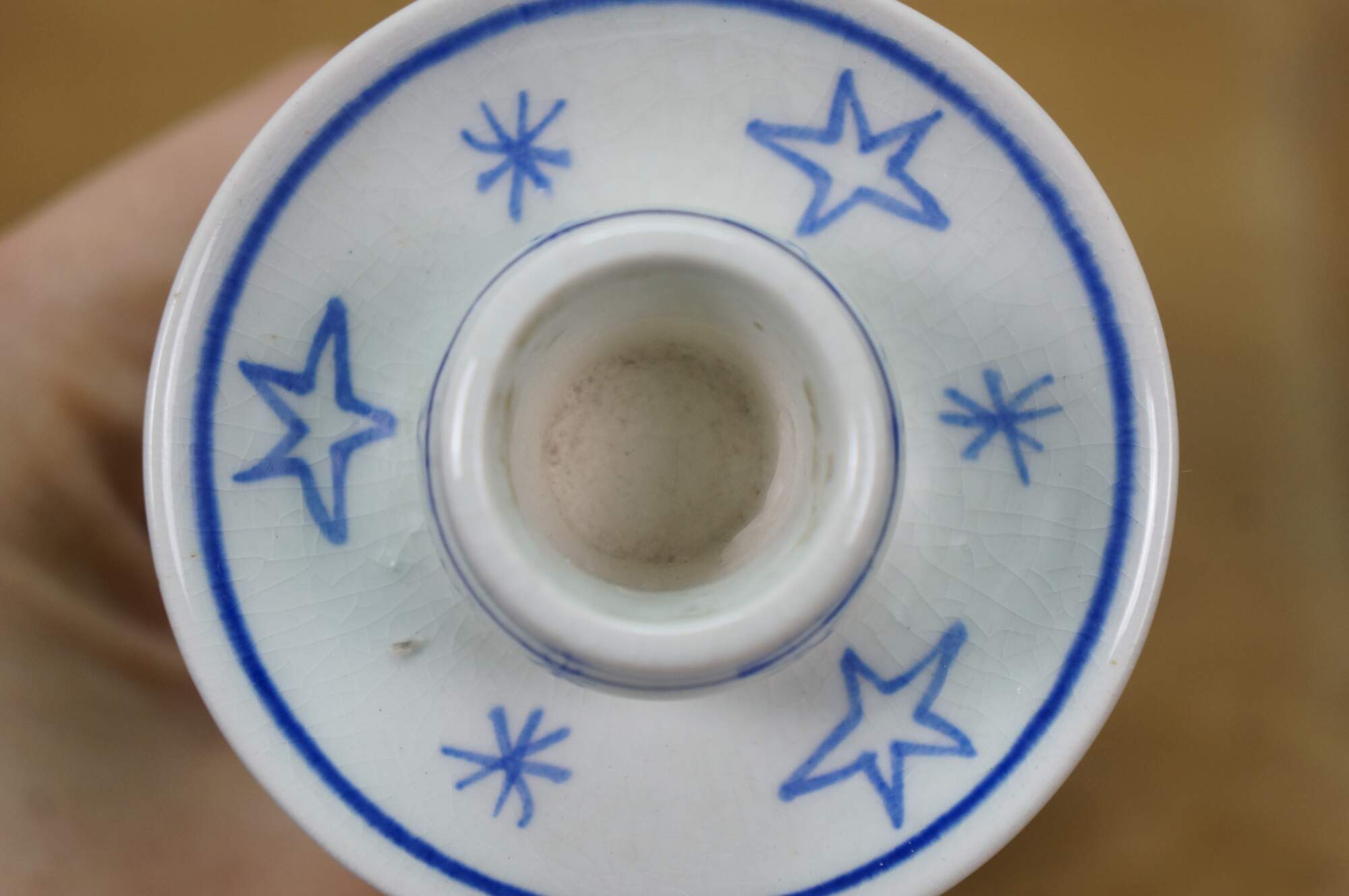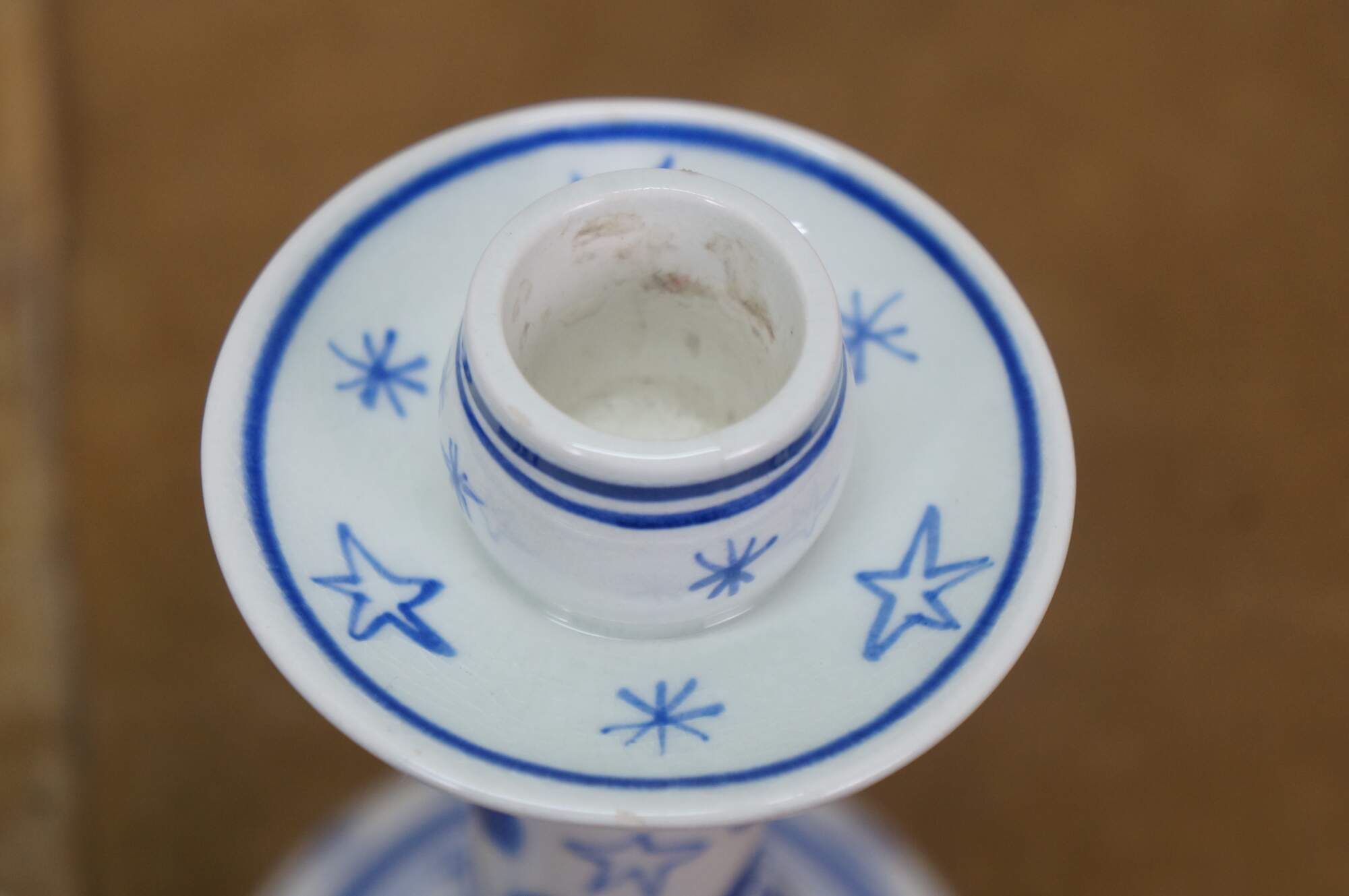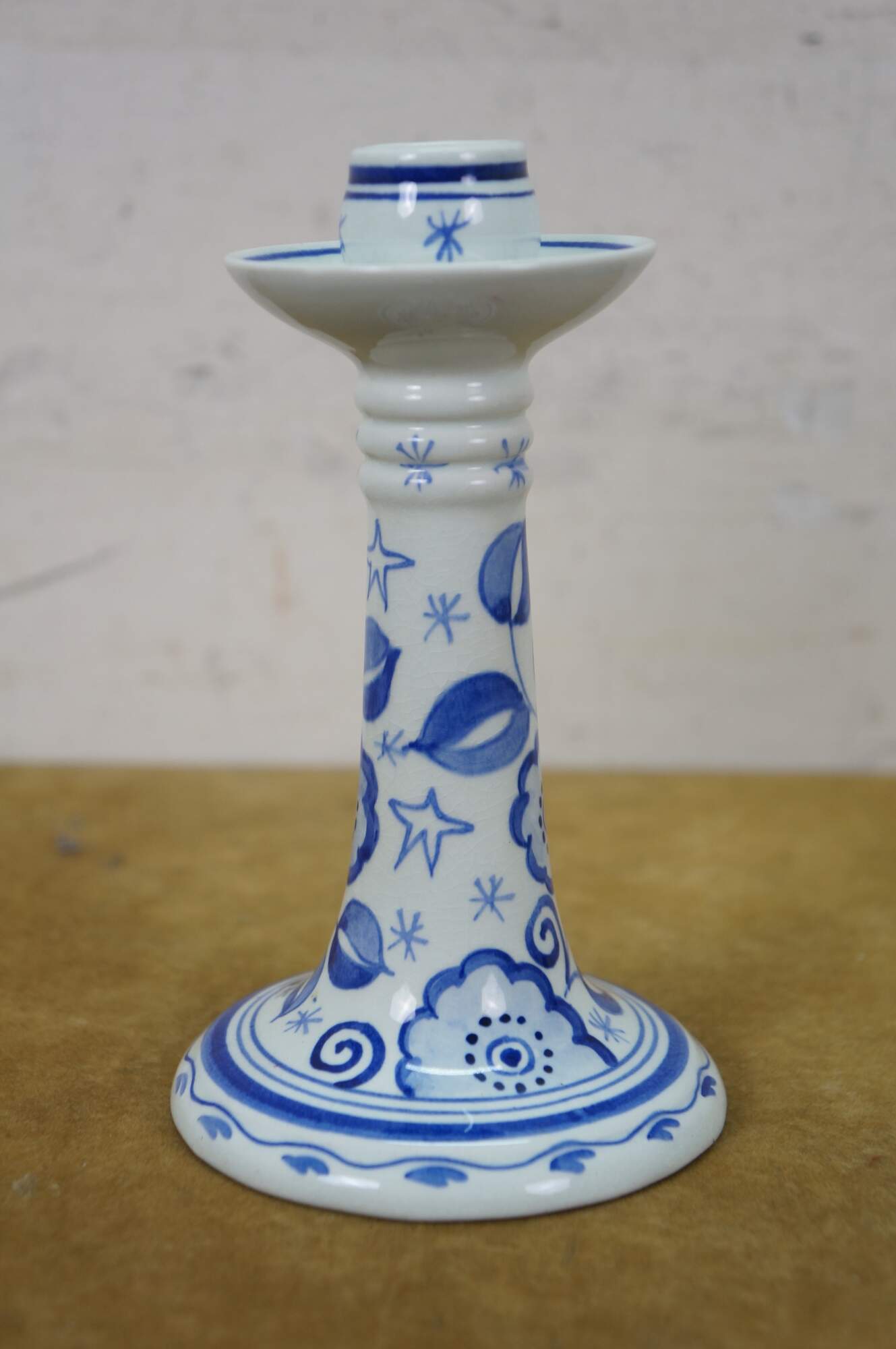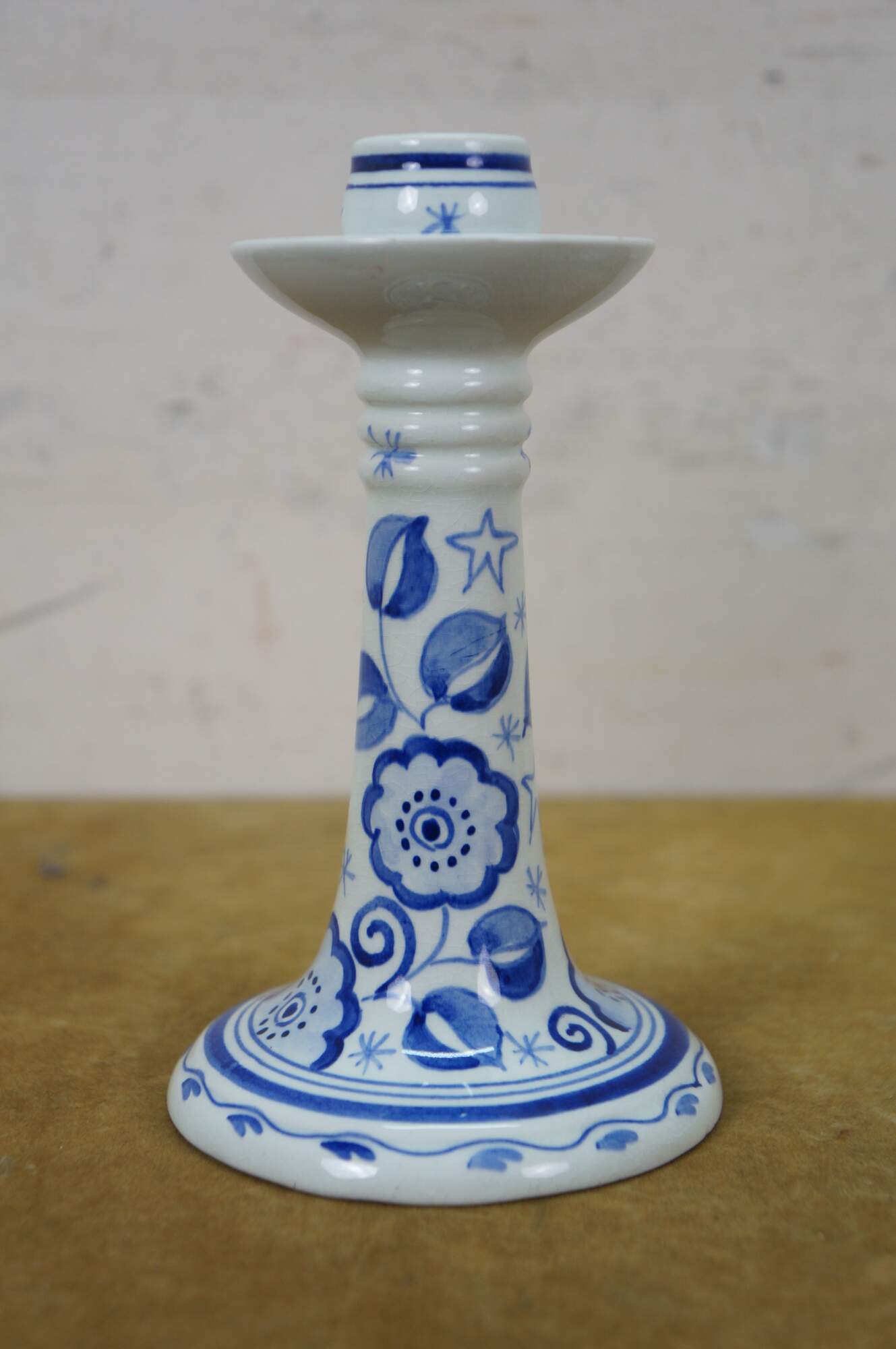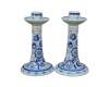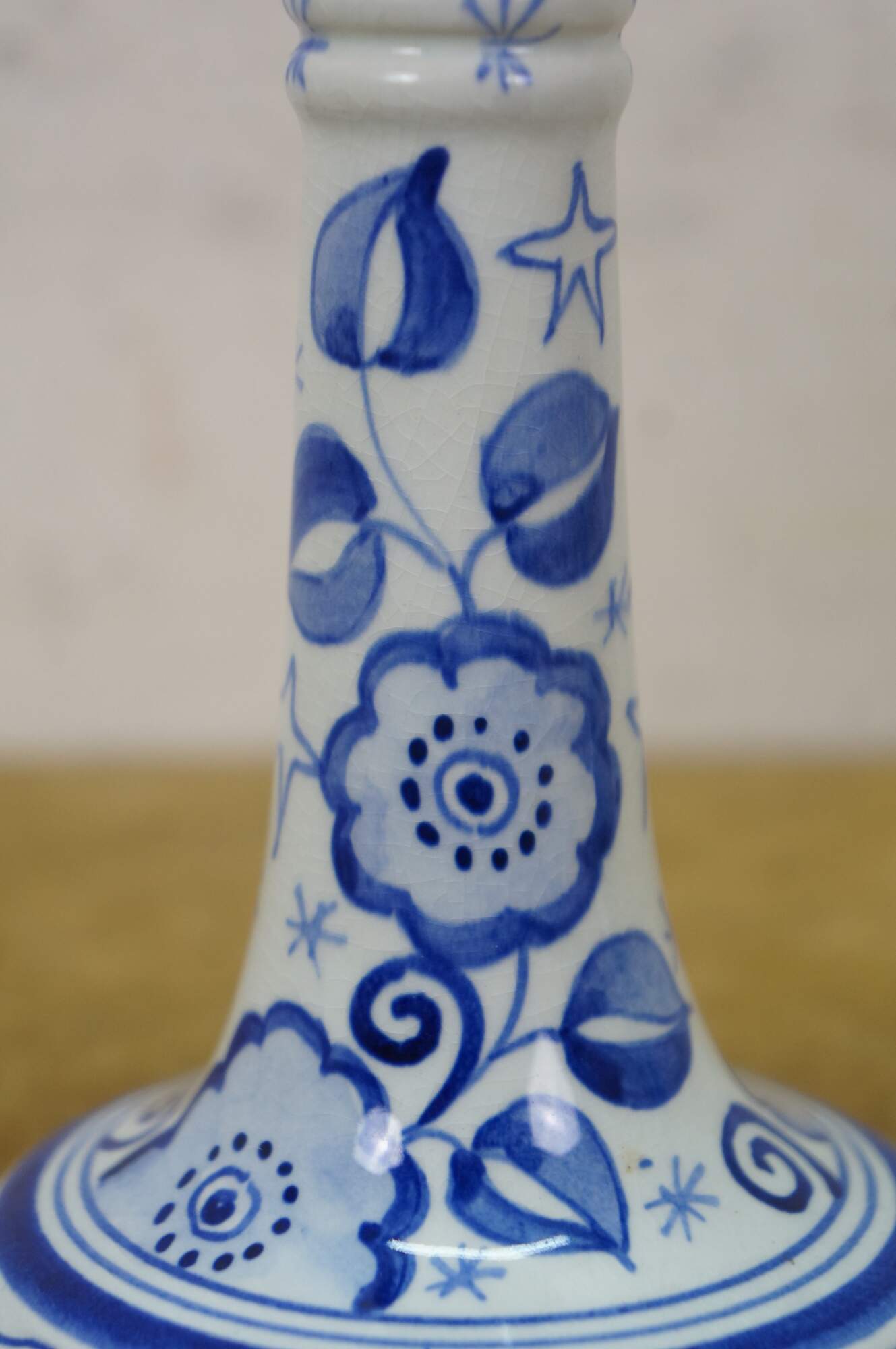 Pair of vintage 20th century Danish Delft blue and white porcelain taper candlestick holders hand painted with a design of flowers and stars. Made in Holland. 642 Irene.