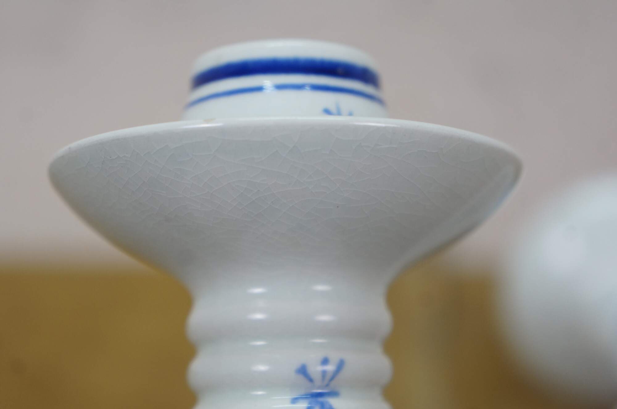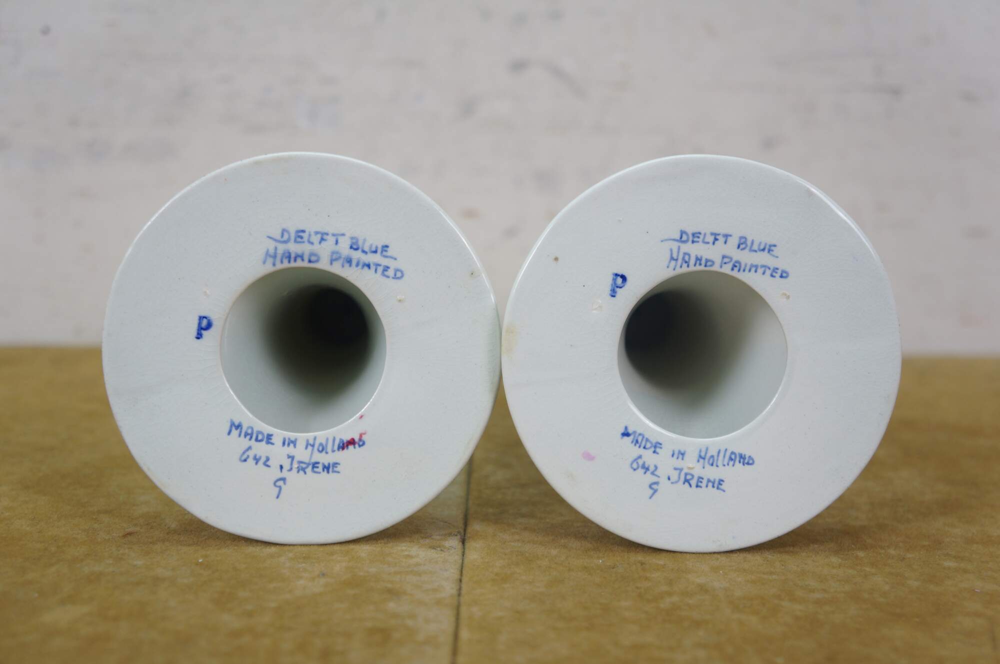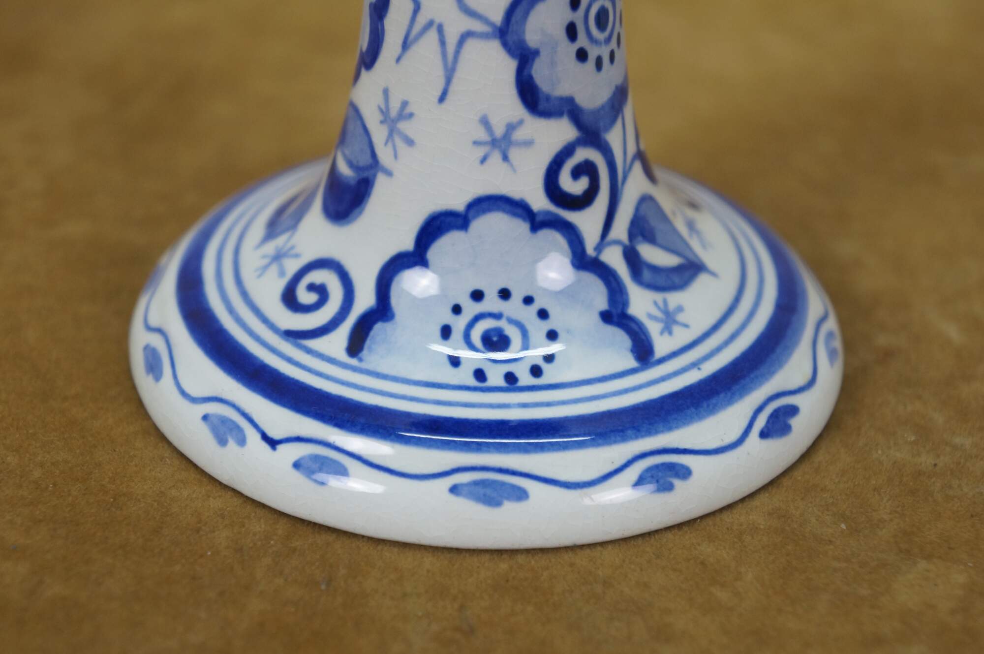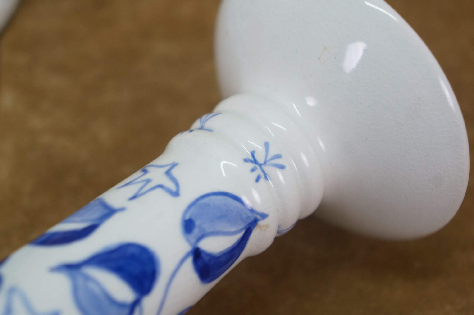 Pair of vintage 20th century Danish Delft blue and white porcelain taper candlestick holders hand painted with a design of flowers and stars. Made in Holland. 642 Irene.