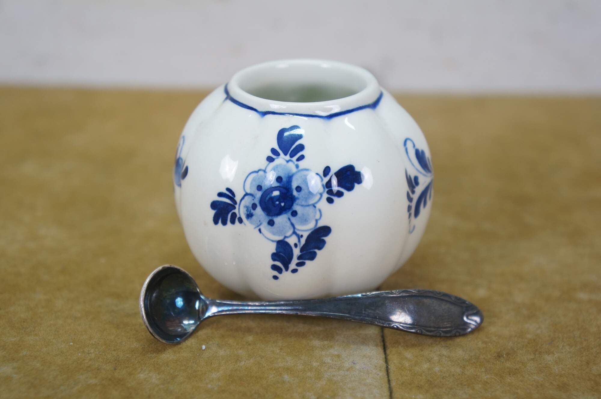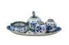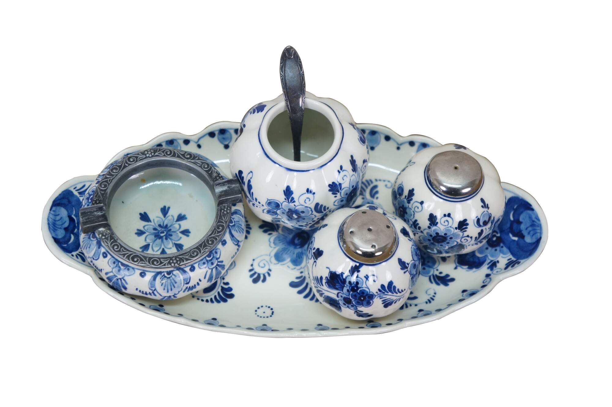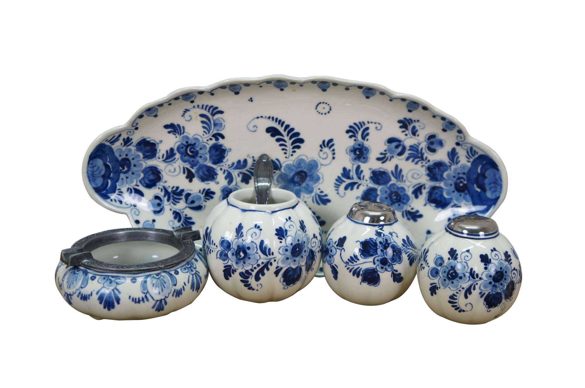 Vintage 20th century set of six pieces of Delfts Blauw hand painted blue and white floral porcelain tableware. Made in Holland. Includes: Tray / underplate, ashtray with two cigarette rests, salt and pepper shakers, and a jam pot with silverplate spoon.