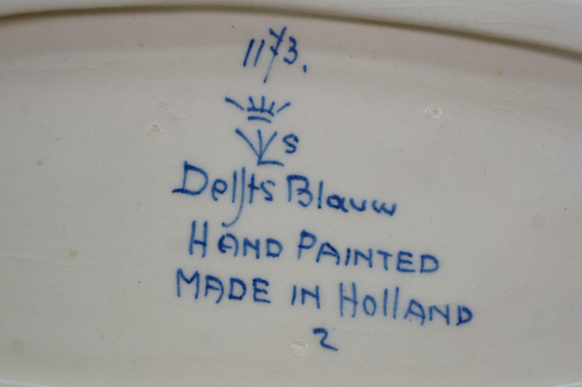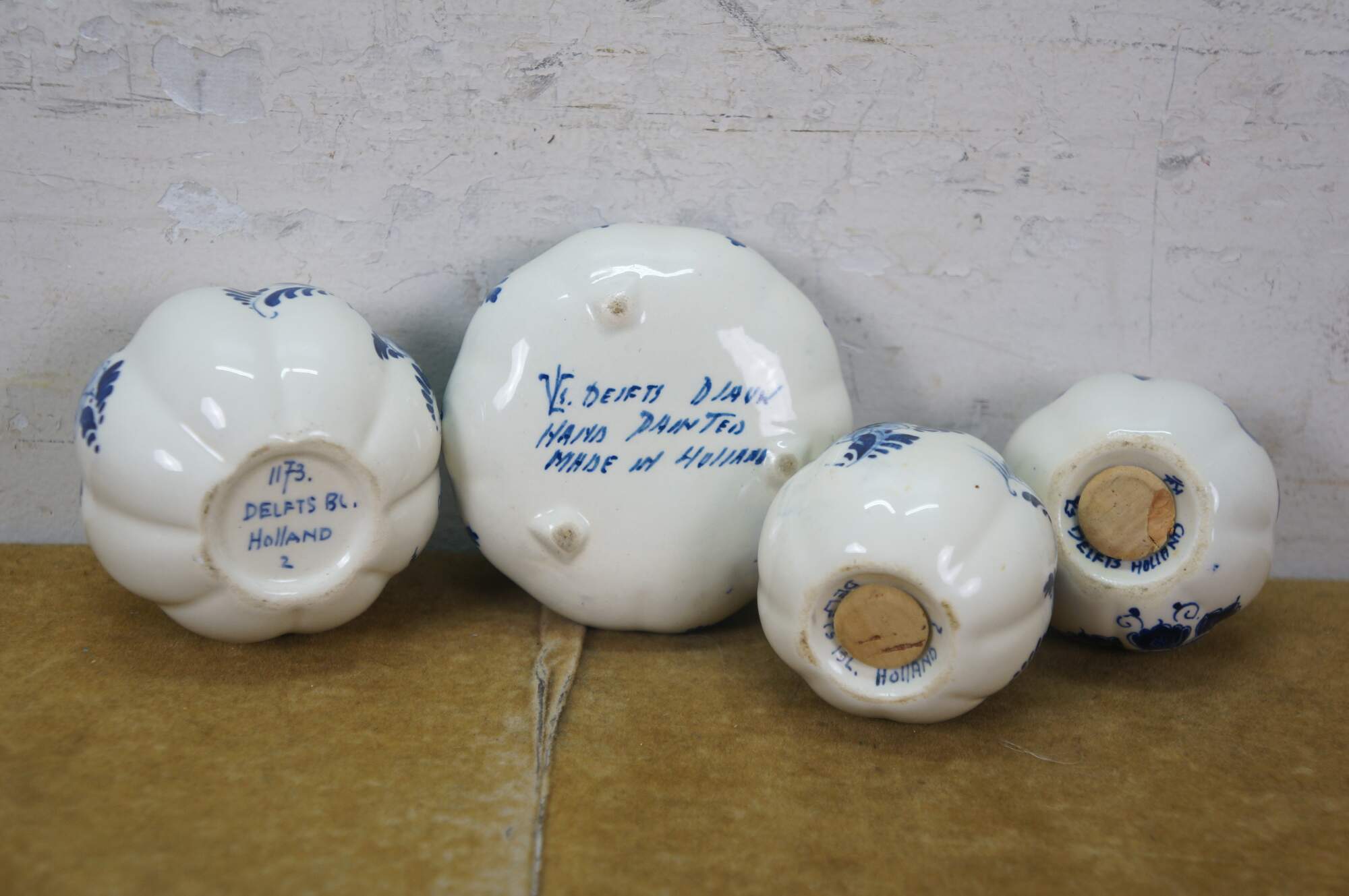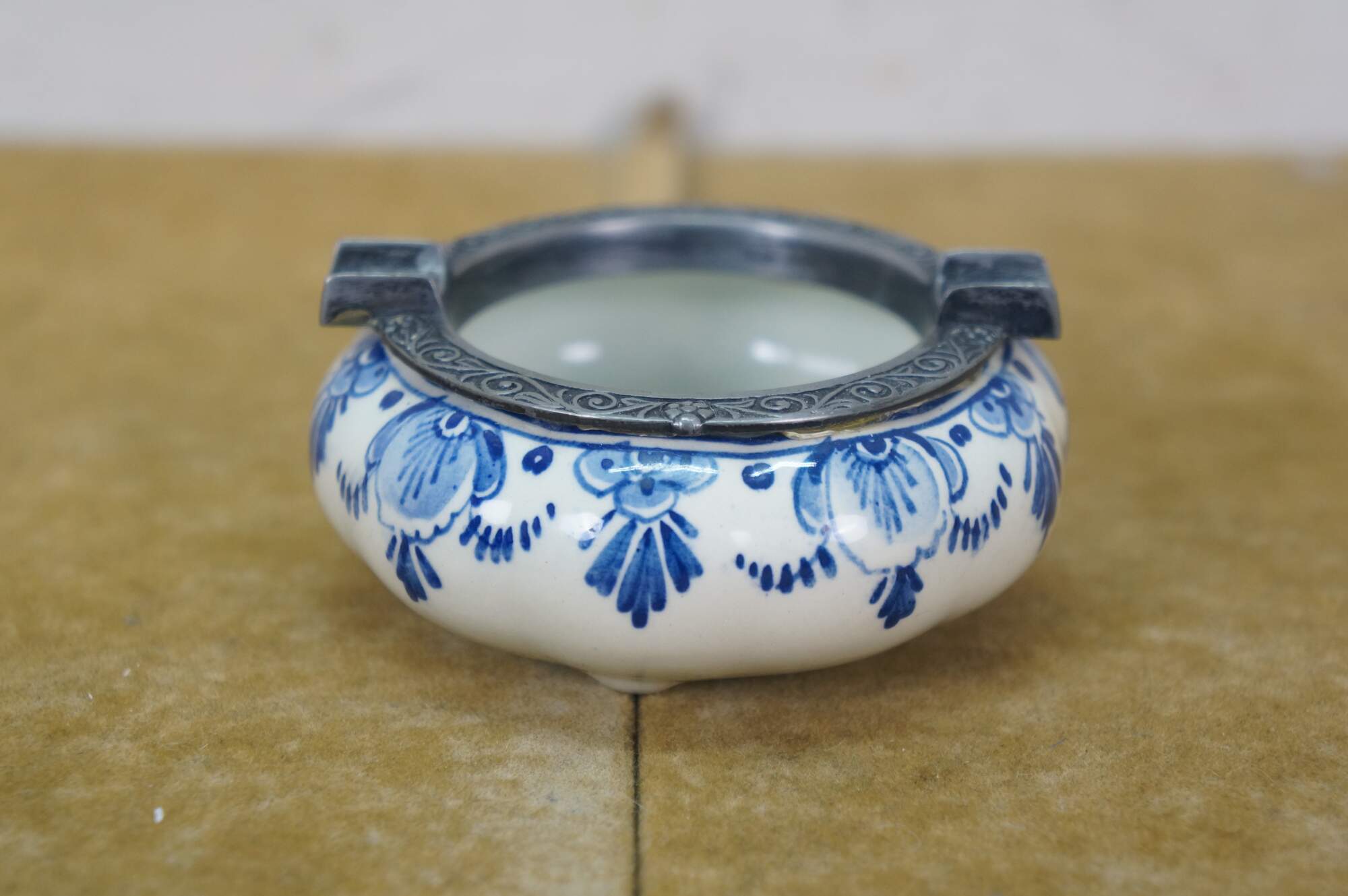 Vintage 20th century set of six pieces of Delfts Blauw hand painted blue and white floral porcelain tableware. Made in Holland. Includes: Tray / underplate, ashtray with two cigarette rests, salt and pepper shakers, and a jam pot with silverplate spoon.