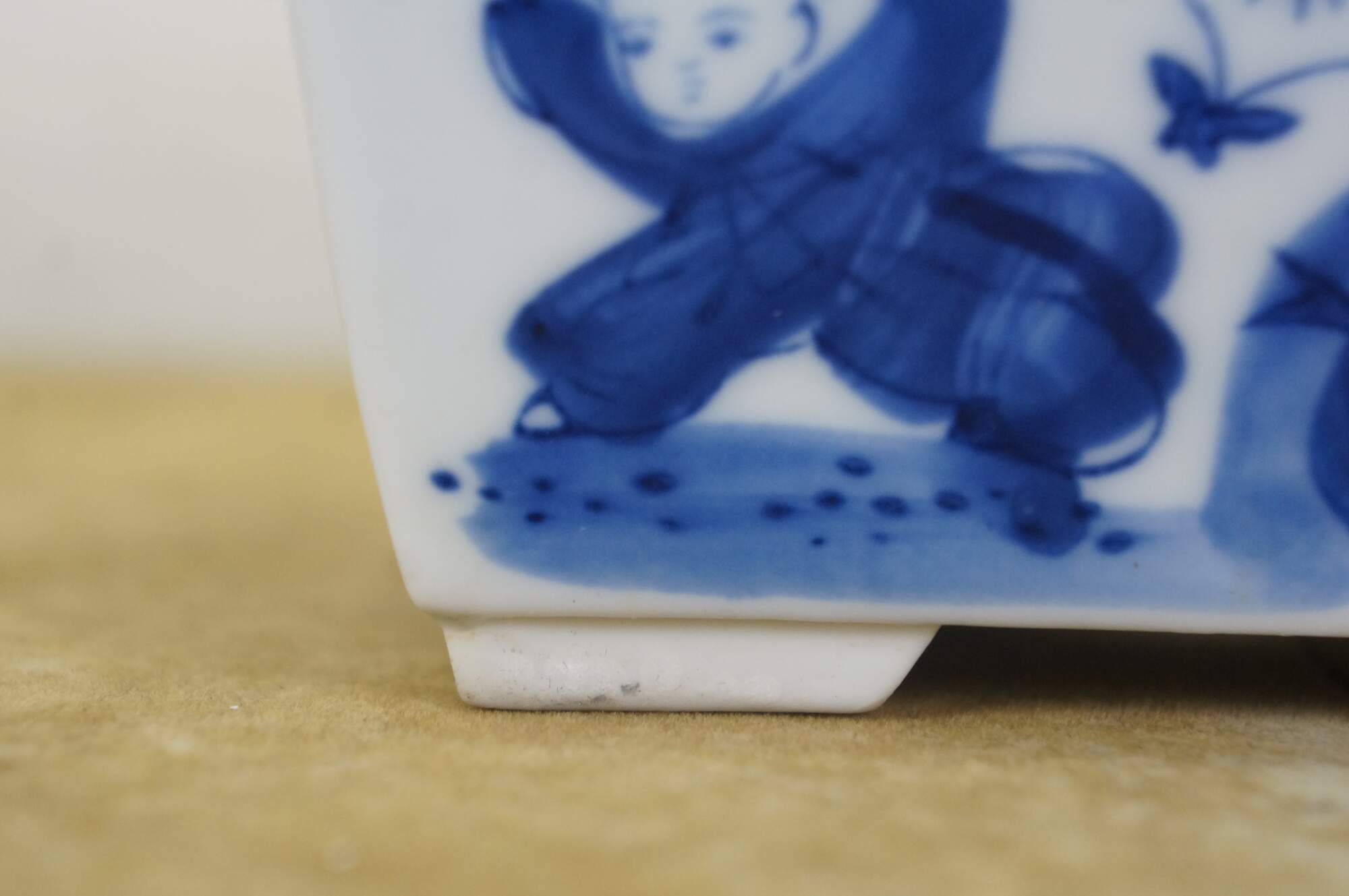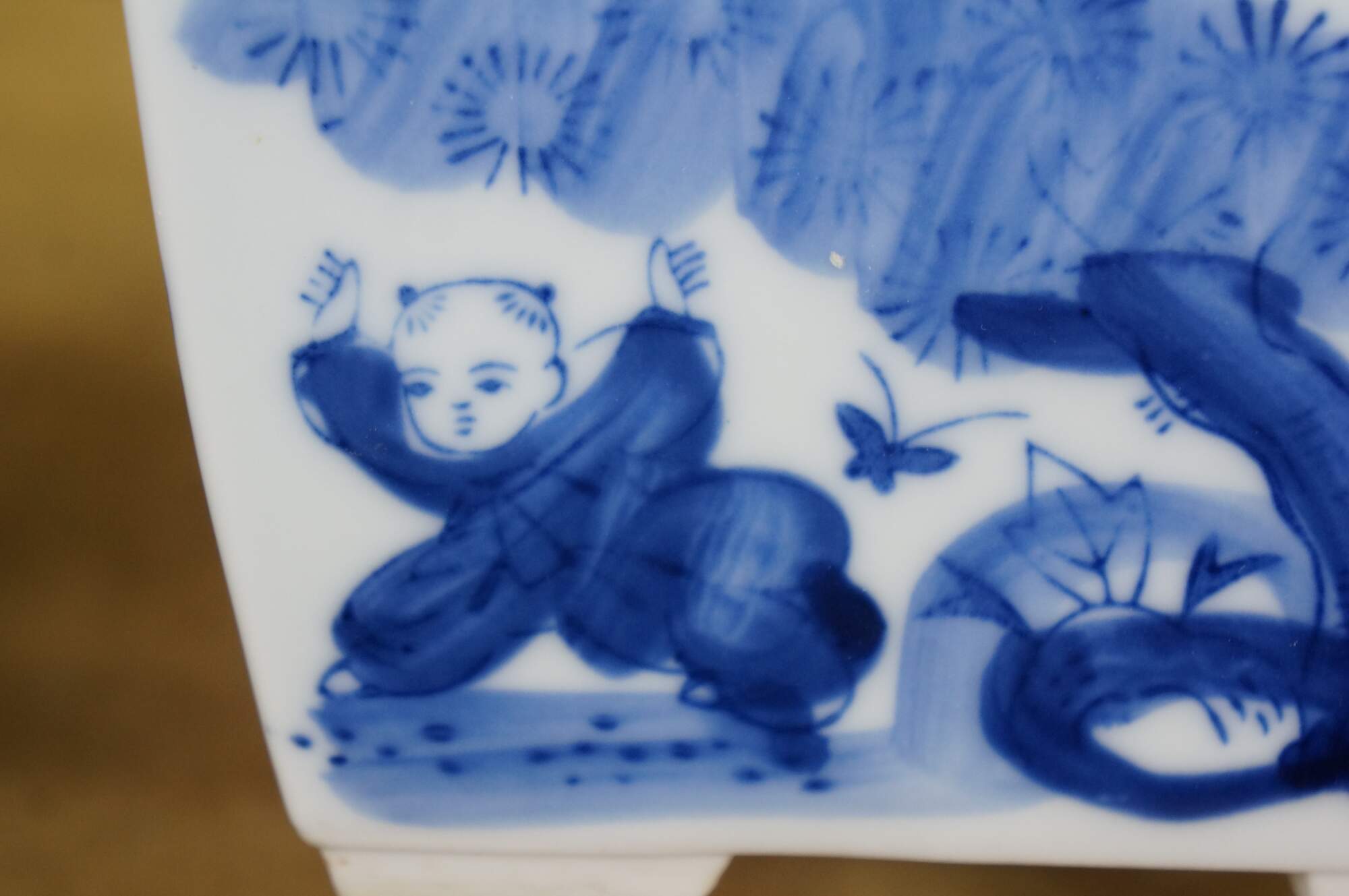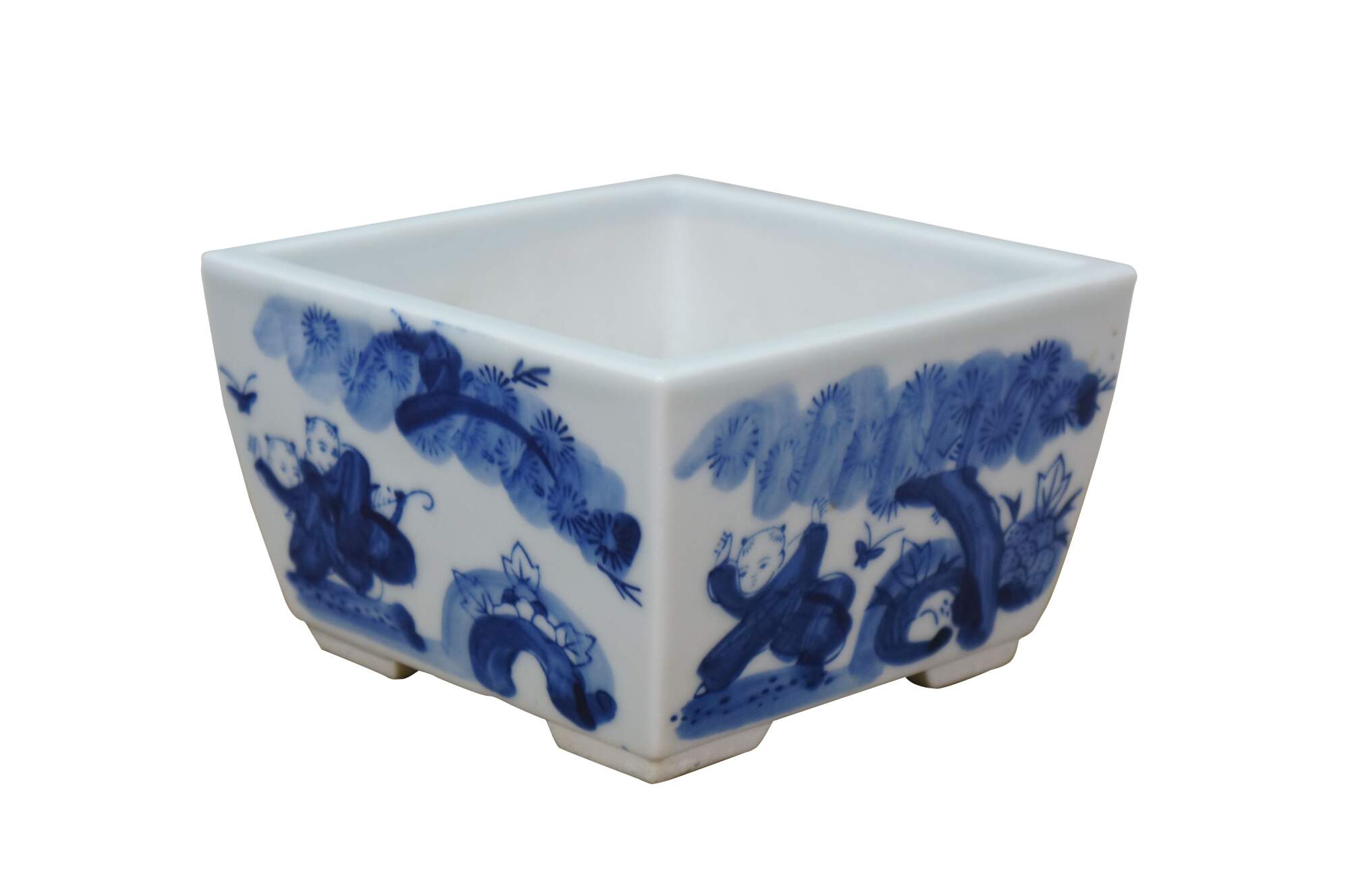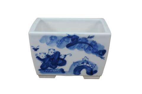 Circa early to mid 20th century Showa period Japanese imari porcelain bonsai bowl / planter. Square form with feet at corners and drain hole, hand painted in blue with scenes of children playing in a garden.