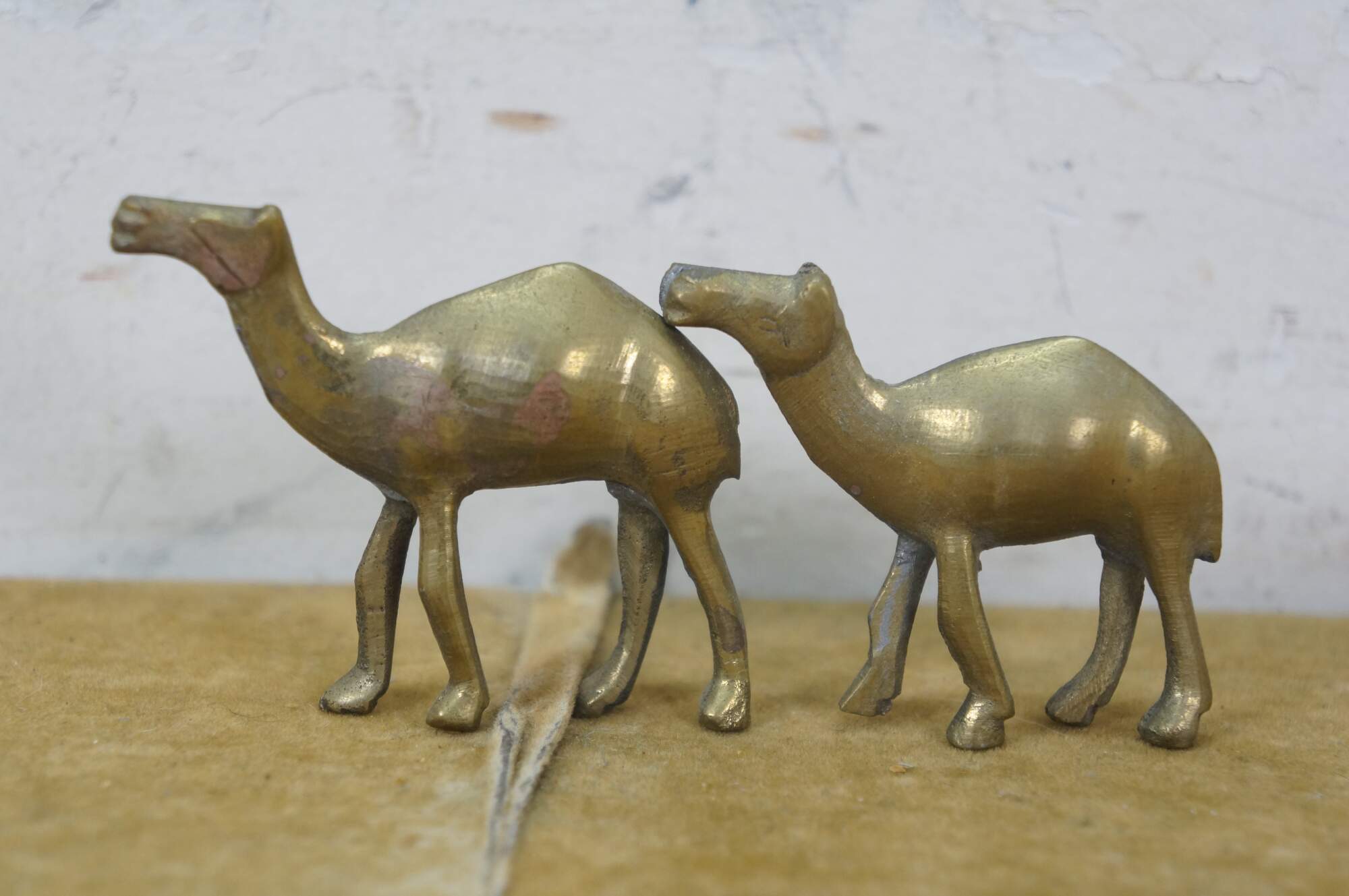Set of seven vintage 20th century brass miniature camel figurines of slowly decreasing size.