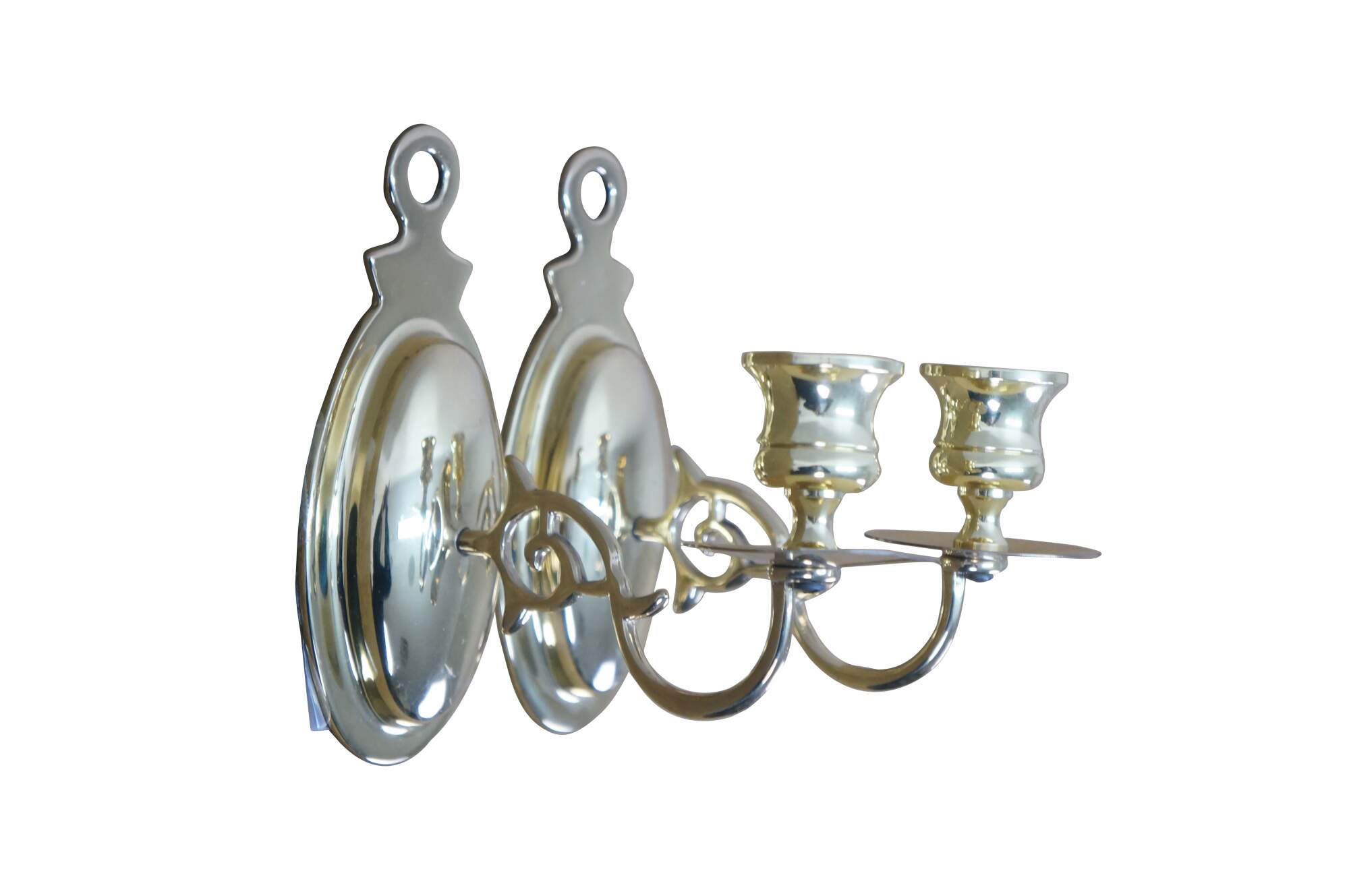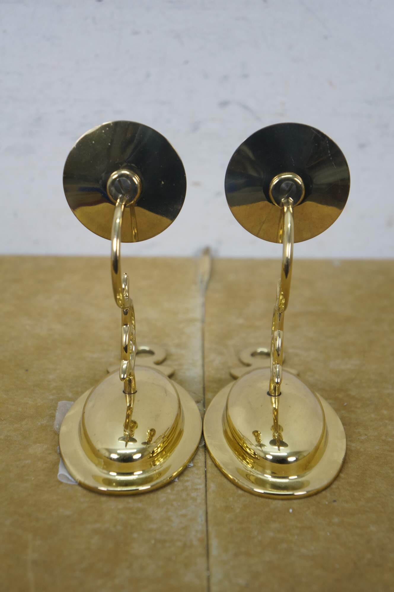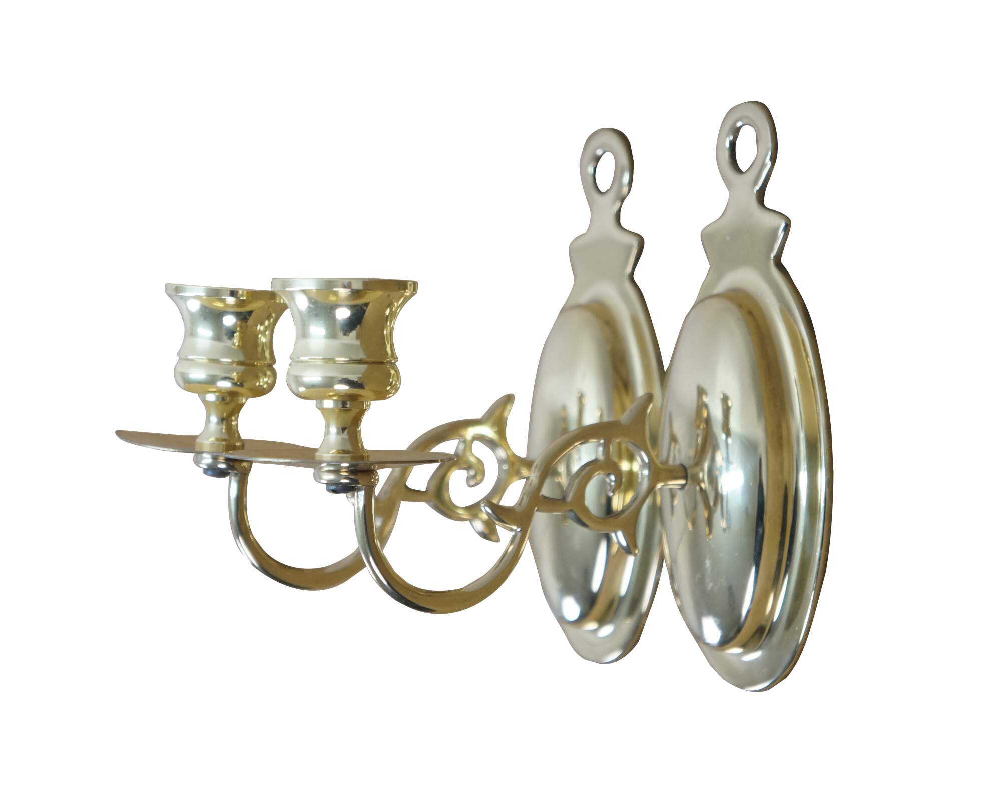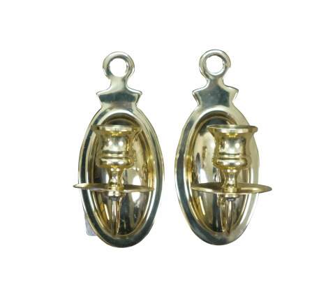 Pair of vintage brightly polished lacquered brass wall hanging single taper candle sconces. Early American / Colonial styling featuring an oval backplate, scrolled arm and simple candle cups with drip plate.