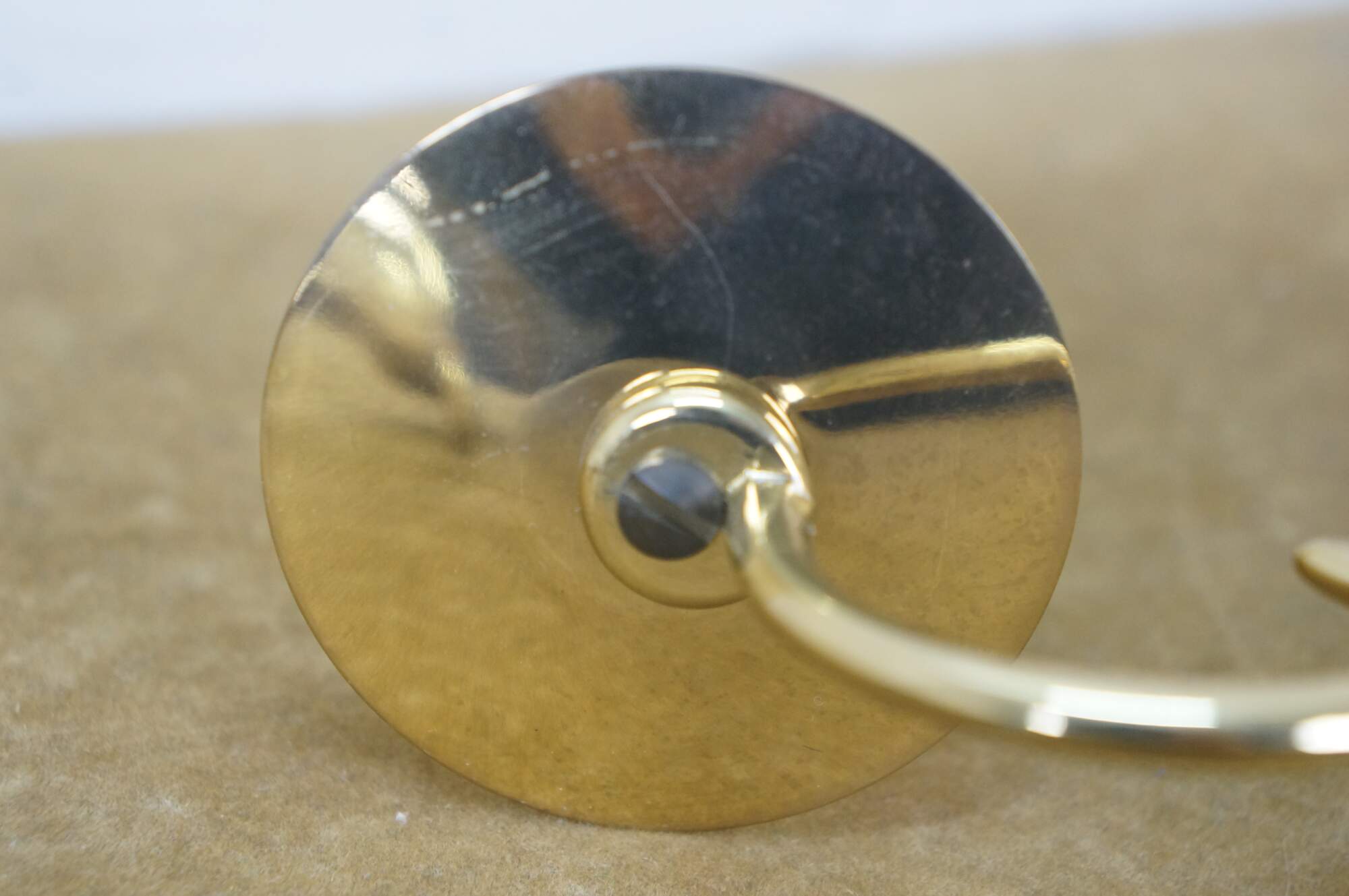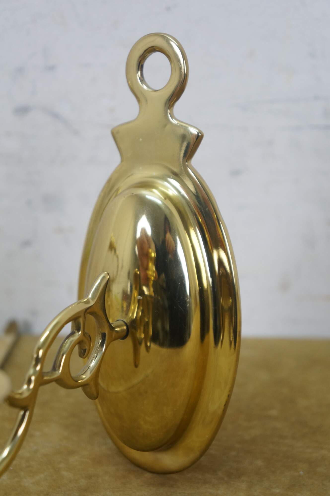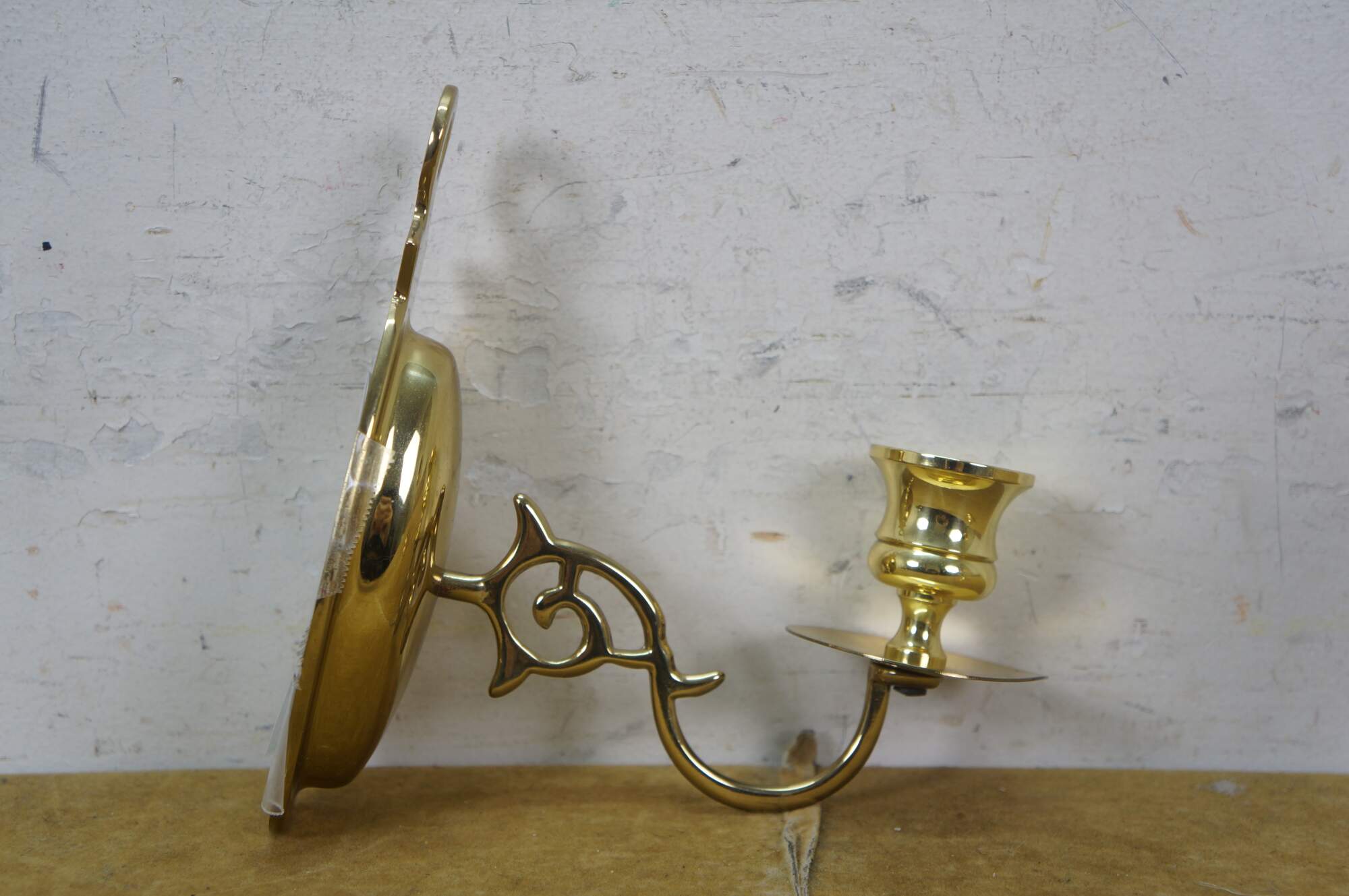 Pair of vintage brightly polished lacquered brass wall hanging single taper candle sconces. Early American / Colonial styling featuring an oval backplate, scrolled arm and simple candle cups with drip plate.