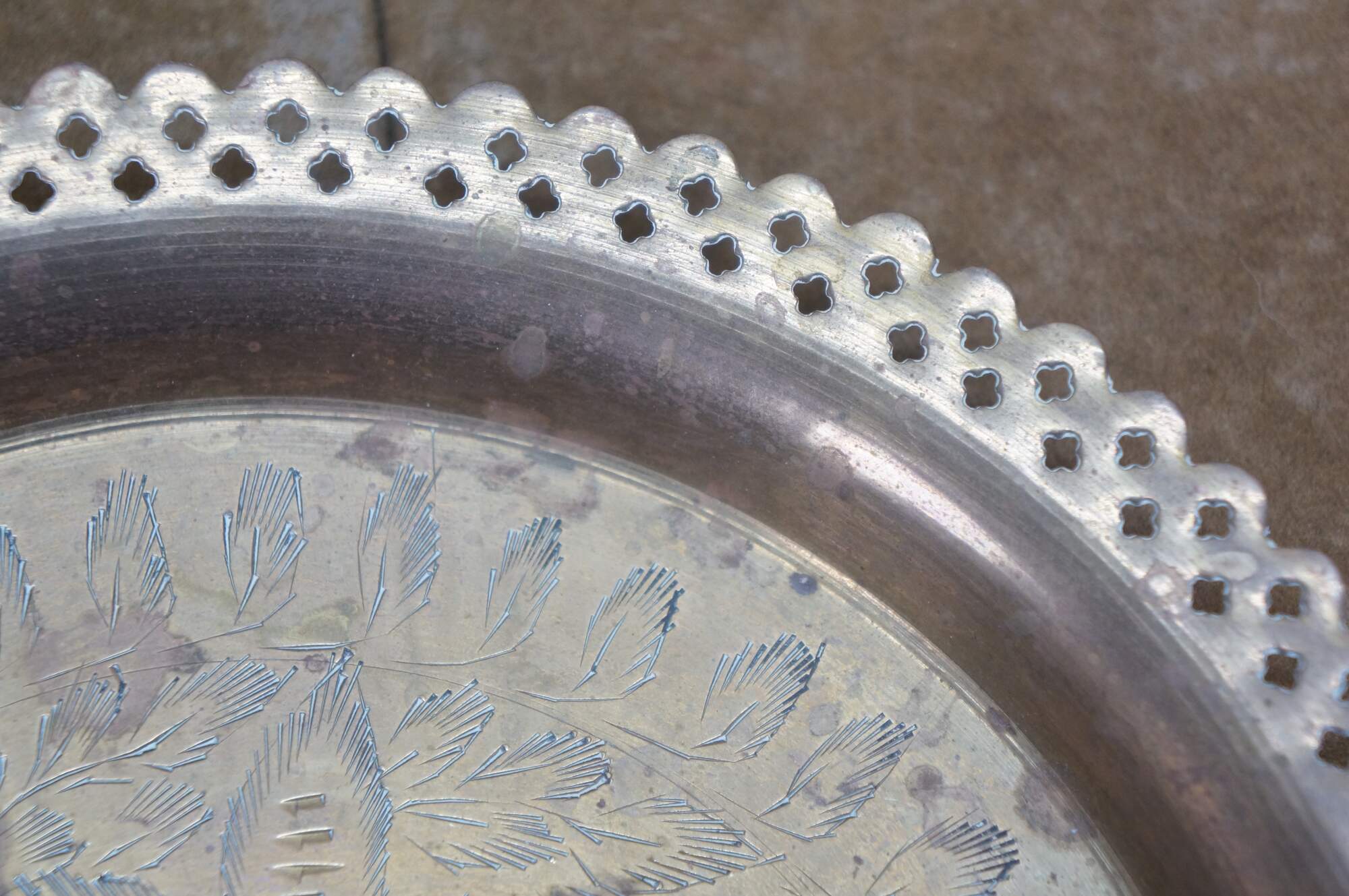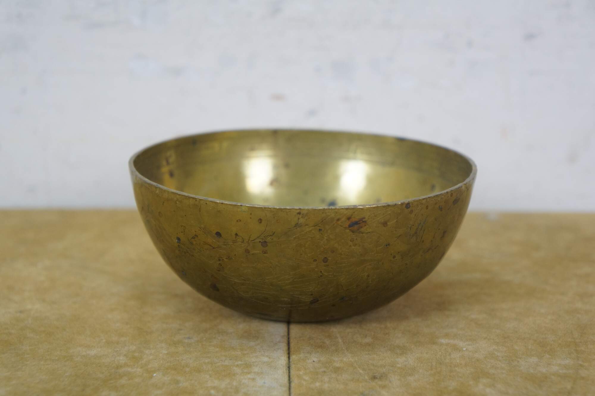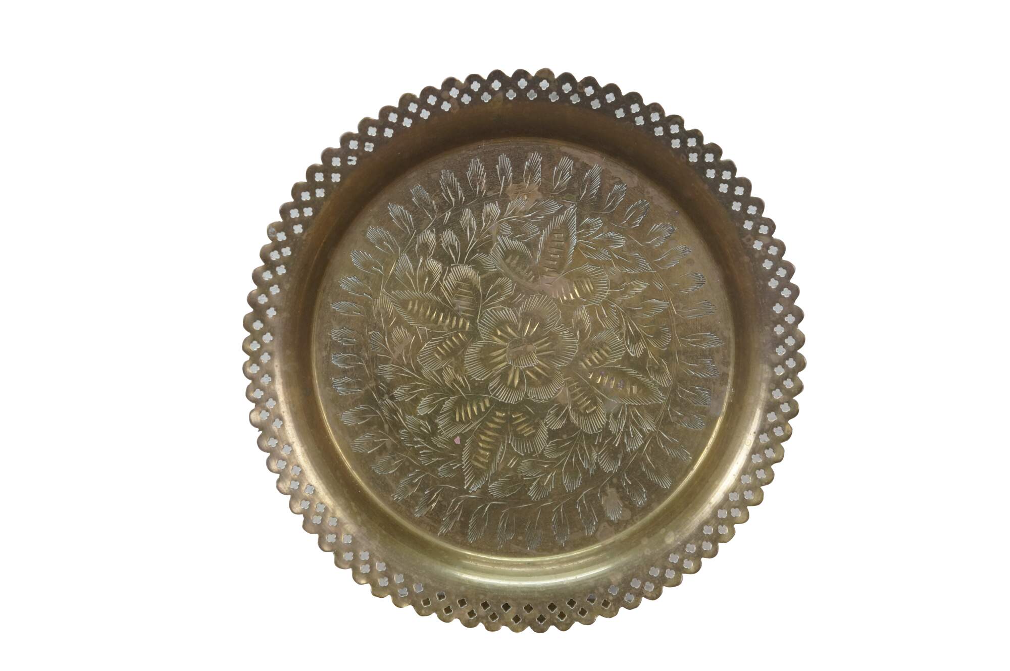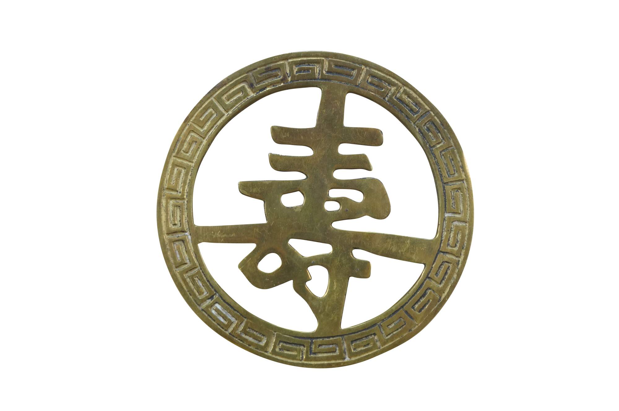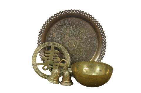 Set of 4 assorted vintage brass pieces of tableware. Includes: Floral etched plate with pierced and scalloped edge. Pot rest / trivet featuring the Chinese character shou representing Long Life - Made in Taiwan. Small bowl etched with a dragon on the outside and embossed with a chinese character on the interior. And a pair of joined floral etched bells.