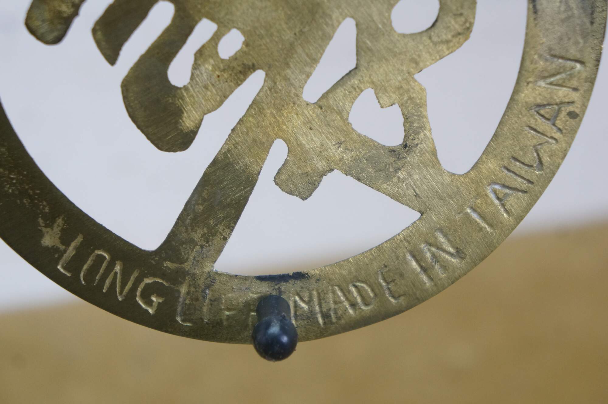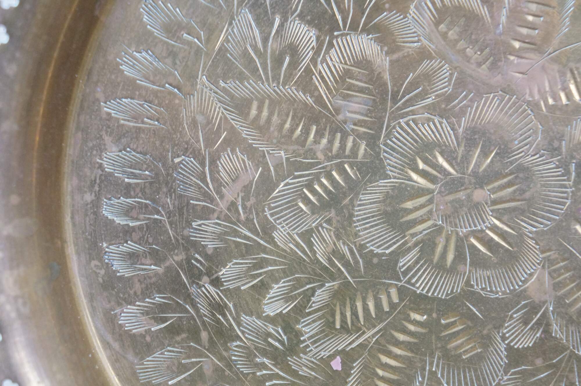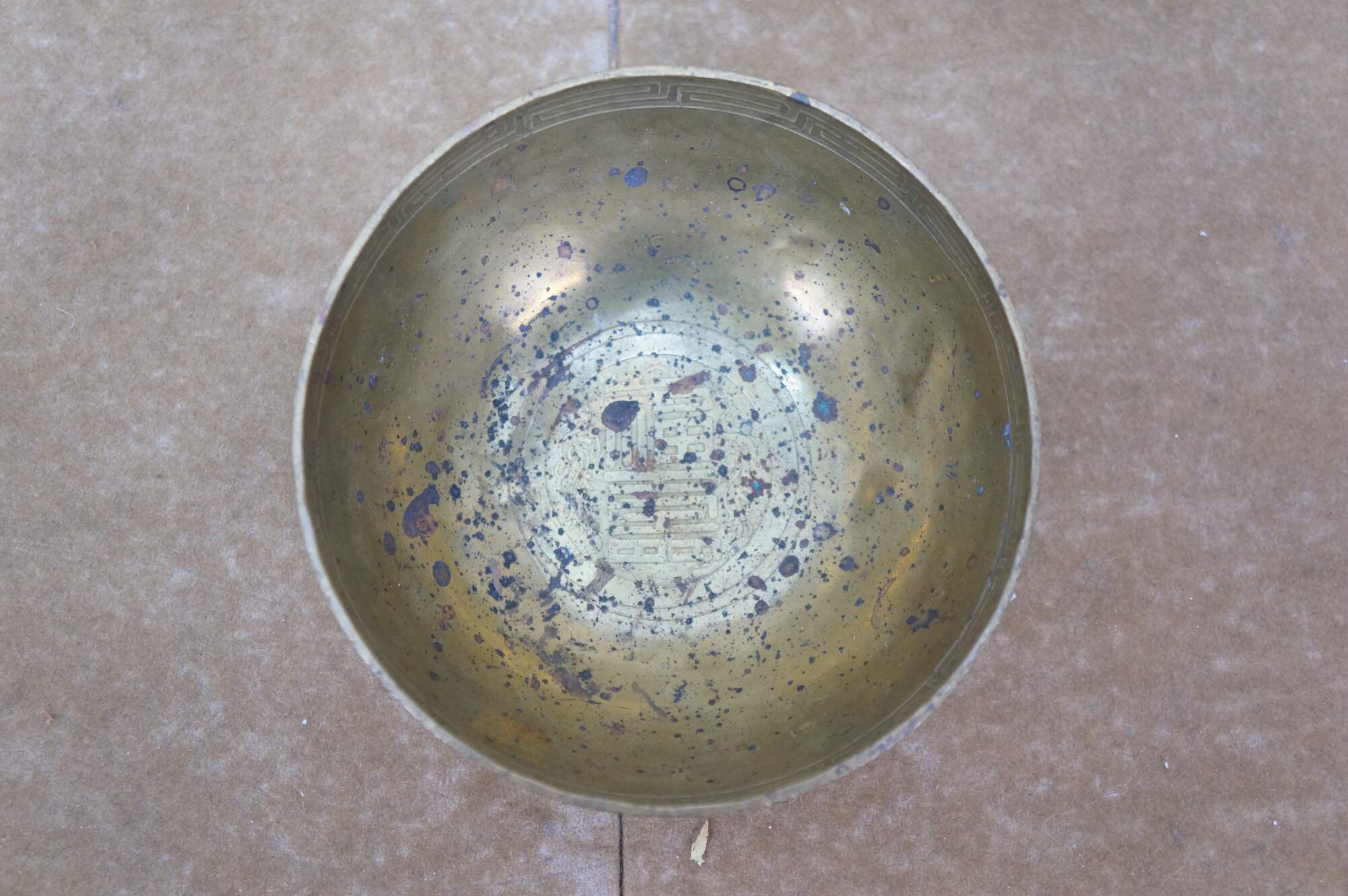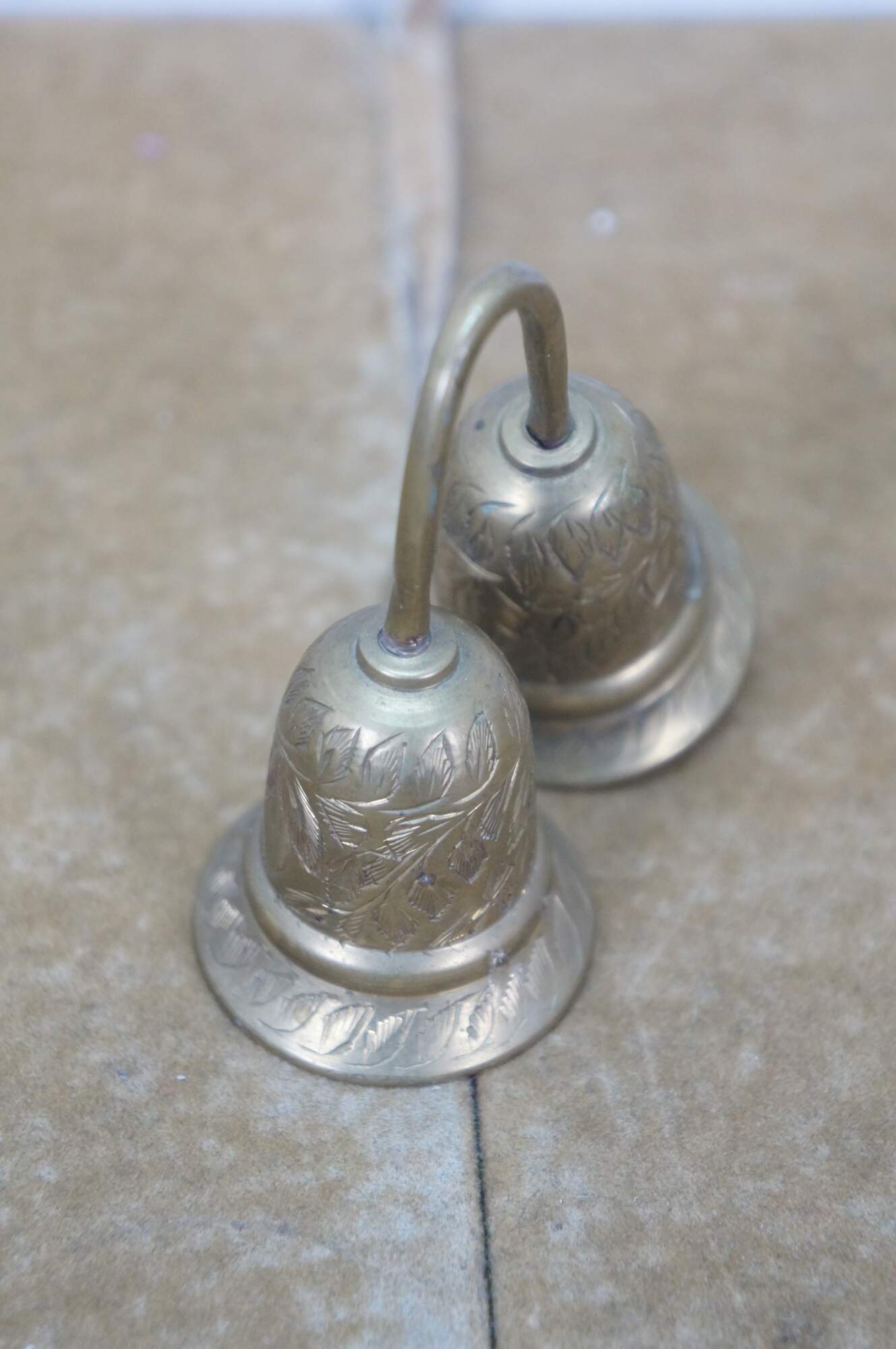 Set of 4 assorted vintage brass pieces of tableware. Includes: Floral etched plate with pierced and scalloped edge. Pot rest / trivet featuring the Chinese character shou representing Long Life - Made in Taiwan. Small bowl etched with a dragon on the outside and embossed with a chinese character on the interior. And a pair of joined floral etched bells.