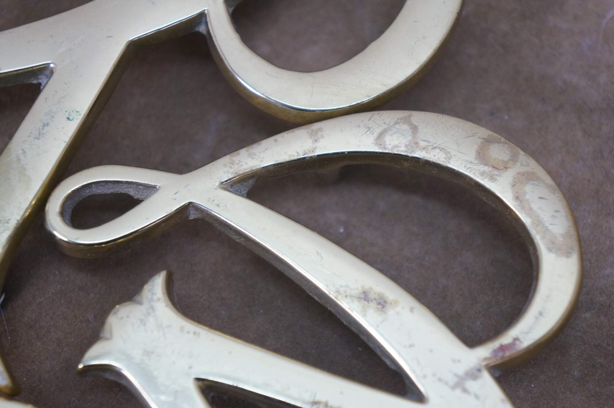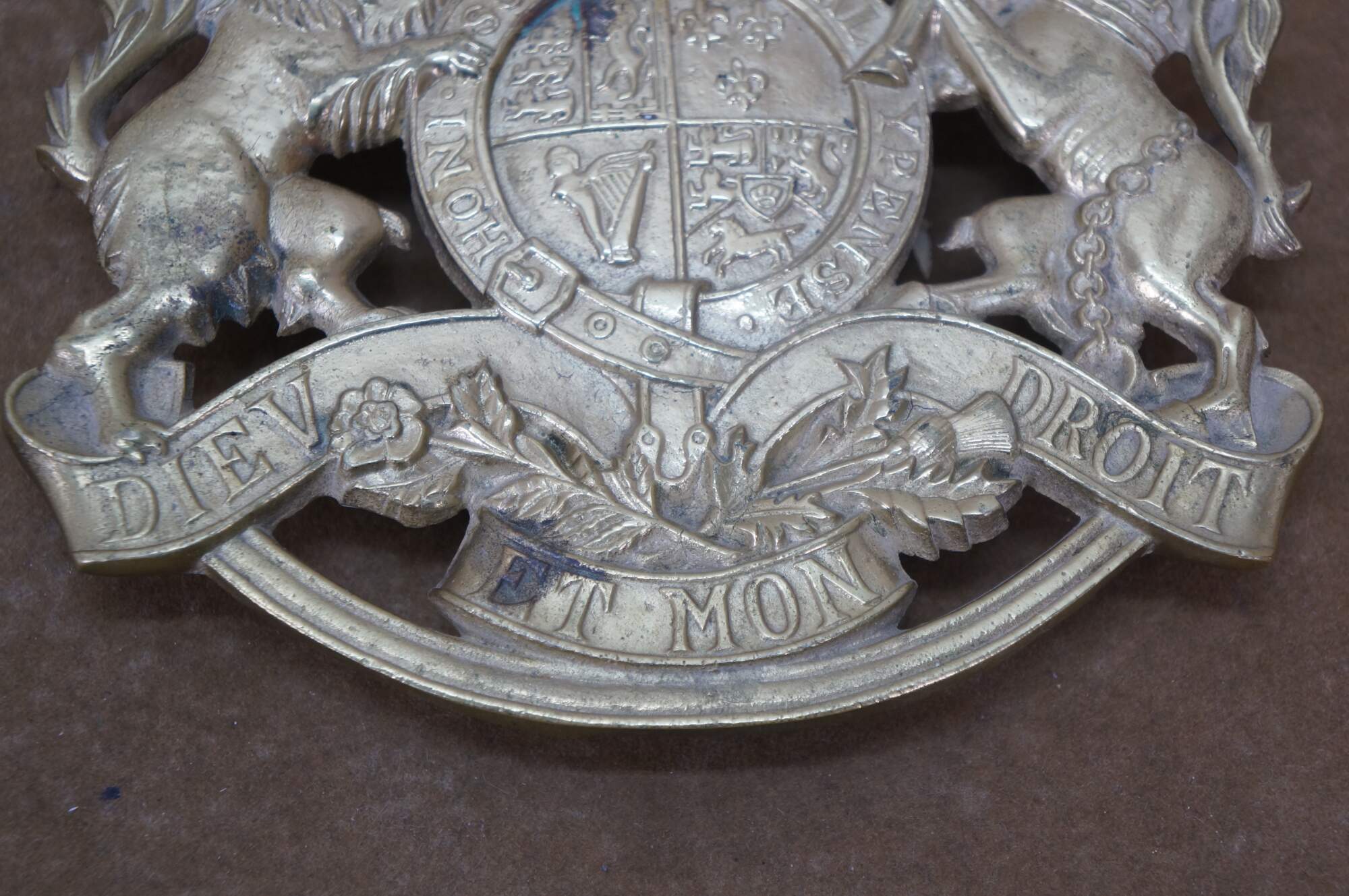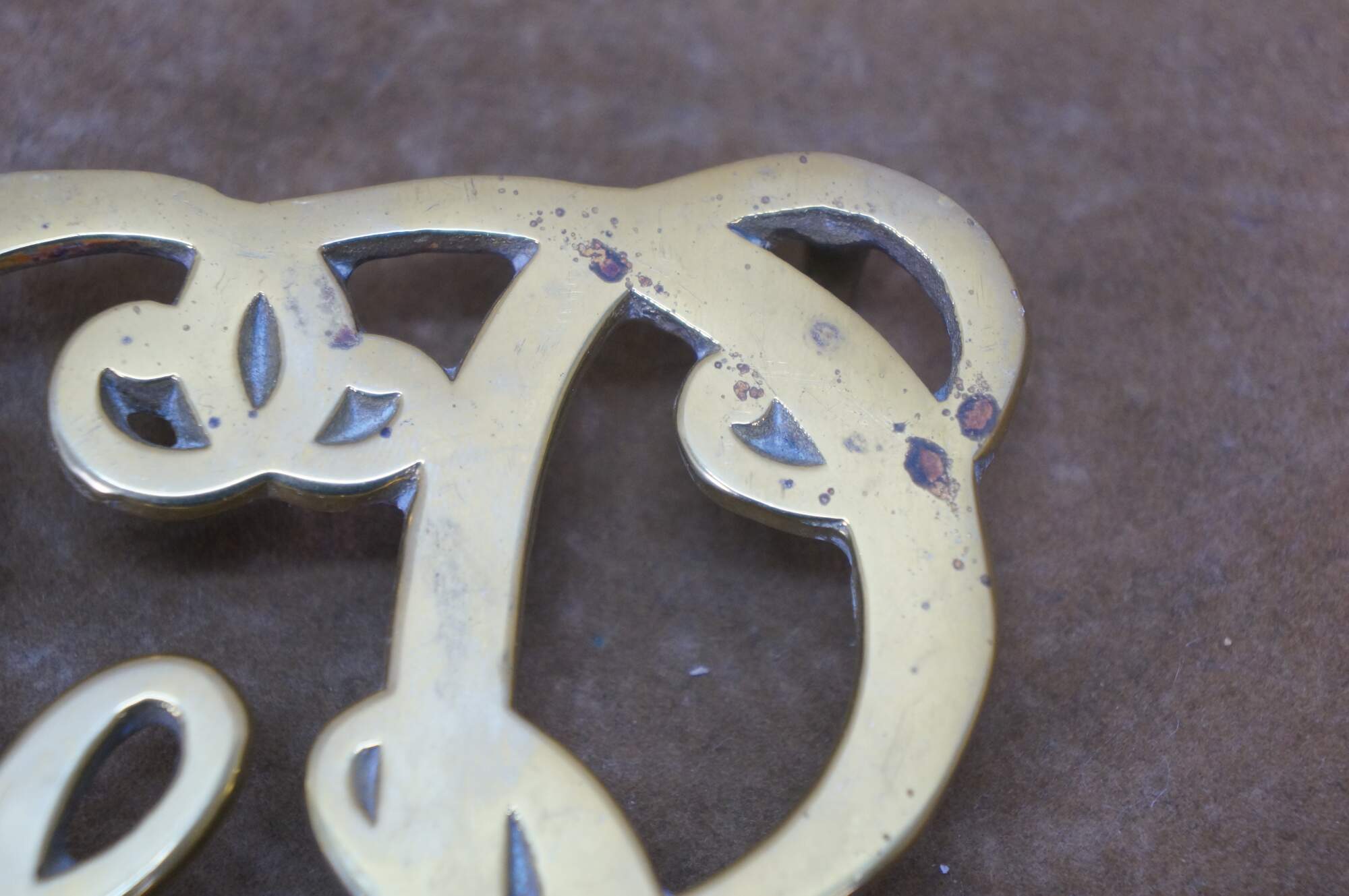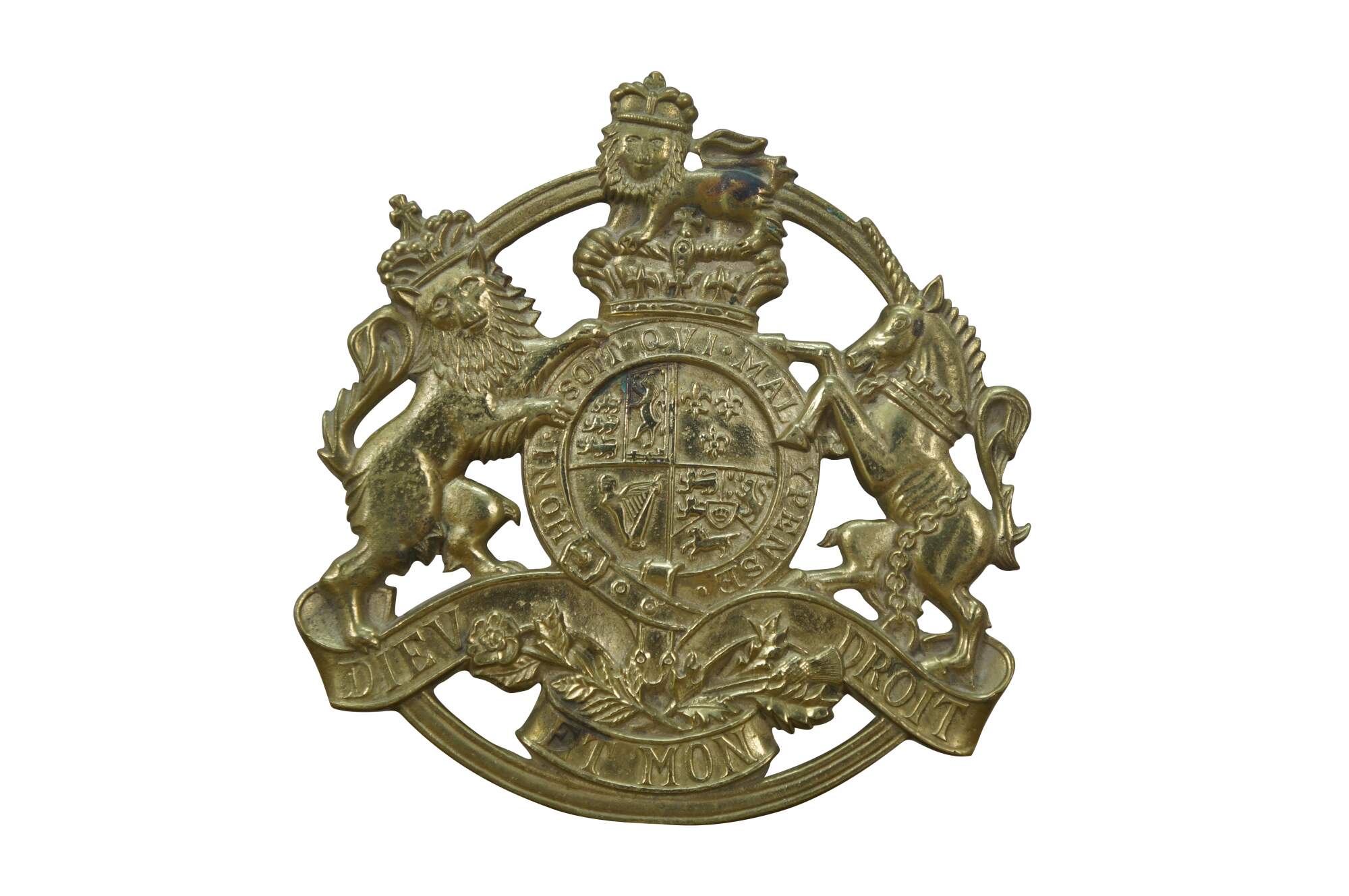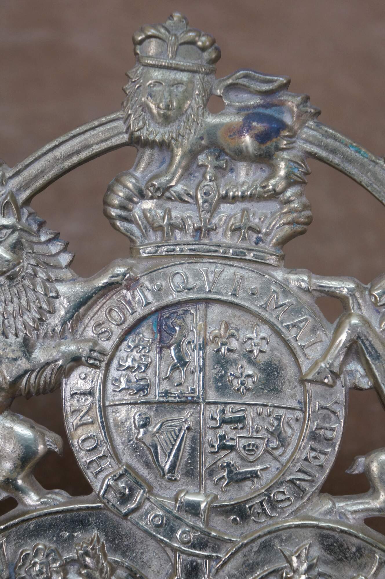 Set of four mid 20th century brass trivets / pot rests by Virginia Metalcrafters. Two William & Mary cyphers, King George monogram, and the British royal coat of arms.
