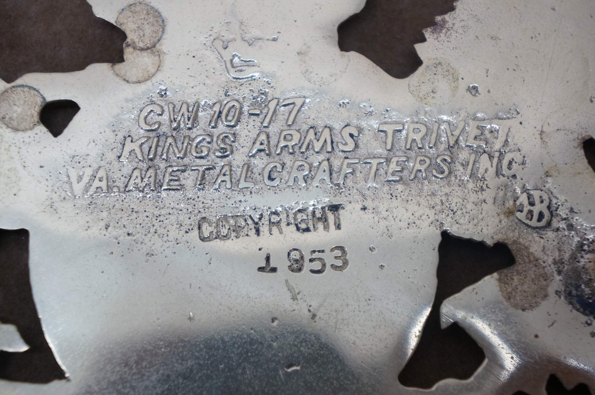 "Virginia Metalcrafters (VM) was founded in 1895 as the W. J. Loth Stove Company of Waynesboro, Virginia. (In 1890 it was called the Waynesboro Stove Company – still run by Mr. Loth.) They initially manufactured cast iron stoves and wood and coal heaters. In 1938 Loth installed a brass foundry and Virginia Metalcrafters became the brand name of the company’s brass and iron giftware line. March 1, 1940 marked the first use of the VM Betty Lamp hallmark on their products. When brass was once again available after World War II, production was resumed and their gift line was expanded. Charles Eckman bought the firm in 1953 and incorporated under the name Virginia Metalcrafters, Inc. In 1956 Virginia Metalcrafters acquired the Harvin Company of Baltimore, makers of fine brassware. In addition to their own original designs, Virginia Metalcrafters produced souvenir trivets for a variety of American touist destinations as well as many reproduction pieces for Colonial Williamsburg / Williamsburg Restoration, Inc. The Waynesboro foundry doors closed in 2006. " (Source: Trivetology)