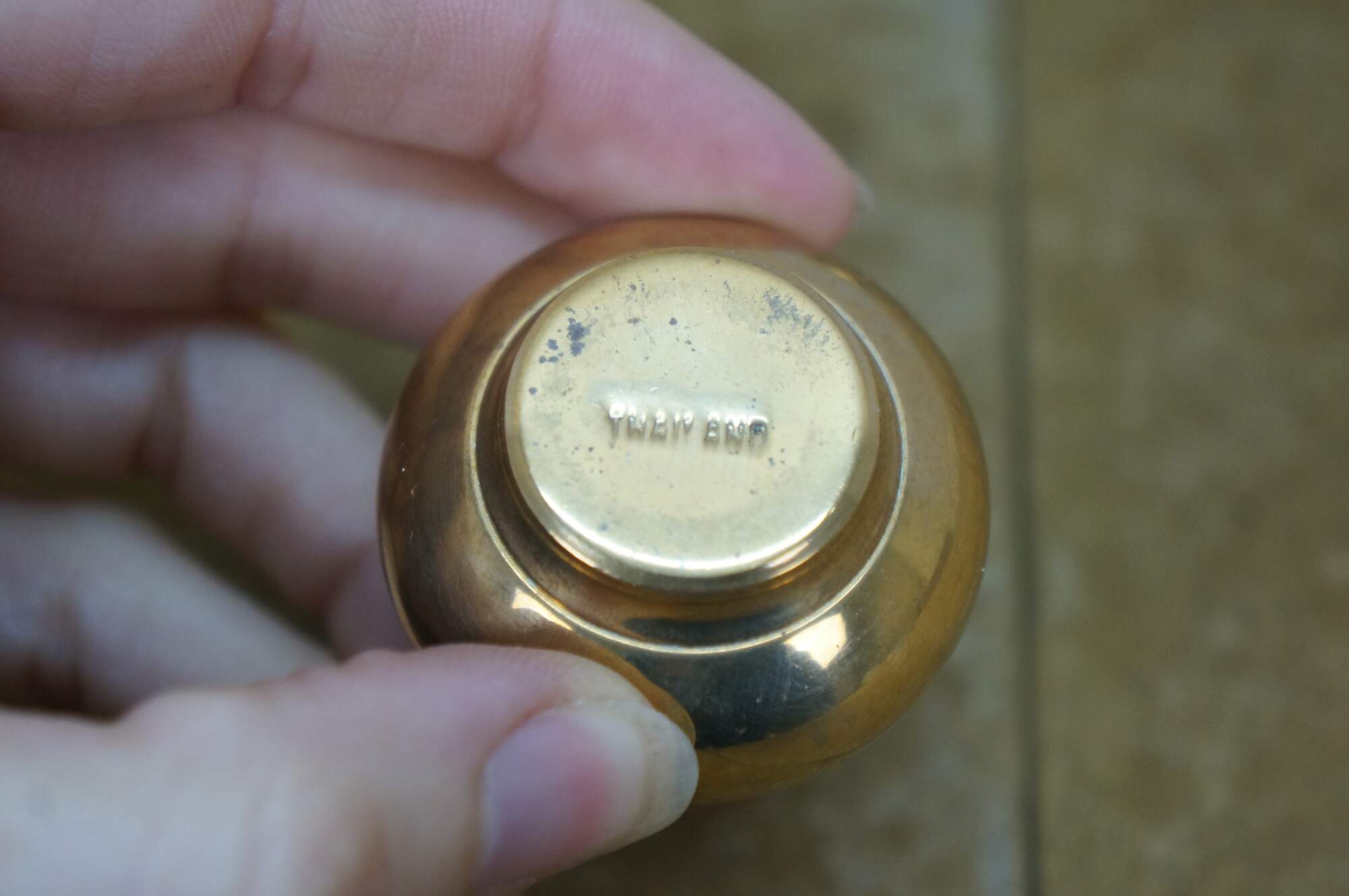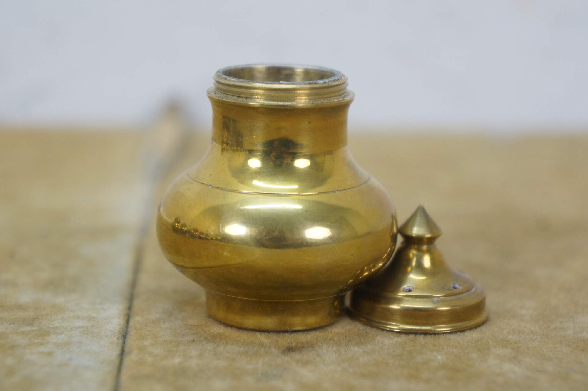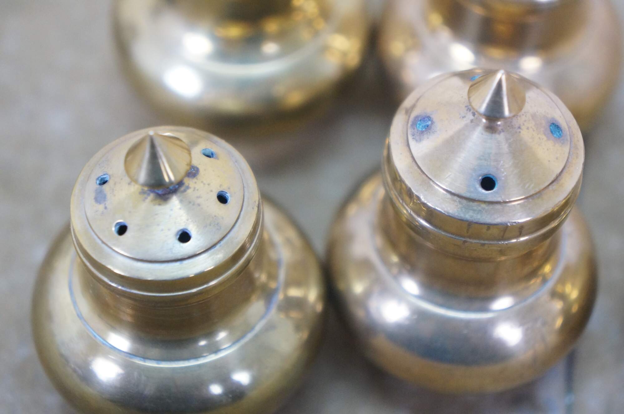 Set of six (three pairs) of mid 20th century miniature brass salt and pepper shakers - squat onion shaped body with cone shaped finial. Made in Thailand.