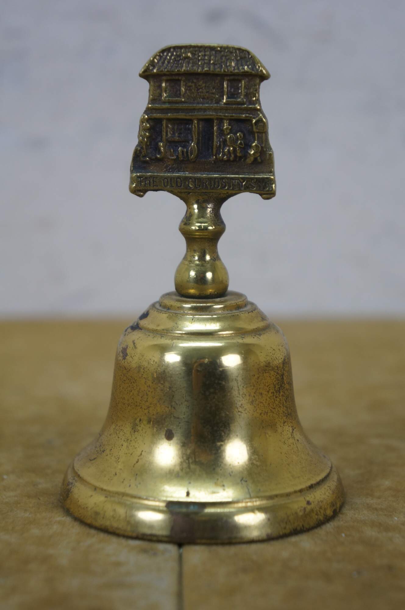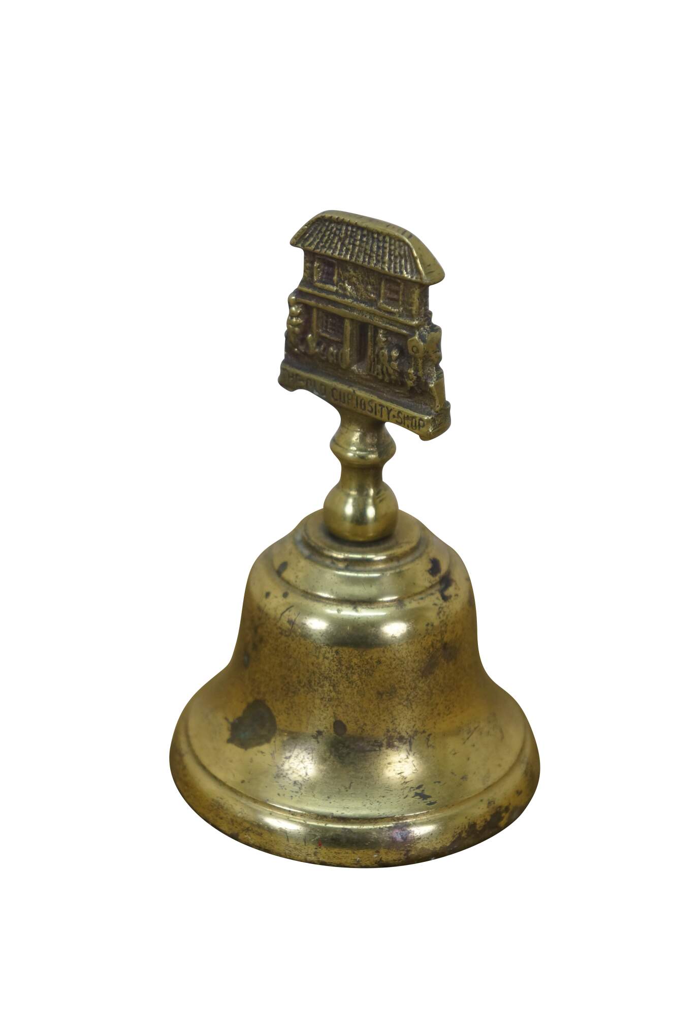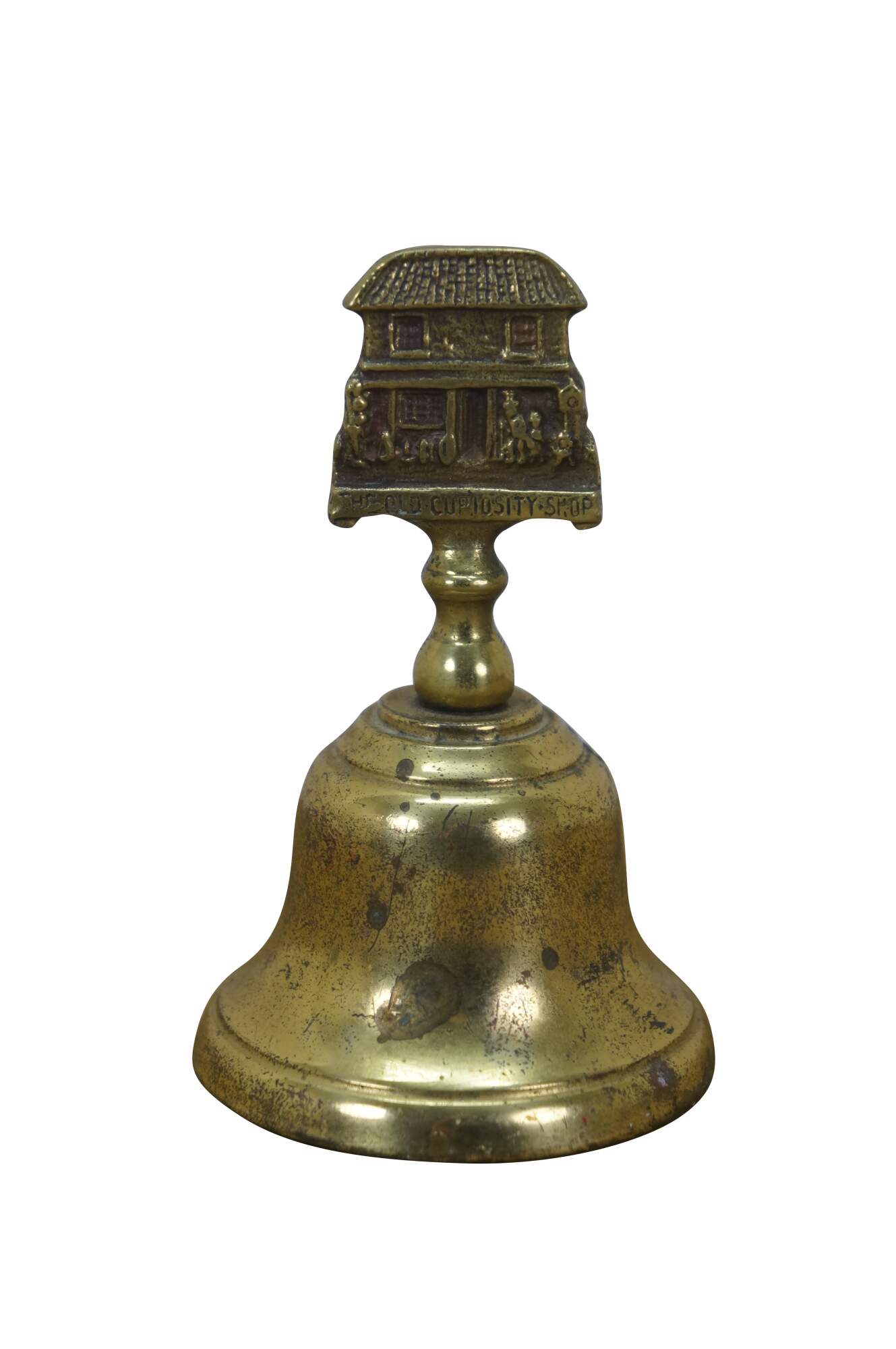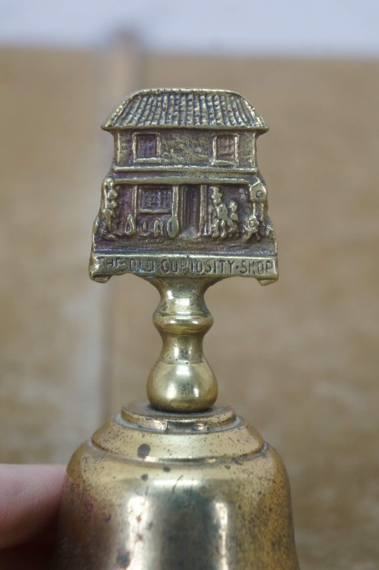 Vintage 20th century Peerage brass dinner / hand bell topped with a handle depicting The Old Curiosity Shop from the novel of the same name by Charles Dickens.