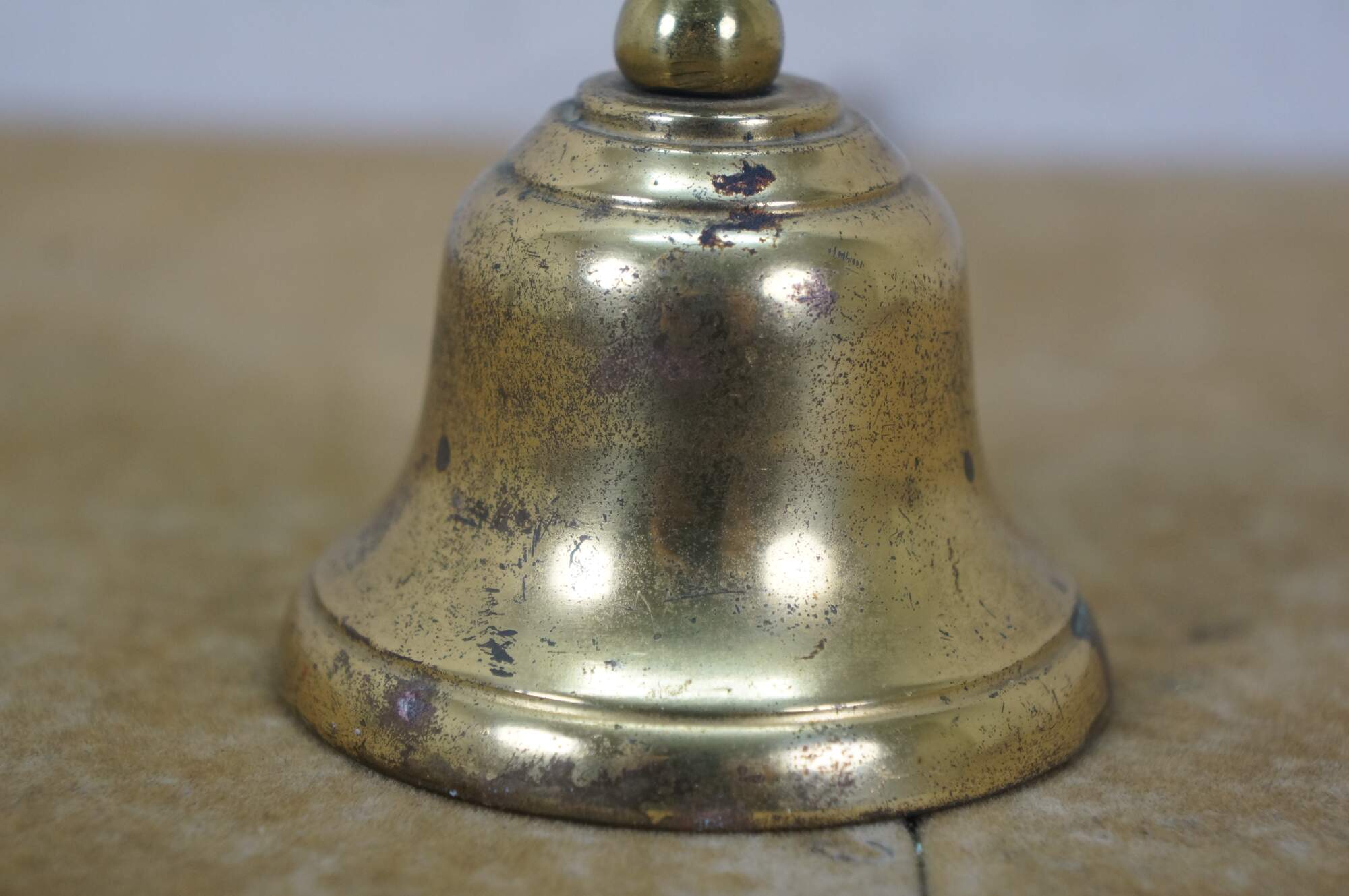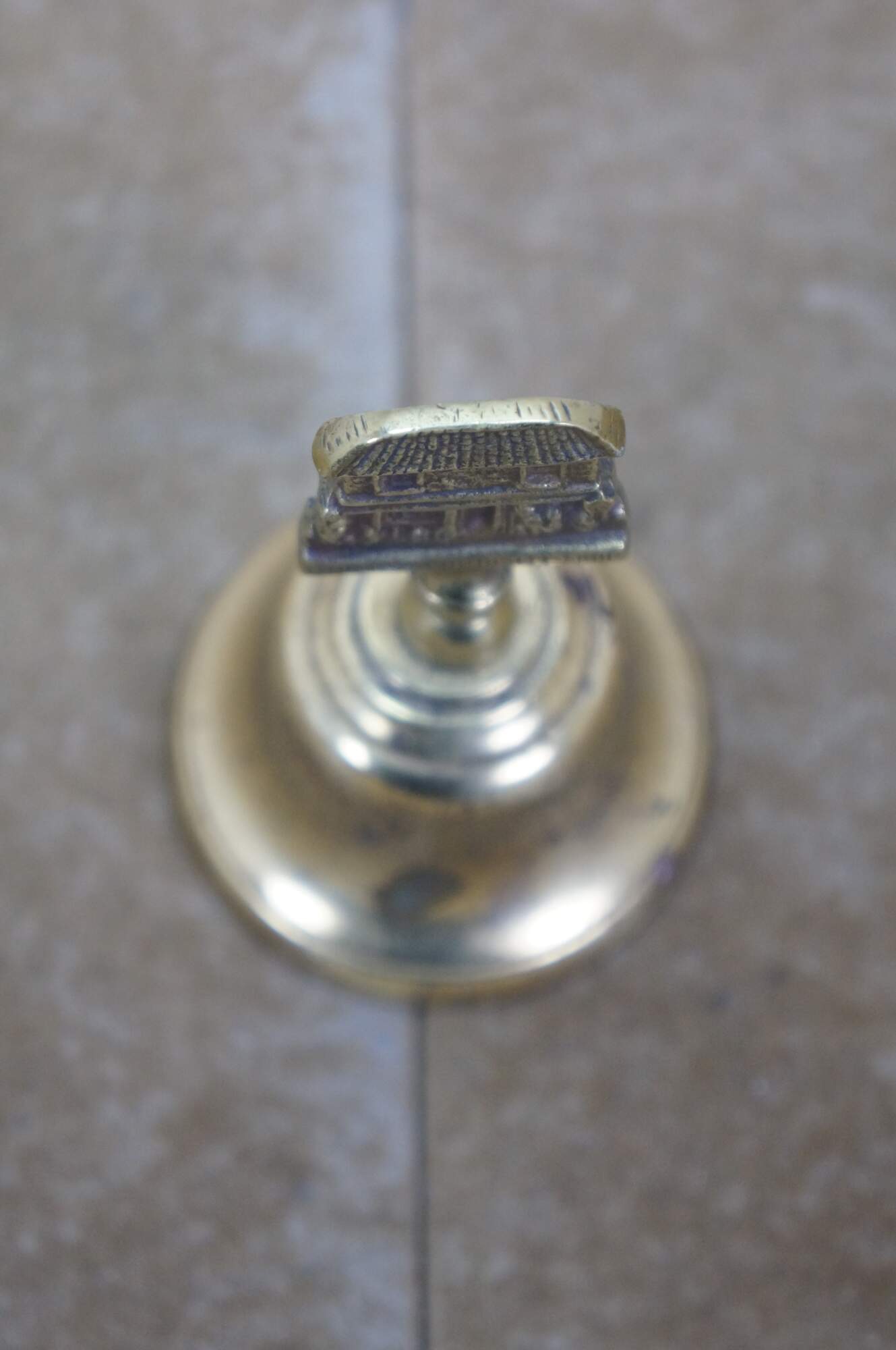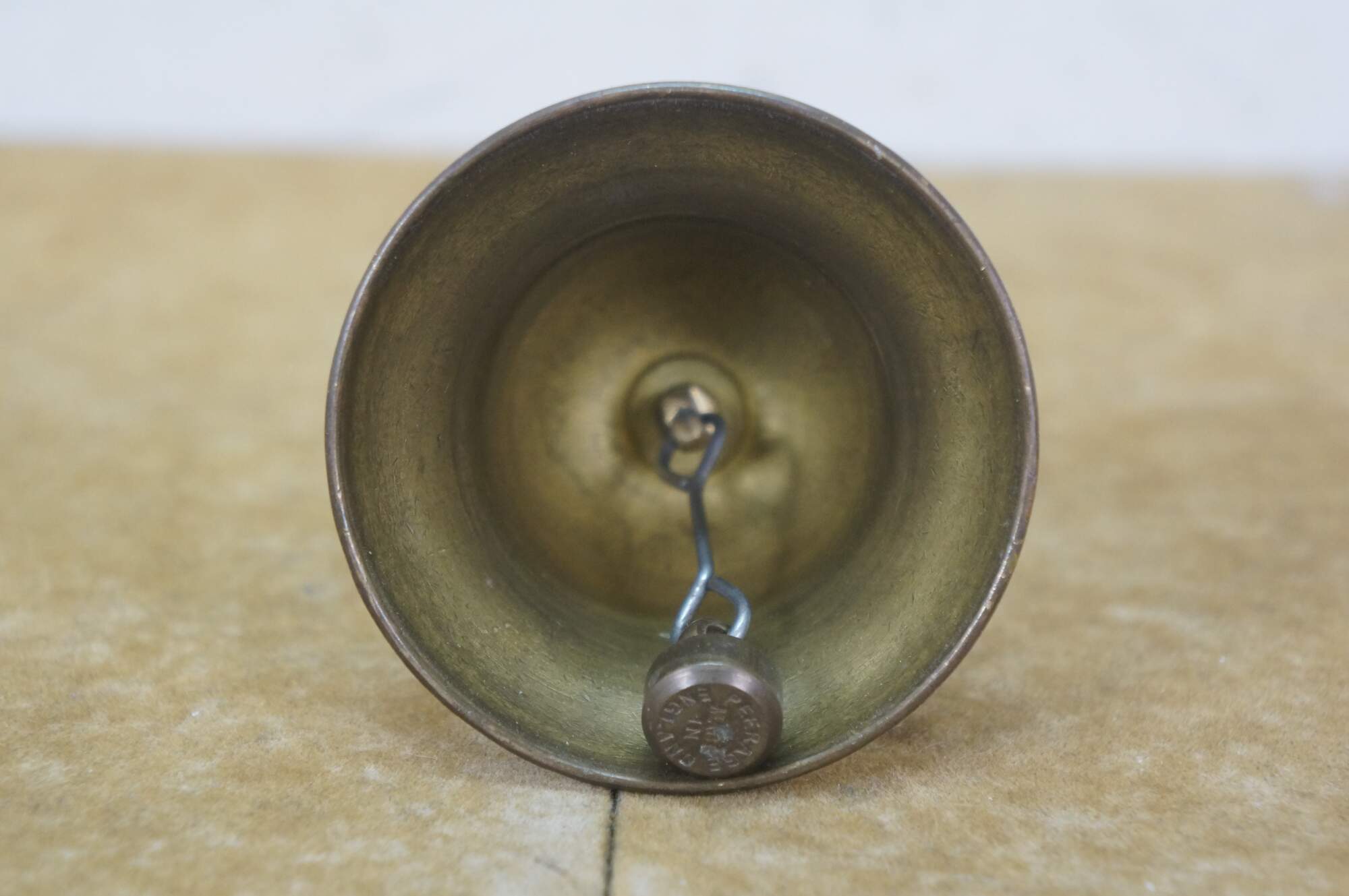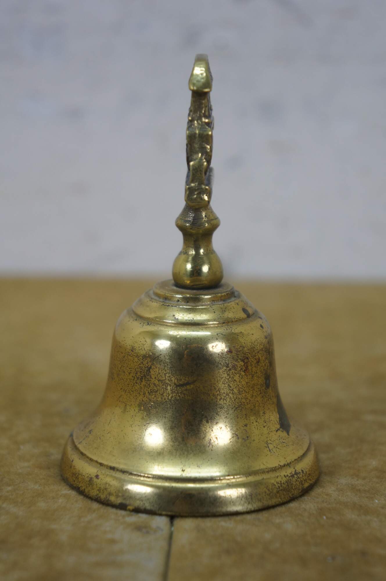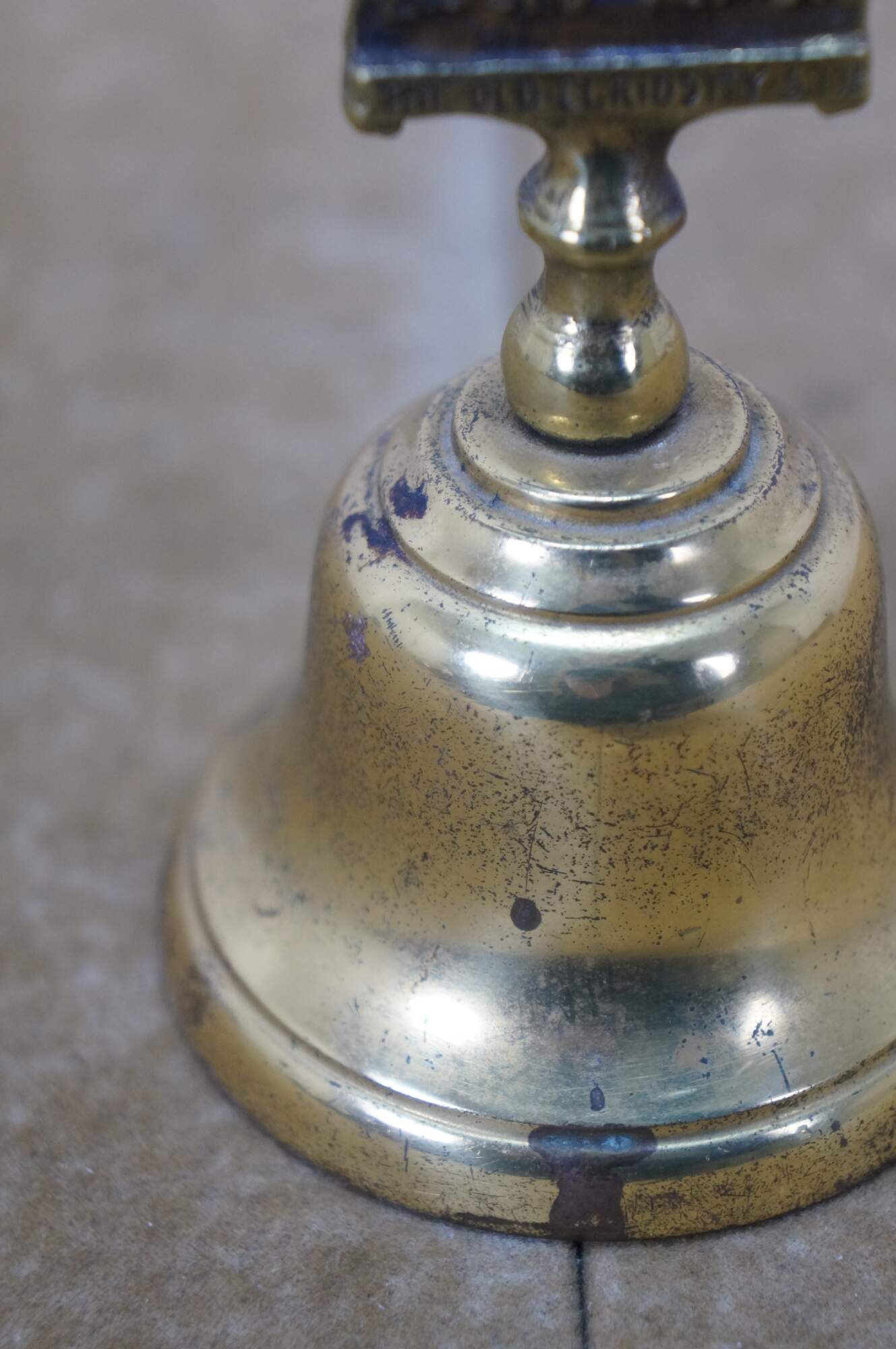 Vintage 20th century Peerage brass dinner / hand bell topped with a handle depicting The Old Curiosity Shop from the novel of the same name by Charles Dickens.