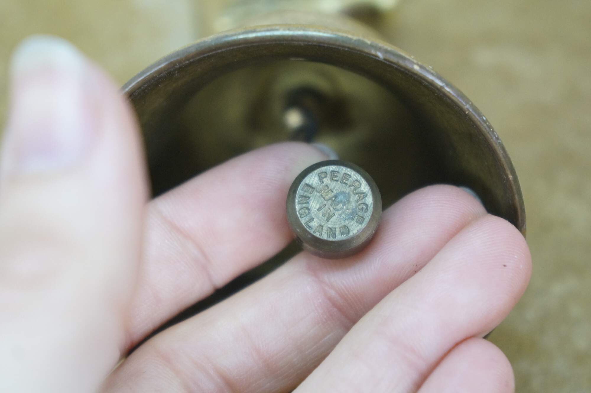 "Peerage Brass - Successor to Pearson Page brand name c1946 onwards and generally used for original designs but also on reproductions. During the 1920s and 30s, the biggest source in the UK of reproduction copper and brassware was the Pearson Page factory in Sherlock Street, Birmingham. Their products were very popular with customers wanting continued supplies of traditional Victorian and Edwardian designs rather than new ones. The goods were well made reproductions, albeit with the sheet work being made of fairly thin copper and brass. Items such as cast doorknockers were definitely intended for regular use and most other products were suitable for their original purpose as well as being decorative. Items were not branded by the manufacturer since they were sold through a variety of outlets including leading department stores. This can now lead to difficulty dating items that were good reproductions of Victorian originals. There was a thriving export business to the USA with sales through local agents. In the 1930s the firm became Pearson Page Jewsbury Co Ltd with works in the Witton area of Birmingham near IMI Metals. Representation in the USA was through S P Skinner Co., Inc. and there were other agents in New Zealand, South Africa, Holland, Spain and the Scandinavian Countries. By 1936 the product range had increased tremendously and the catalogue was split into four sections: Artistic Brassware, Cabinet Handles of all Periods, Lead Figures and Garden Ornaments, Lamps, Electrical Fittings and Fireplace Equipment. The 'Peerage' name was first used during the recovery period after the end of the Second World War. Trade mark may have lapsed in 1991." (Source: Old Copper)