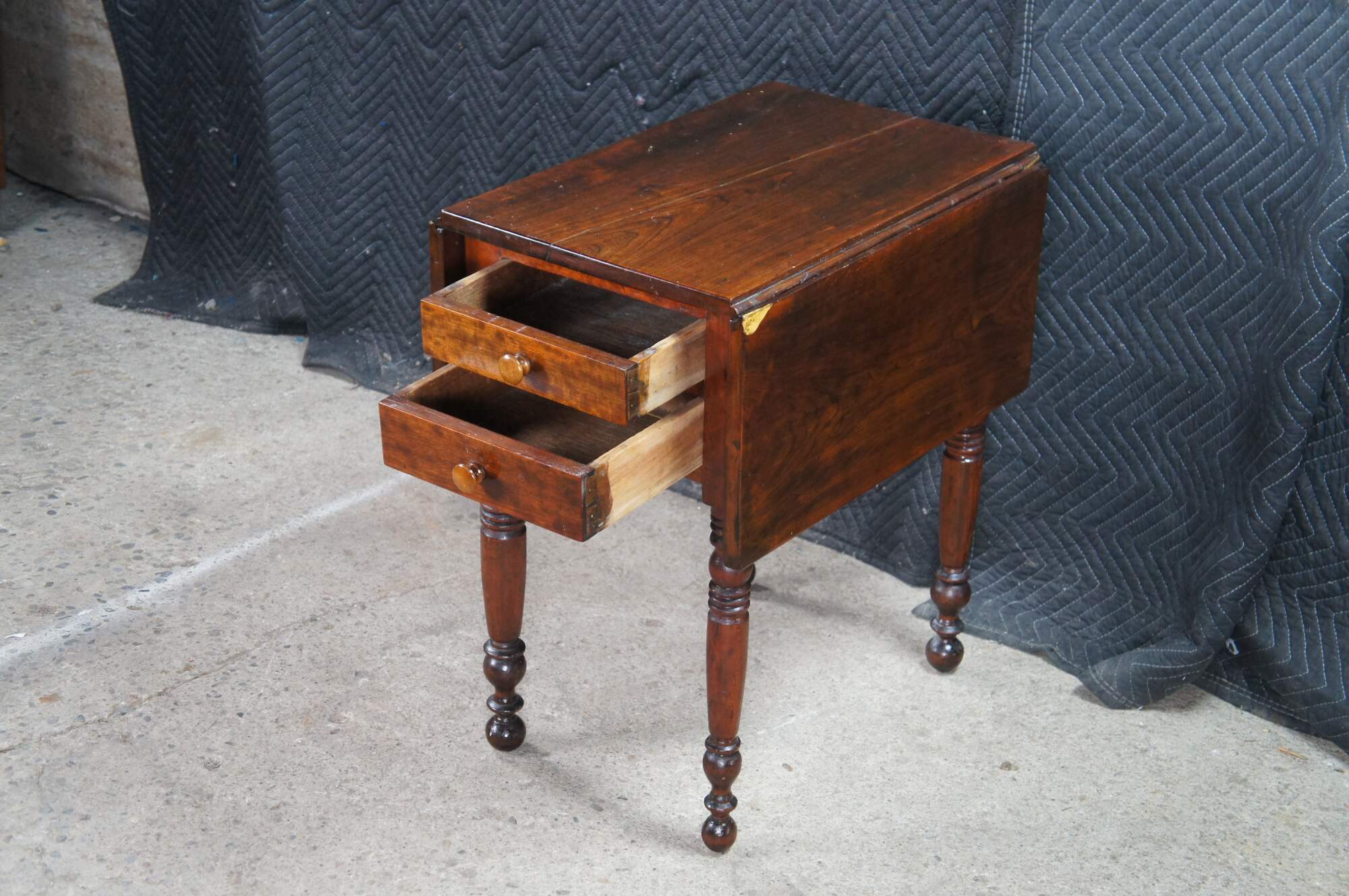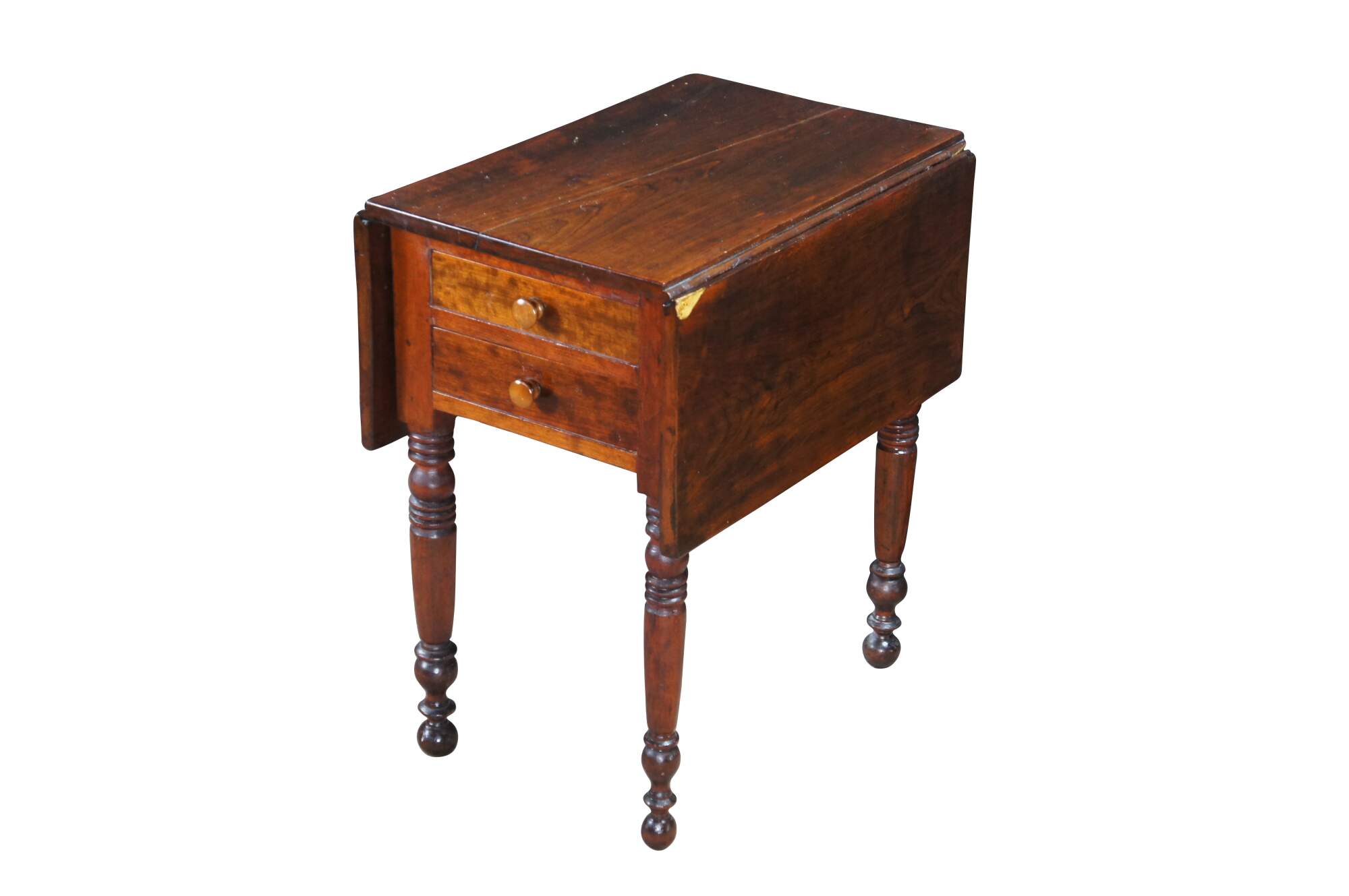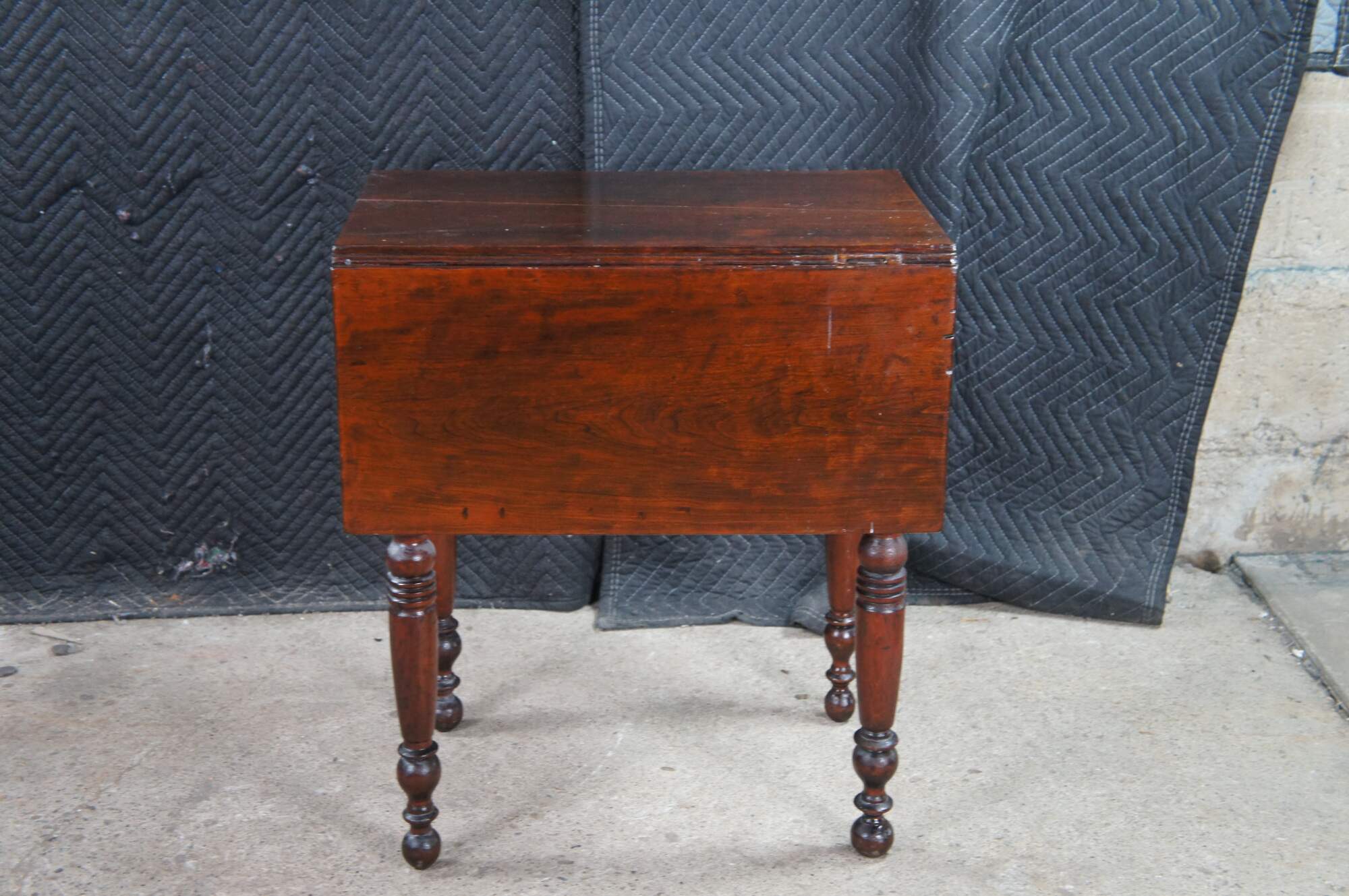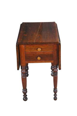 Antique cherry drop leaf side accent table. This table features American federal styling with dropleaf sides, two drawers, and turned legs.