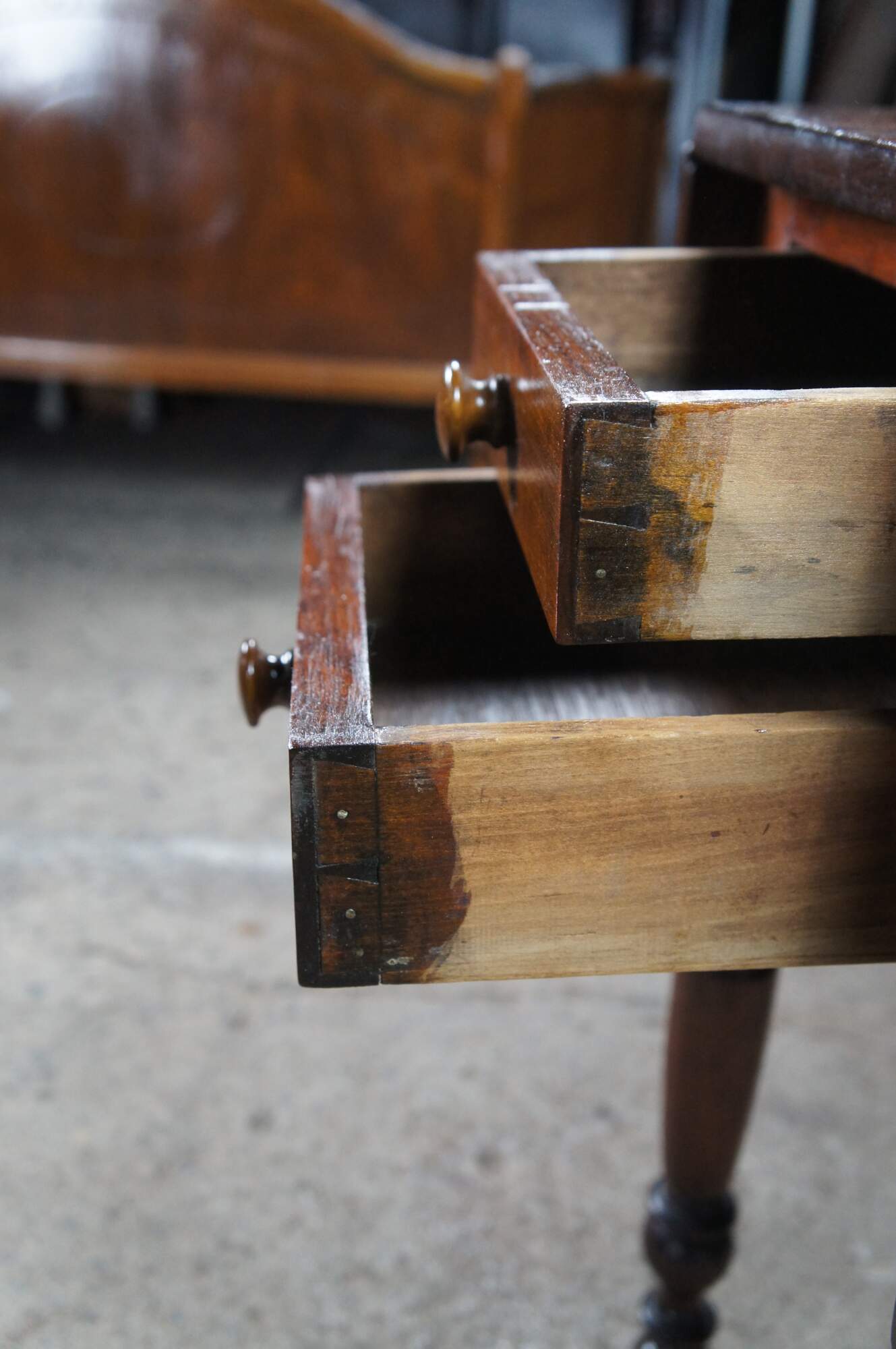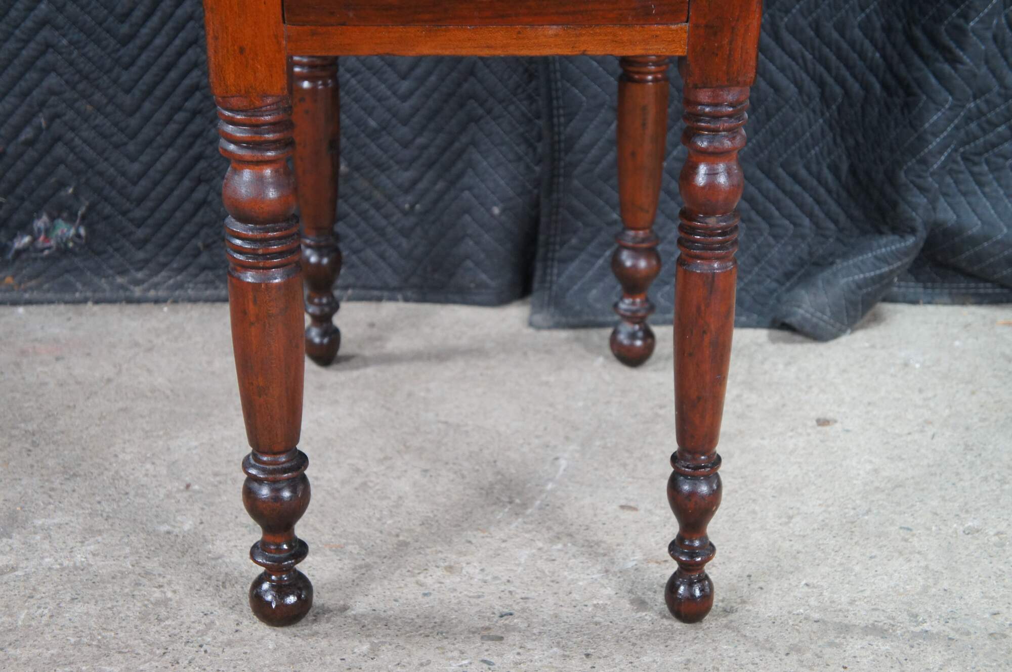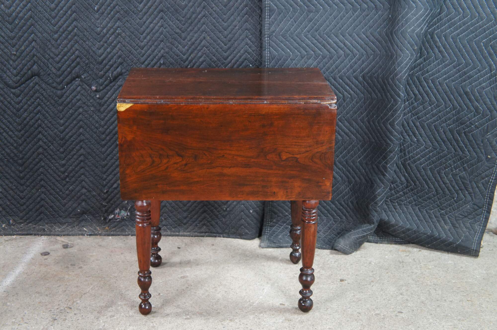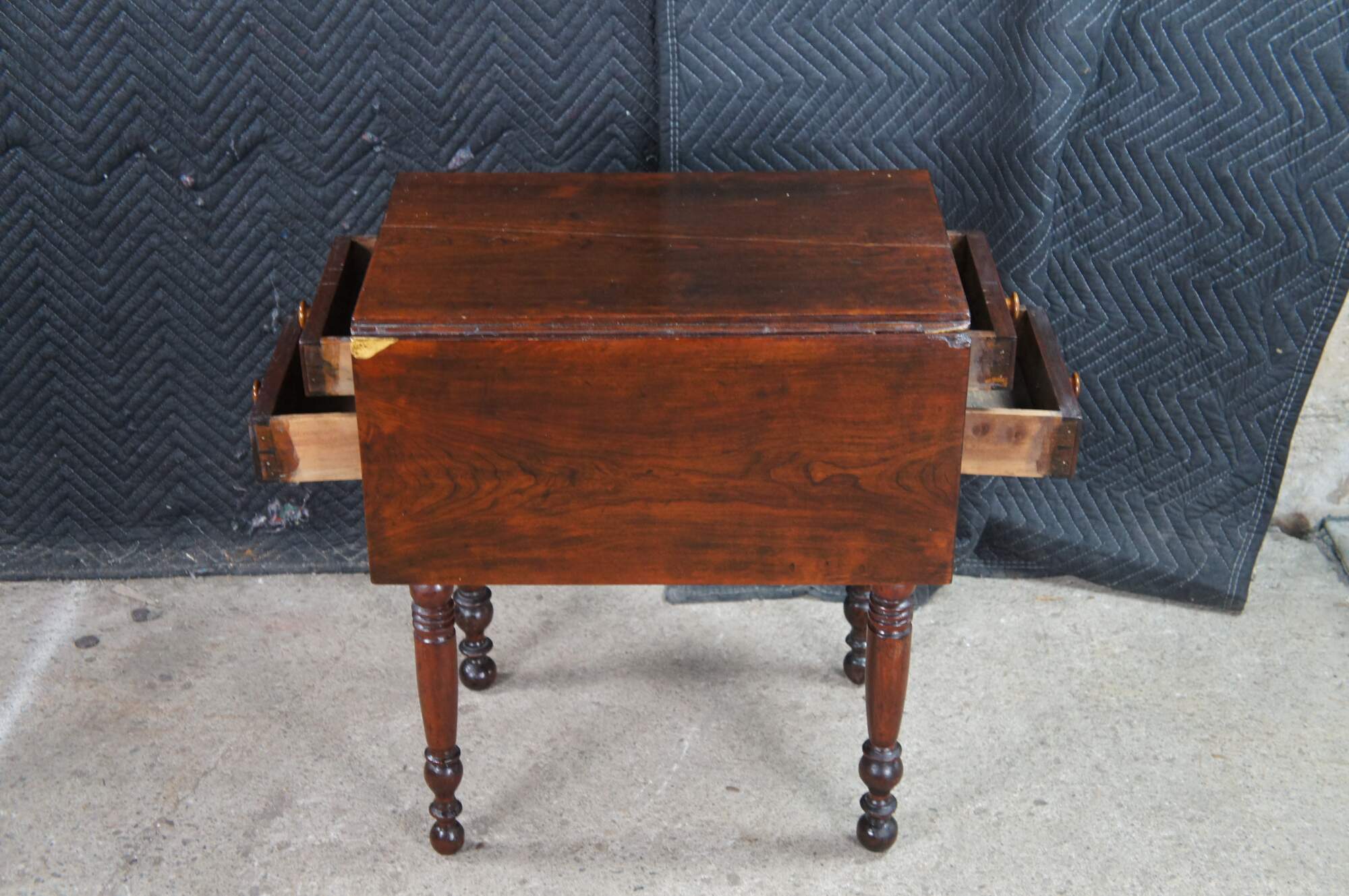 Antique cherry drop leaf side accent table. This table features American federal styling with dropleaf sides, two drawers, and turned legs.