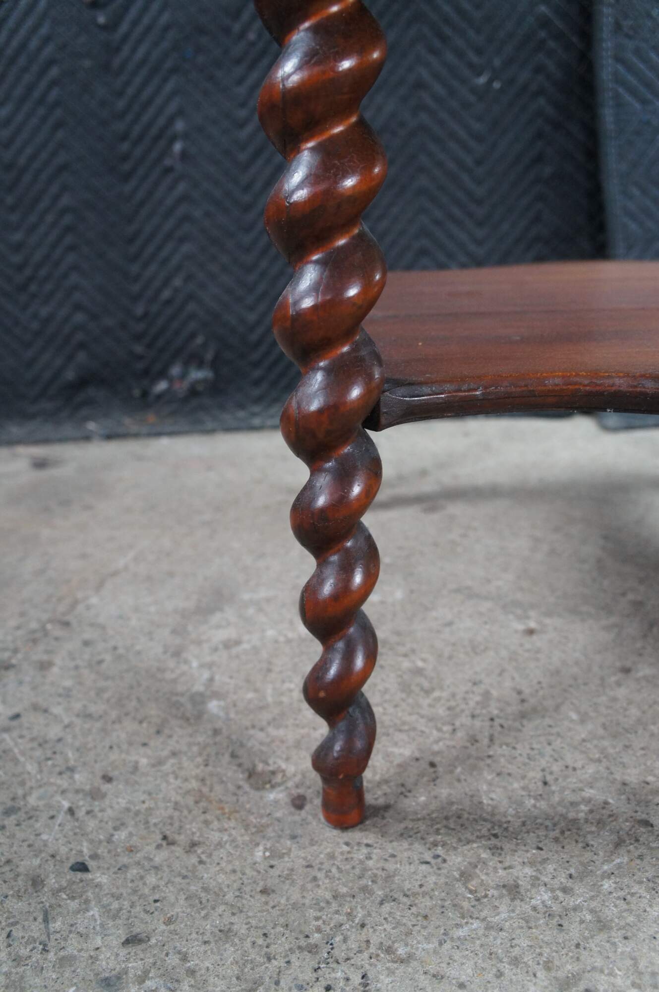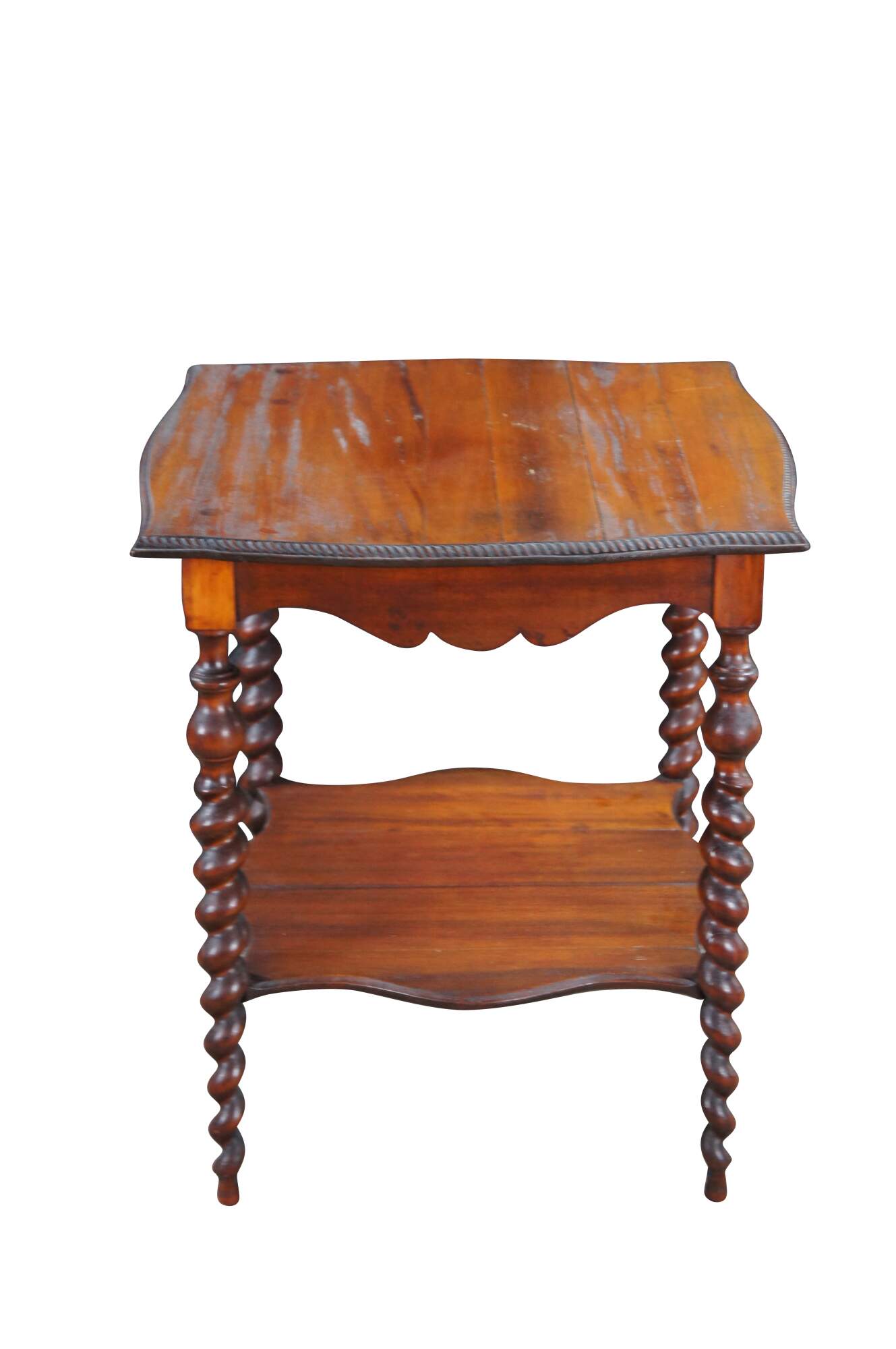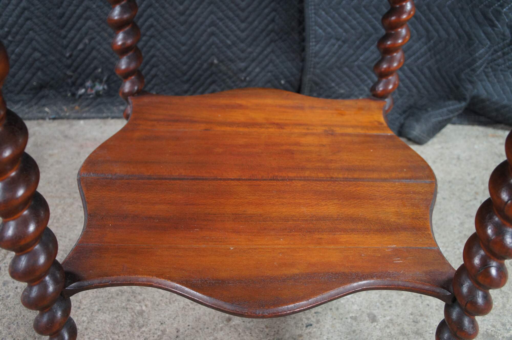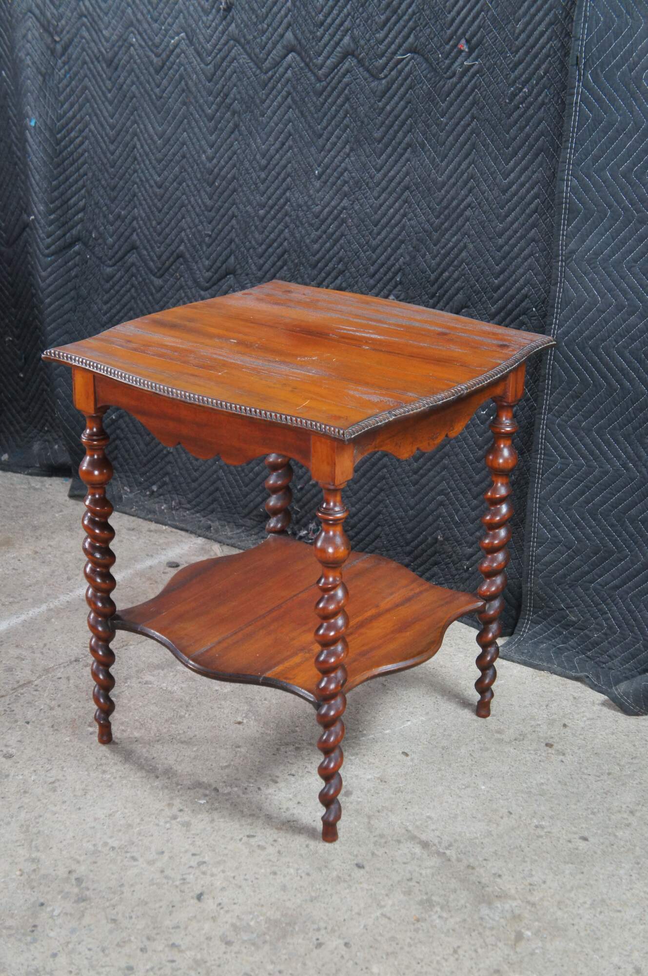 Antique Victorian two tiered barley twist parlor accent table. Made of mahogany featuring serpentine accents with lower shelf and turned legs.