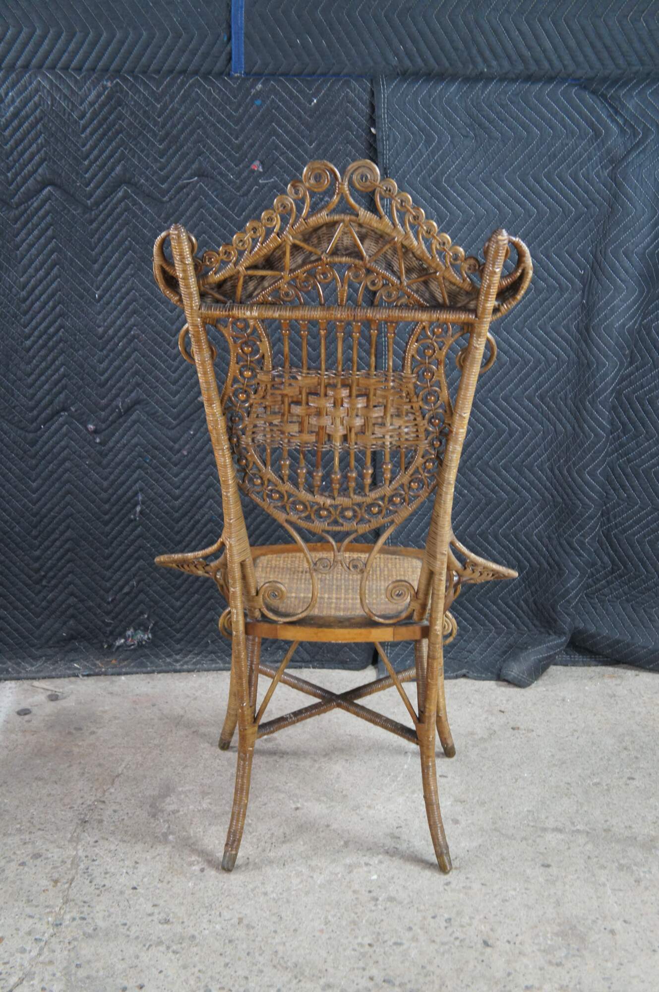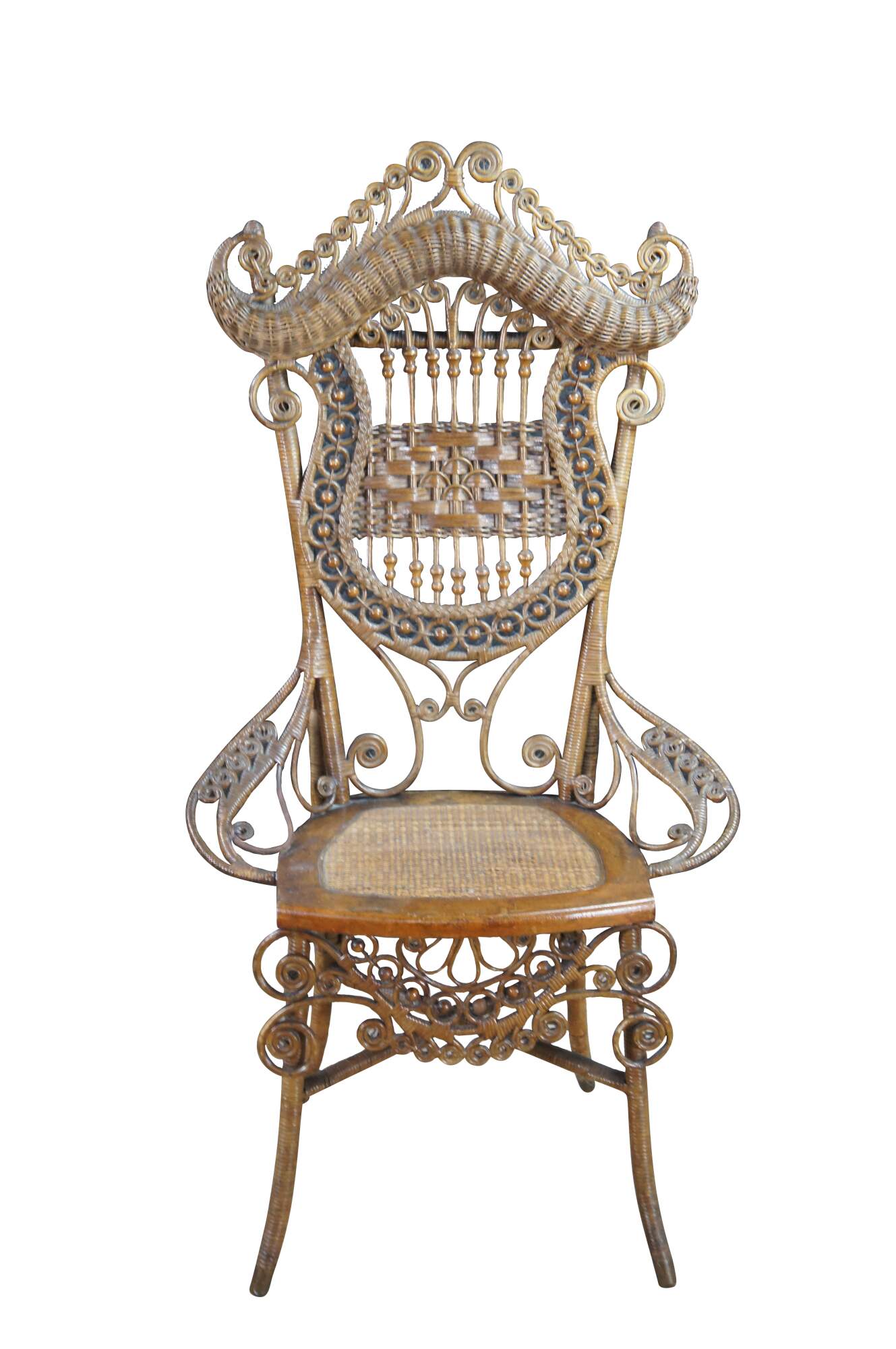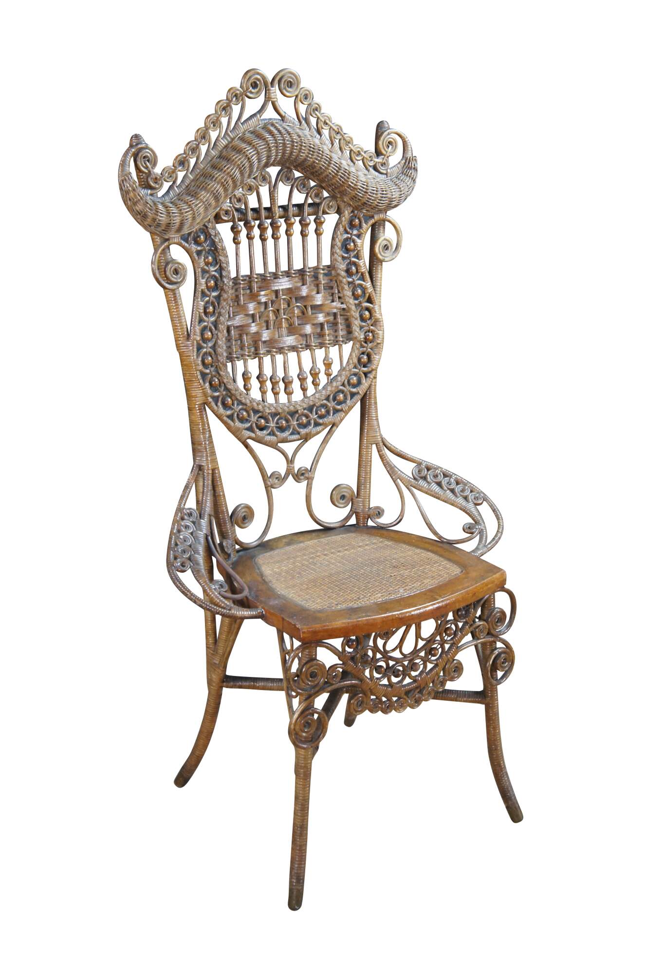 Antique Victorian portrait chair by the Indianapolis manufacturing company. Made of wicker and rattan featuring serpentine form with high reticulated / scrolled crest, harp shaped back entwined with ball and stick accents, and low swooping arms.