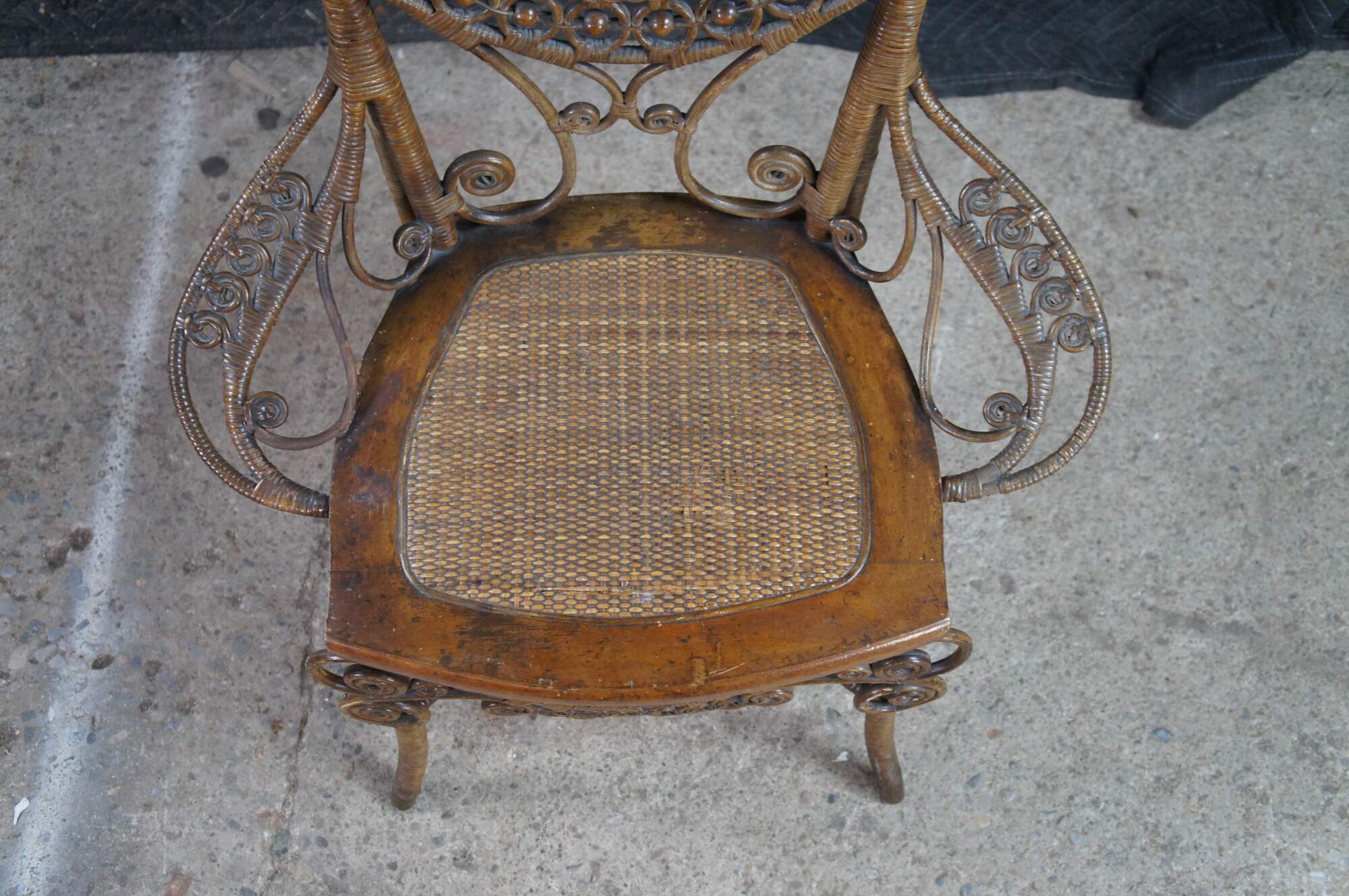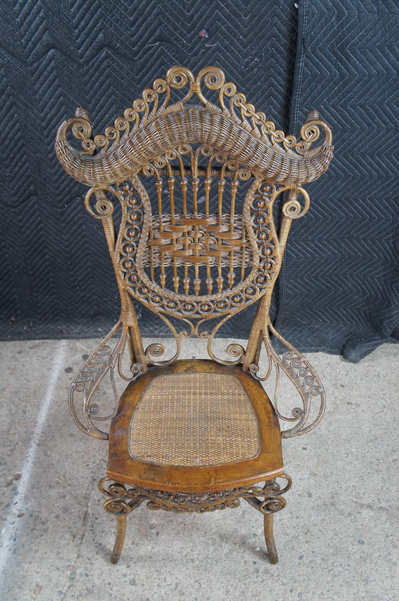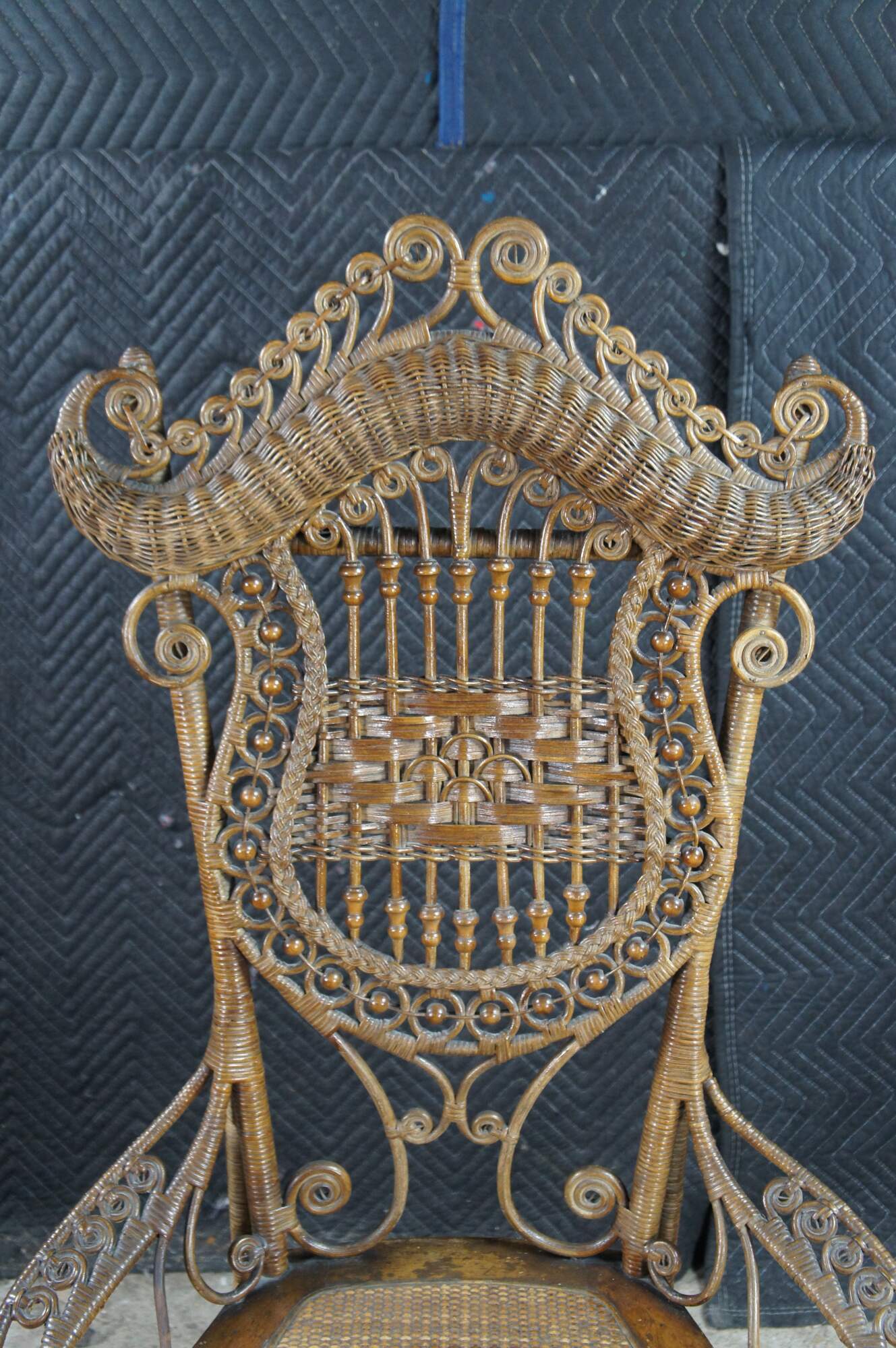 Antique Victorian portrait chair by the Indianapolis manufacturing company. Made of wicker and rattan featuring serpentine form with high reticulated / scrolled crest, harp shaped back entwined with ball and stick accents, and low swooping arms.