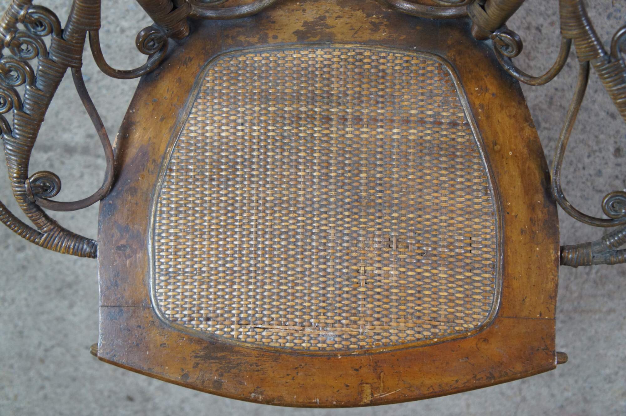 Wear and distressing from age, scuffing, fading, finish loss, some breaks / splits in seat.