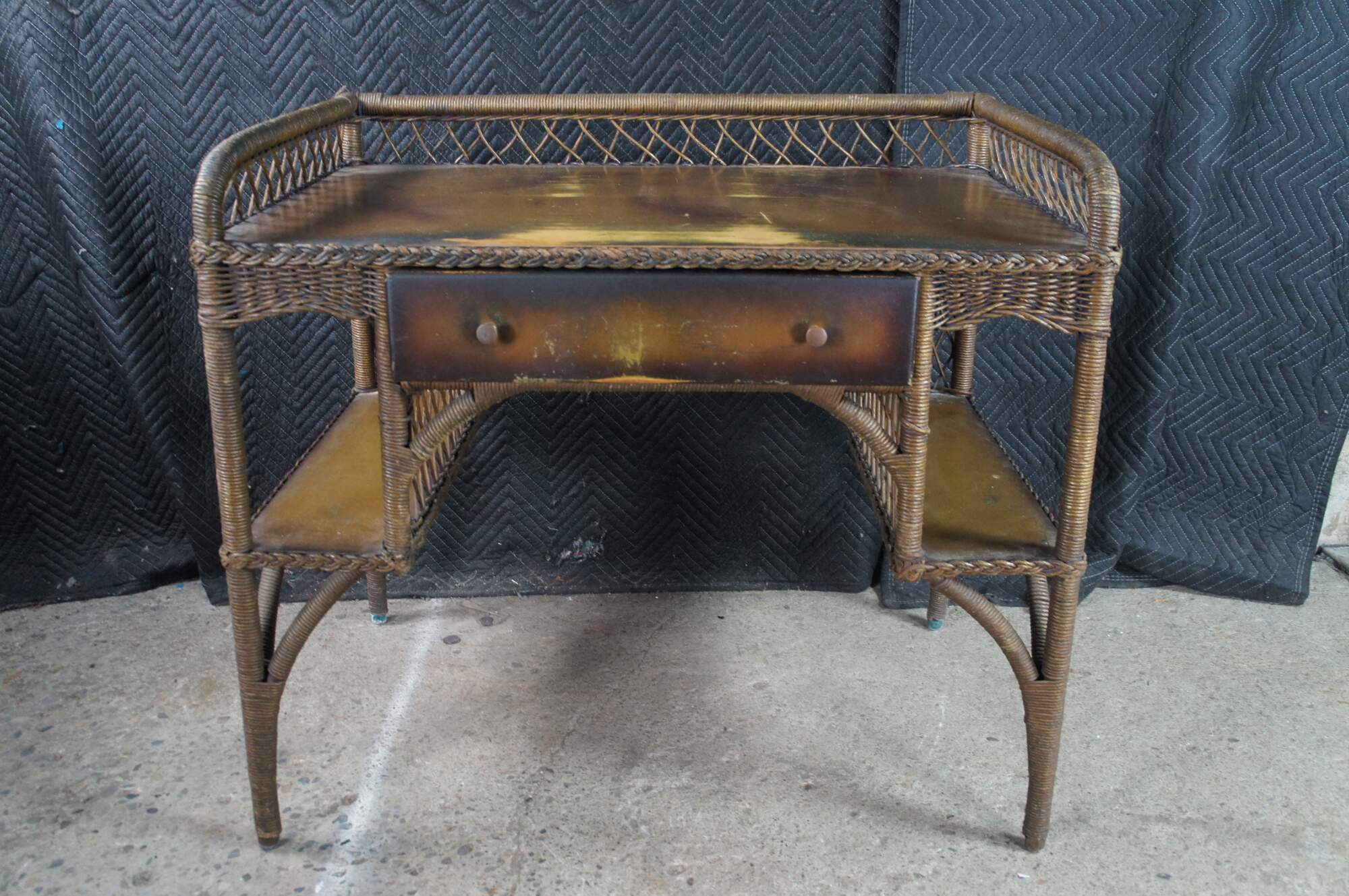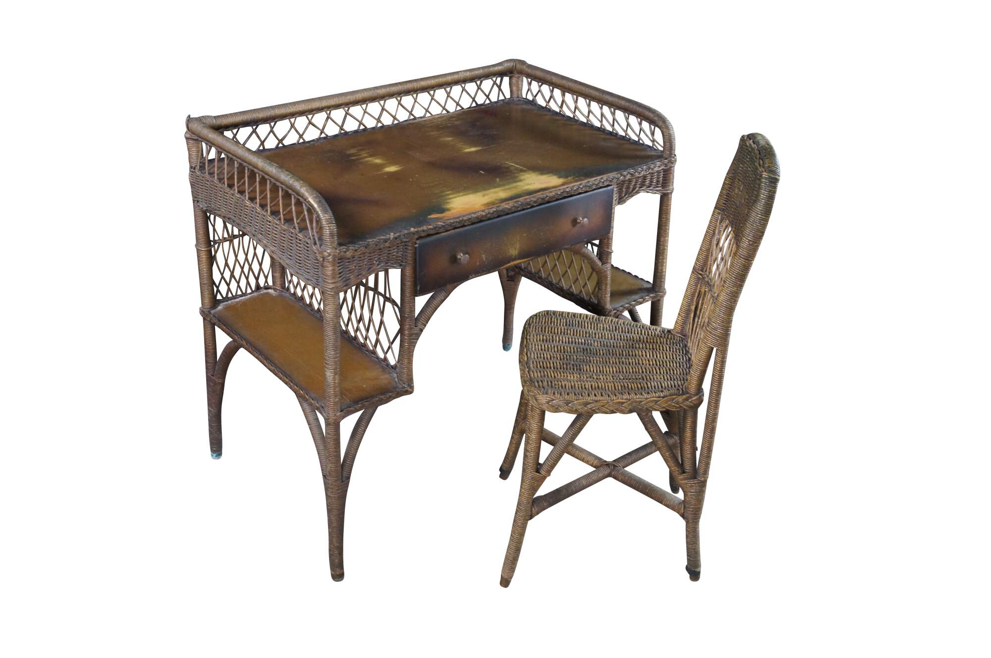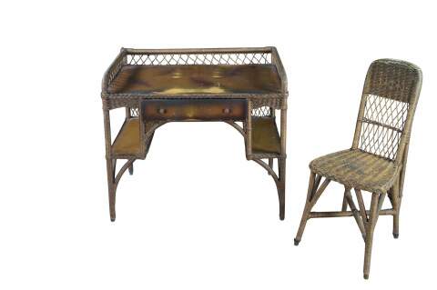 Antique Heywood Wakefield wicker and rattan writing desk and chair. The desk features rectangular form with one drawer and two bookcases on either side.
